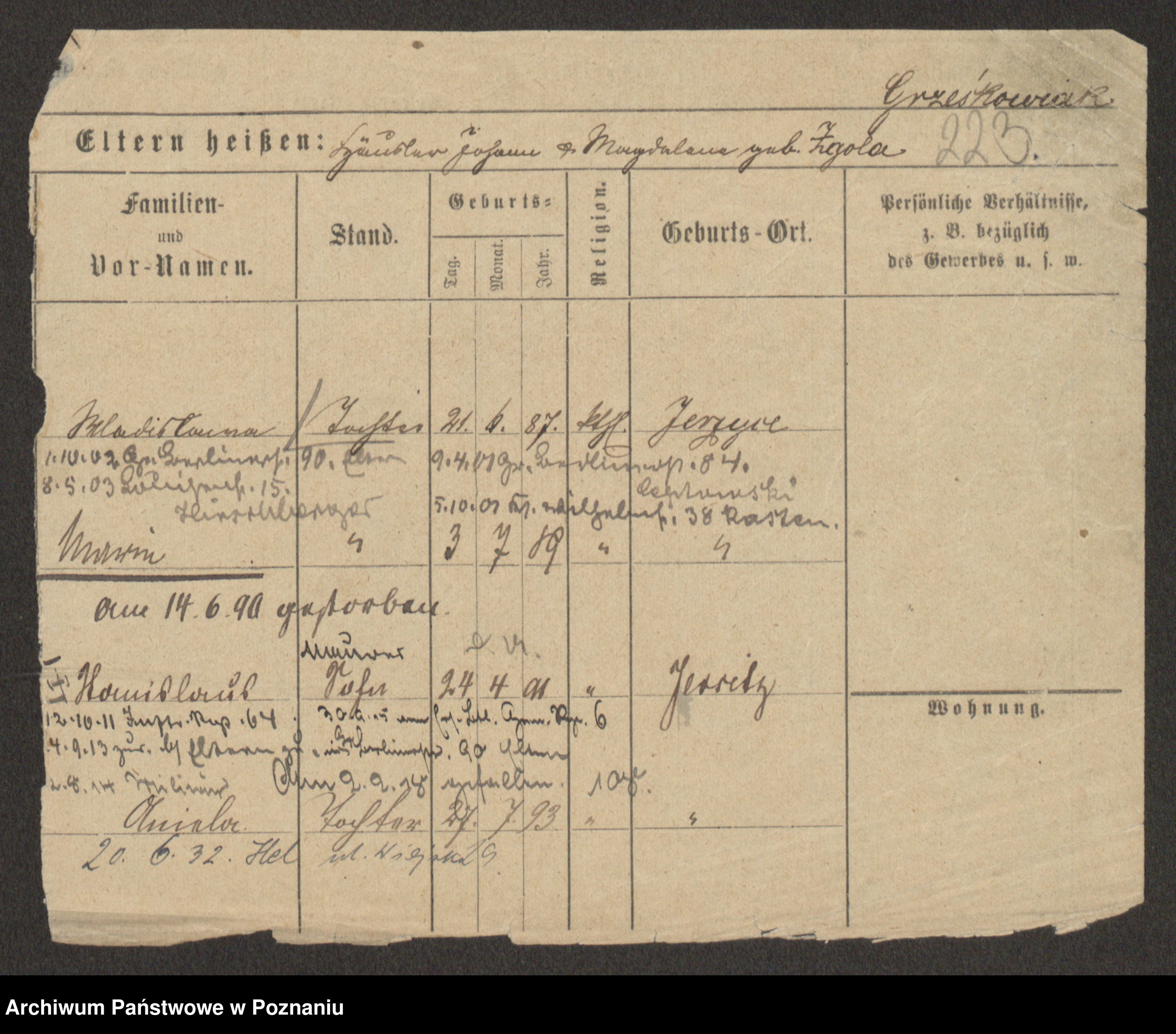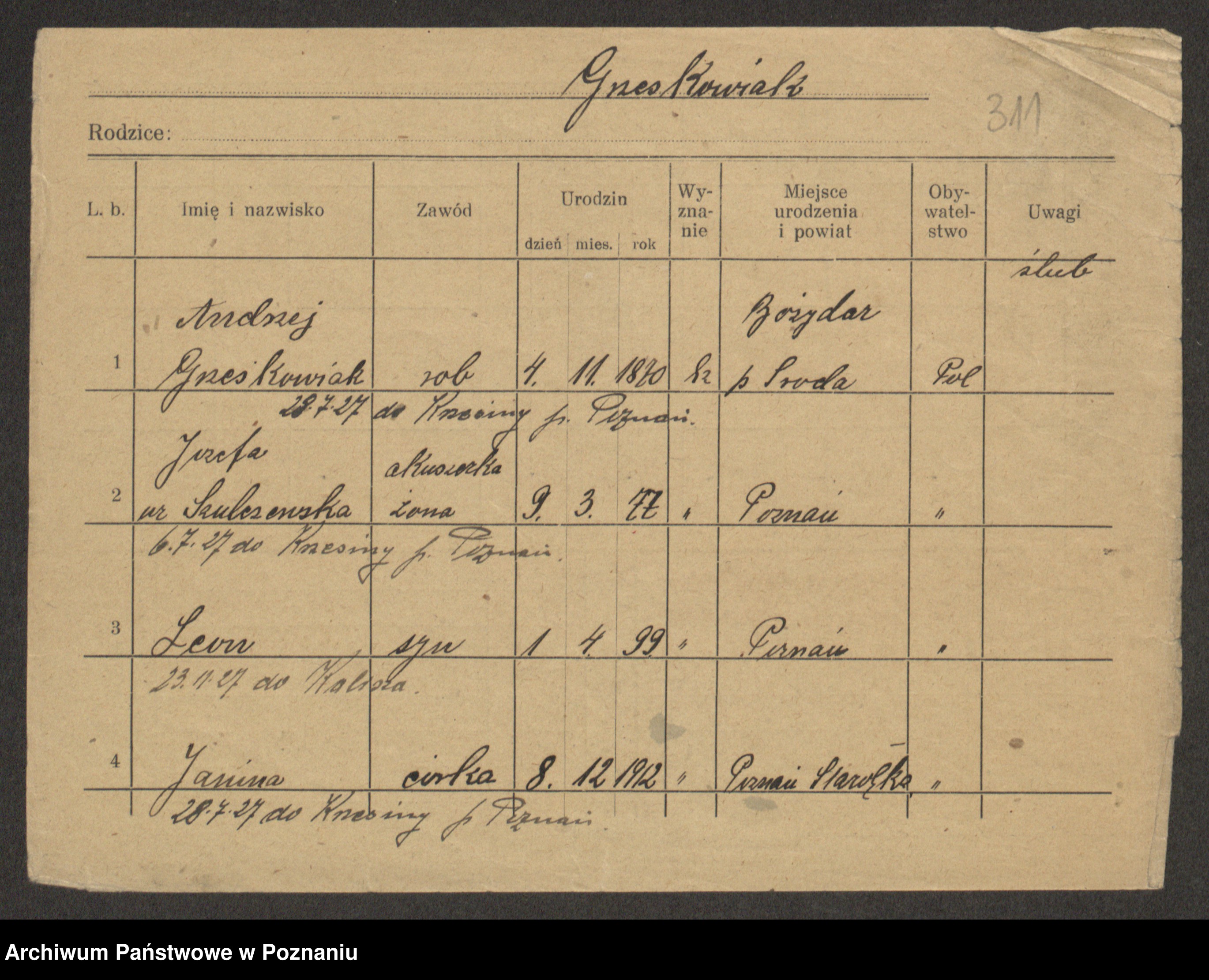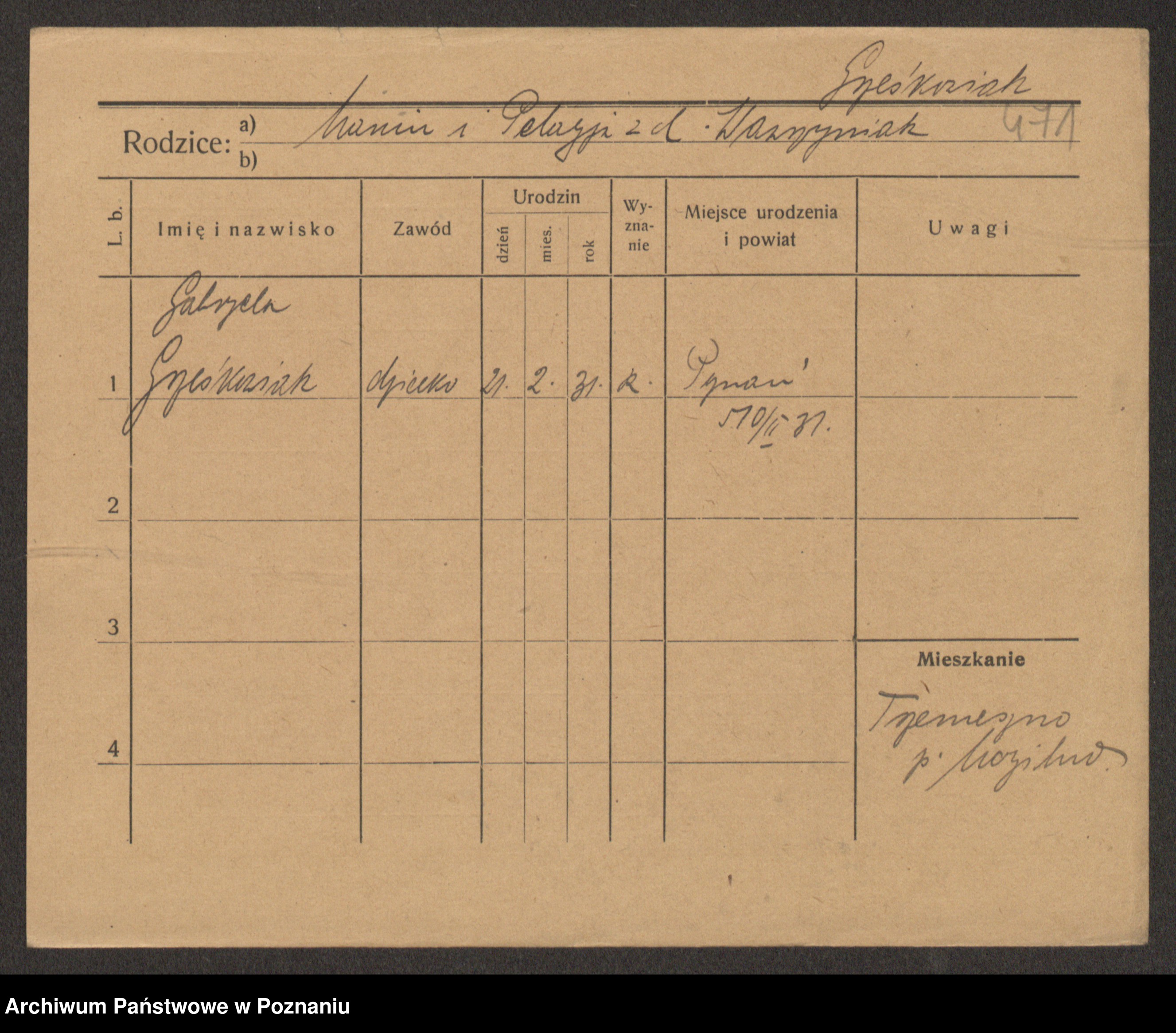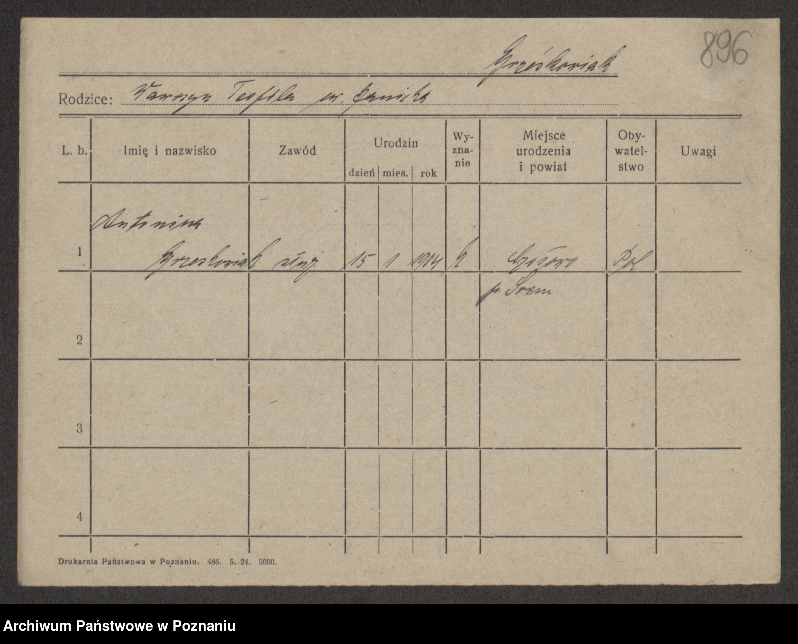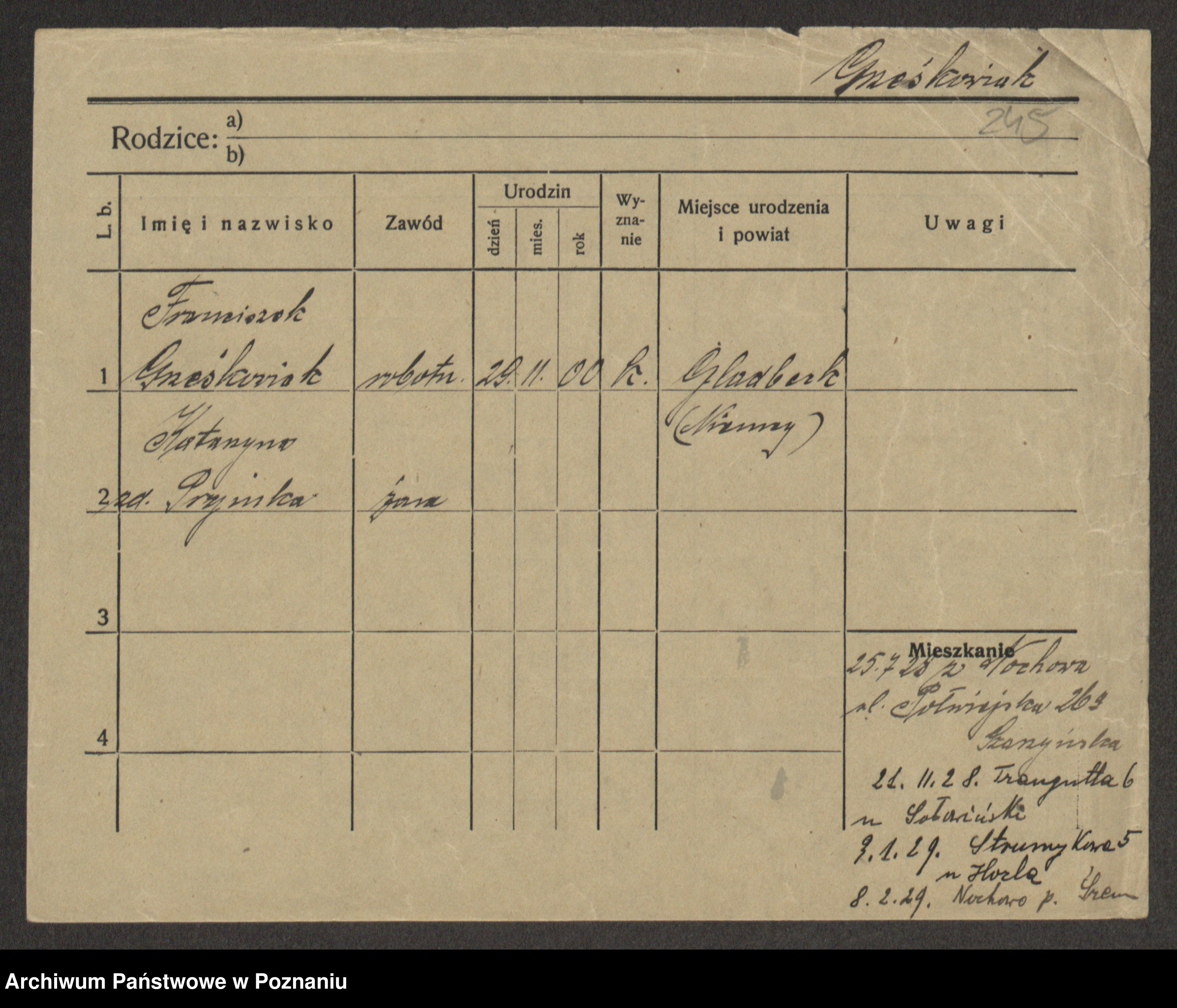 Podgląd karty osobowej dostępny jest po kliknięciu na nazwisko lub ikonkę karty. Można dokonywać powiększenia (ikony na górze) lub przechodzić między kolejnymi skanami (strzałki po bokach).