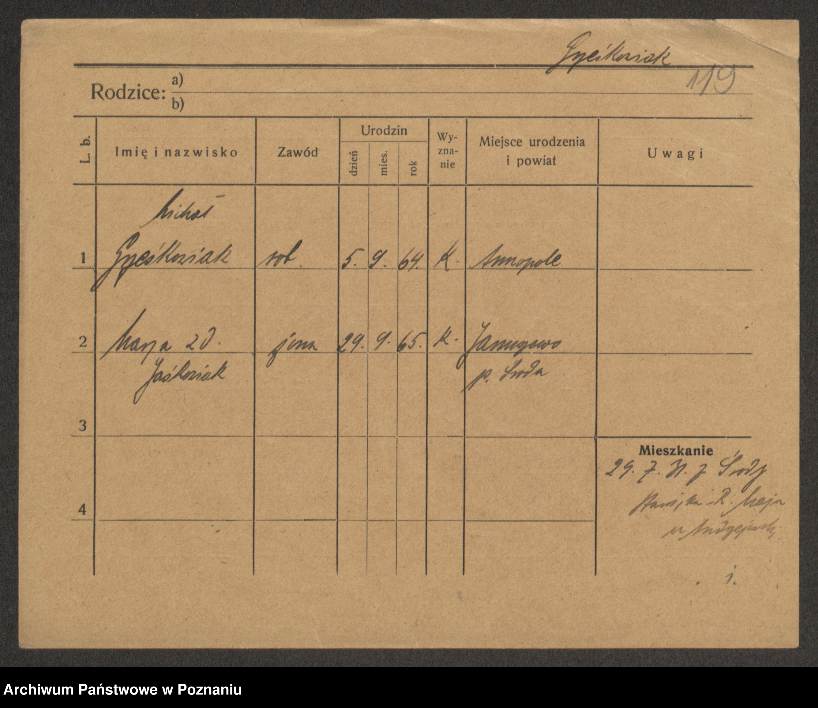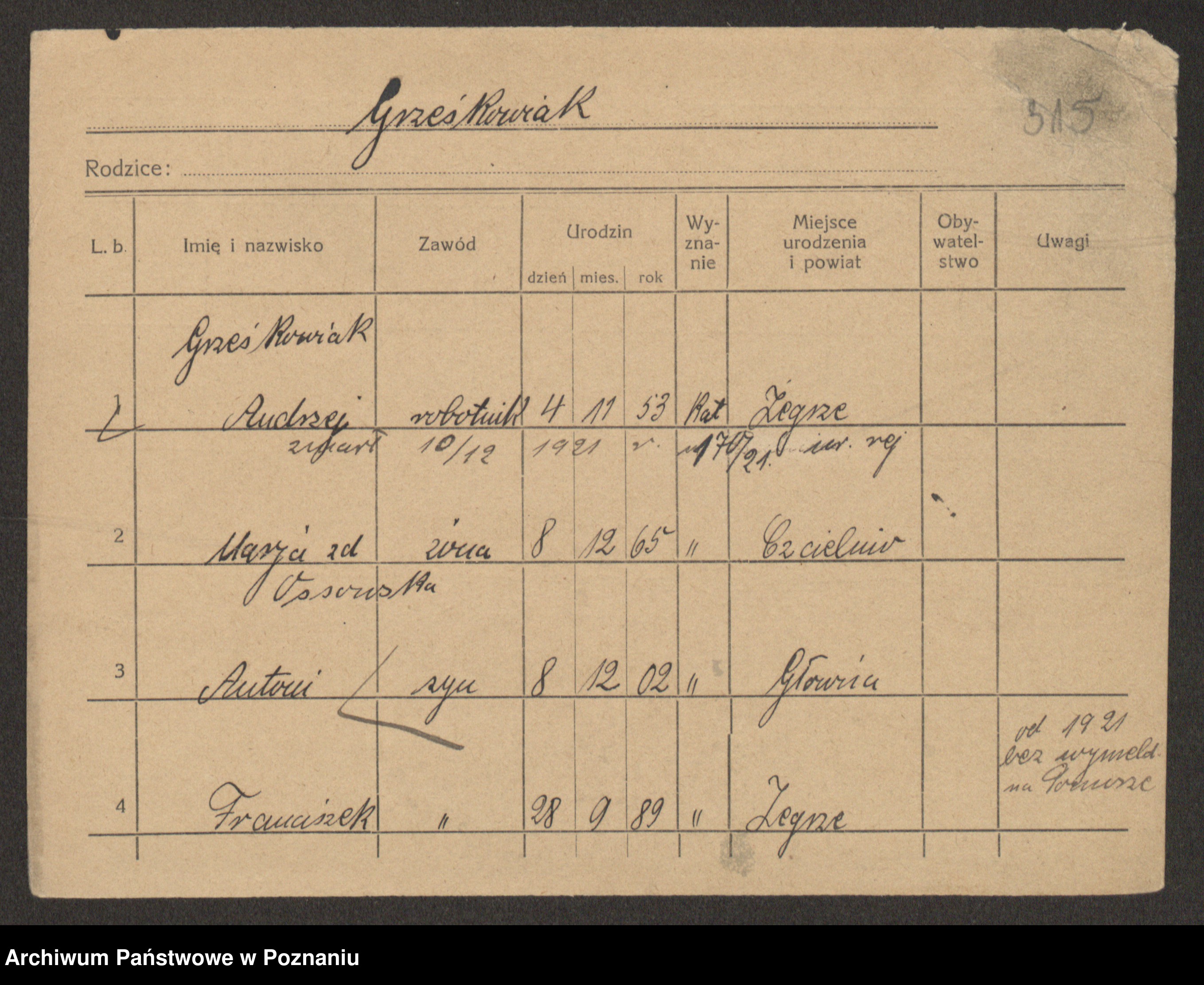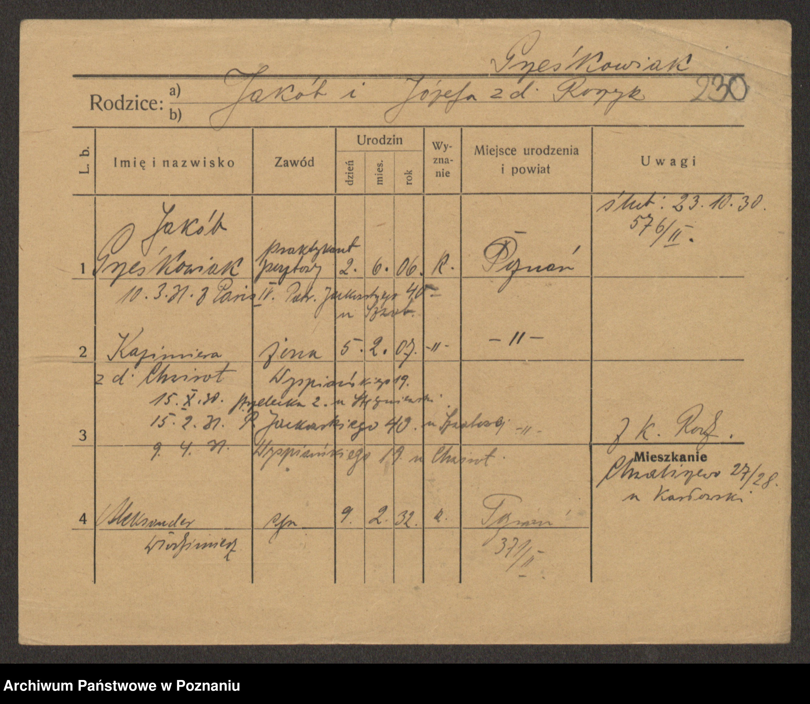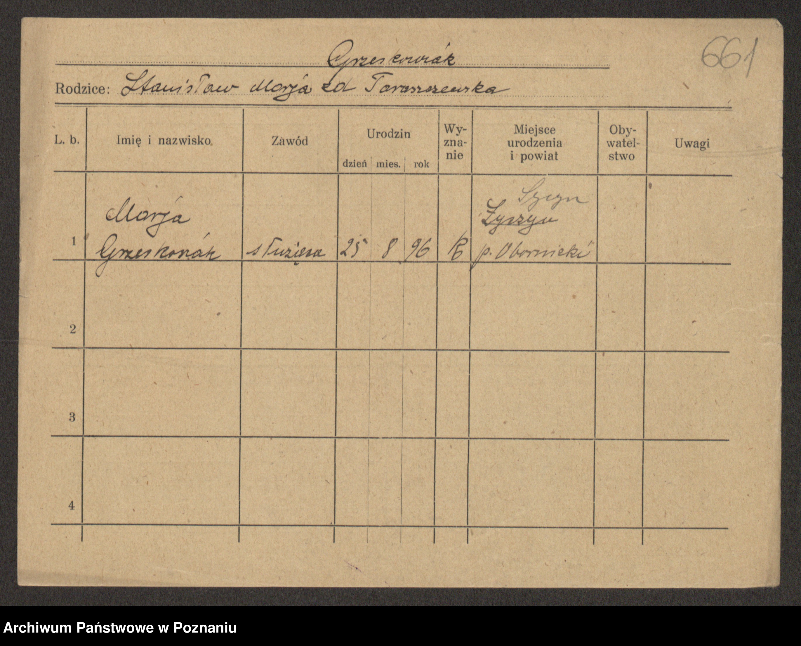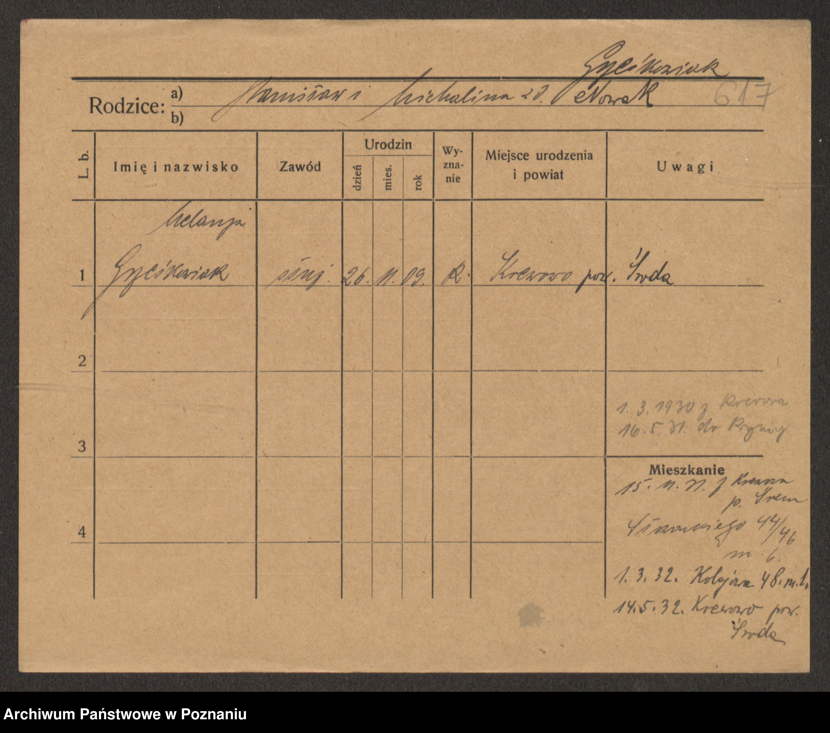 Podgląd karty osobowej dostępny jest po kliknięciu na nazwisko lub ikonkę karty. Można dokonywać powiększenia (ikony na górze) lub przechodzić między kolejnymi skanami (strzałki po bokach).
