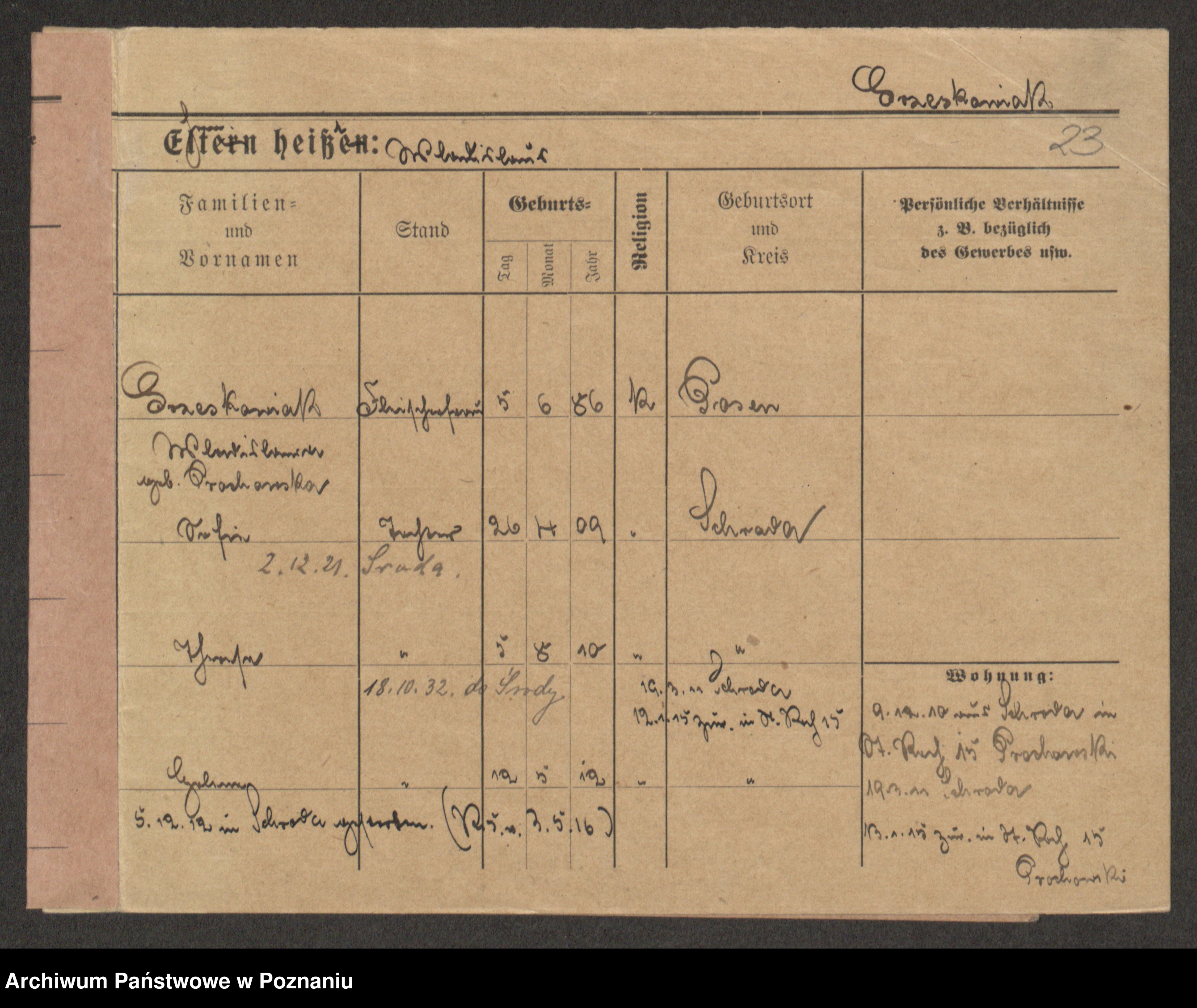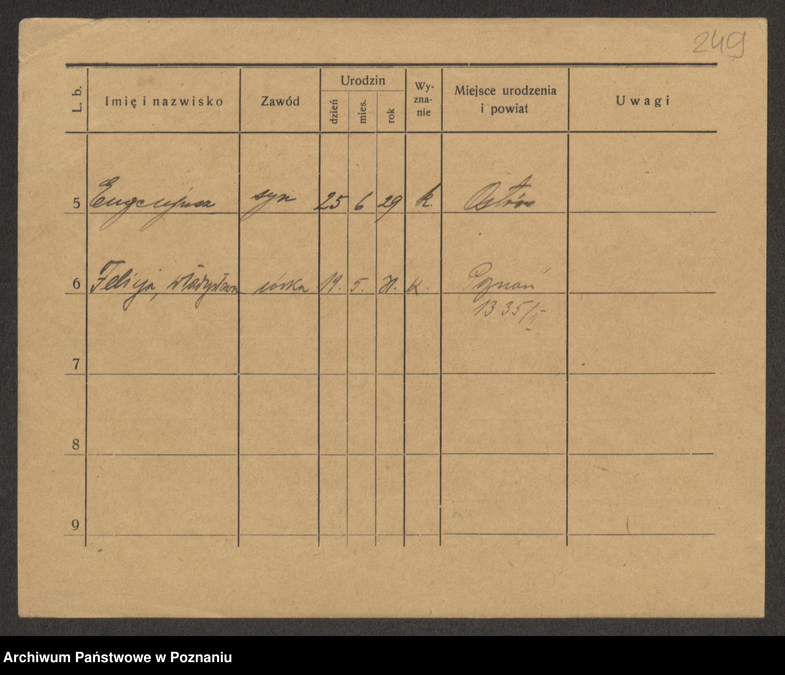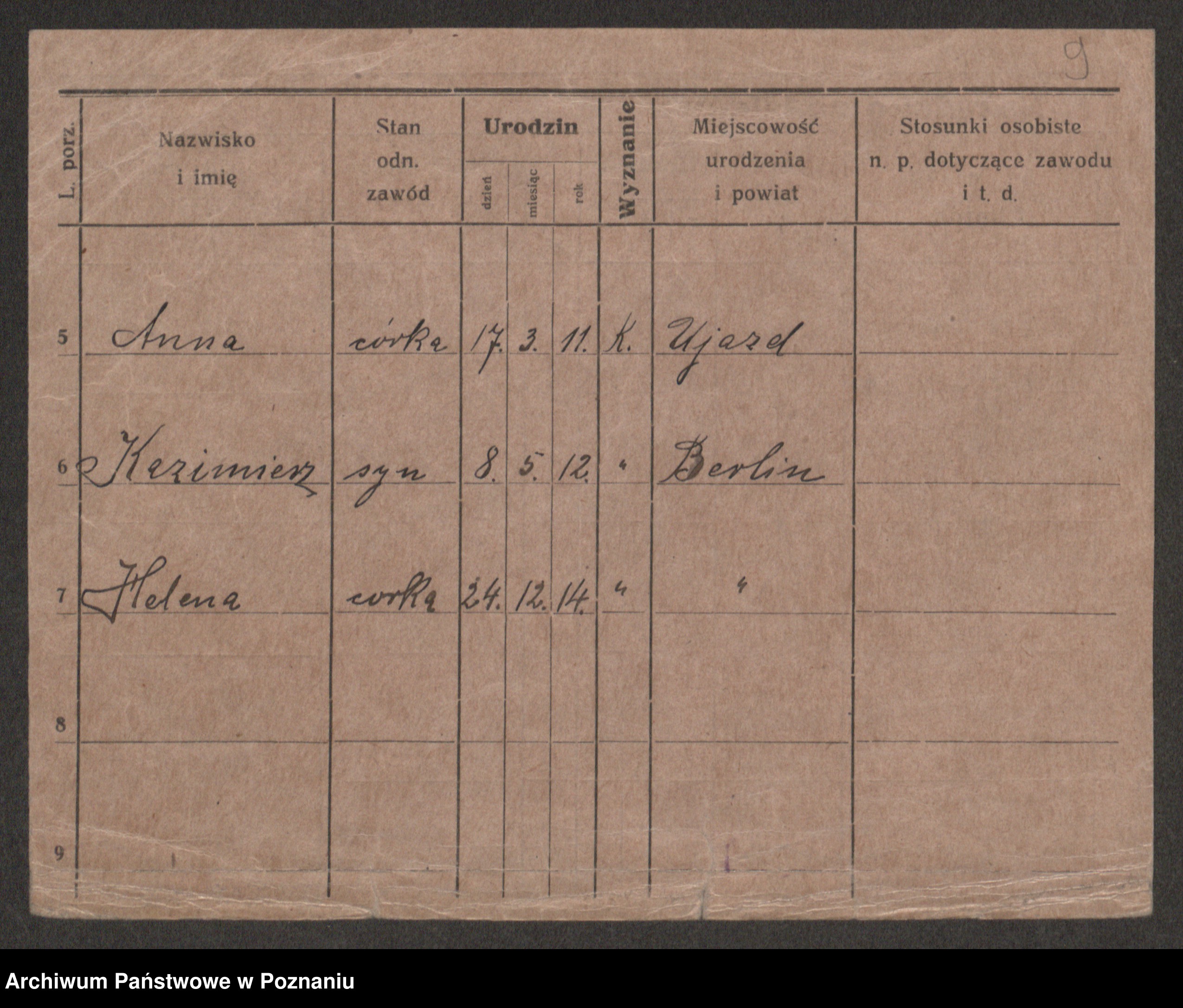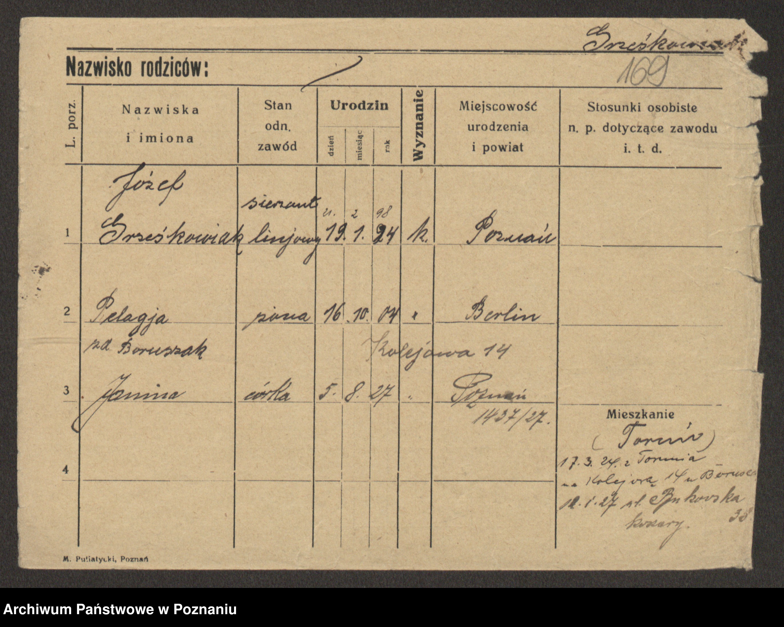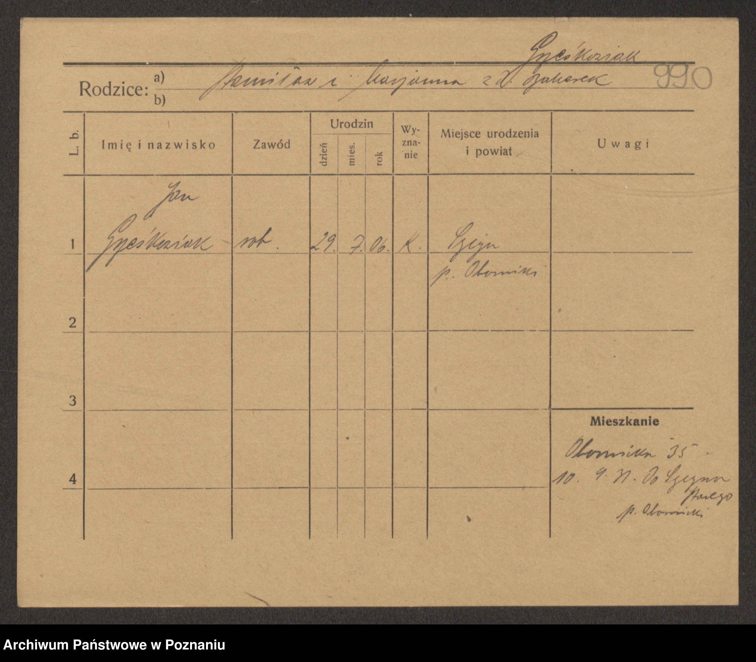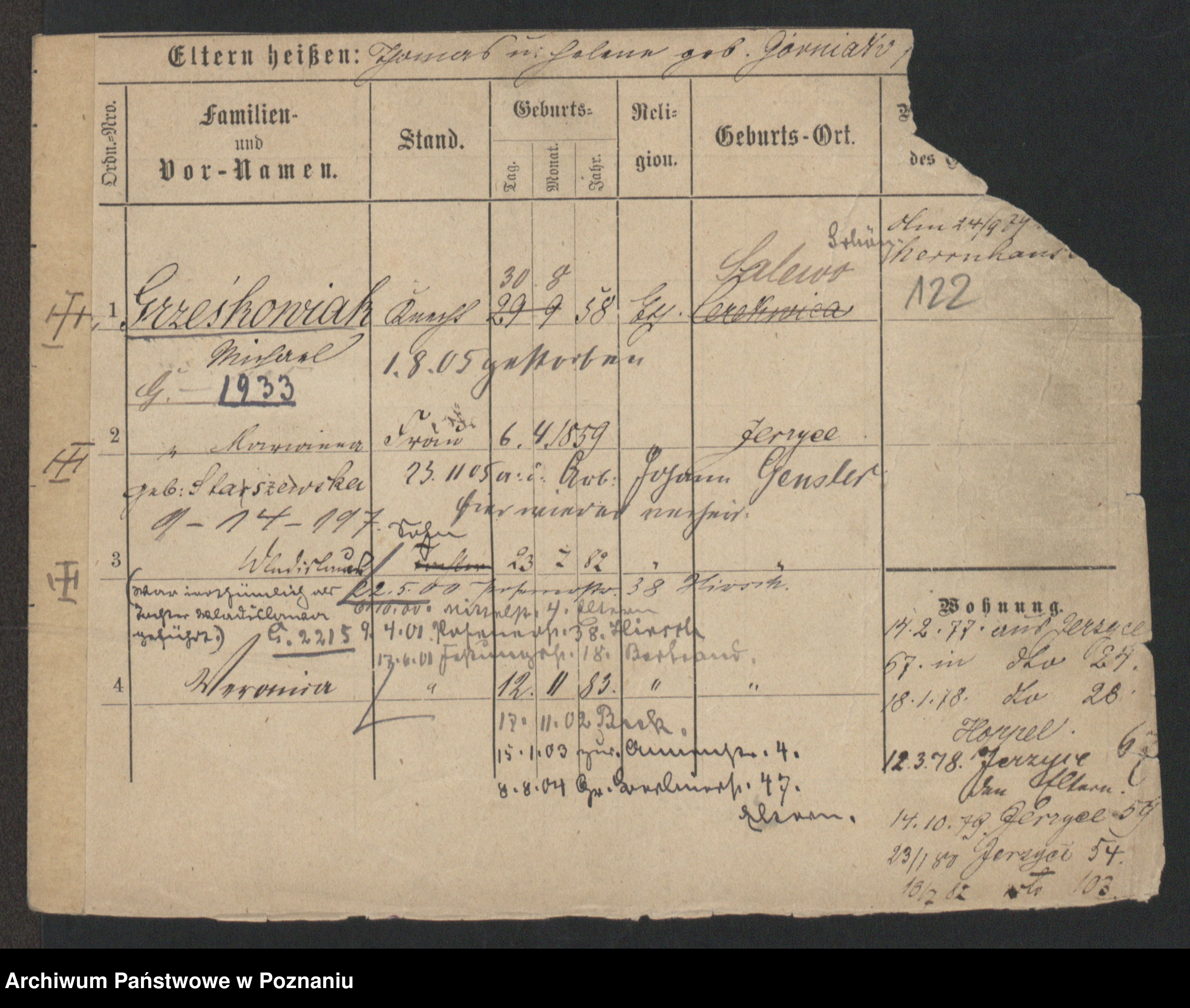 Podgląd karty osobowej dostępny jest po kliknięciu na nazwisko lub ikonkę karty. Można dokonywać powiększenia (ikony na górze) lub przechodzić między kolejnymi skanami (strzałki po bokach).