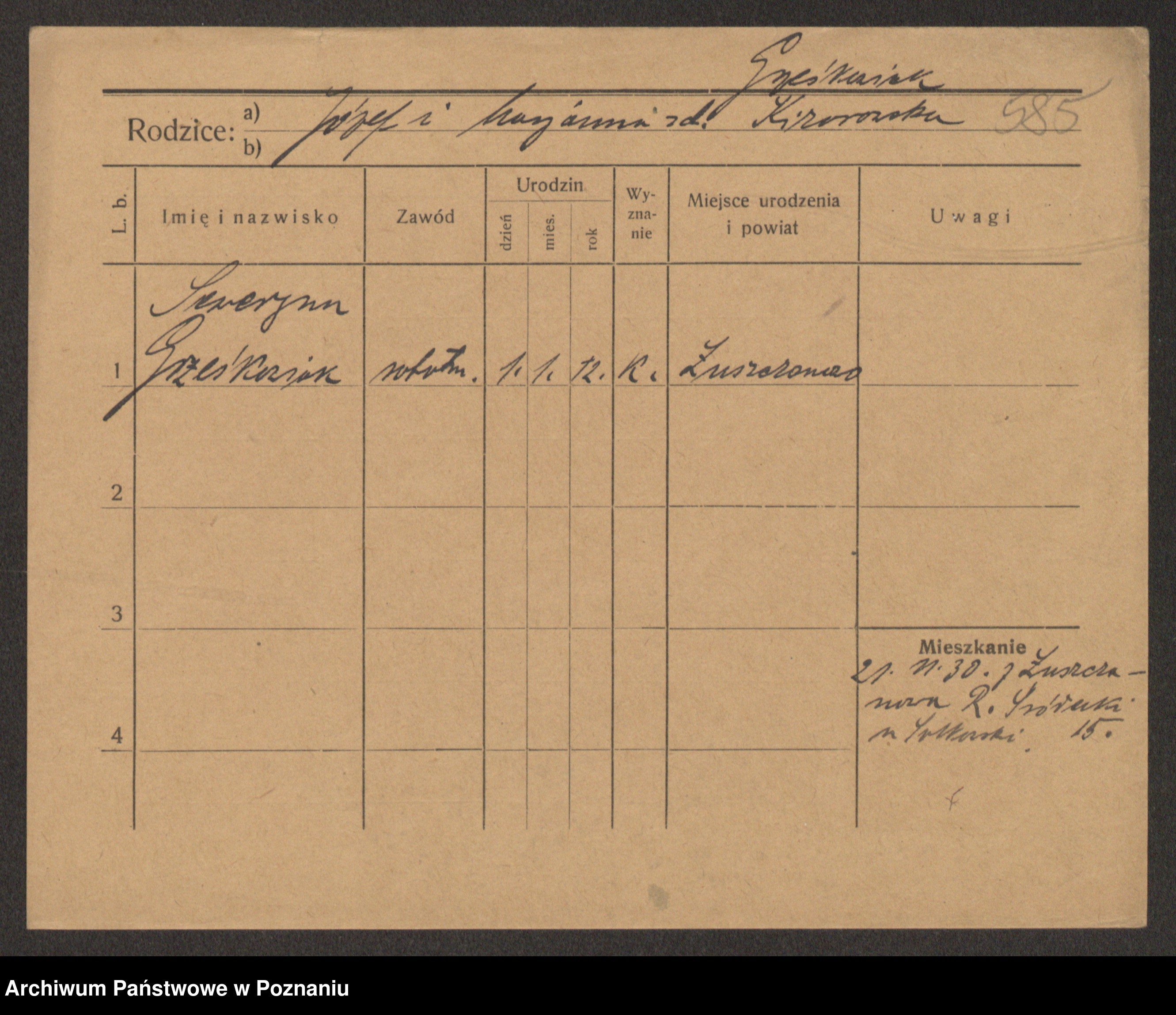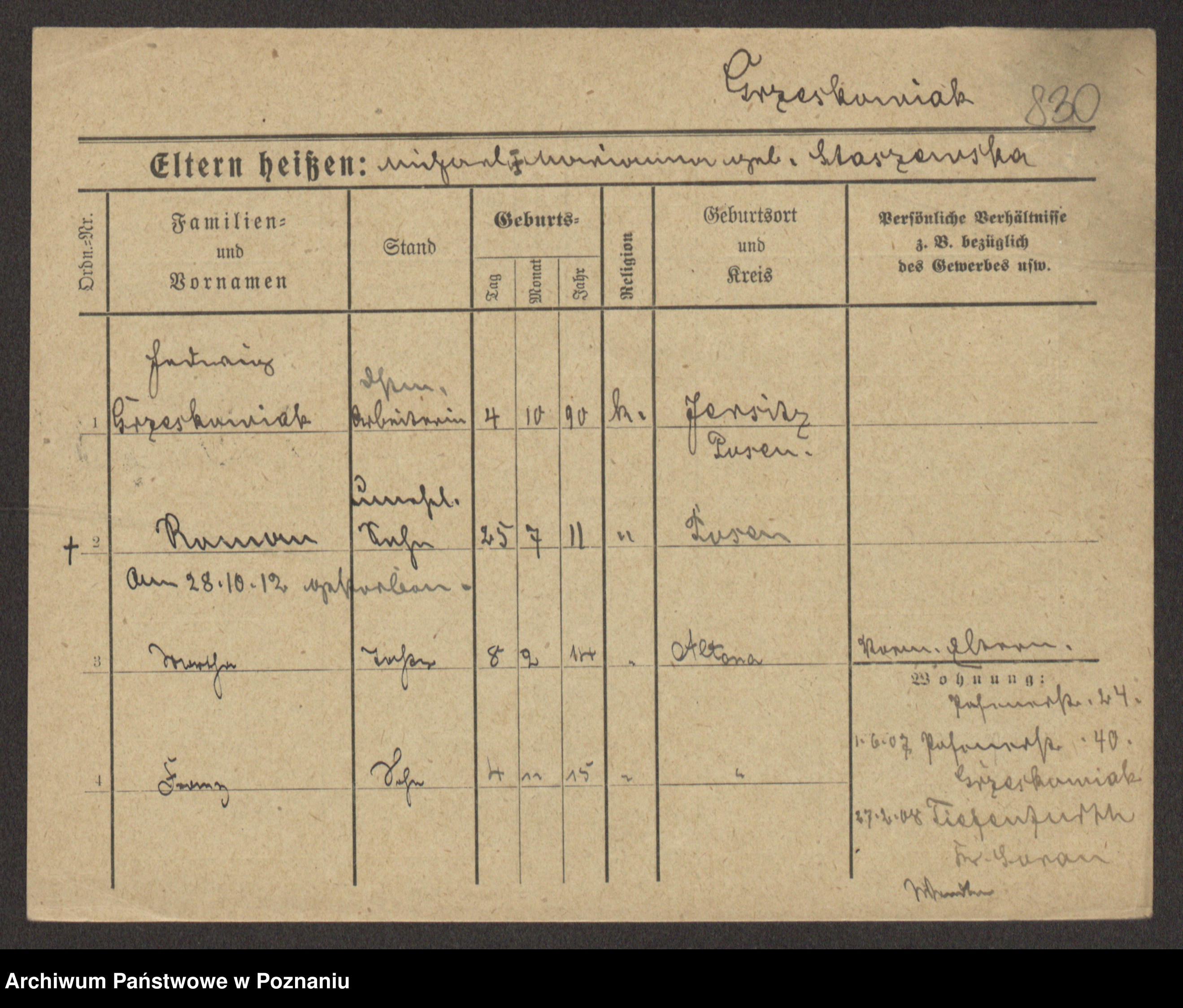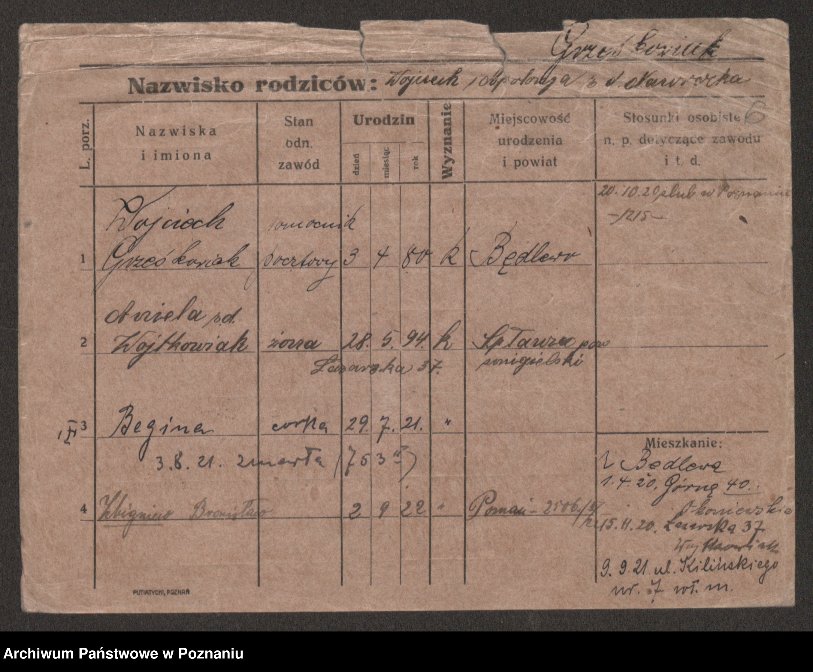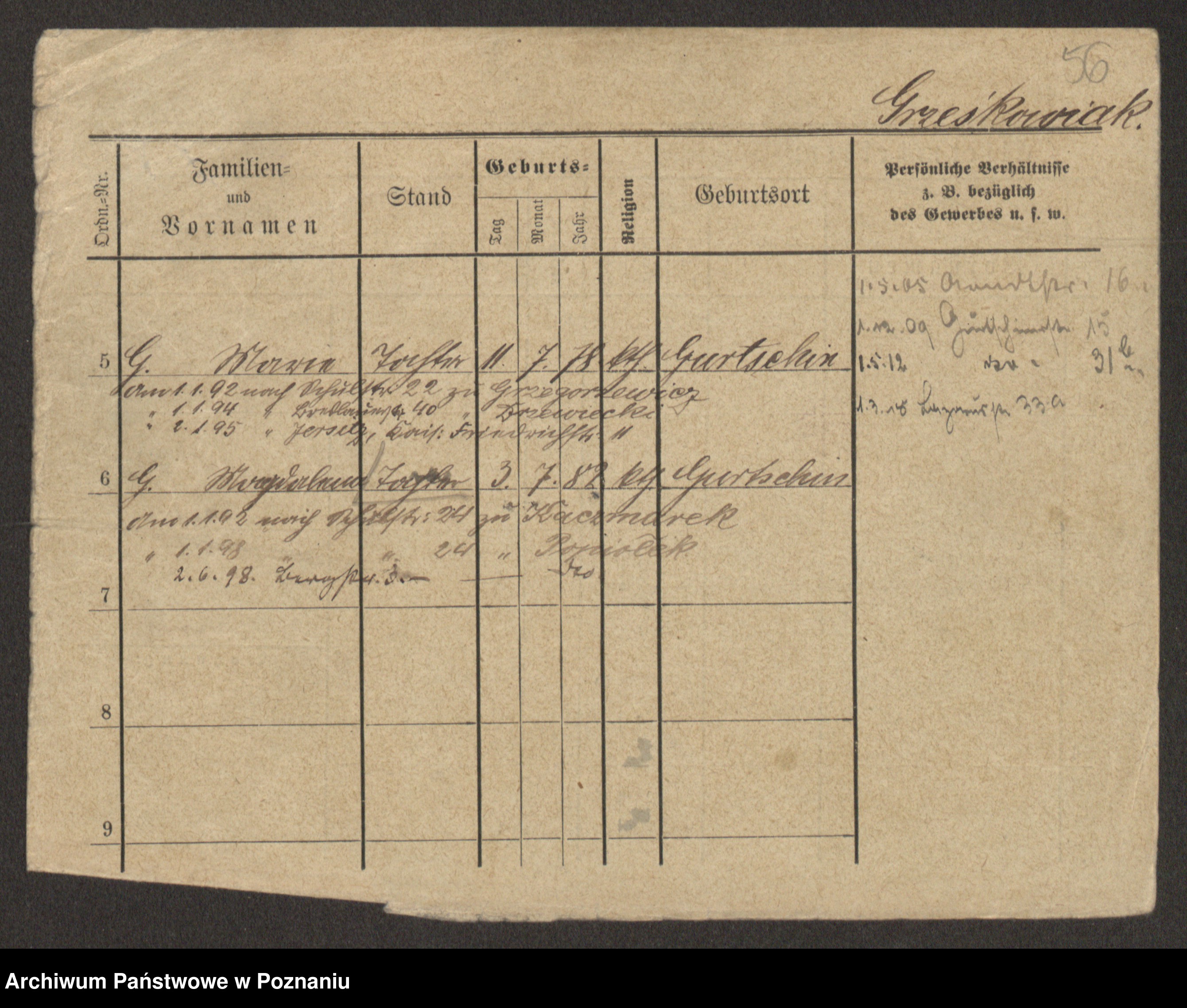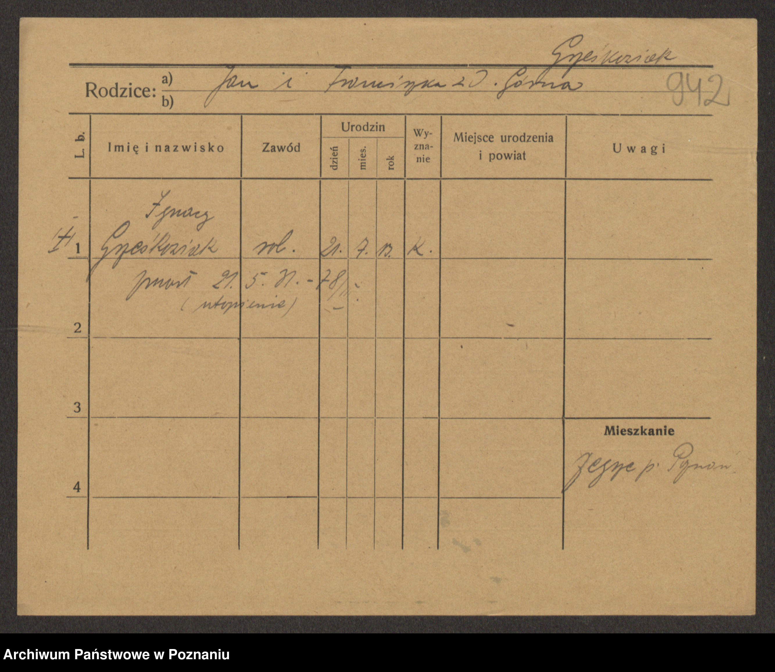 Podgląd karty osobowej dostępny jest po kliknięciu na nazwisko lub ikonkę karty. Można dokonywać powiększenia (ikony na górze) lub przechodzić między kolejnymi skanami (strzałki po bokach).