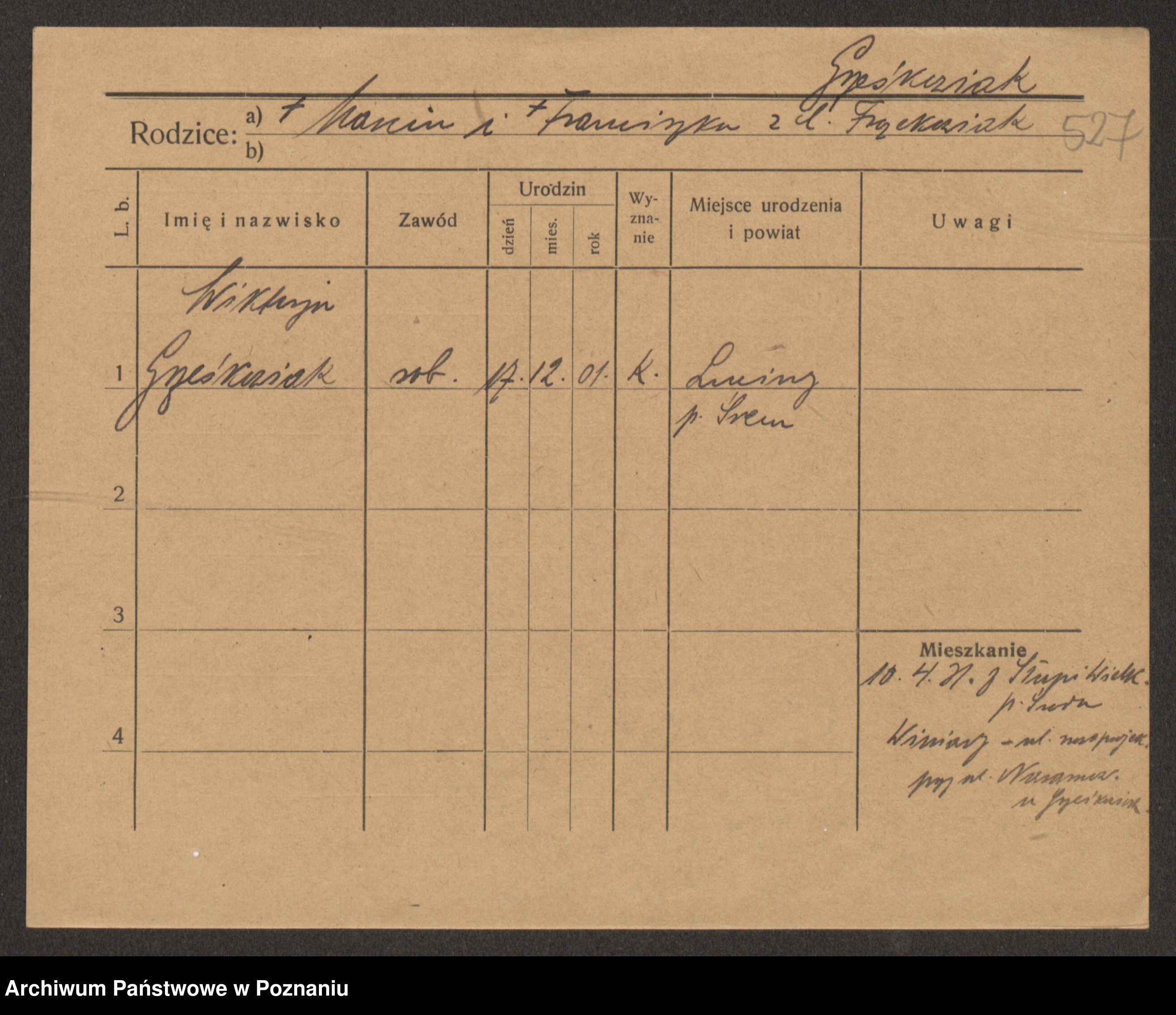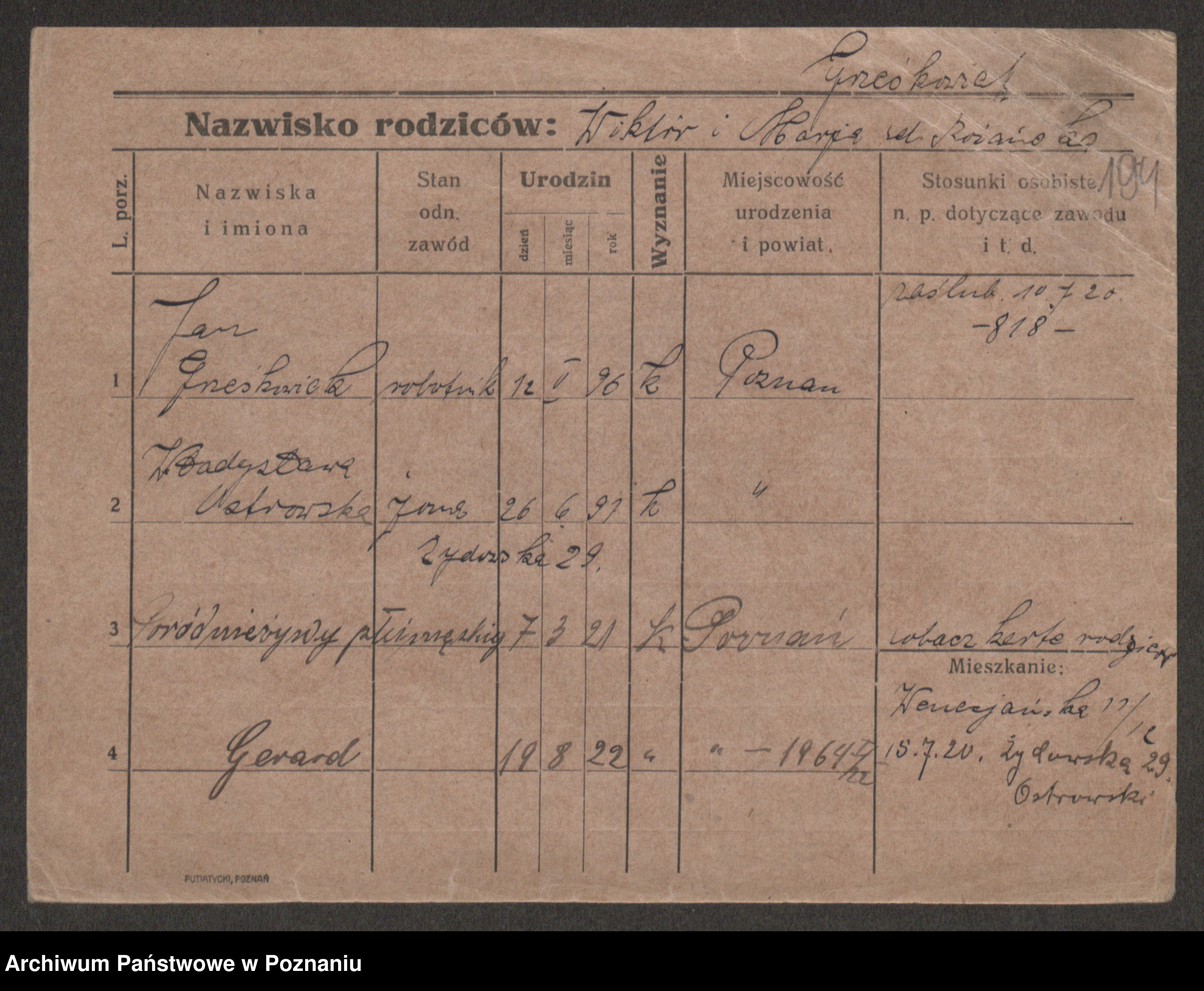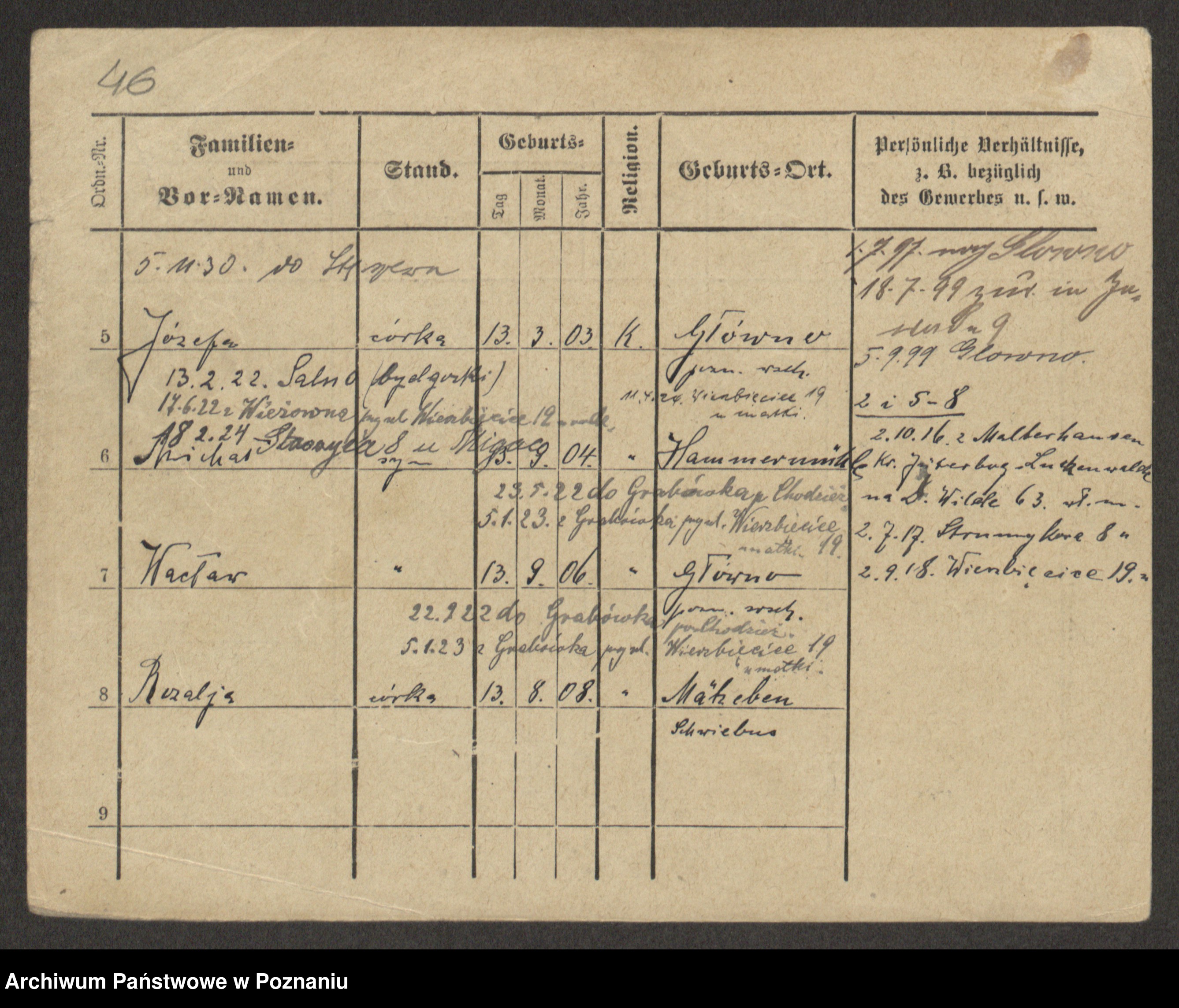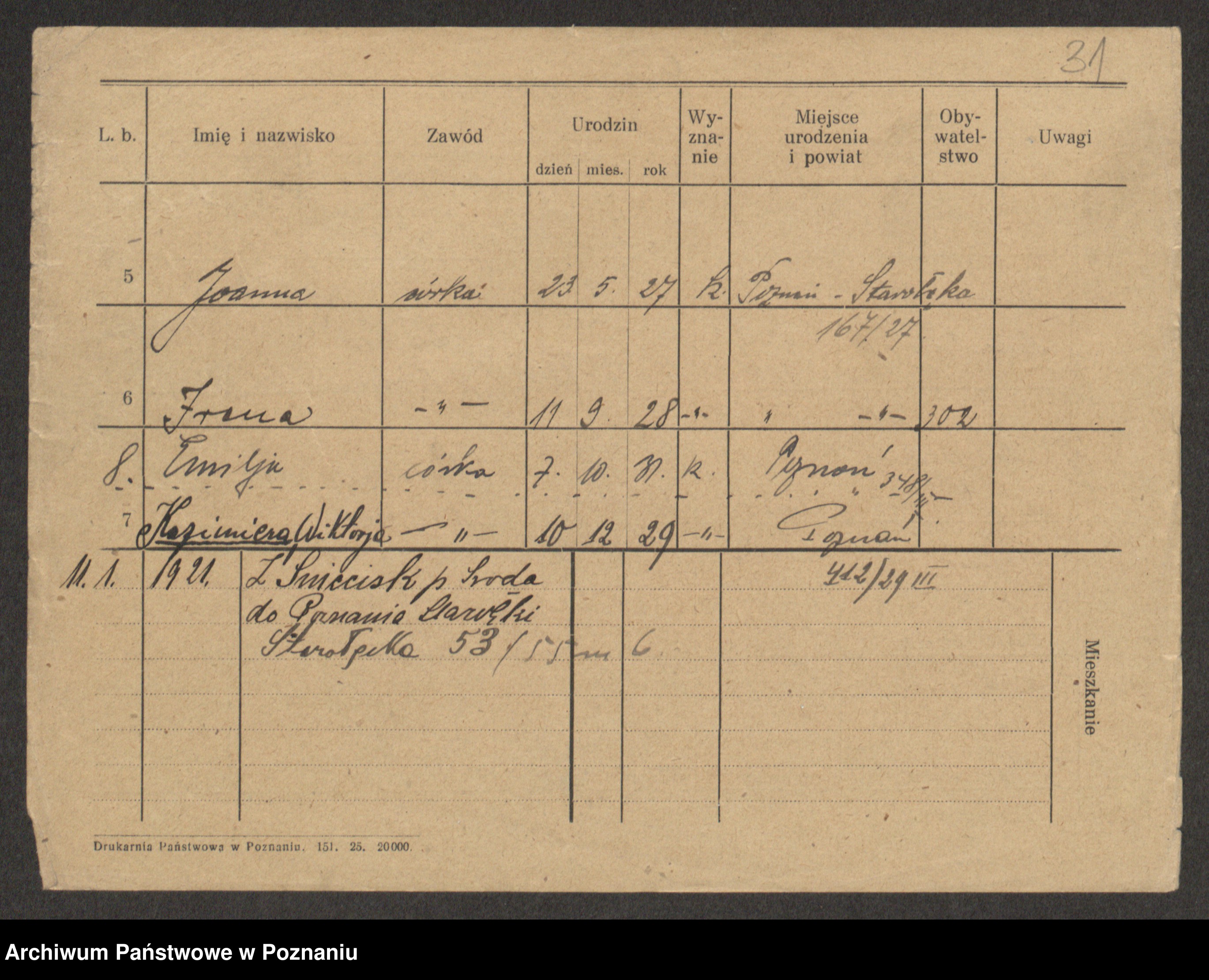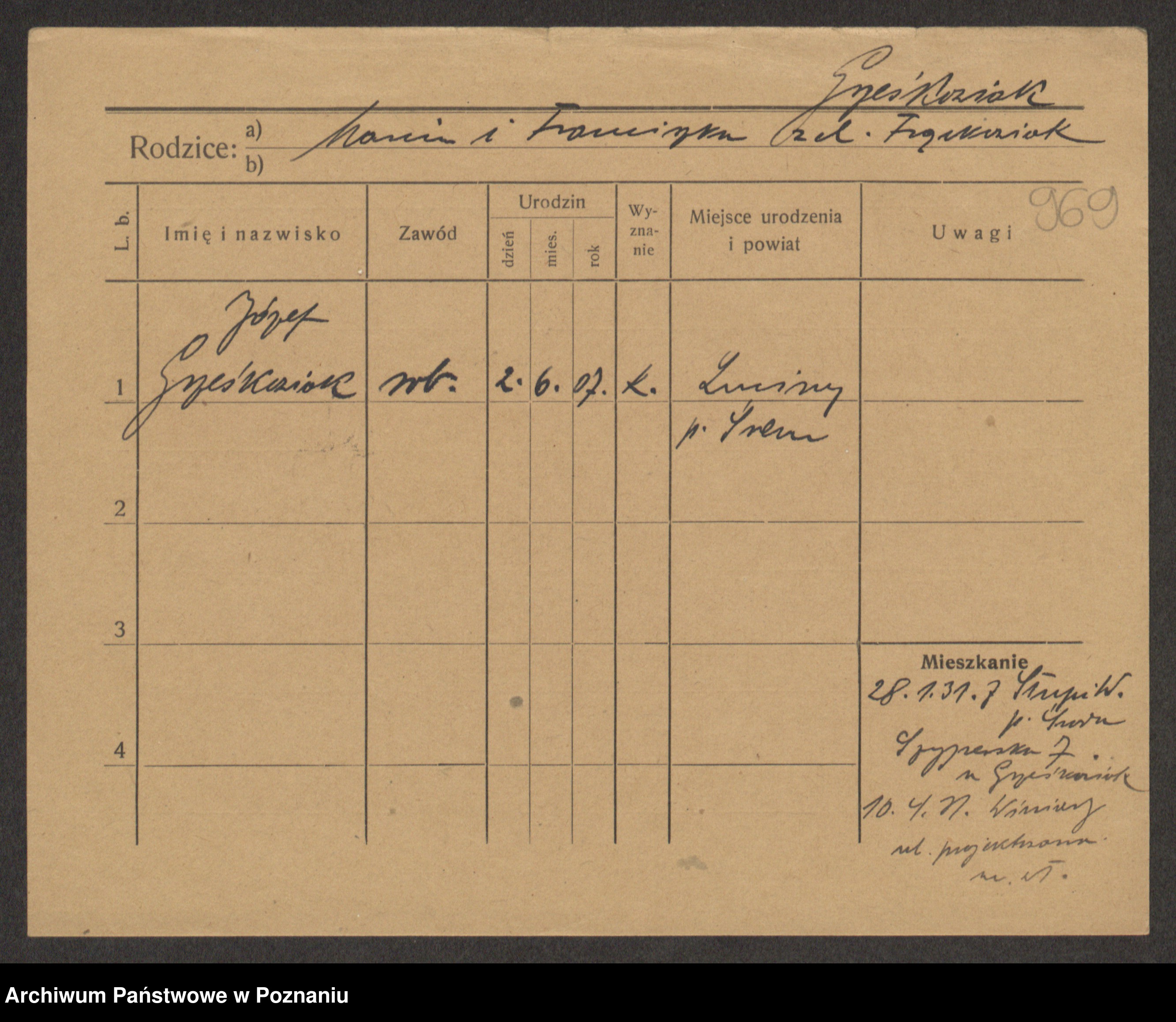 Podgląd karty osobowej dostępny jest po kliknięciu na nazwisko lub ikonkę karty. Można dokonywać powiększenia (ikony na górze) lub przechodzić między kolejnymi skanami (strzałki po bokach).