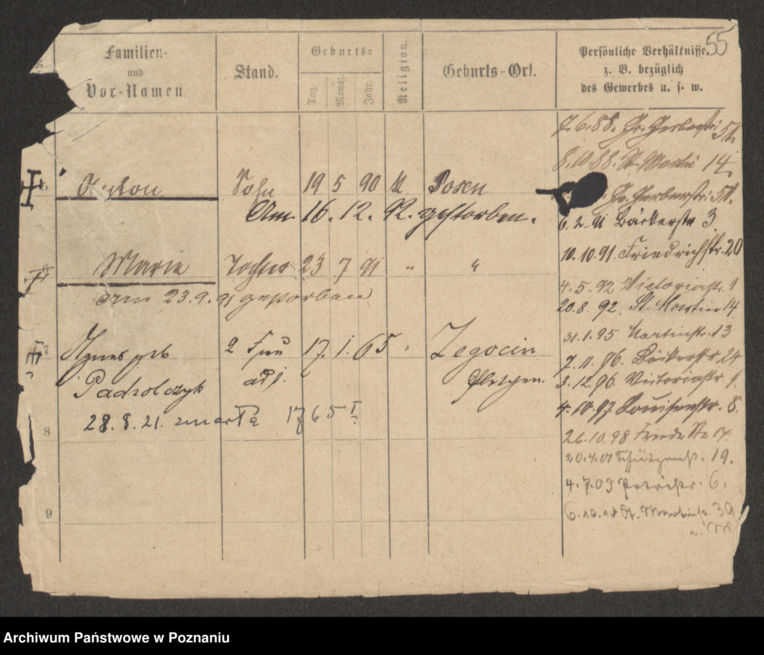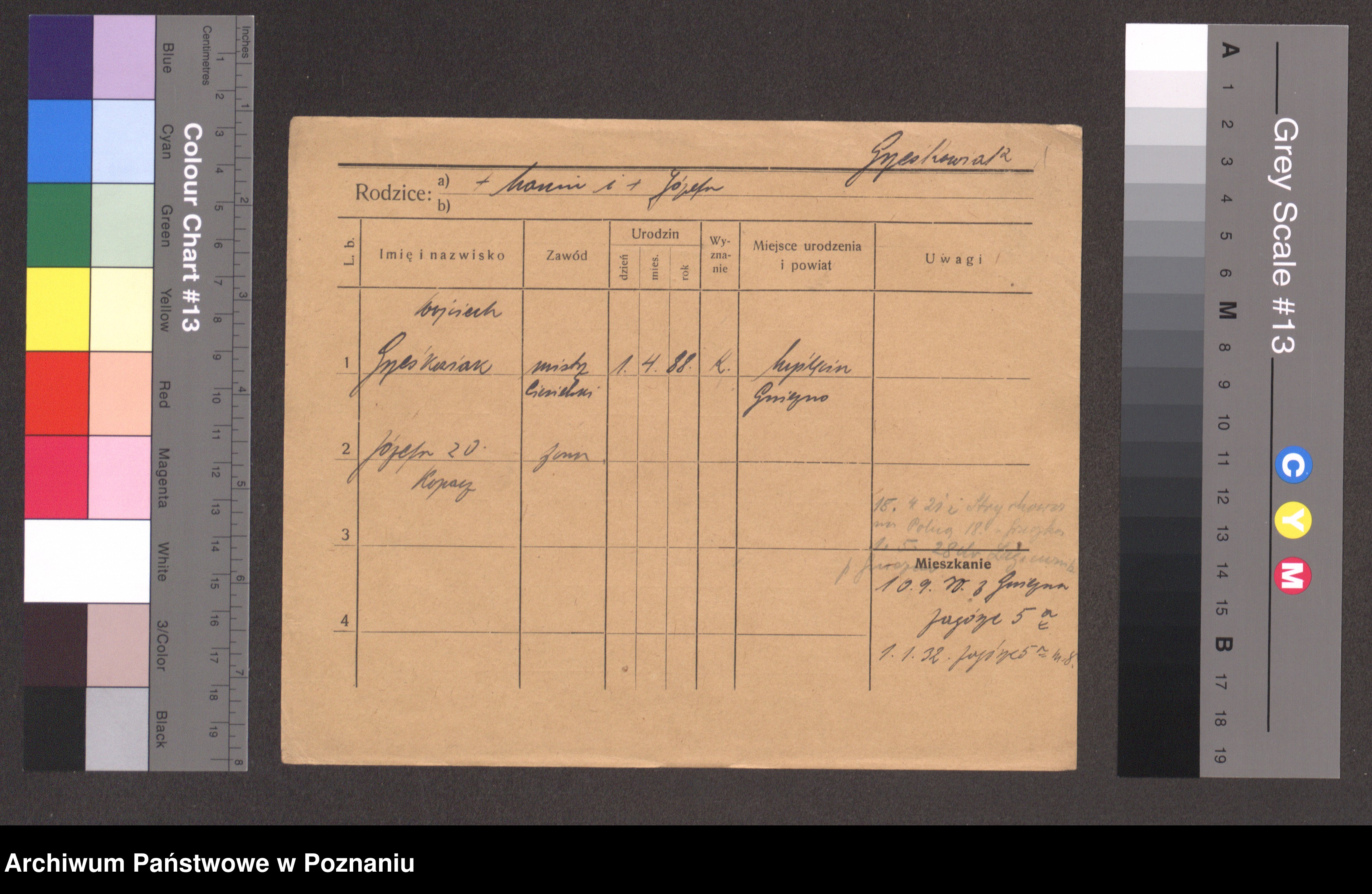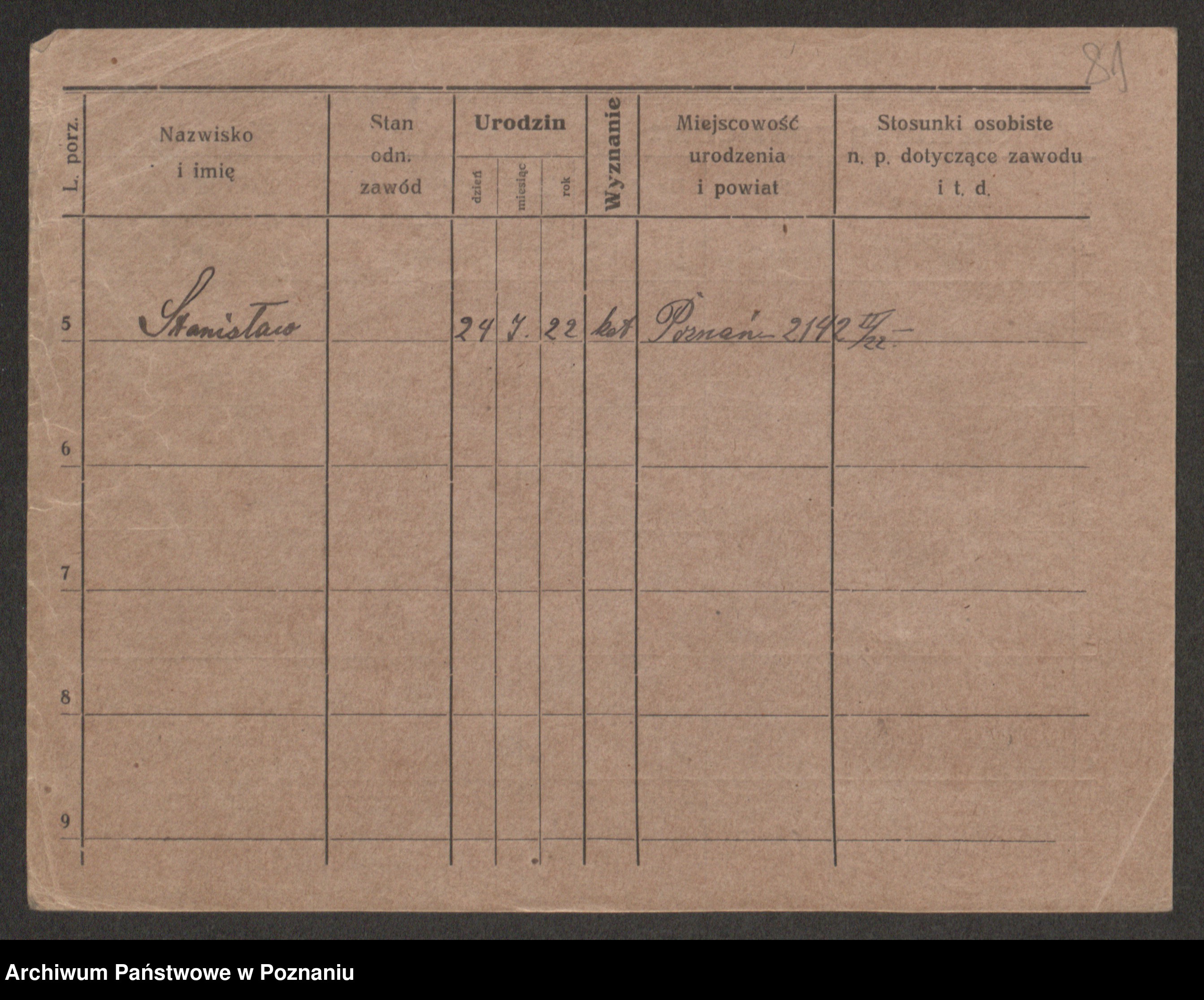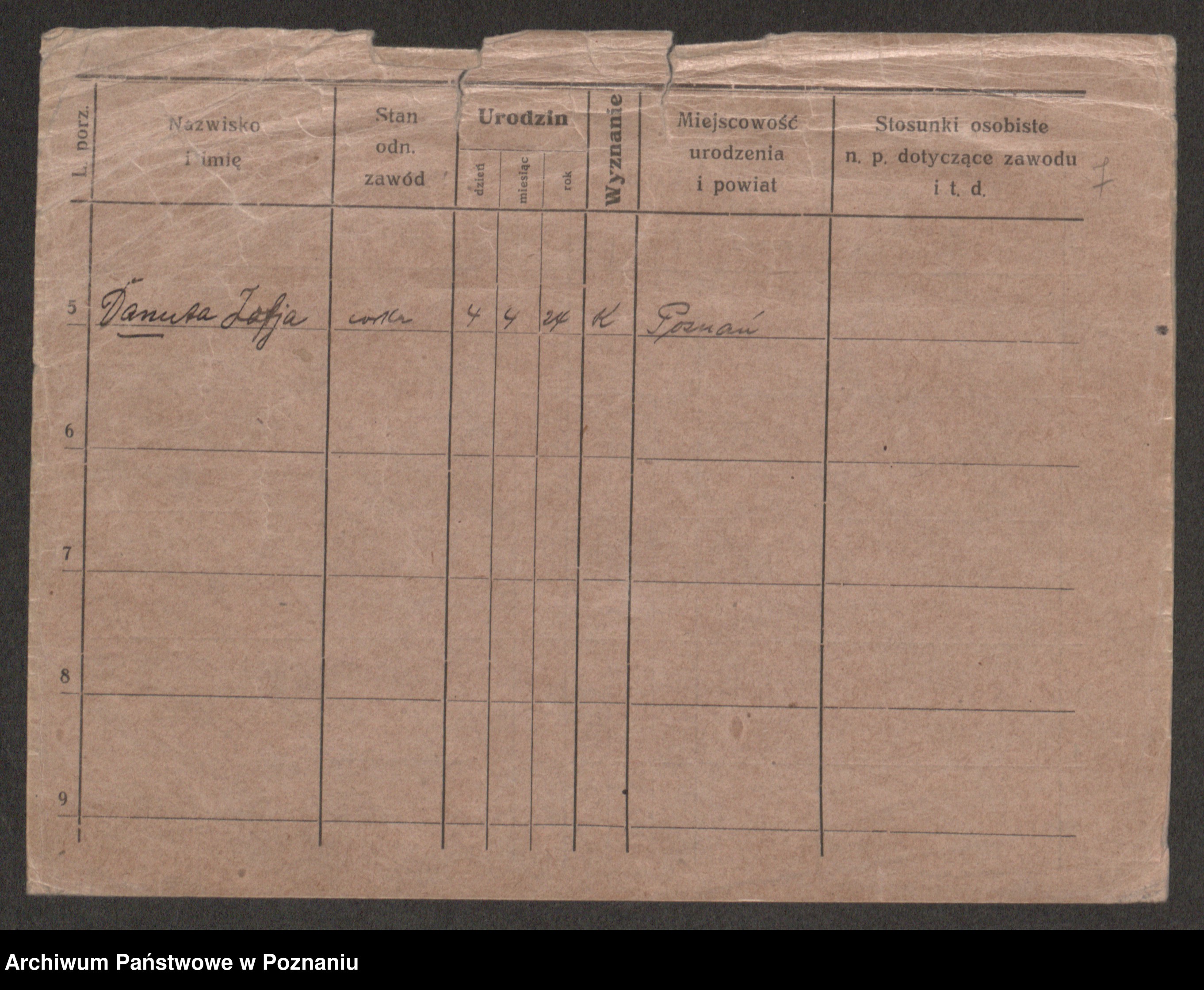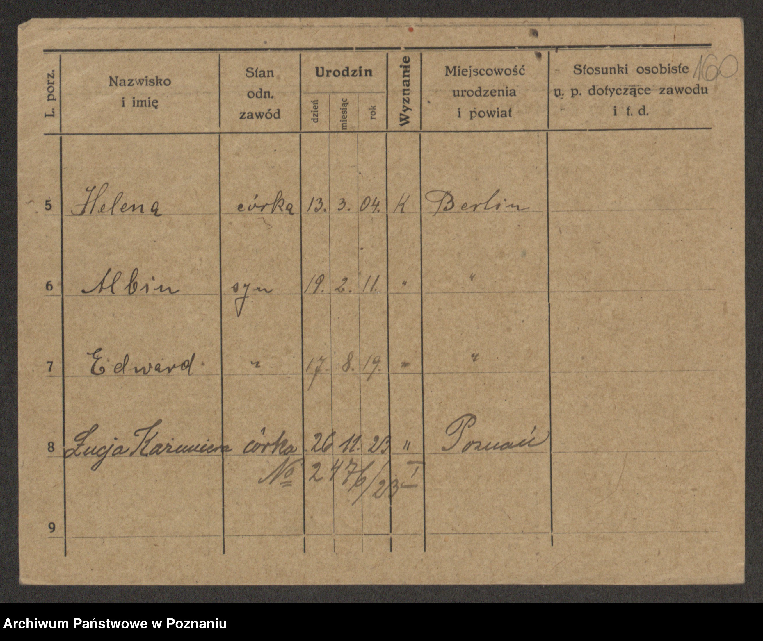 Podgląd karty osobowej dostępny jest po kliknięciu na nazwisko lub ikonkę karty. Można dokonywać powiększenia (ikony na górze) lub przechodzić między kolejnymi skanami (strzałki po bokach).
