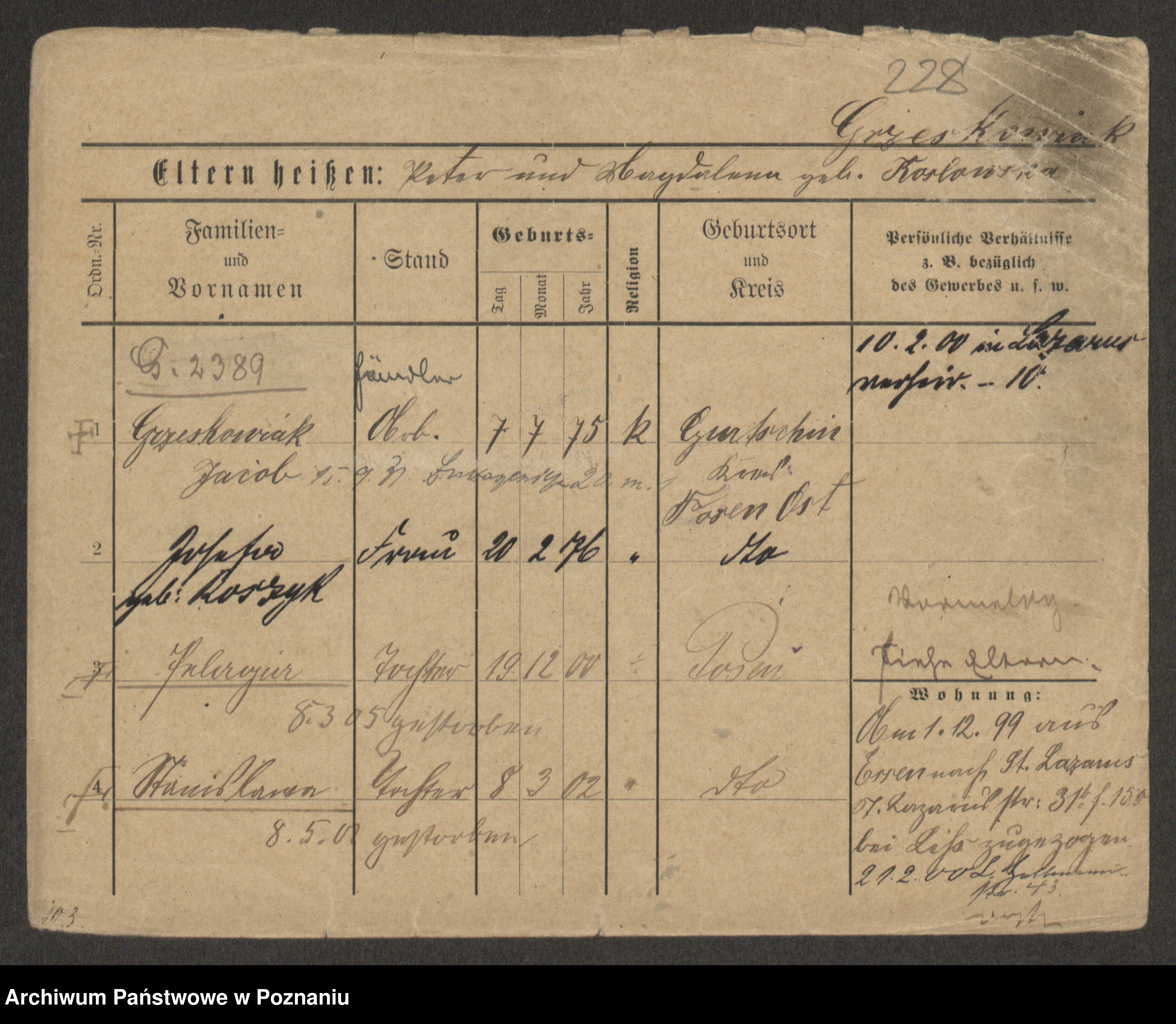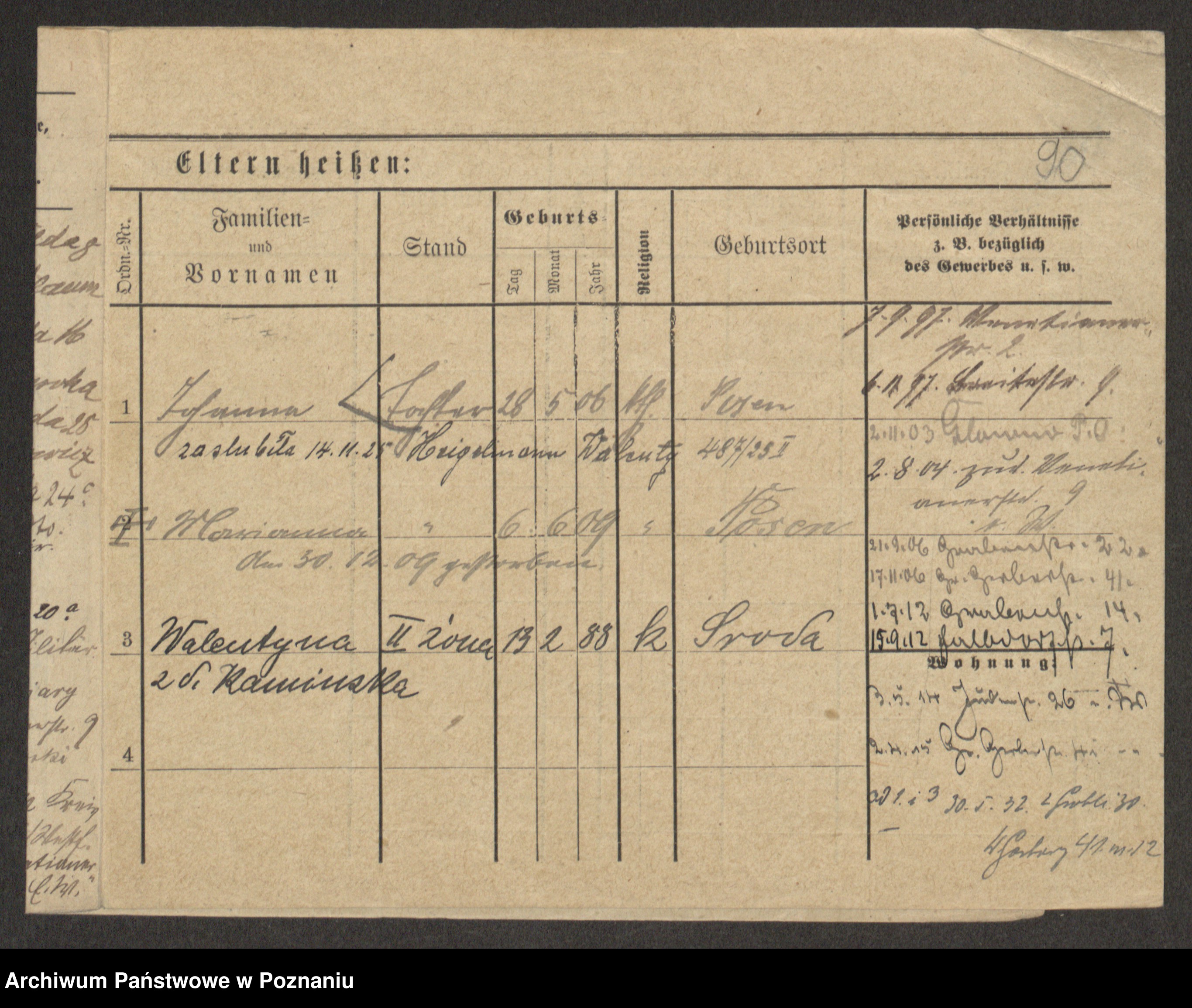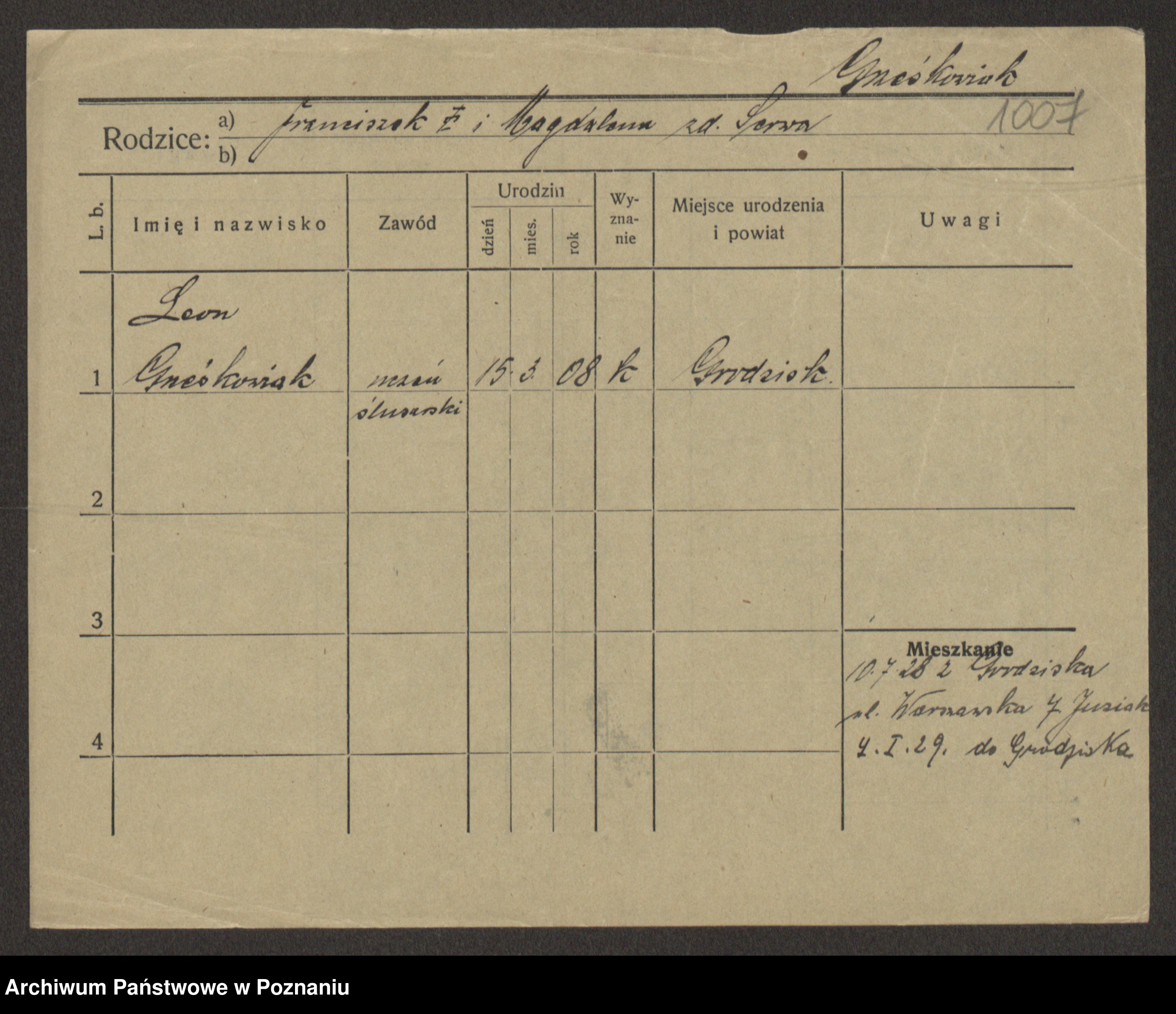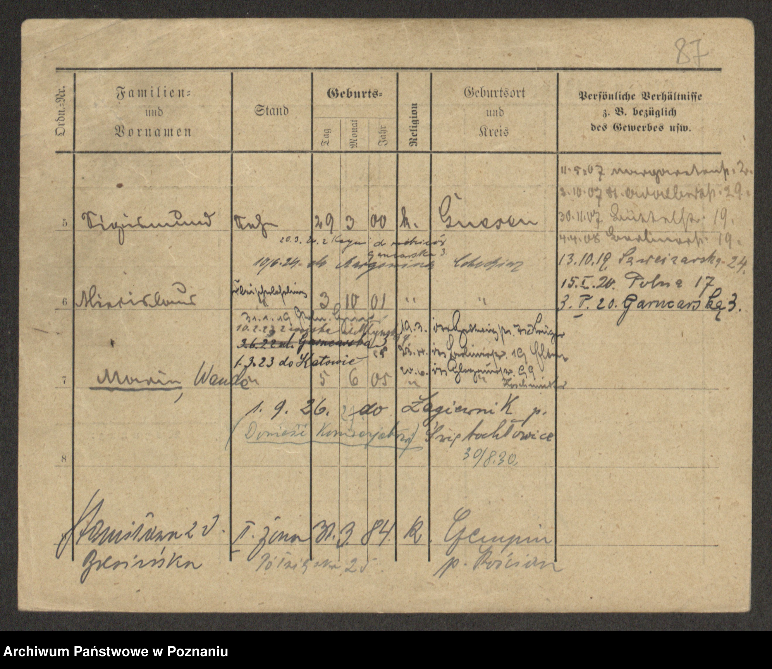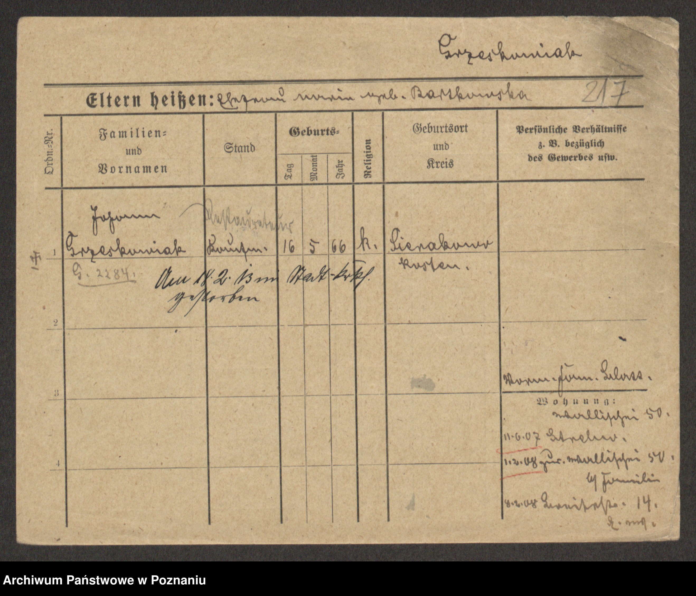 Podgląd karty osobowej dostępny jest po kliknięciu na nazwisko lub ikonkę karty. Można dokonywać powiększenia (ikony na górze) lub przechodzić między kolejnymi skanami (strzałki po bokach).