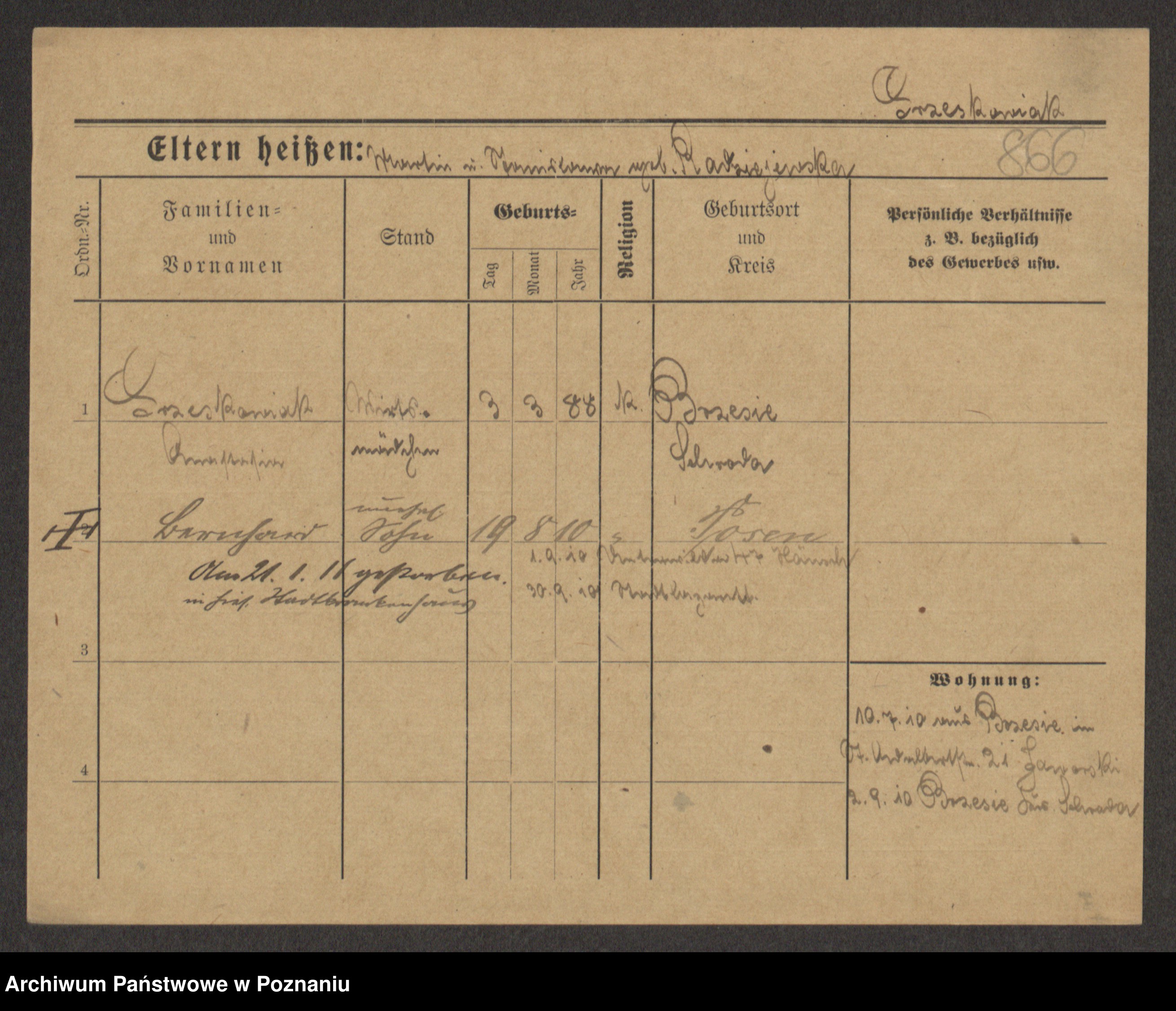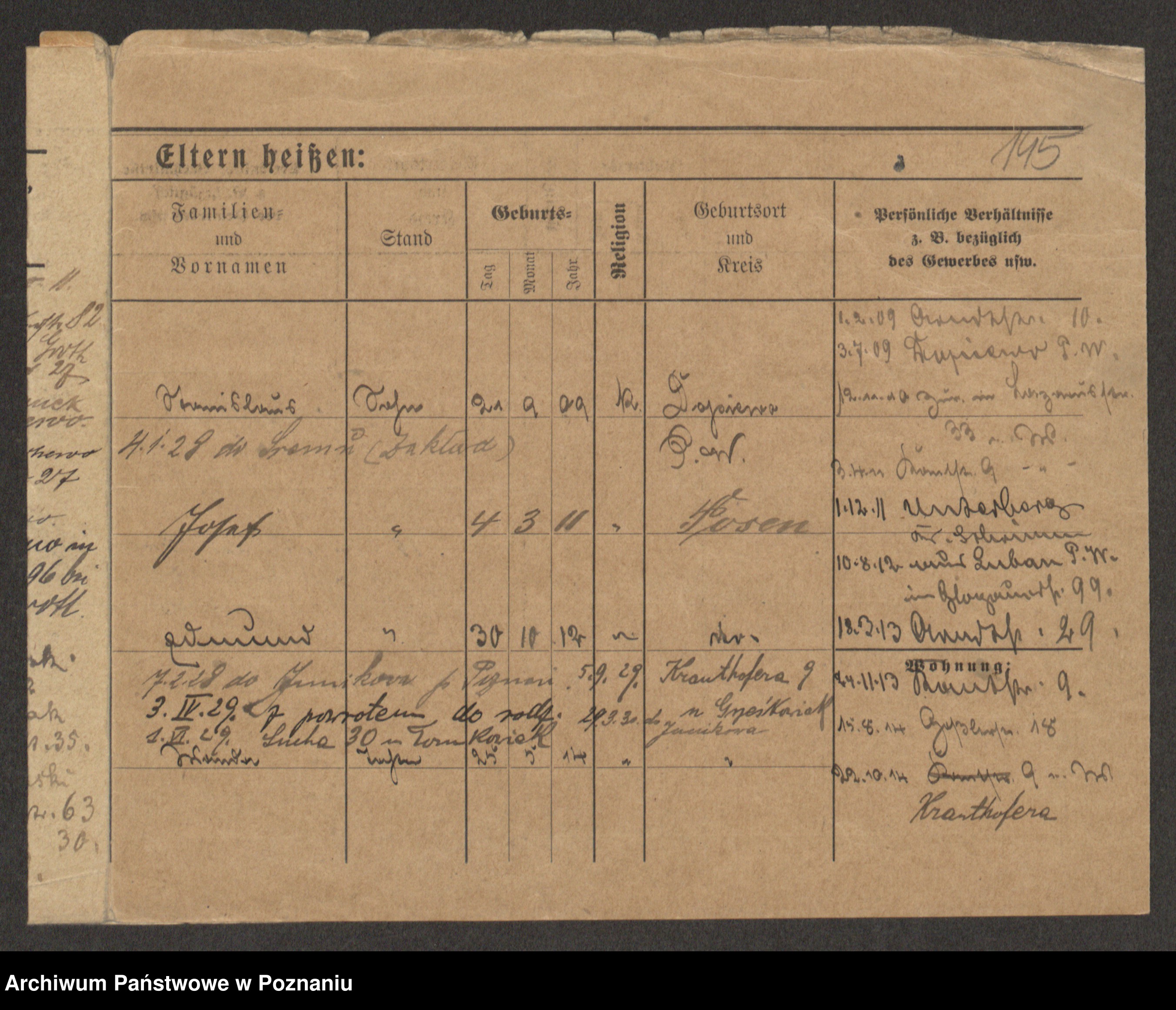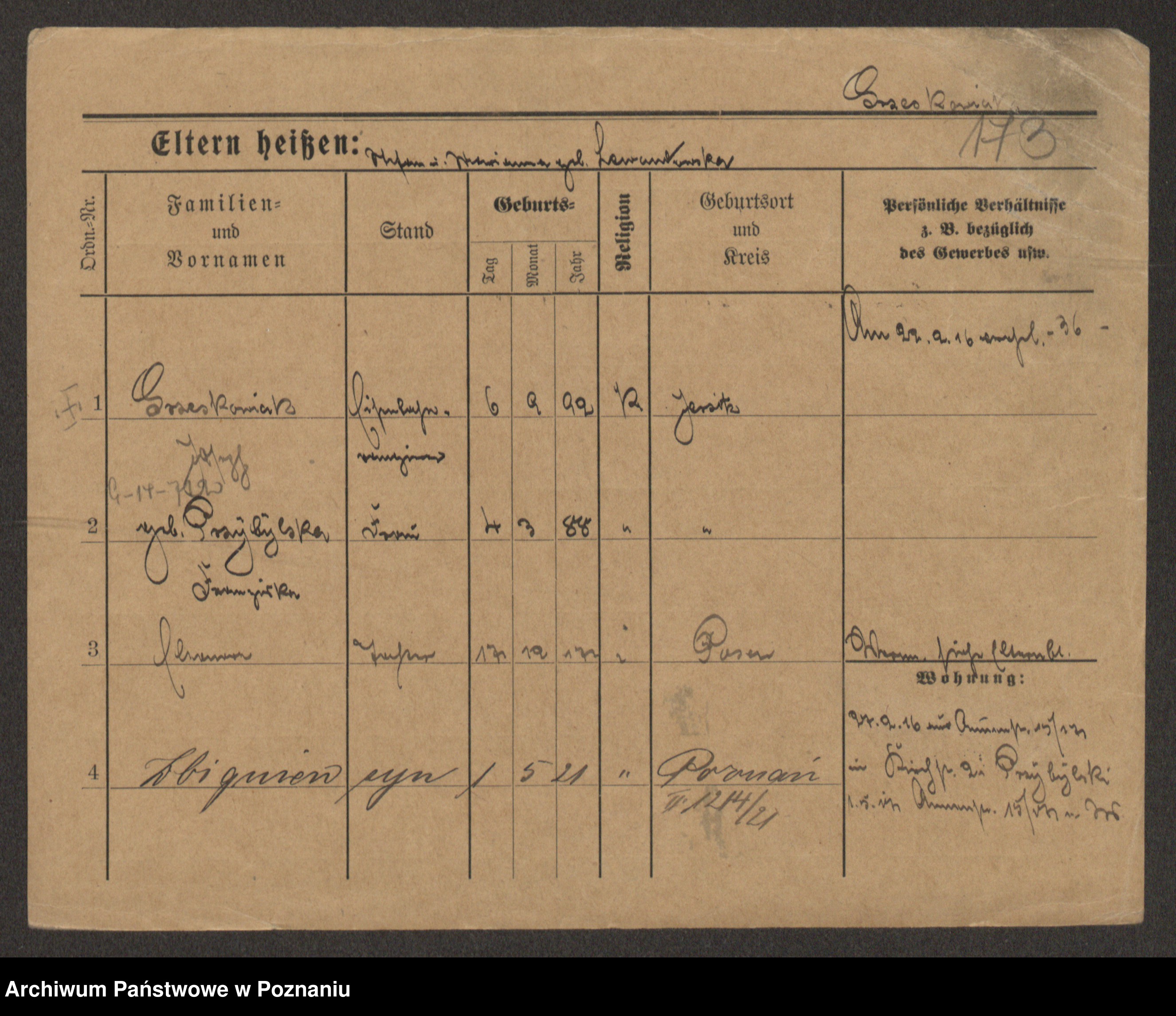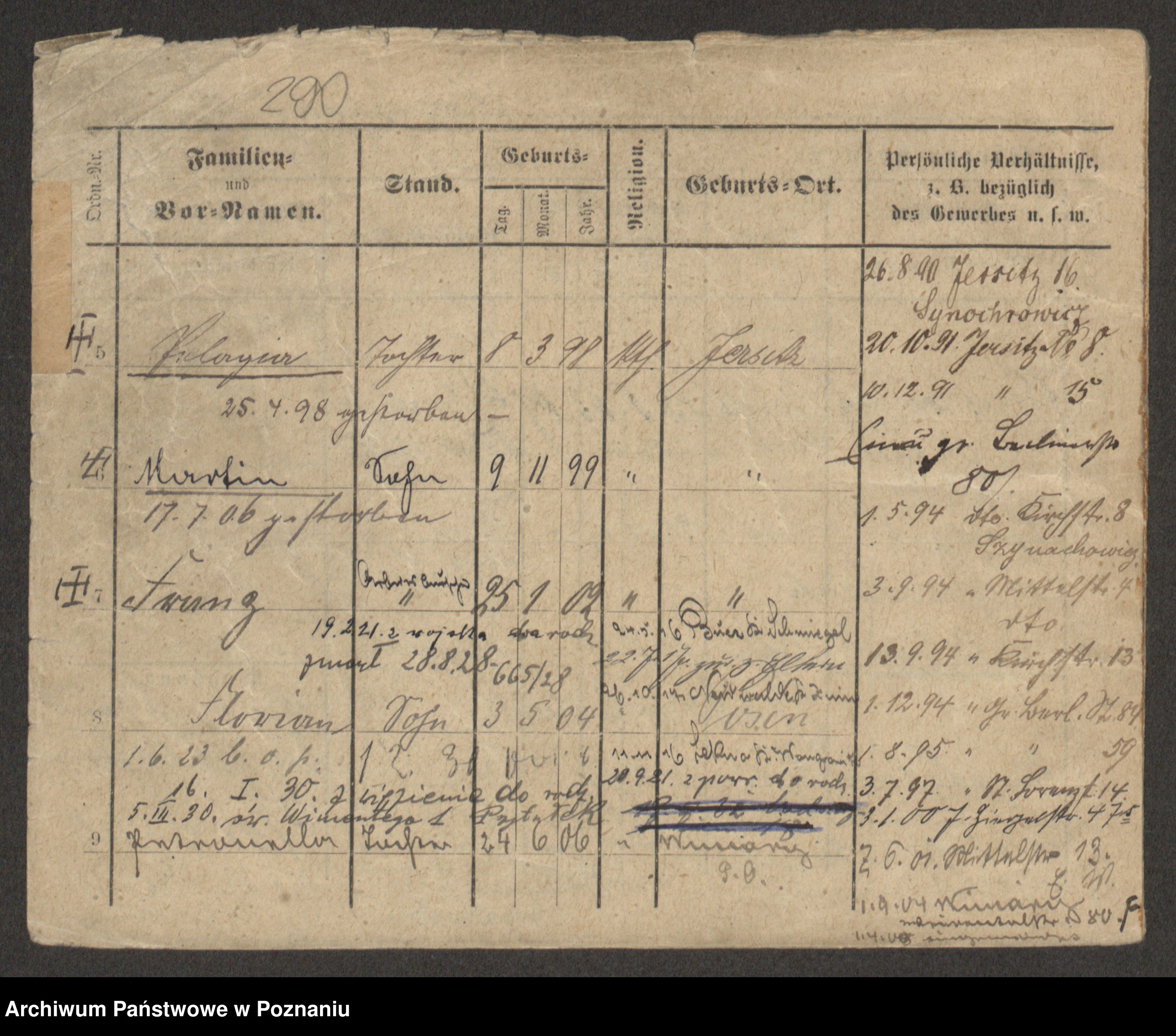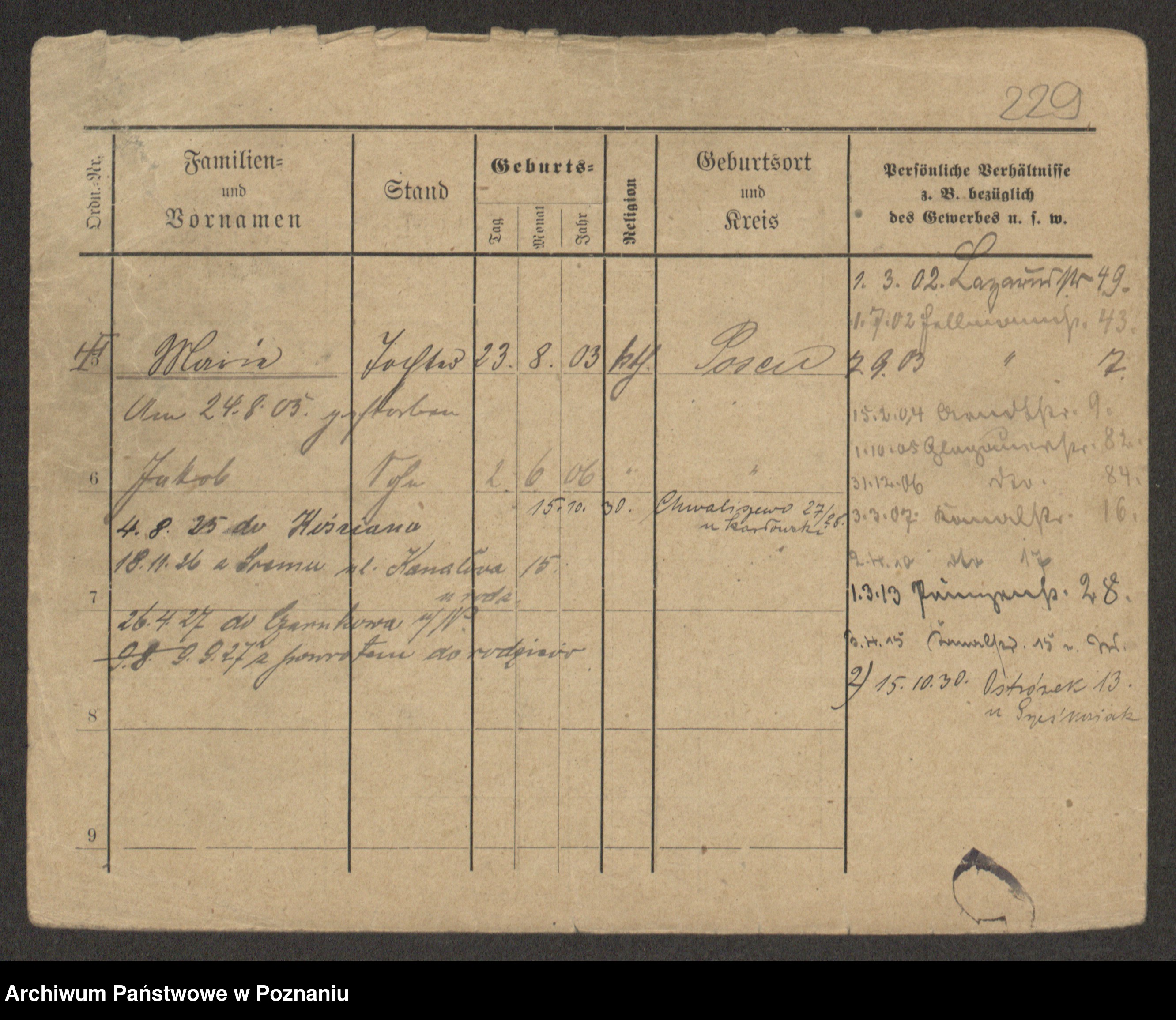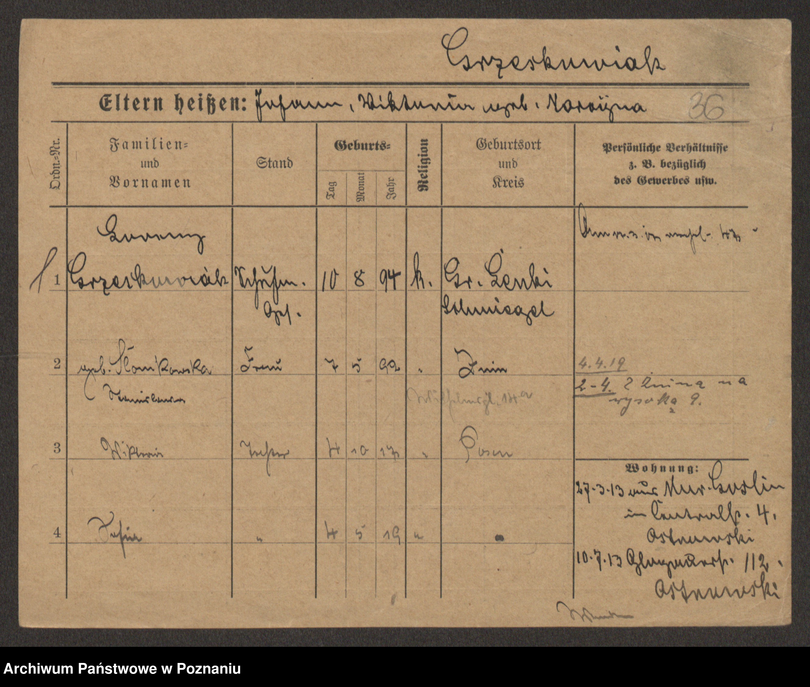 Podgląd karty osobowej dostępny jest po kliknięciu na nazwisko lub ikonkę karty. Można dokonywać powiększenia (ikony na górze) lub przechodzić między kolejnymi skanami (strzałki po bokach).