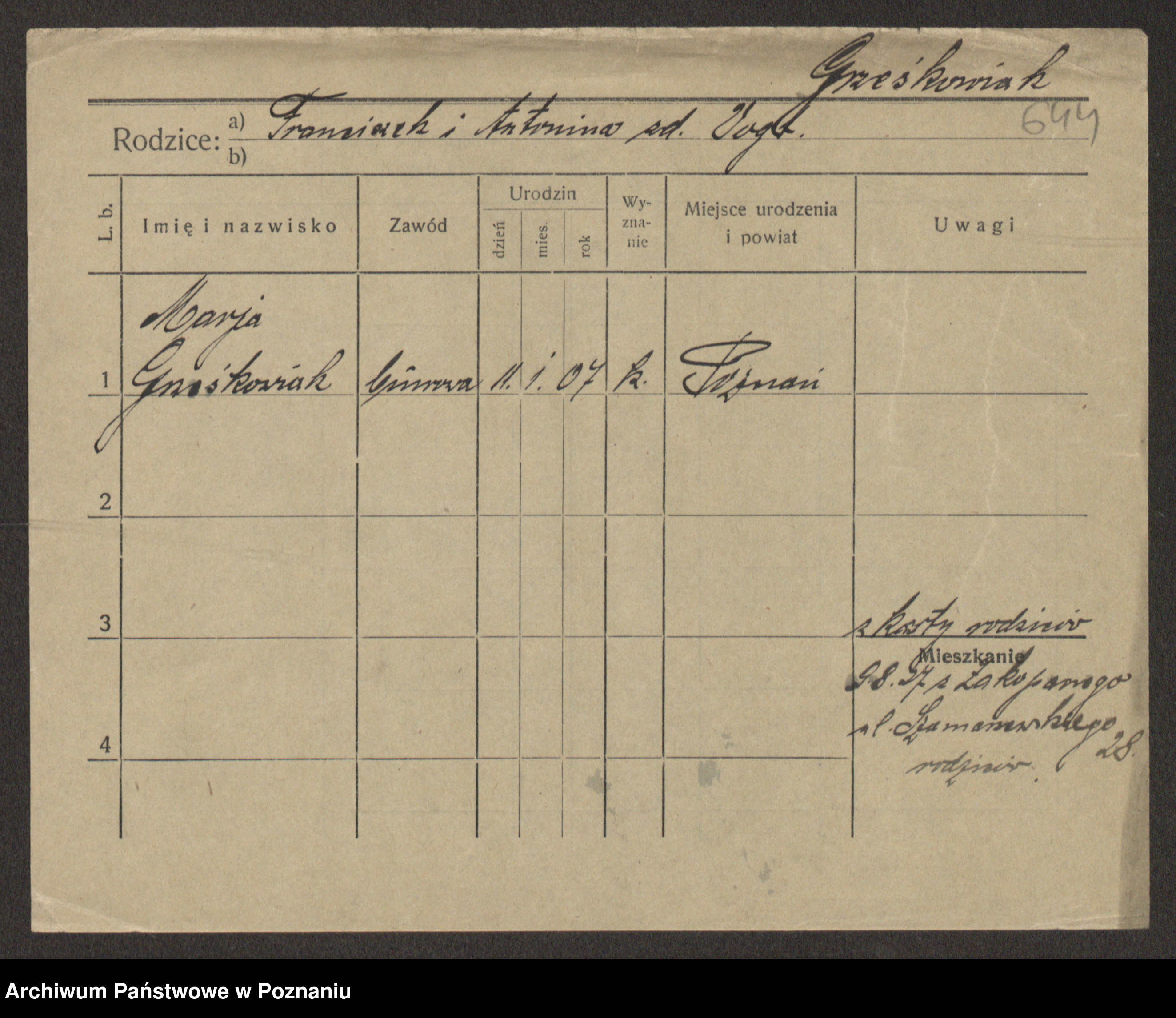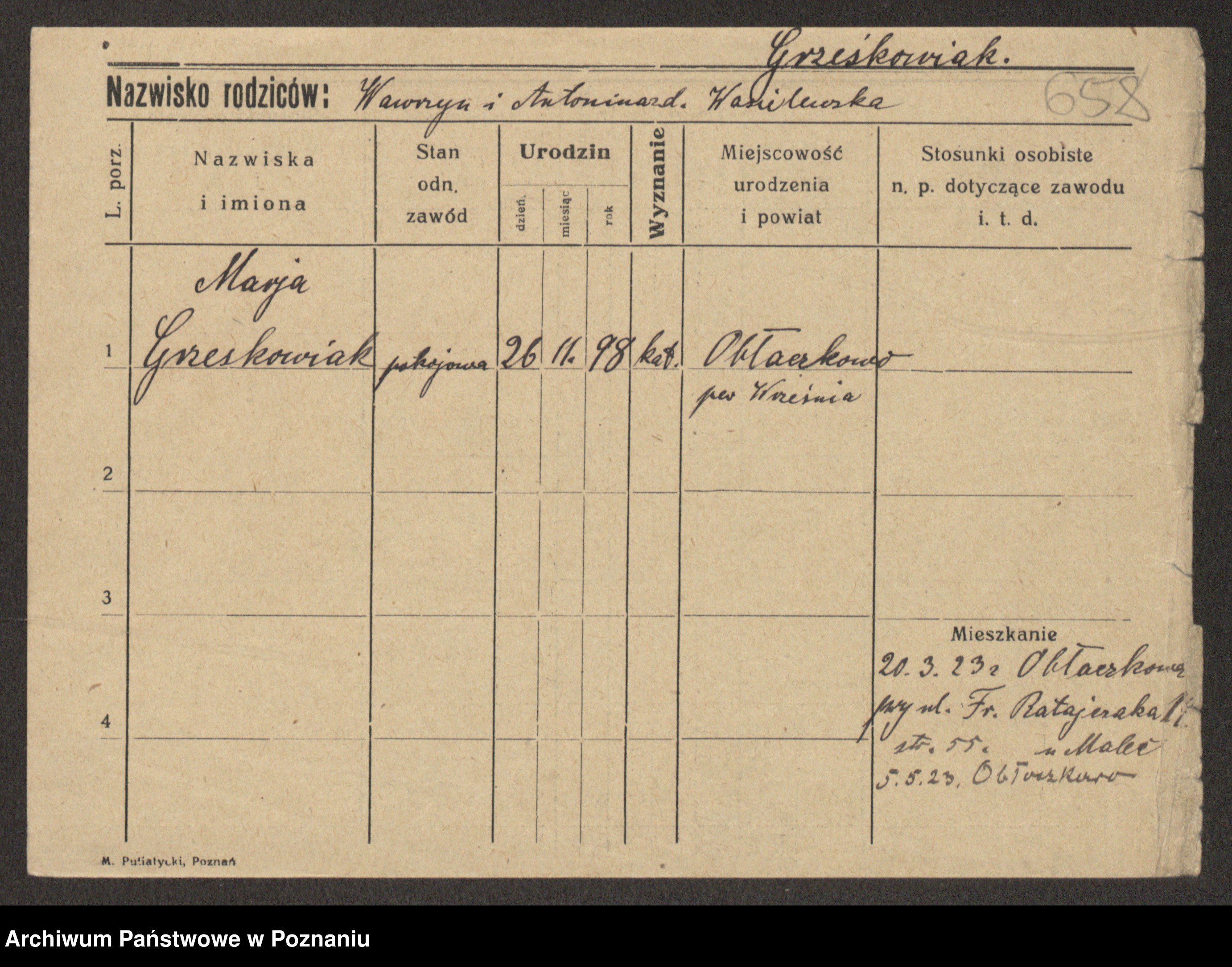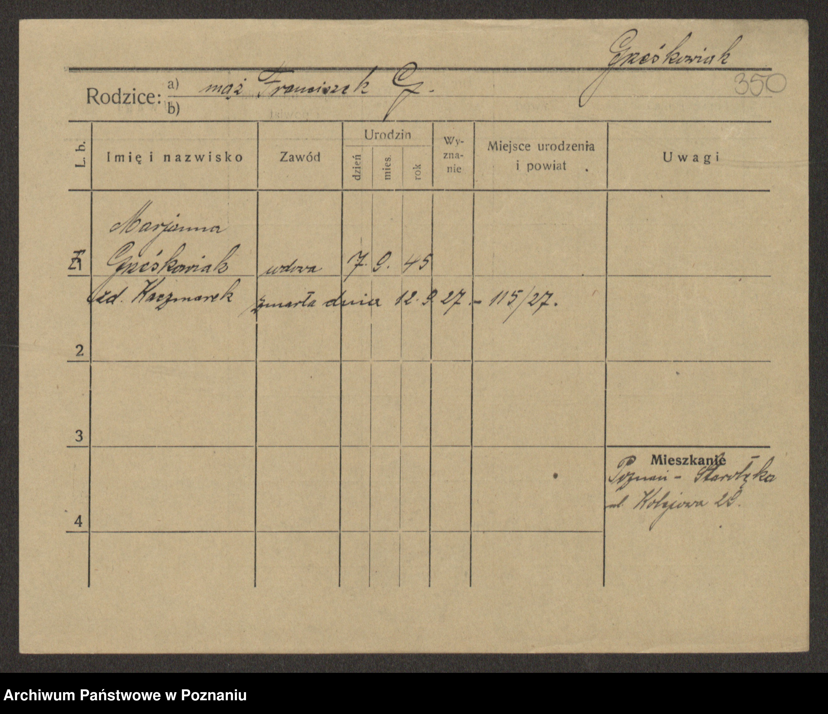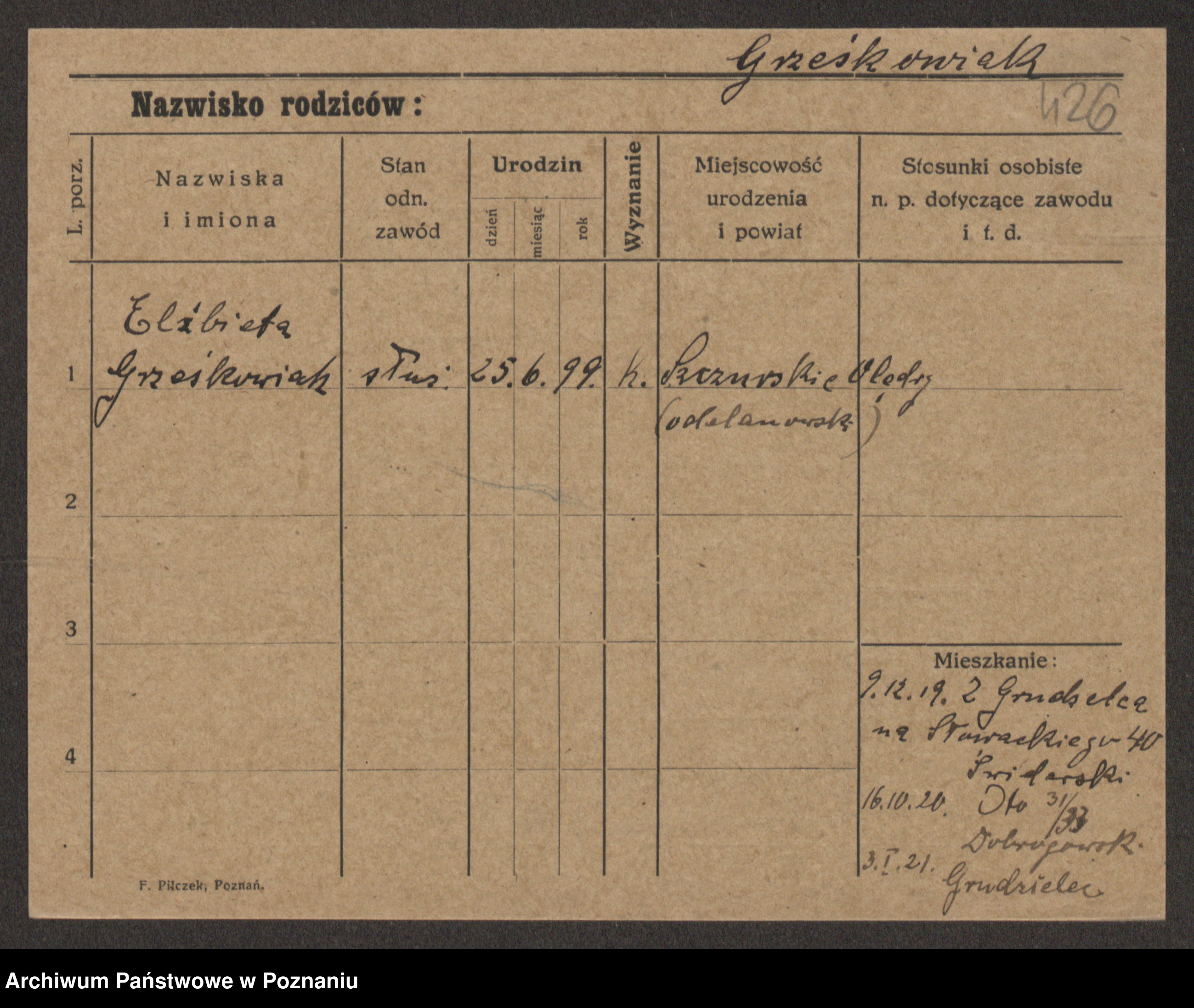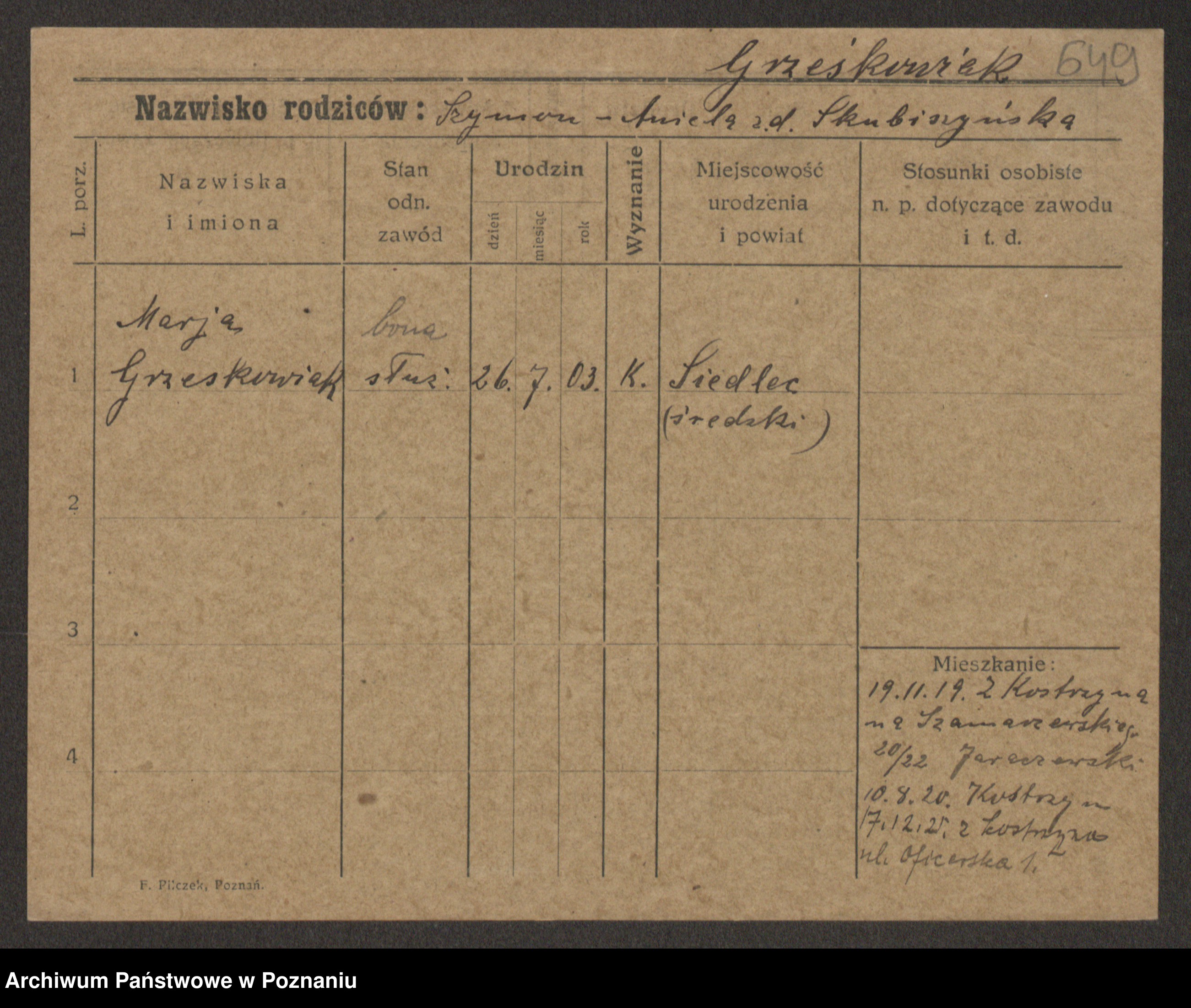Grześkowiak z d. Czechelska, Marja