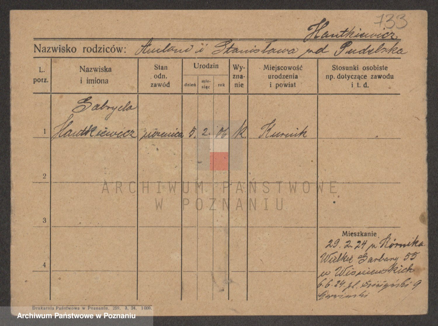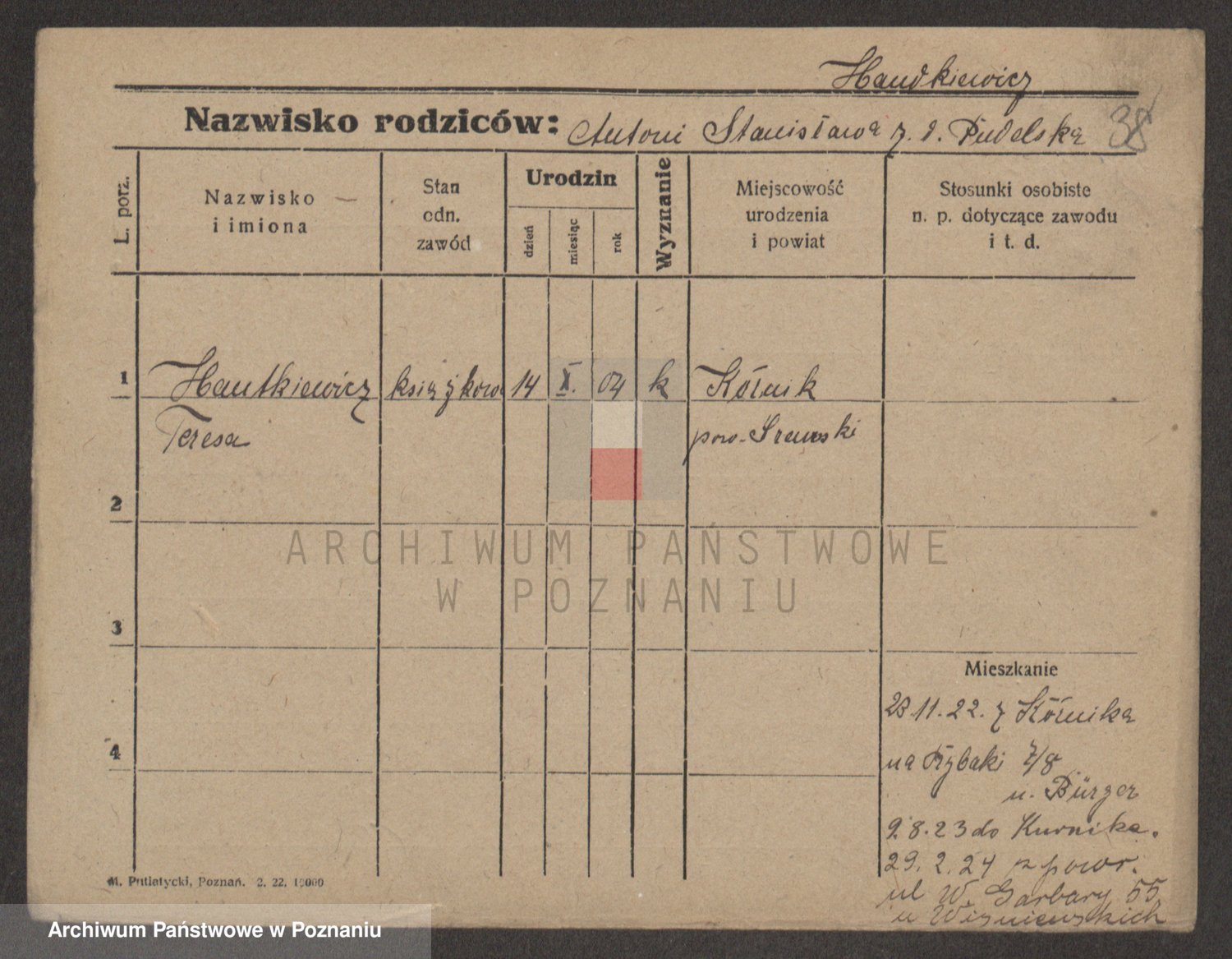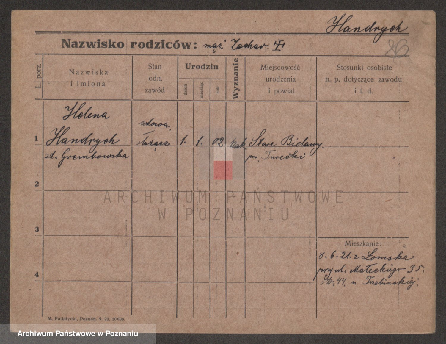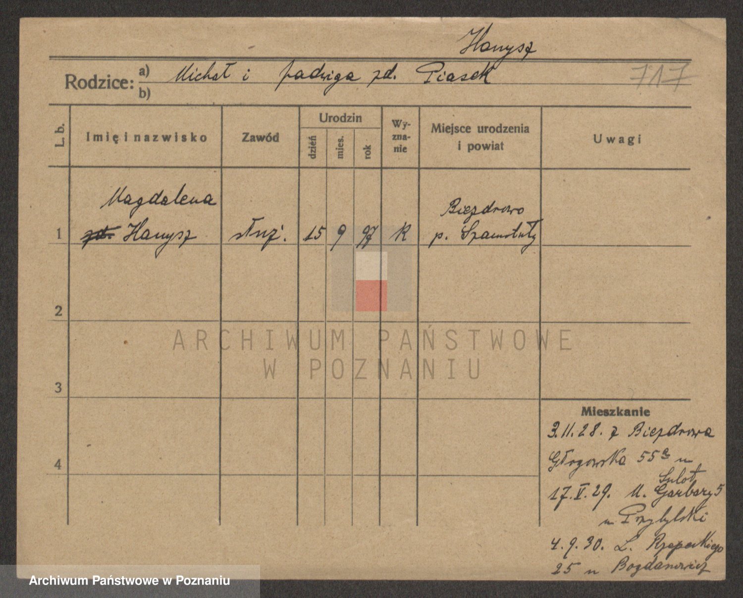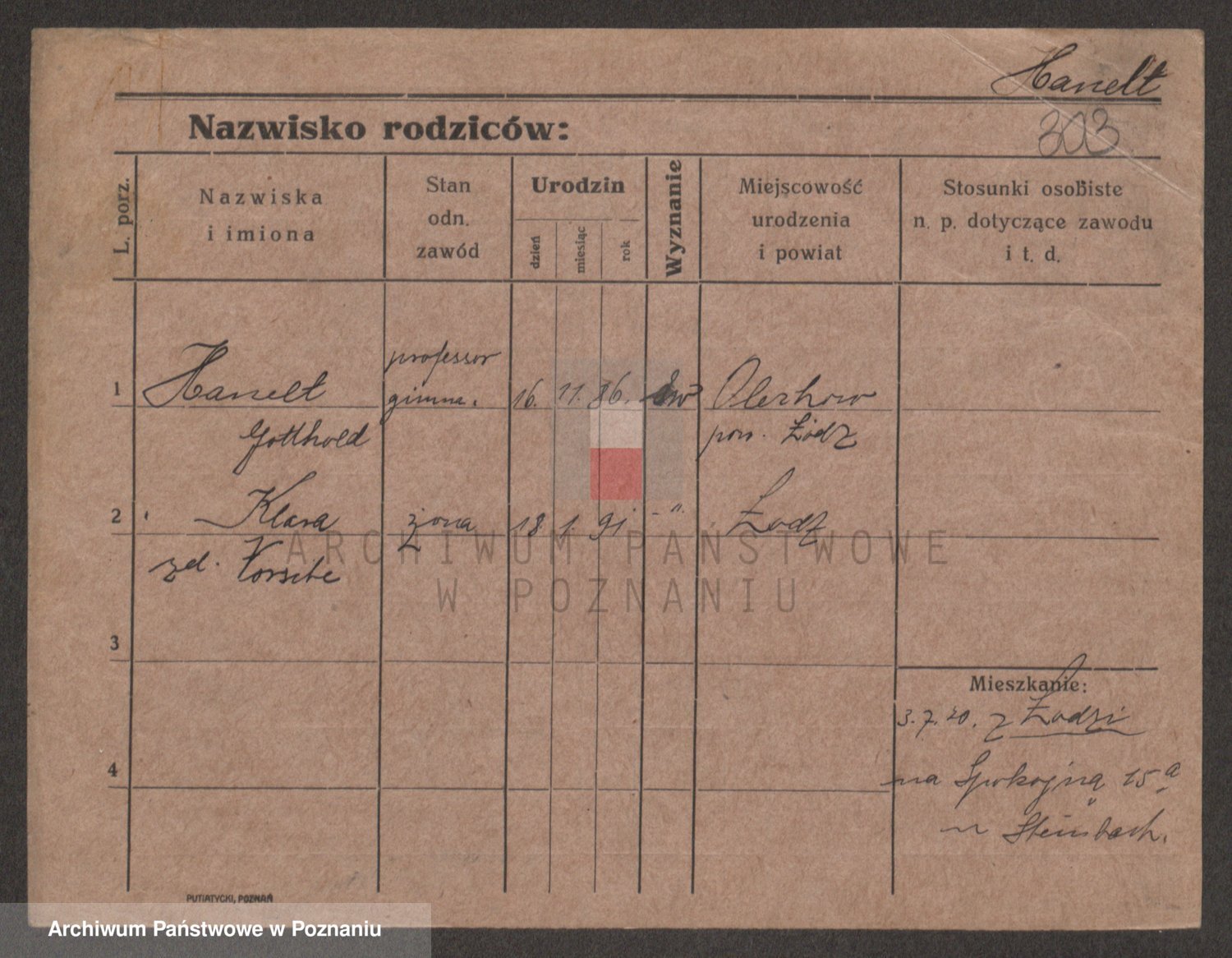 Podgląd karty osobowej dostępny jest po kliknięciu na nazwisko lub ikonkę karty. Można dokonywać powiększenia (ikony na górze) lub przechodzić między kolejnymi skanami (strzałki po bokach).
