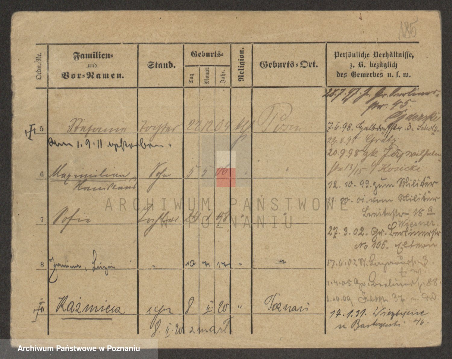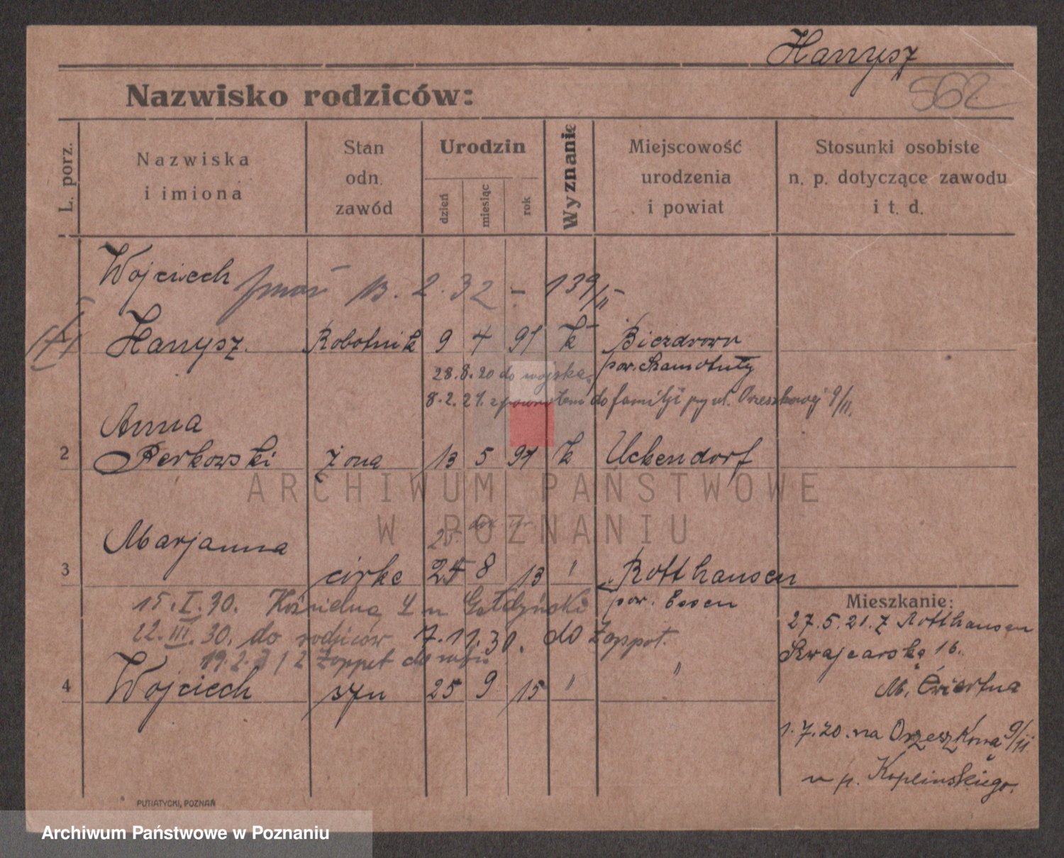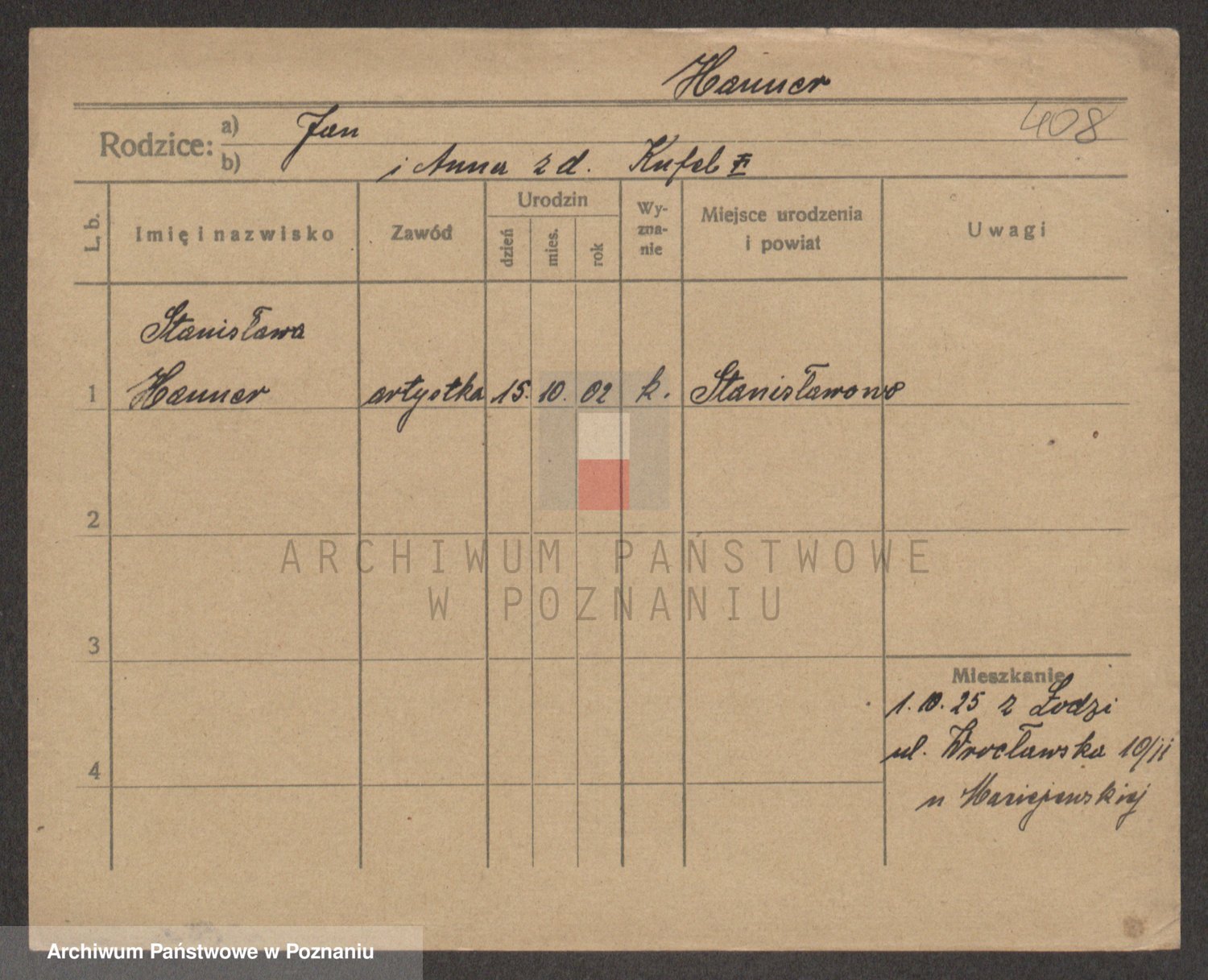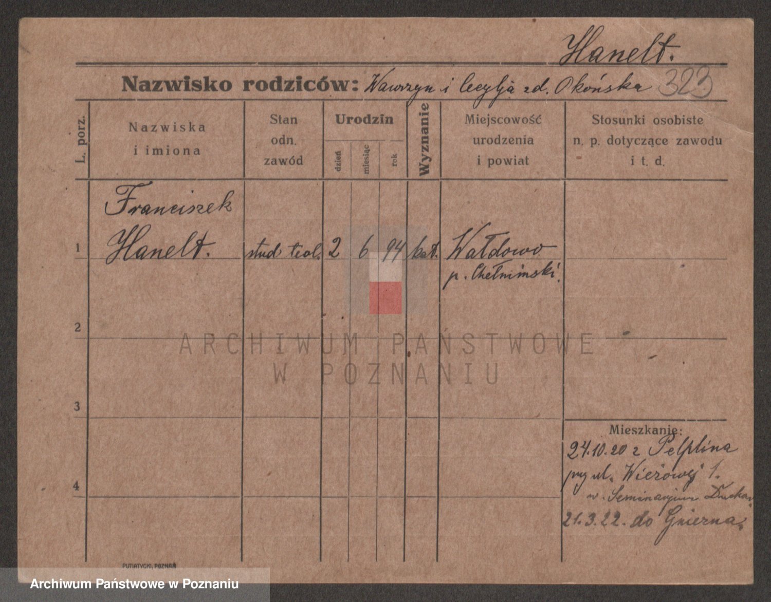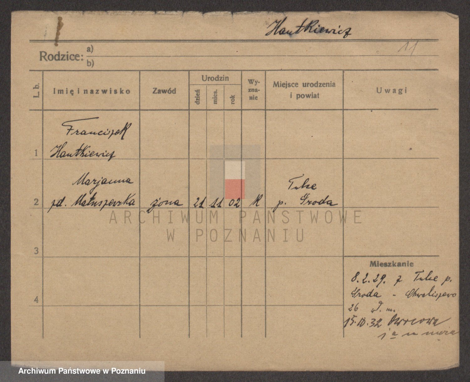 Podgląd karty osobowej dostępny jest po kliknięciu na nazwisko lub ikonkę karty. Można dokonywać powiększenia (ikony na górze) lub przechodzić między kolejnymi skanami (strzałki po bokach).