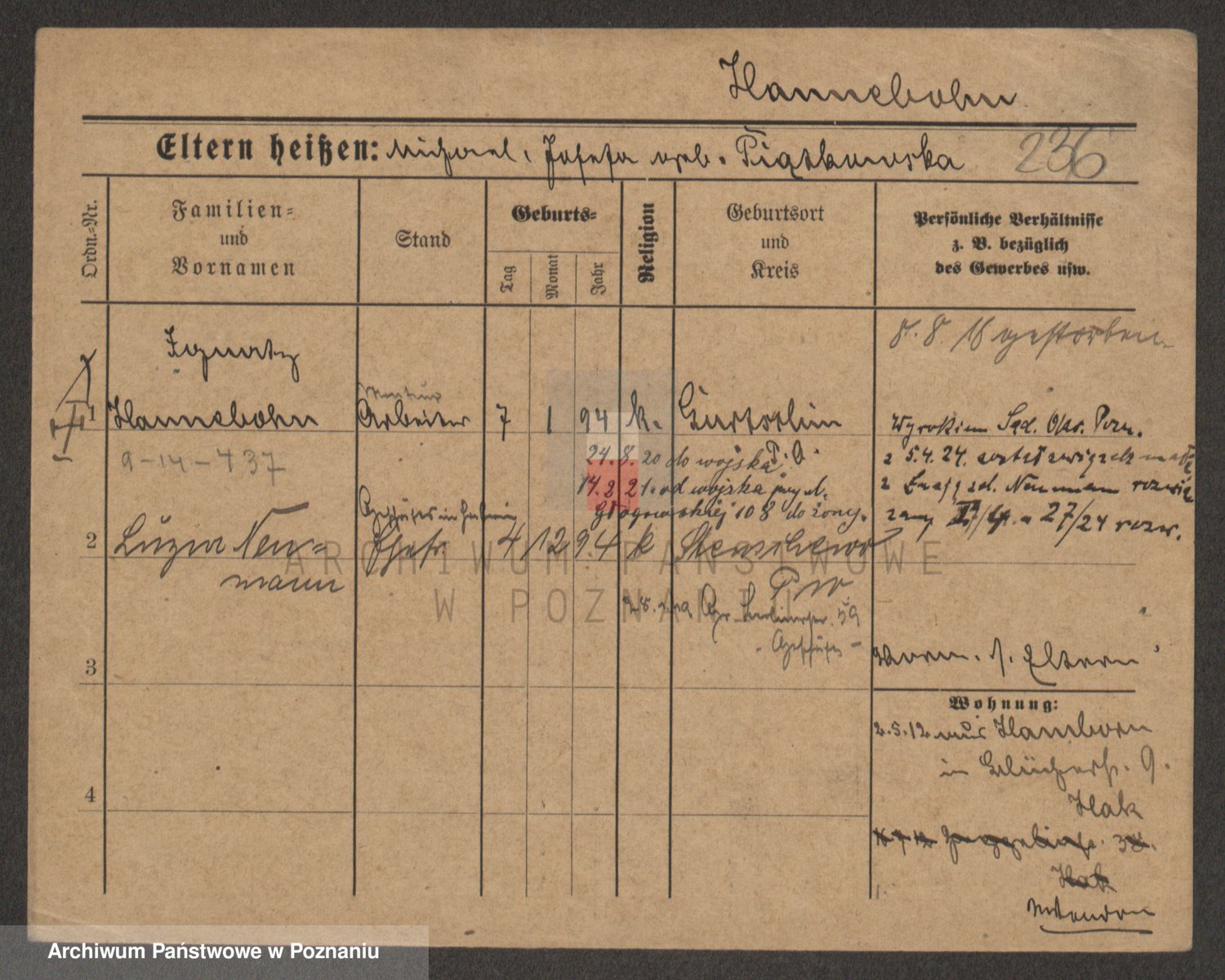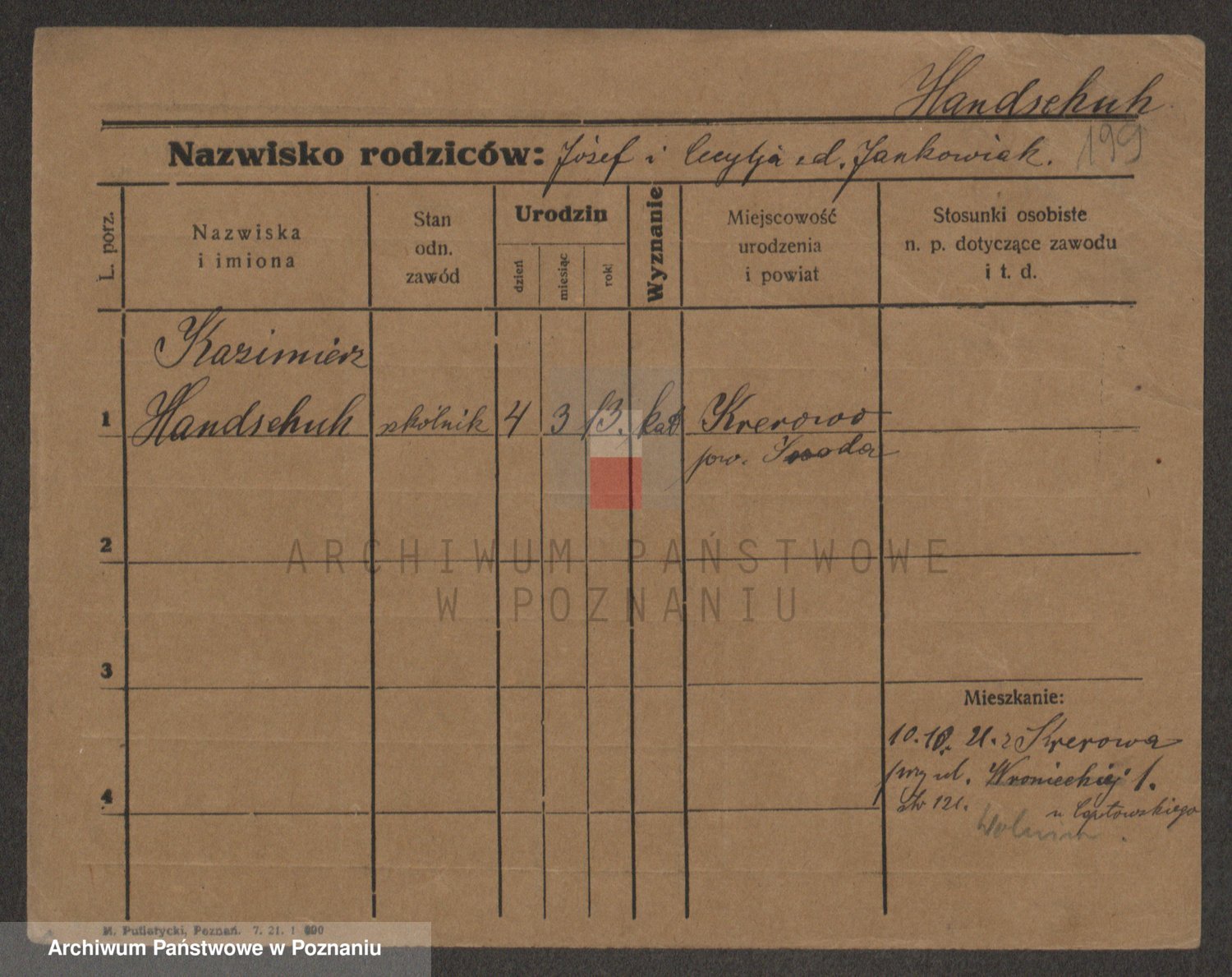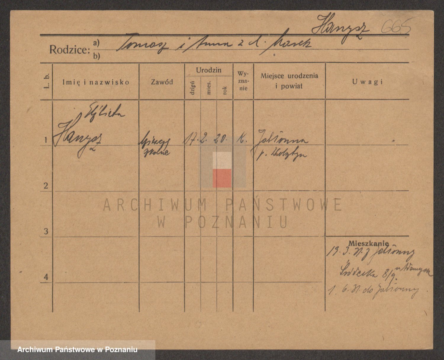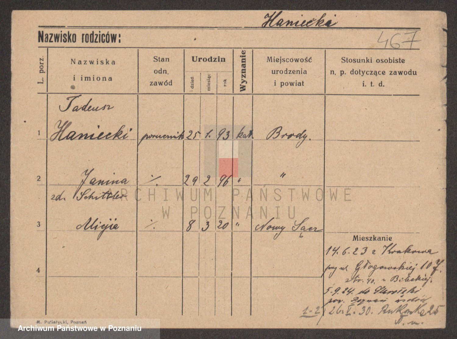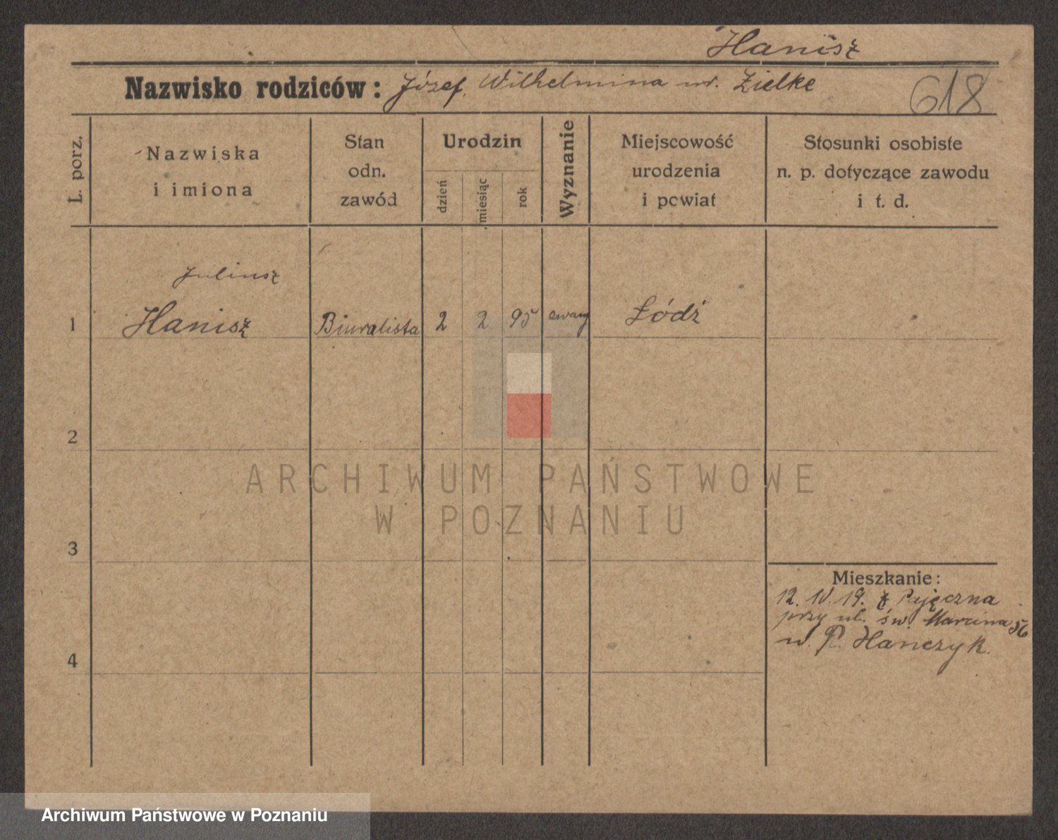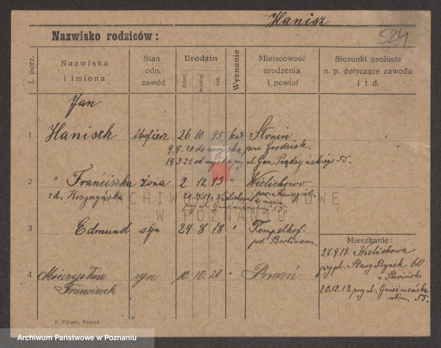 Podgląd karty osobowej dostępny jest po kliknięciu na nazwisko lub ikonkę karty. Można dokonywać powiększenia (ikony na górze) lub przechodzić między kolejnymi skanami (strzałki po bokach).