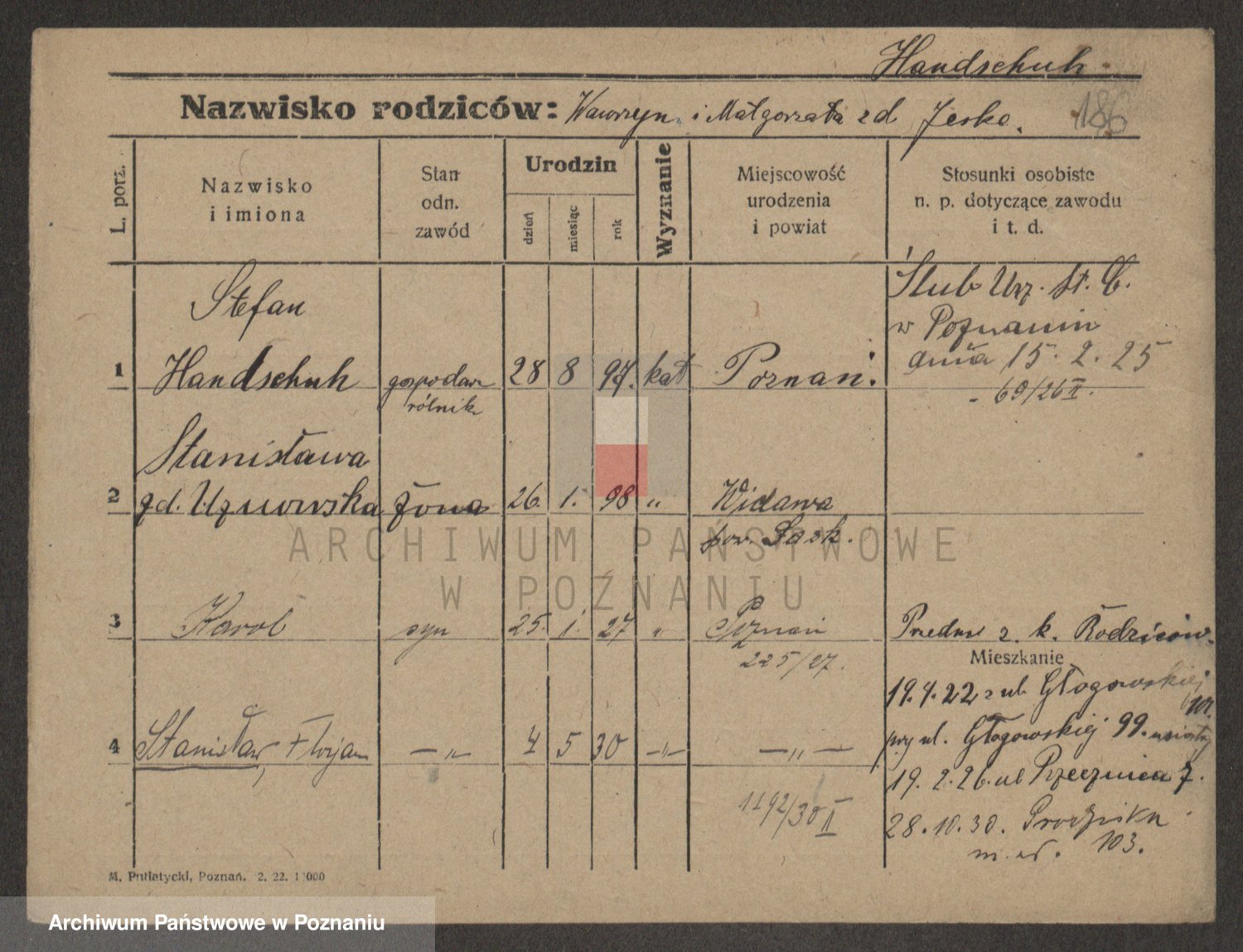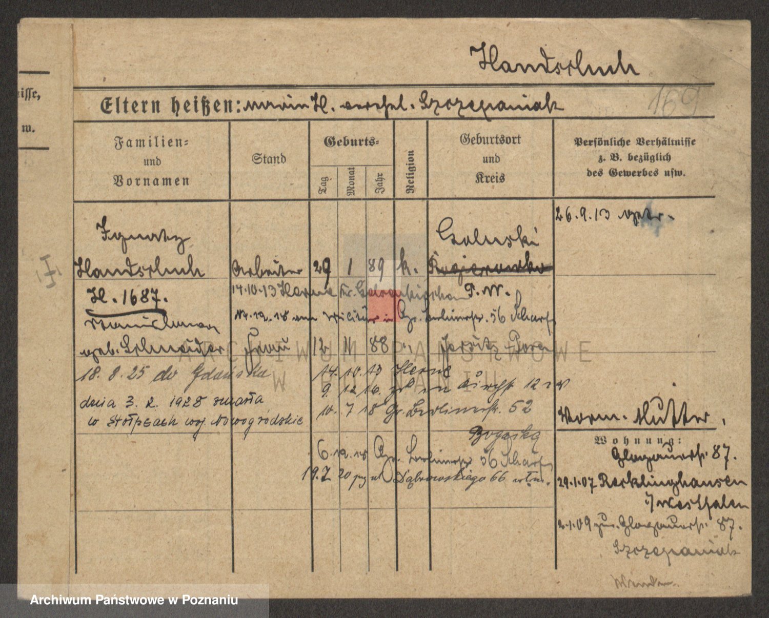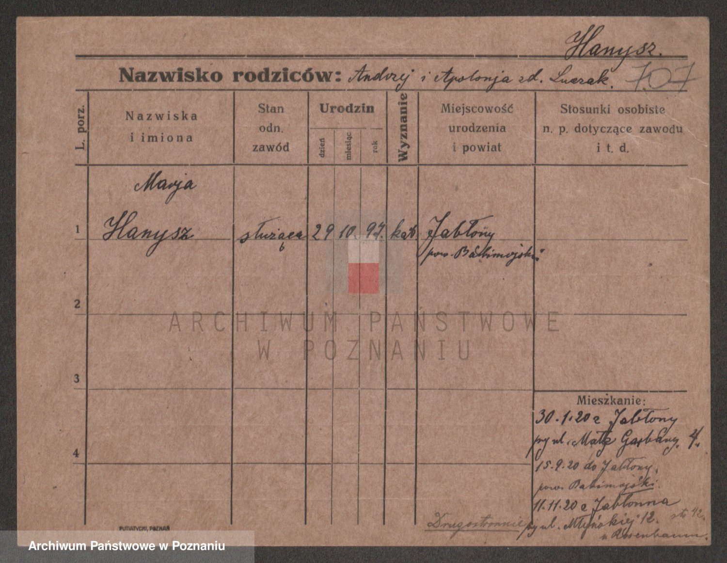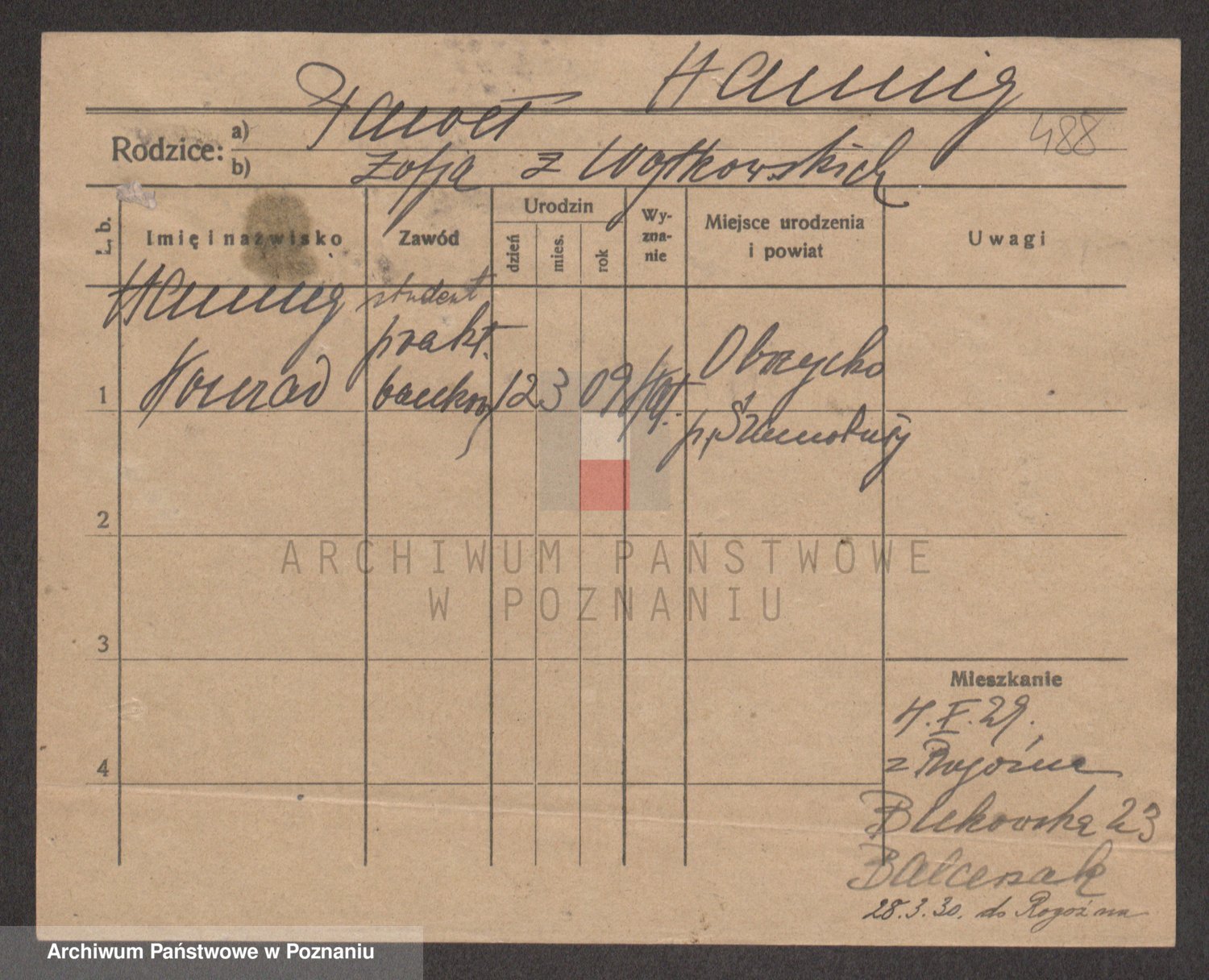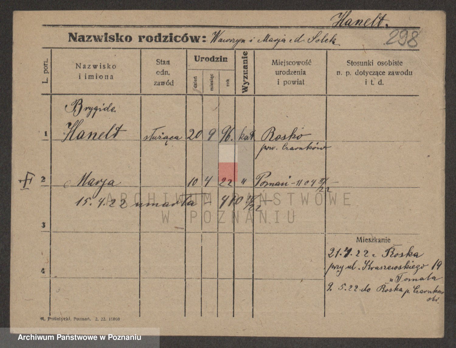 Podgląd karty osobowej dostępny jest po kliknięciu na nazwisko lub ikonkę karty. Można dokonywać powiększenia (ikony na górze) lub przechodzić między kolejnymi skanami (strzałki po bokach).