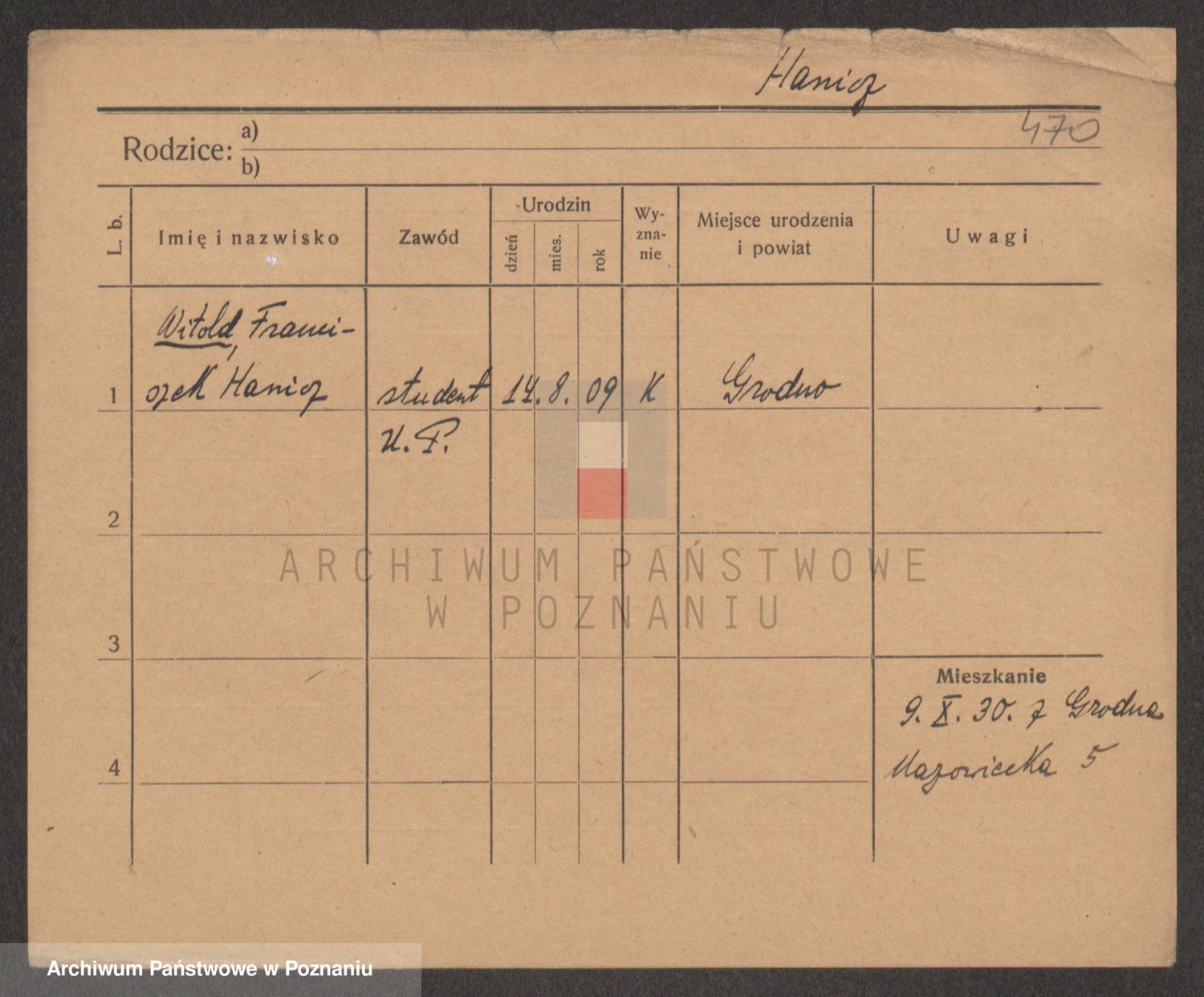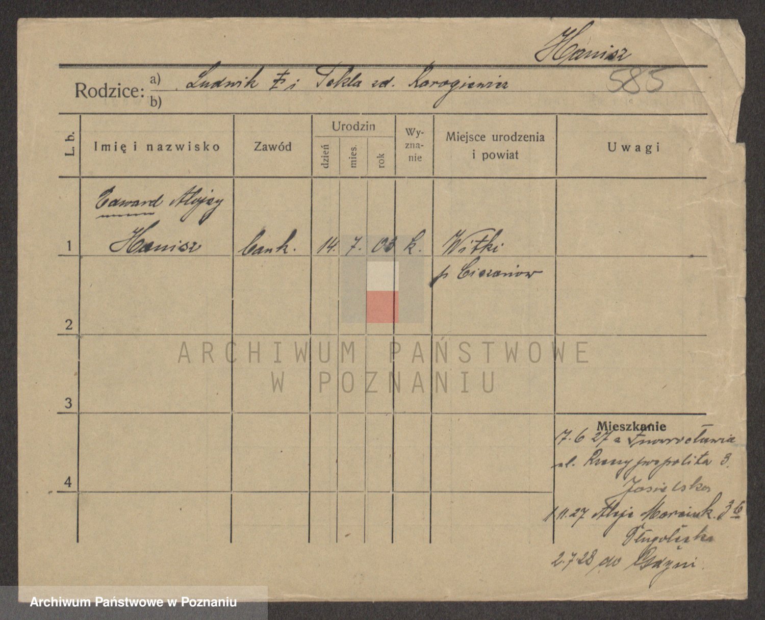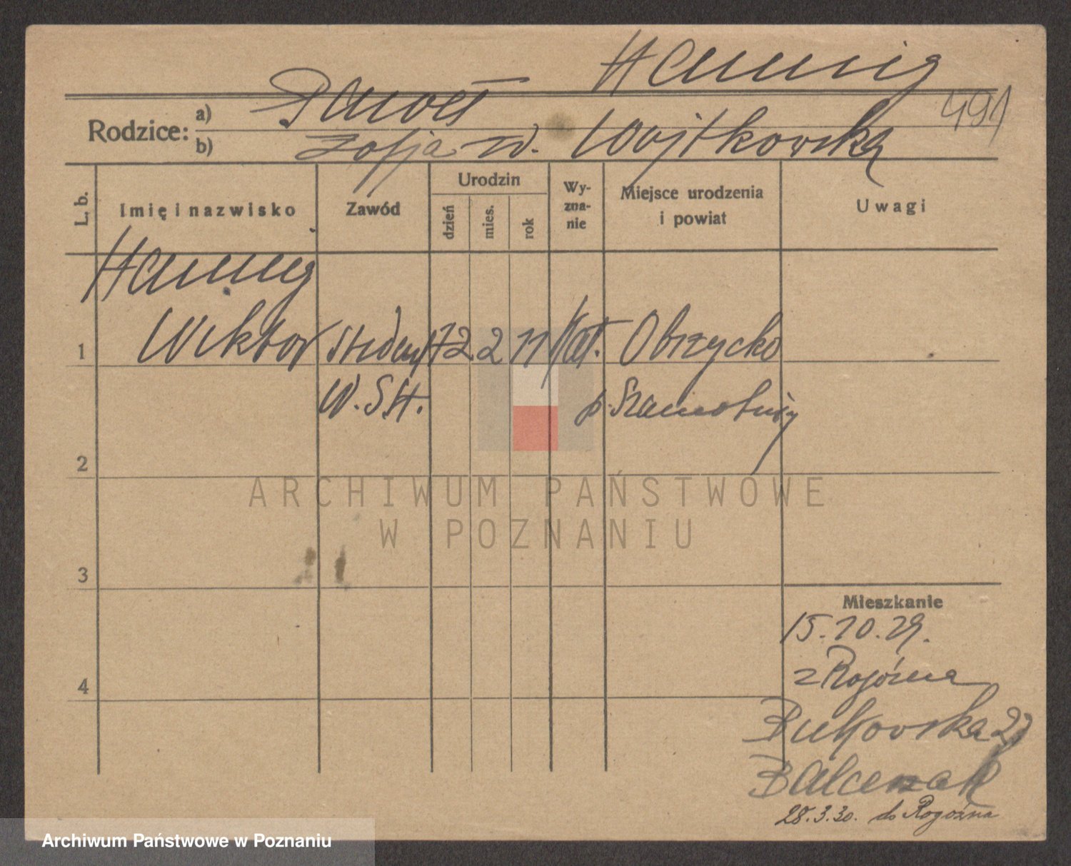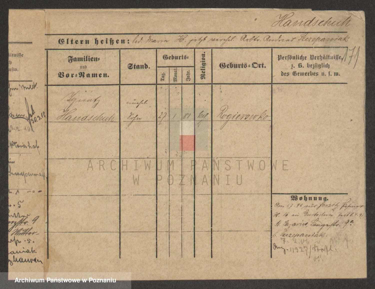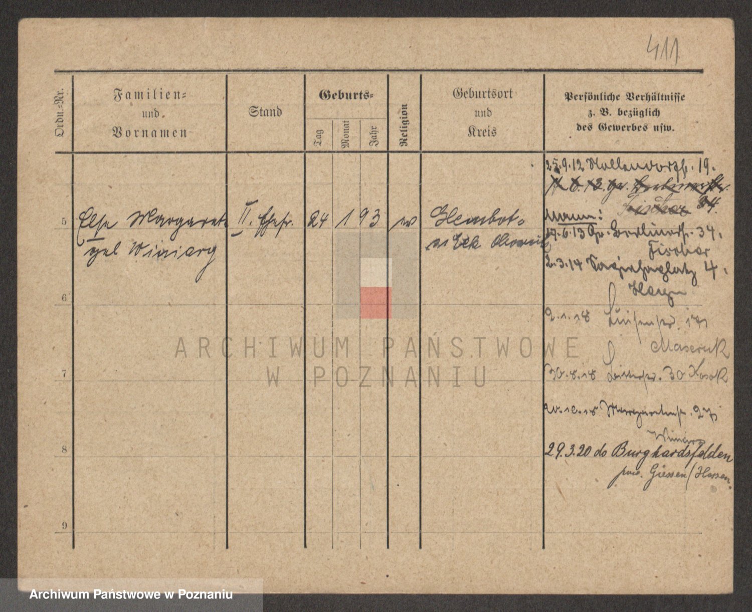 Podgląd karty osobowej dostępny jest po kliknięciu na nazwisko lub ikonkę karty. Można dokonywać powiększenia (ikony na górze) lub przechodzić między kolejnymi skanami (strzałki po bokach).