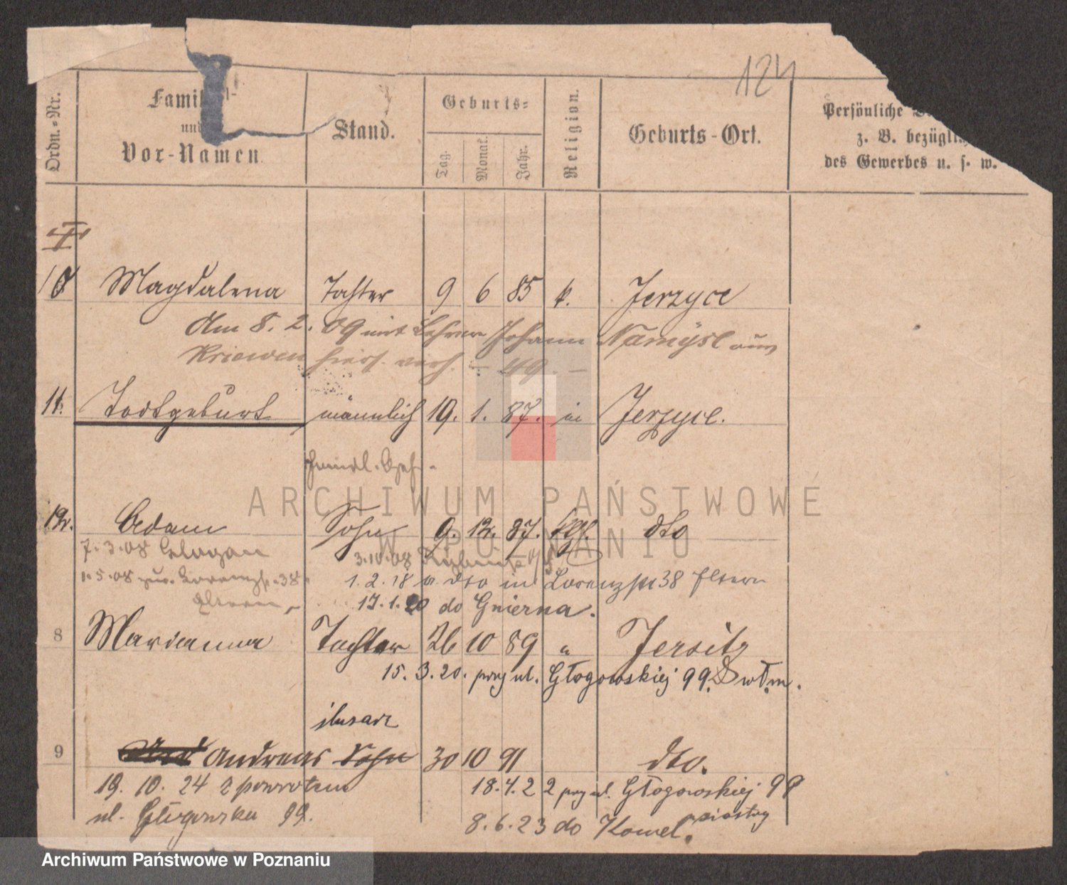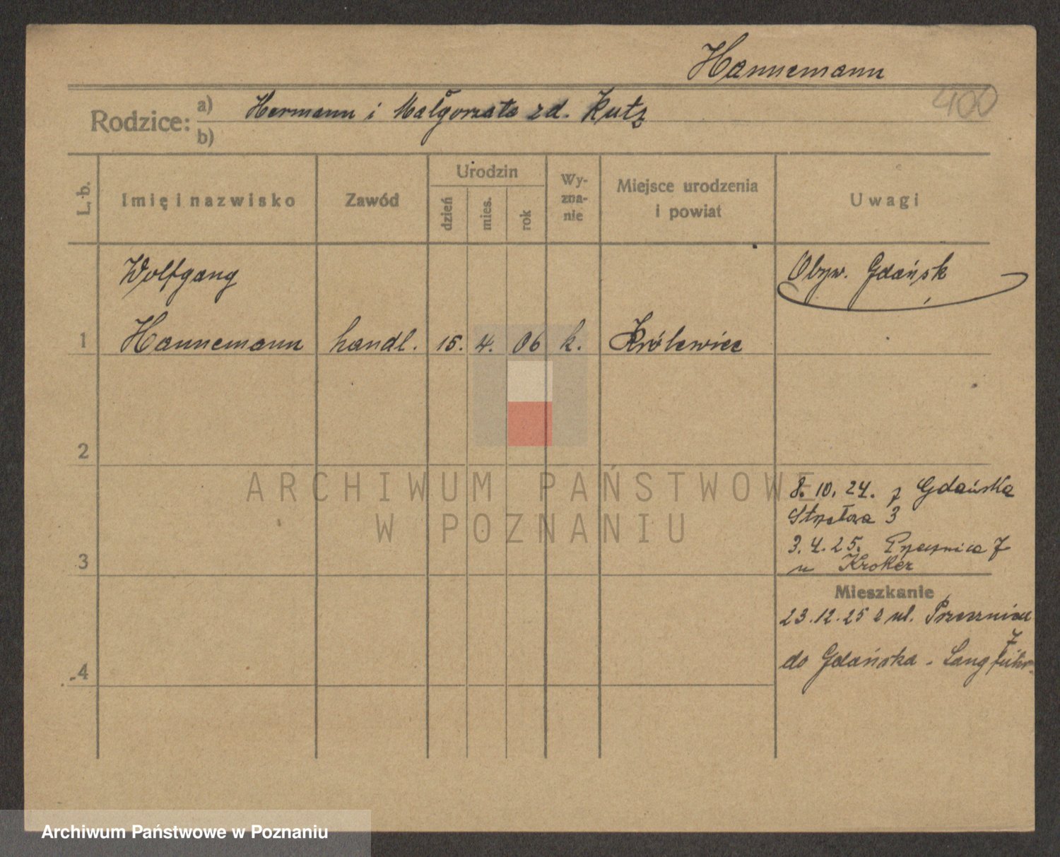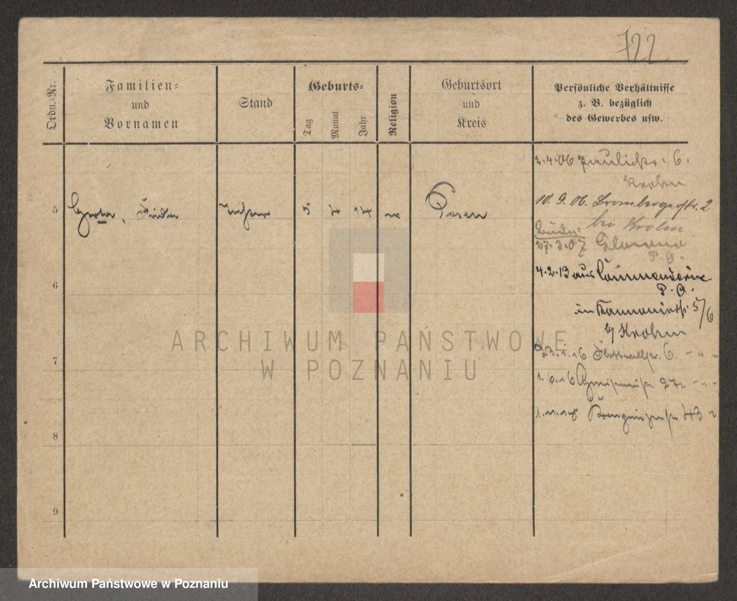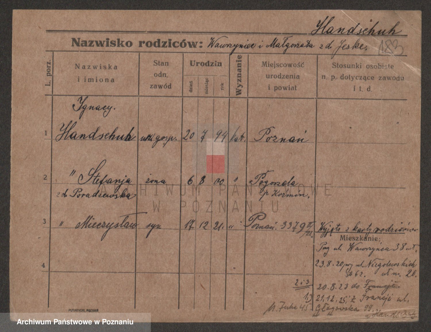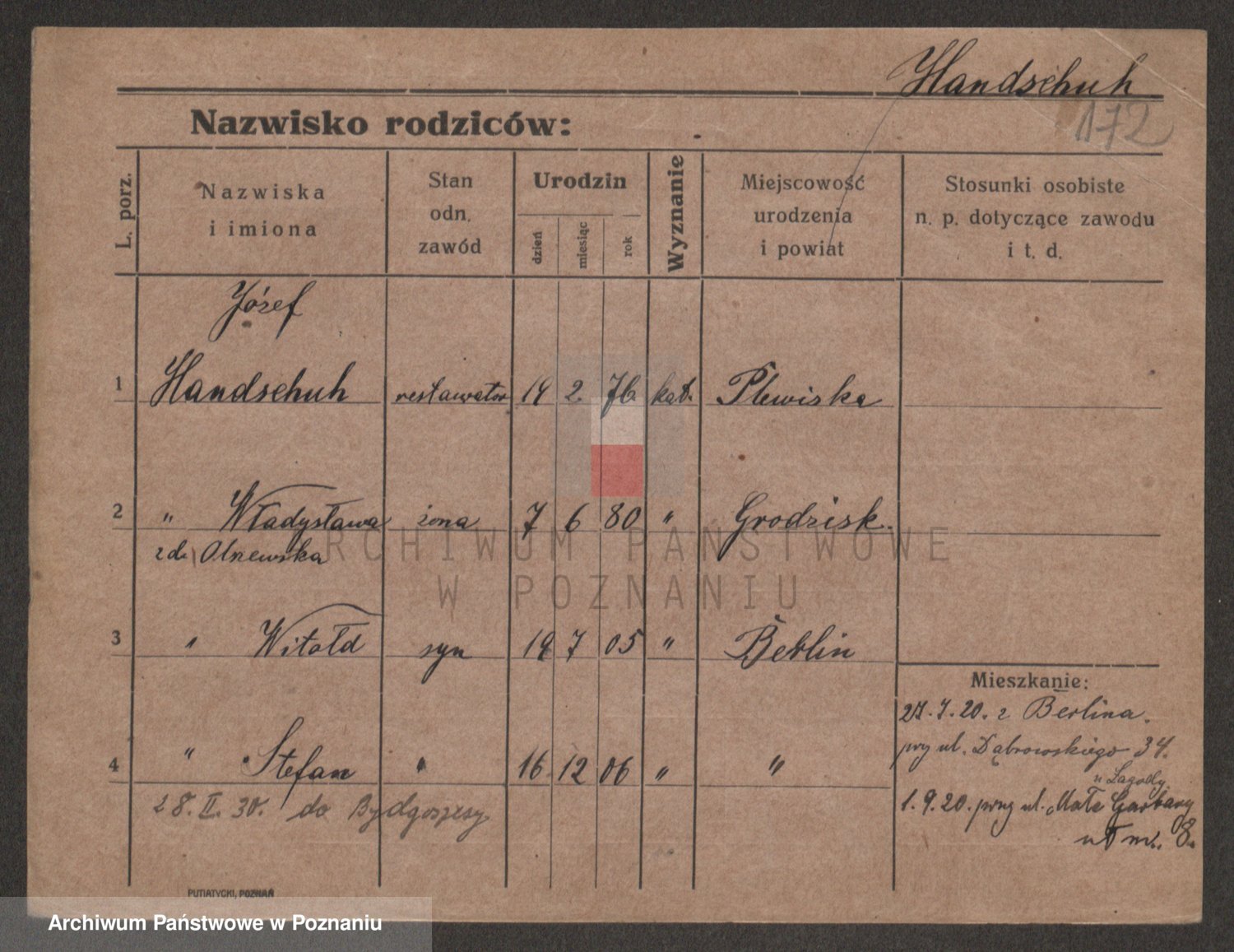 Podgląd karty osobowej dostępny jest po kliknięciu na nazwisko lub ikonkę karty. Można dokonywać powiększenia (ikony na górze) lub przechodzić między kolejnymi skanami (strzałki po bokach).