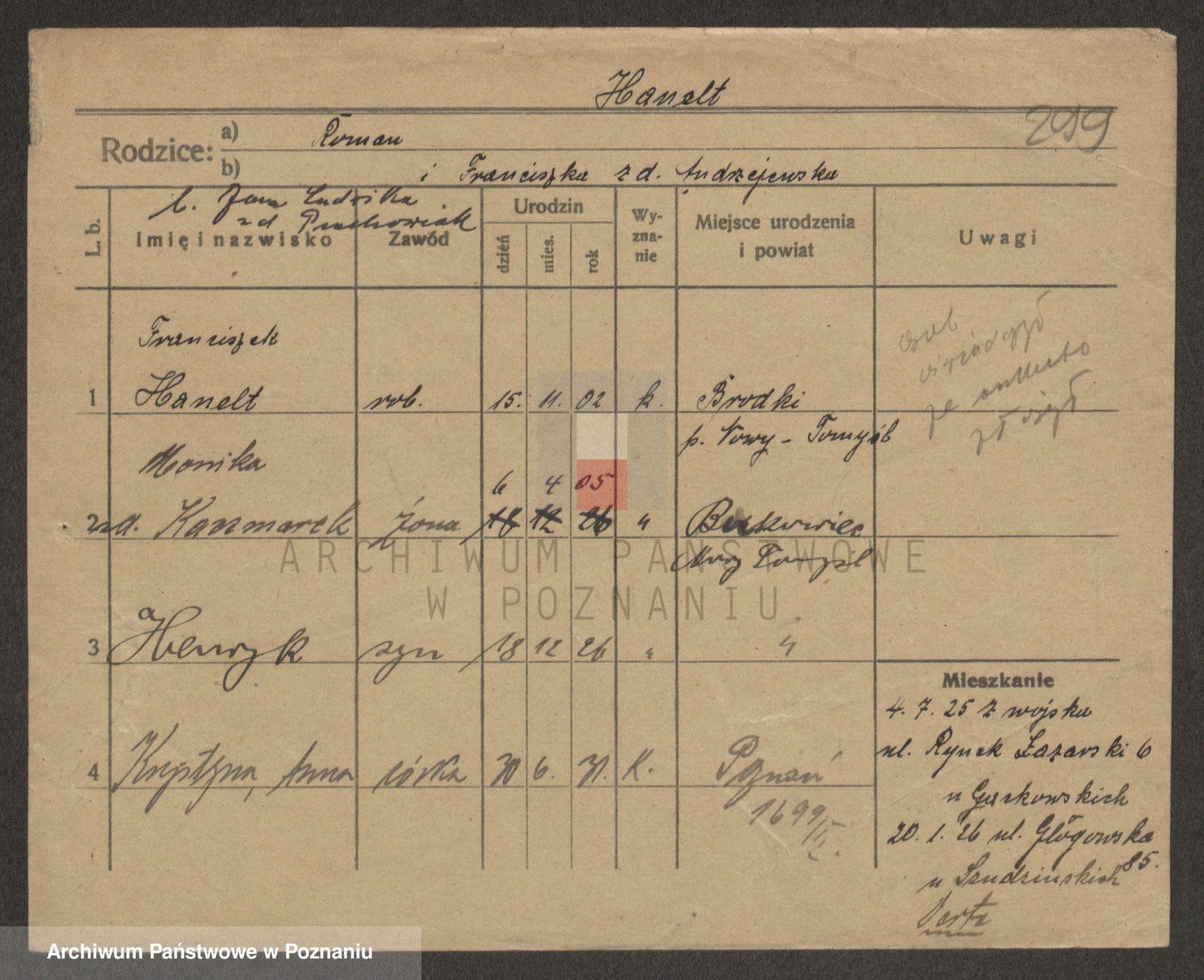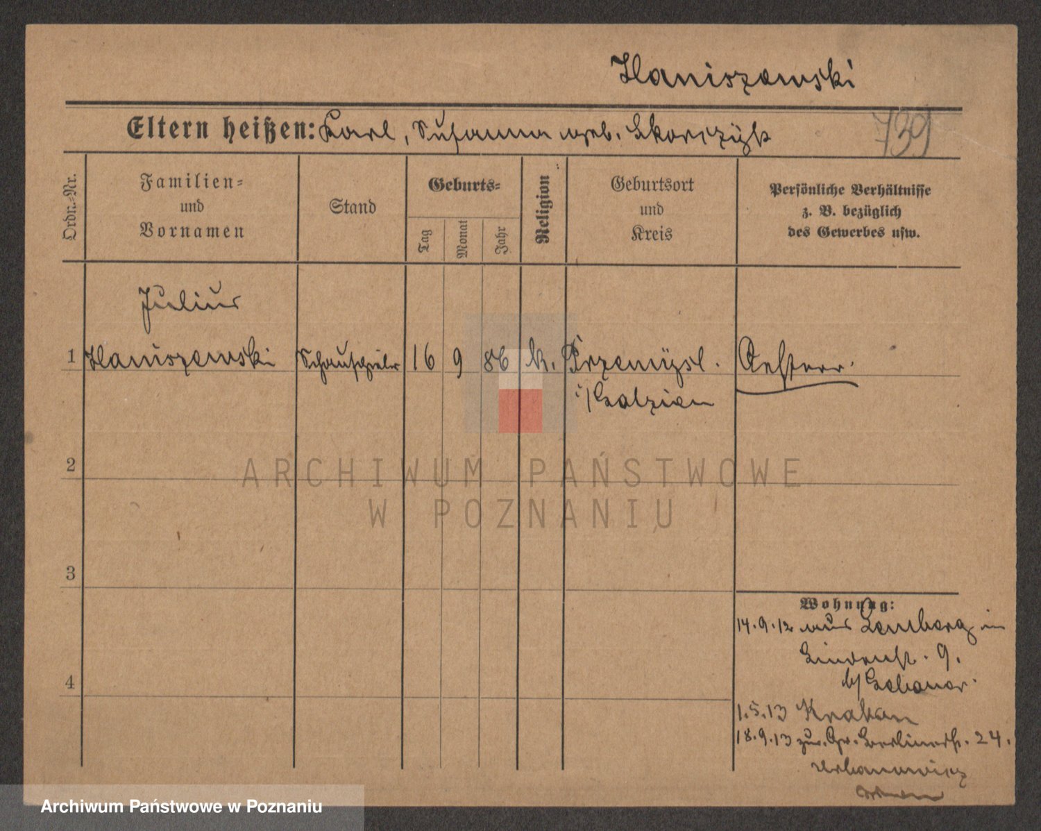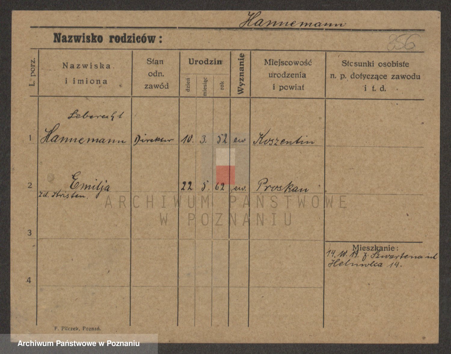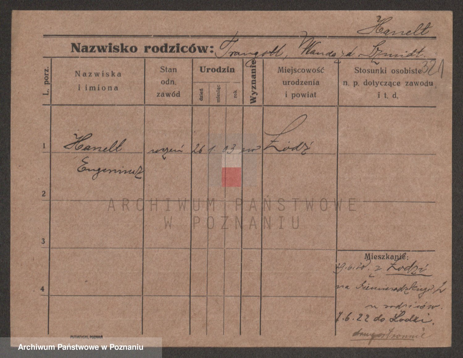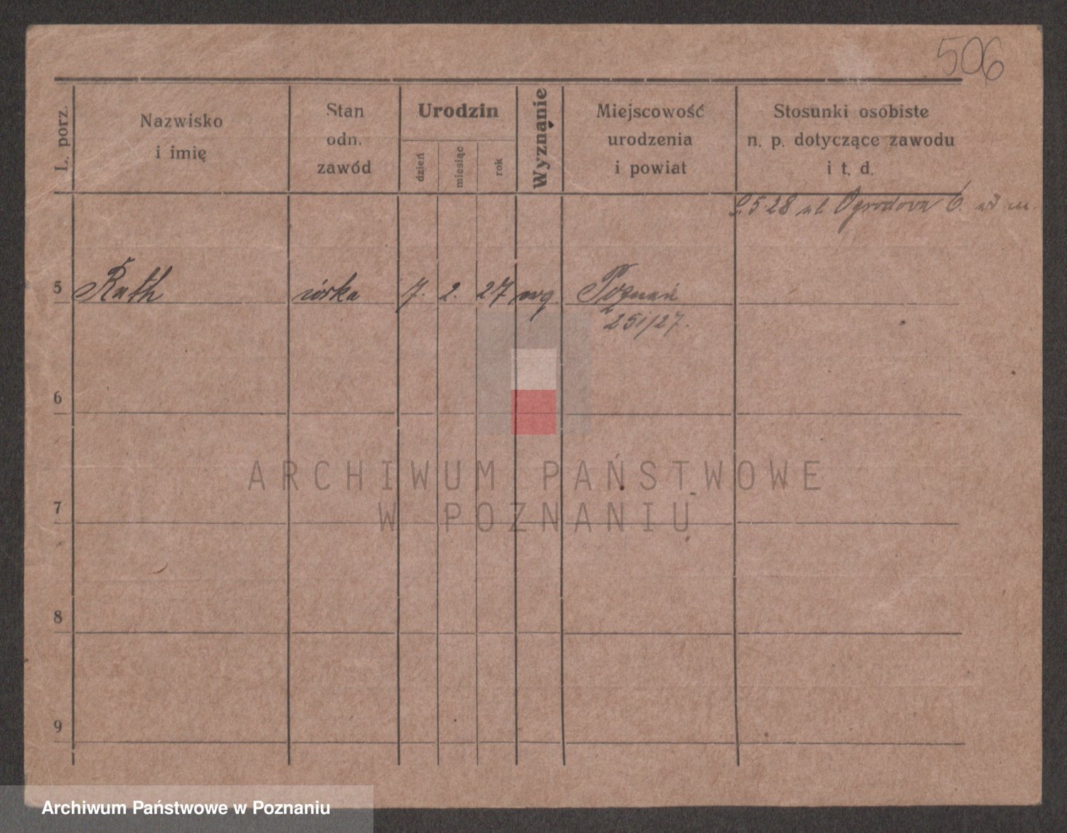 Podgląd karty osobowej dostępny jest po kliknięciu na nazwisko lub ikonkę karty. Można dokonywać powiększenia (ikony na górze) lub przechodzić między kolejnymi skanami (strzałki po bokach).