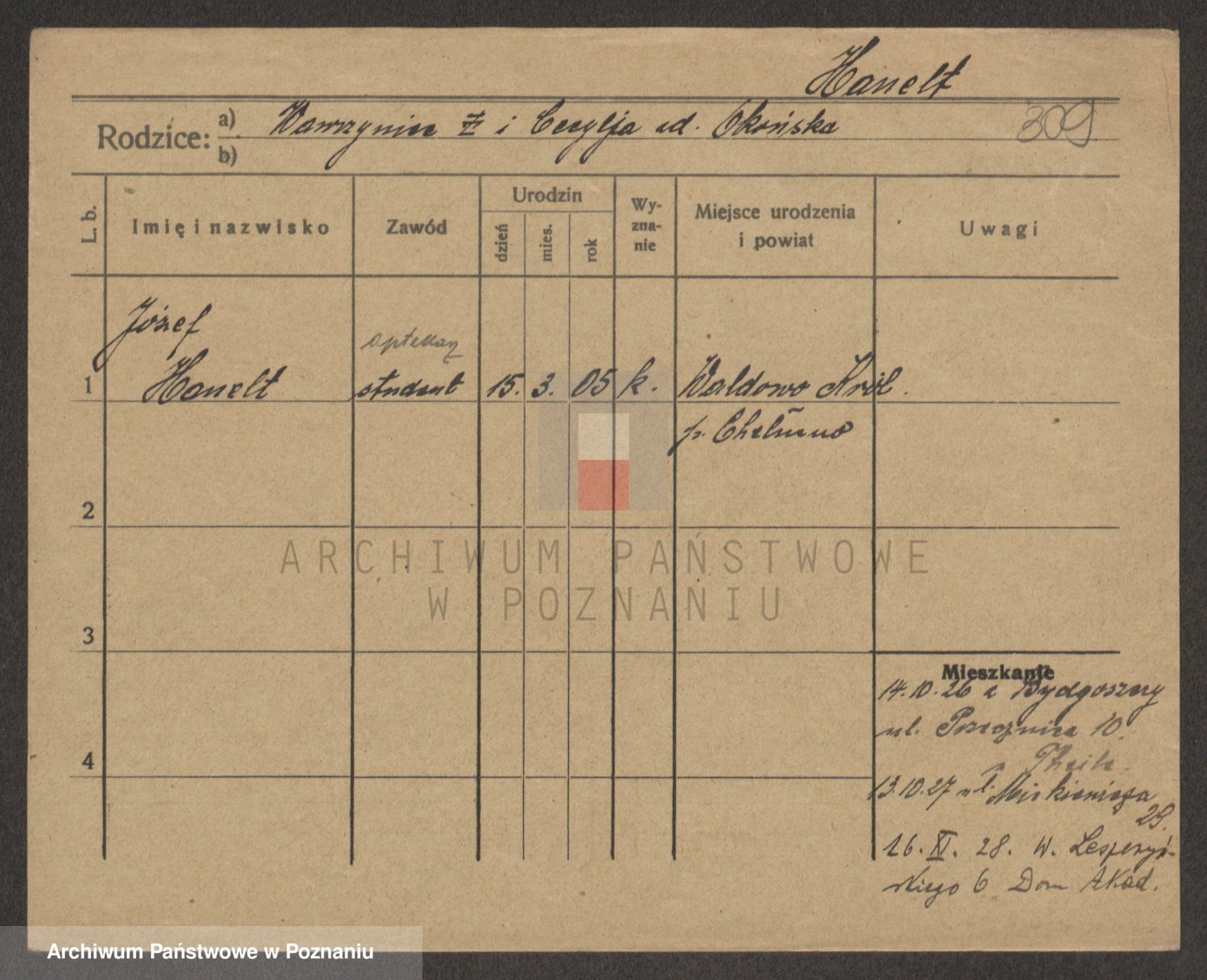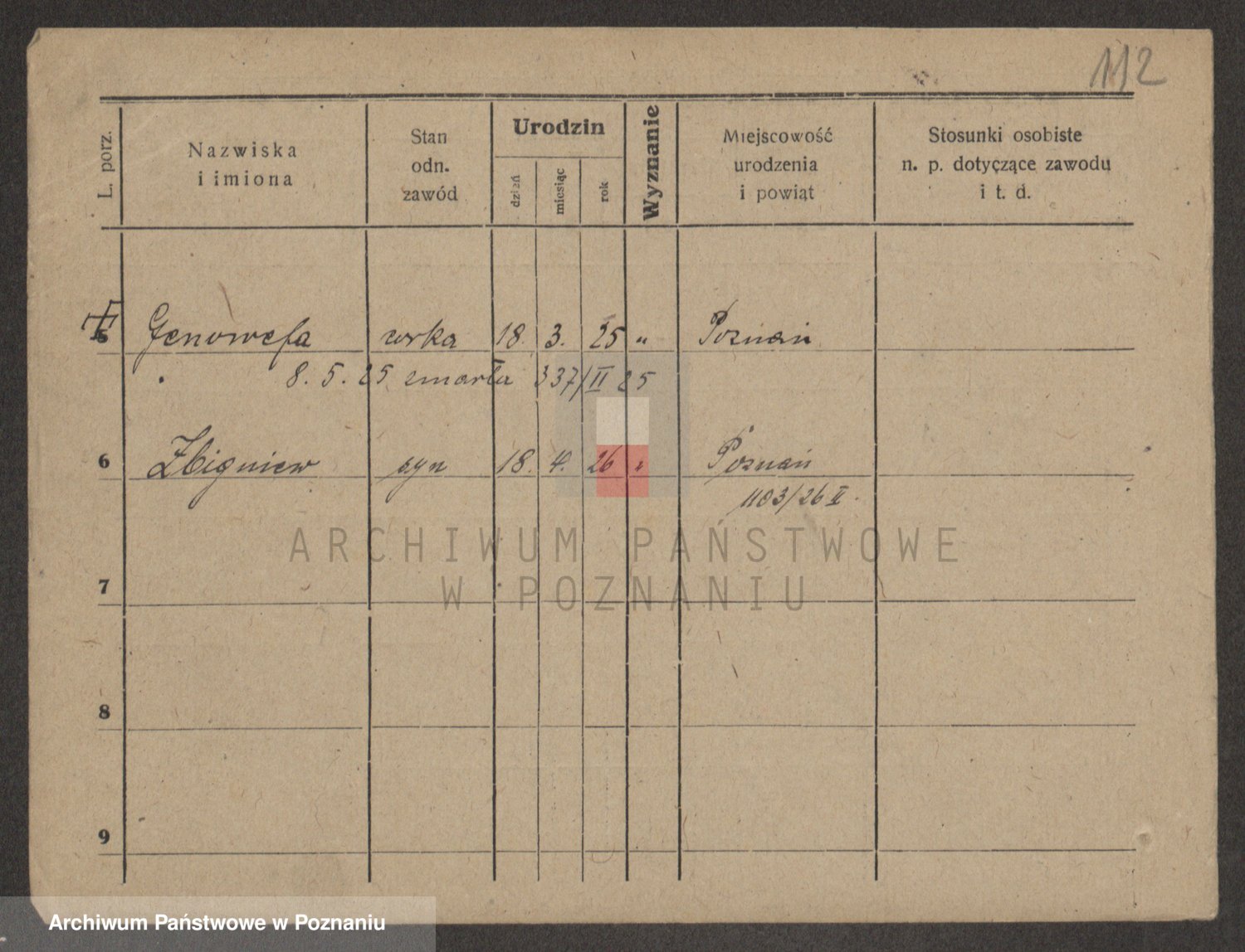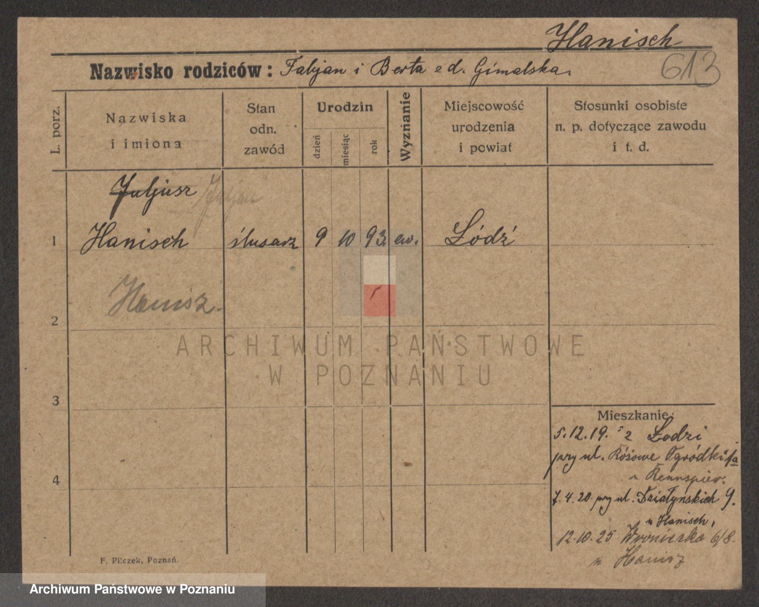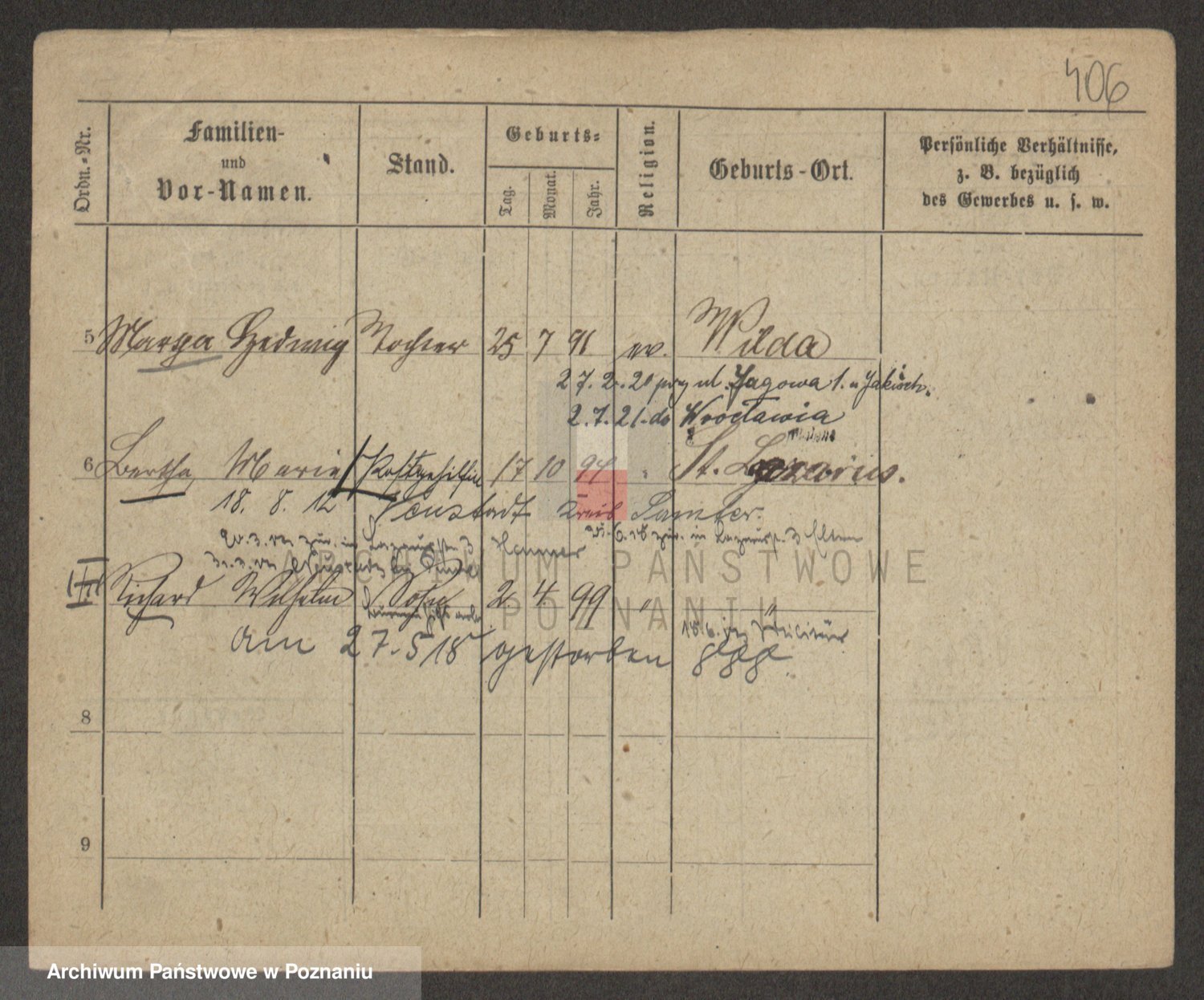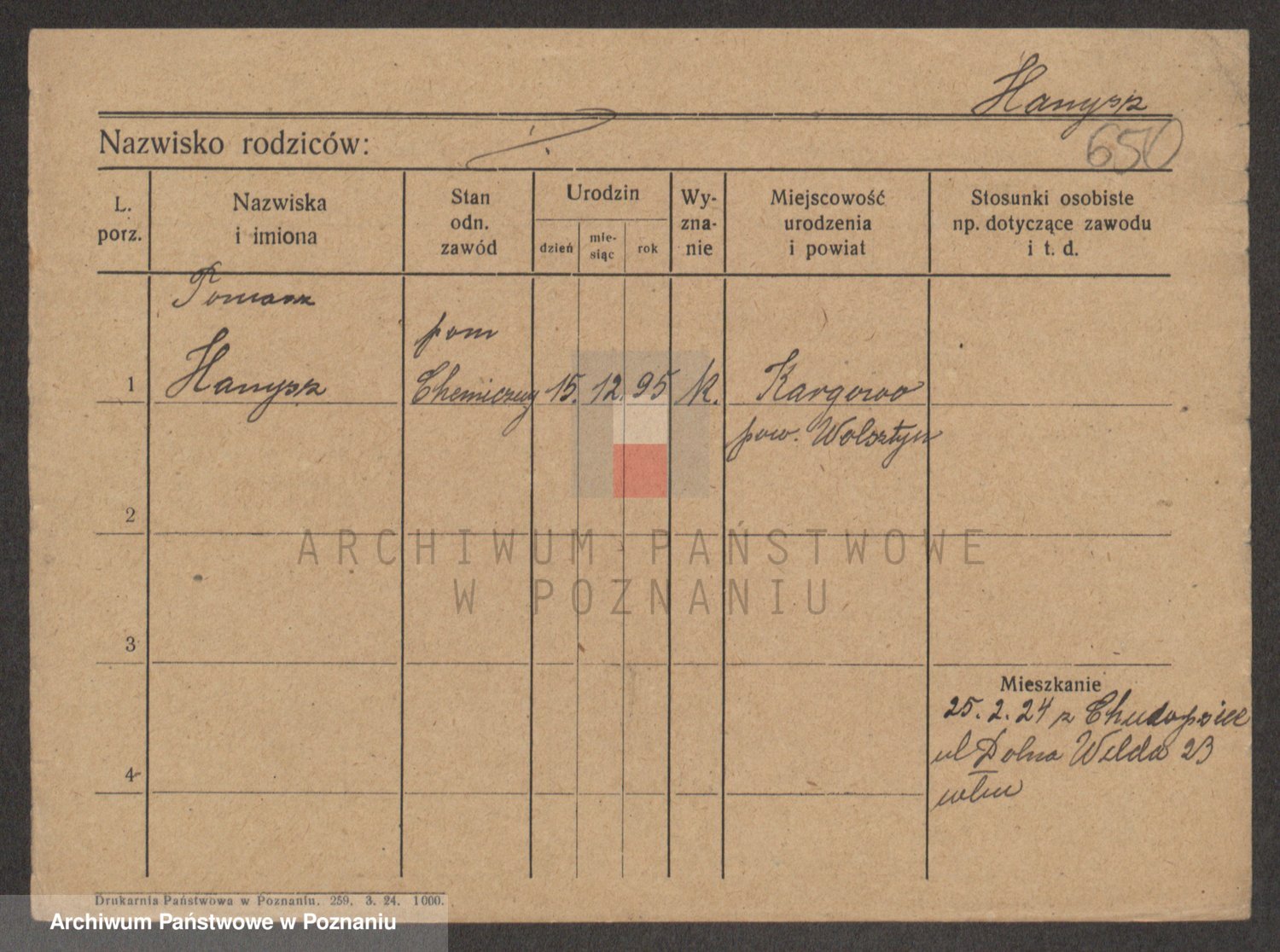 Podgląd karty osobowej dostępny jest po kliknięciu na nazwisko lub ikonkę karty. Można dokonywać powiększenia (ikony na górze) lub przechodzić między kolejnymi skanami (strzałki po bokach).