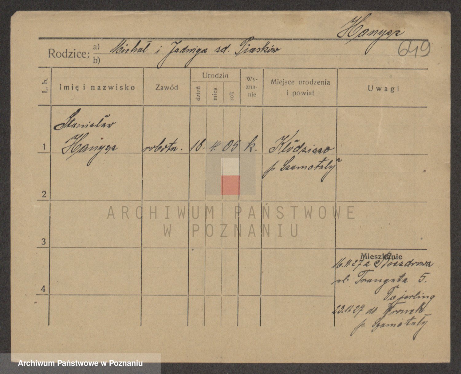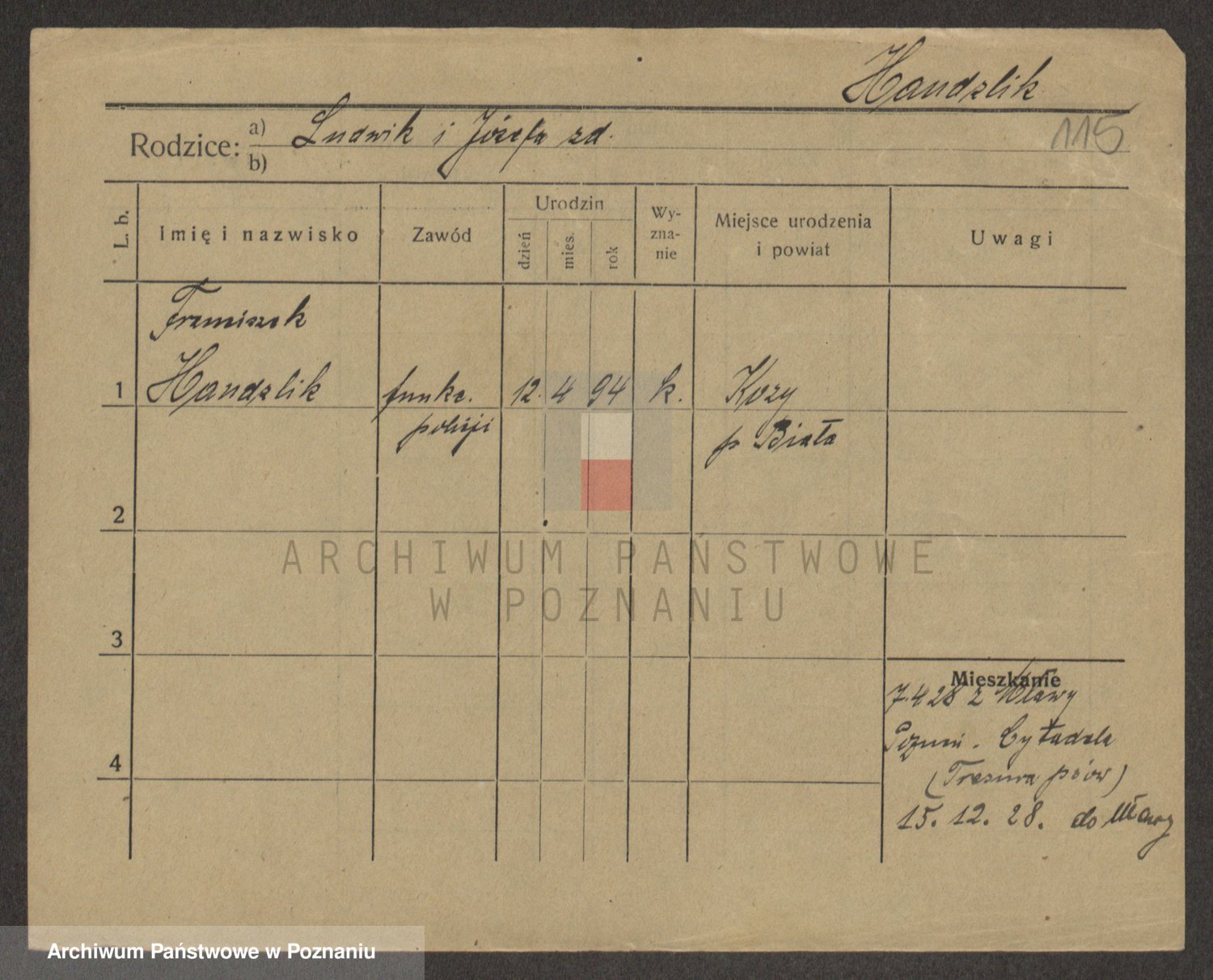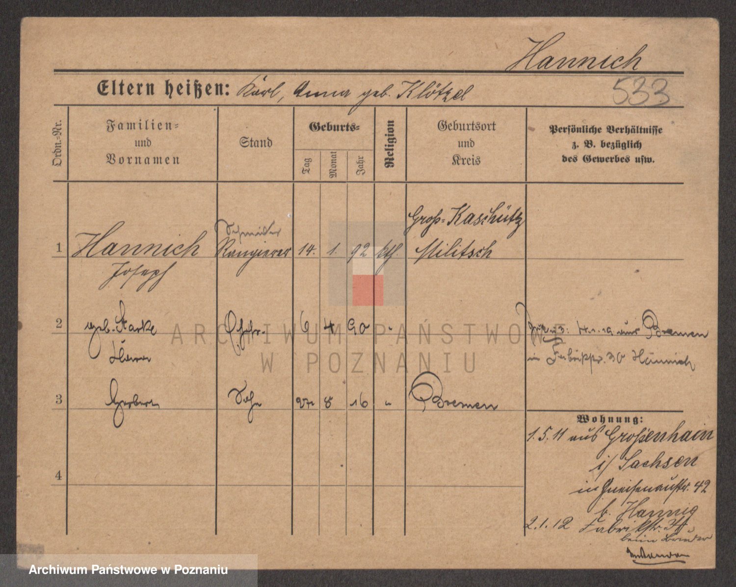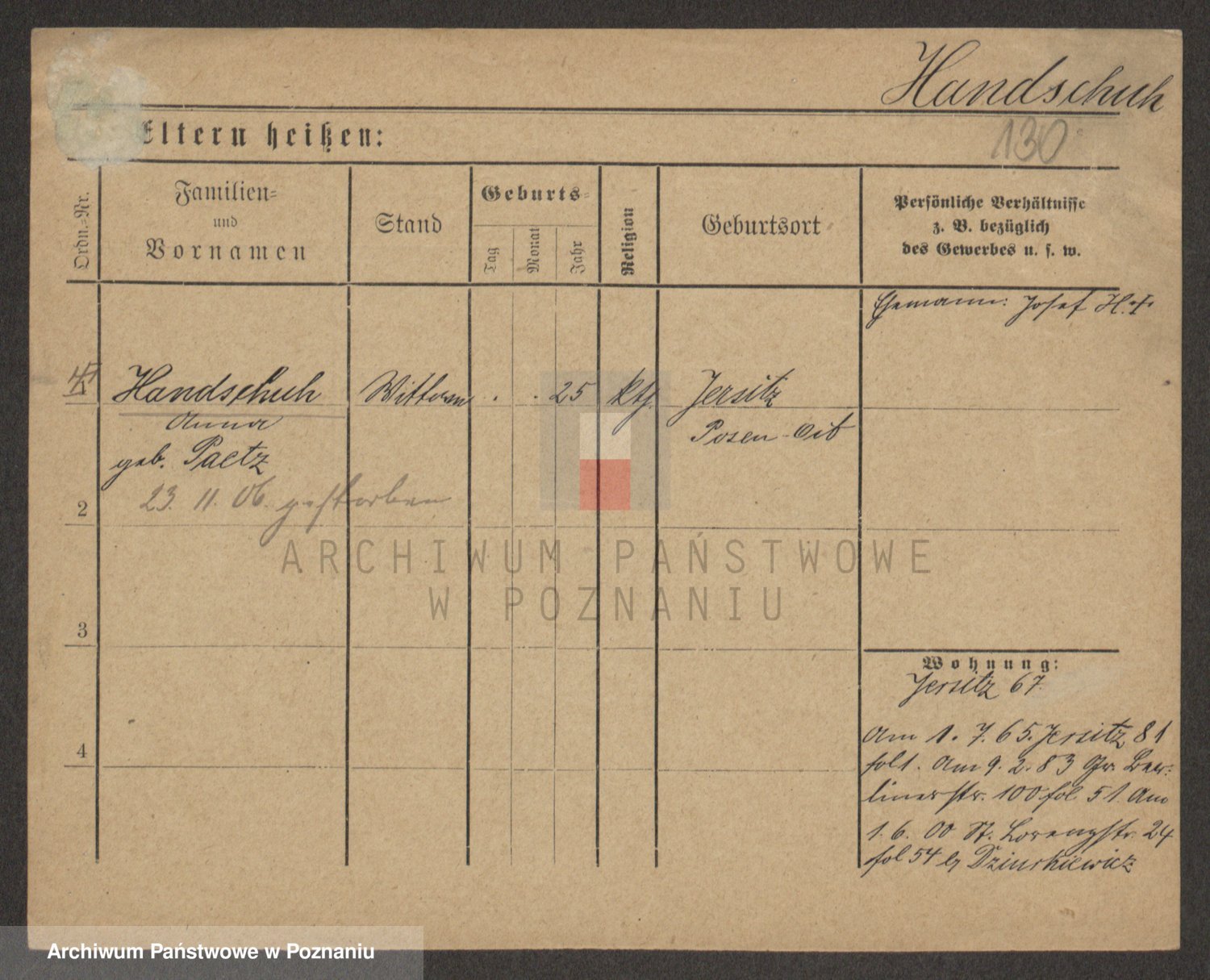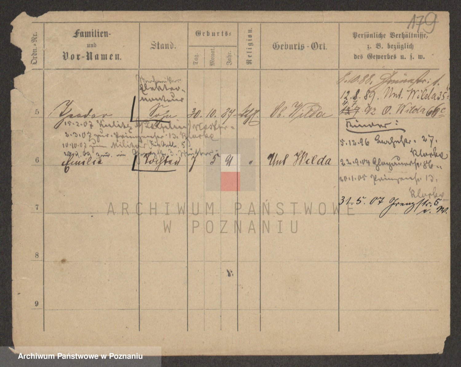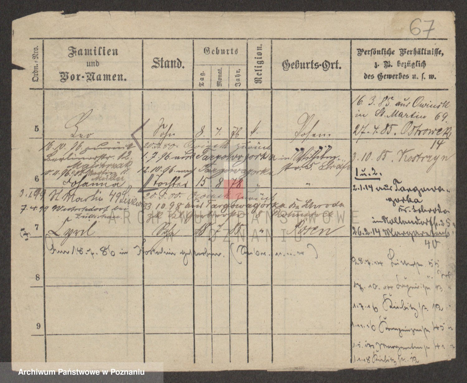 Podgląd karty osobowej dostępny jest po kliknięciu na nazwisko lub ikonkę karty. Można dokonywać powiększenia (ikony na górze) lub przechodzić między kolejnymi skanami (strzałki po bokach).