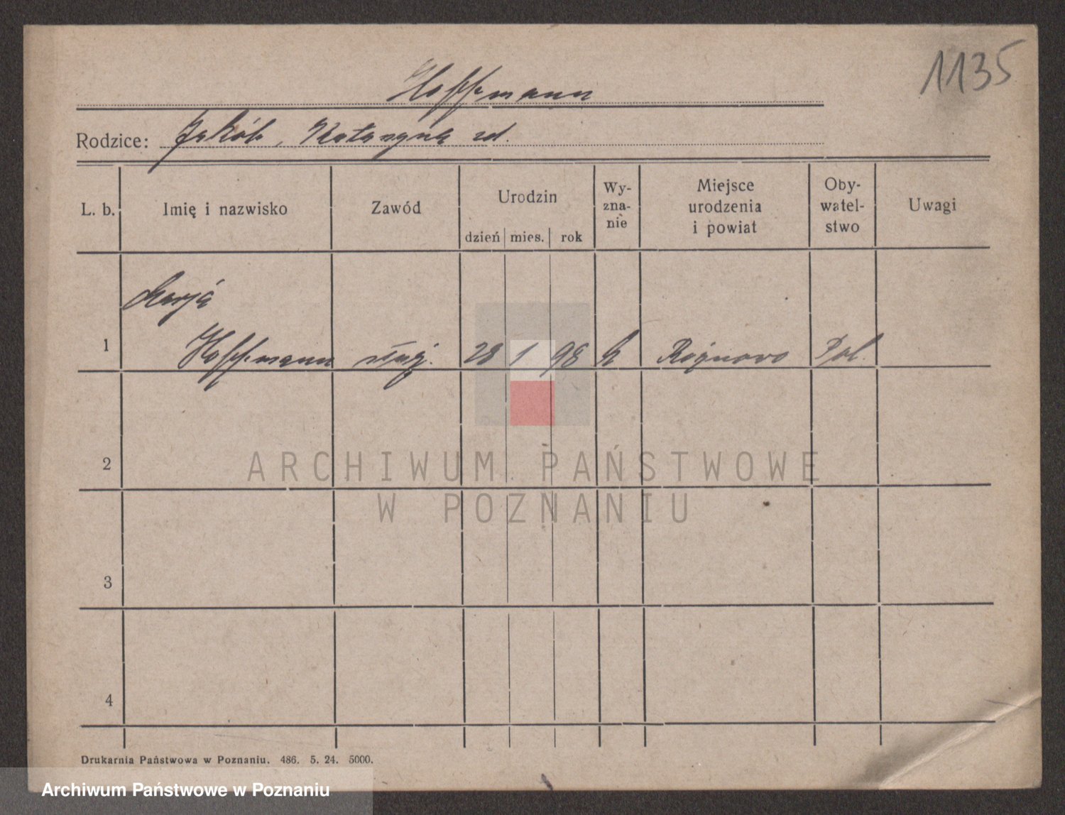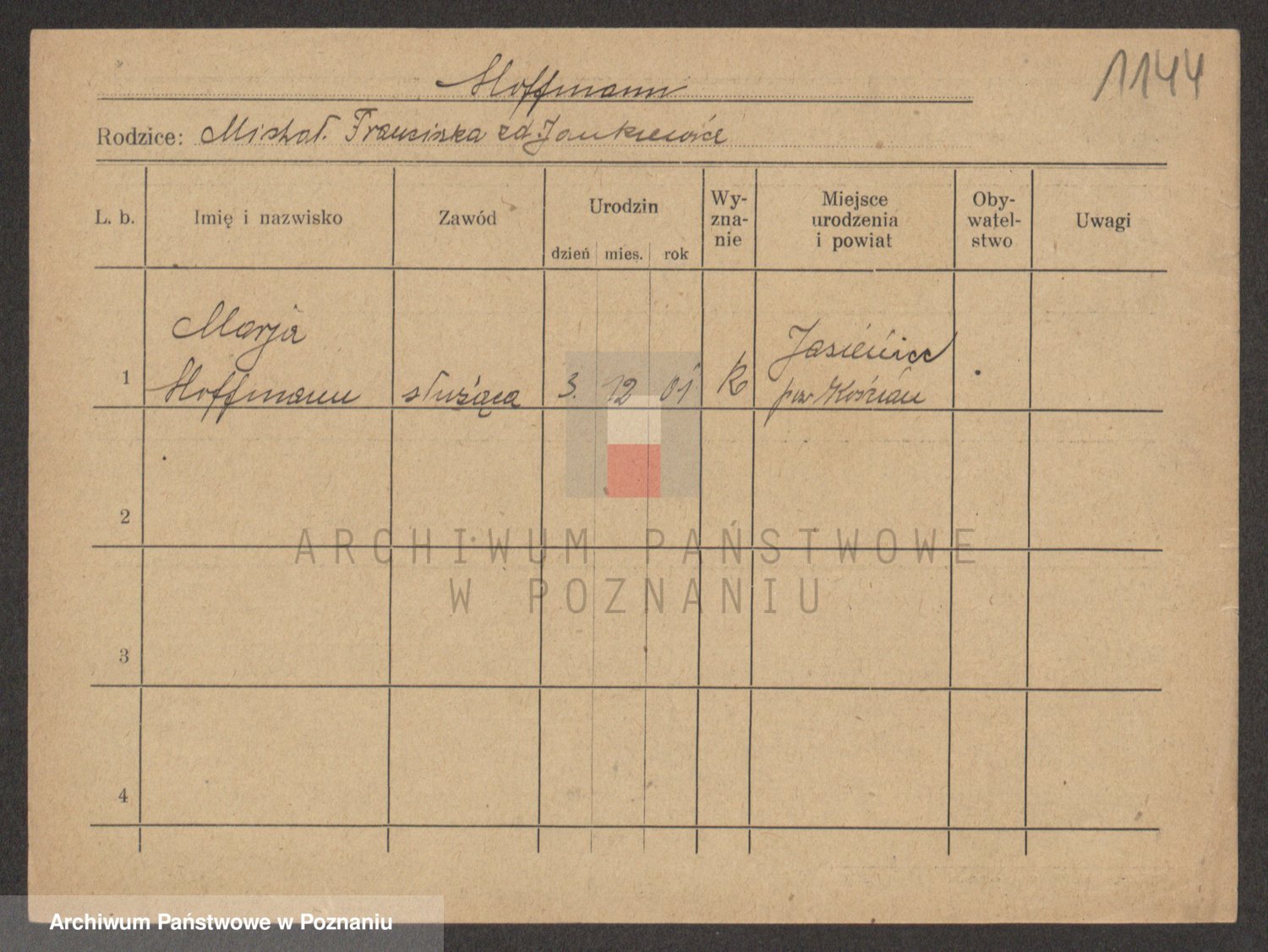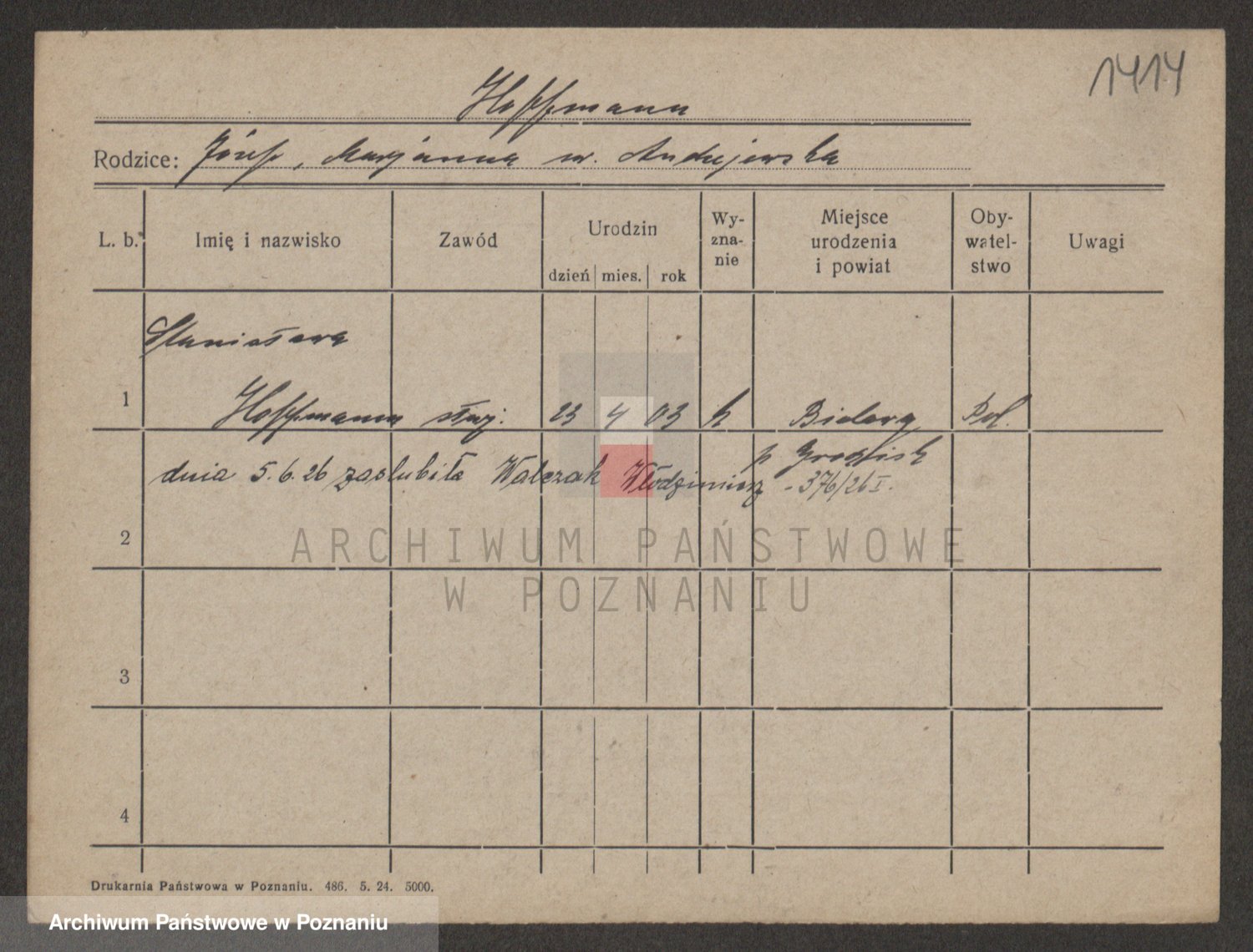 Podgląd karty osobowej dostępny jest po kliknięciu na nazwisko lub ikonkę karty. Można dokonywać powiększenia (ikony na górze) lub przechodzić między kolejnymi skanami (strzałki po bokach).