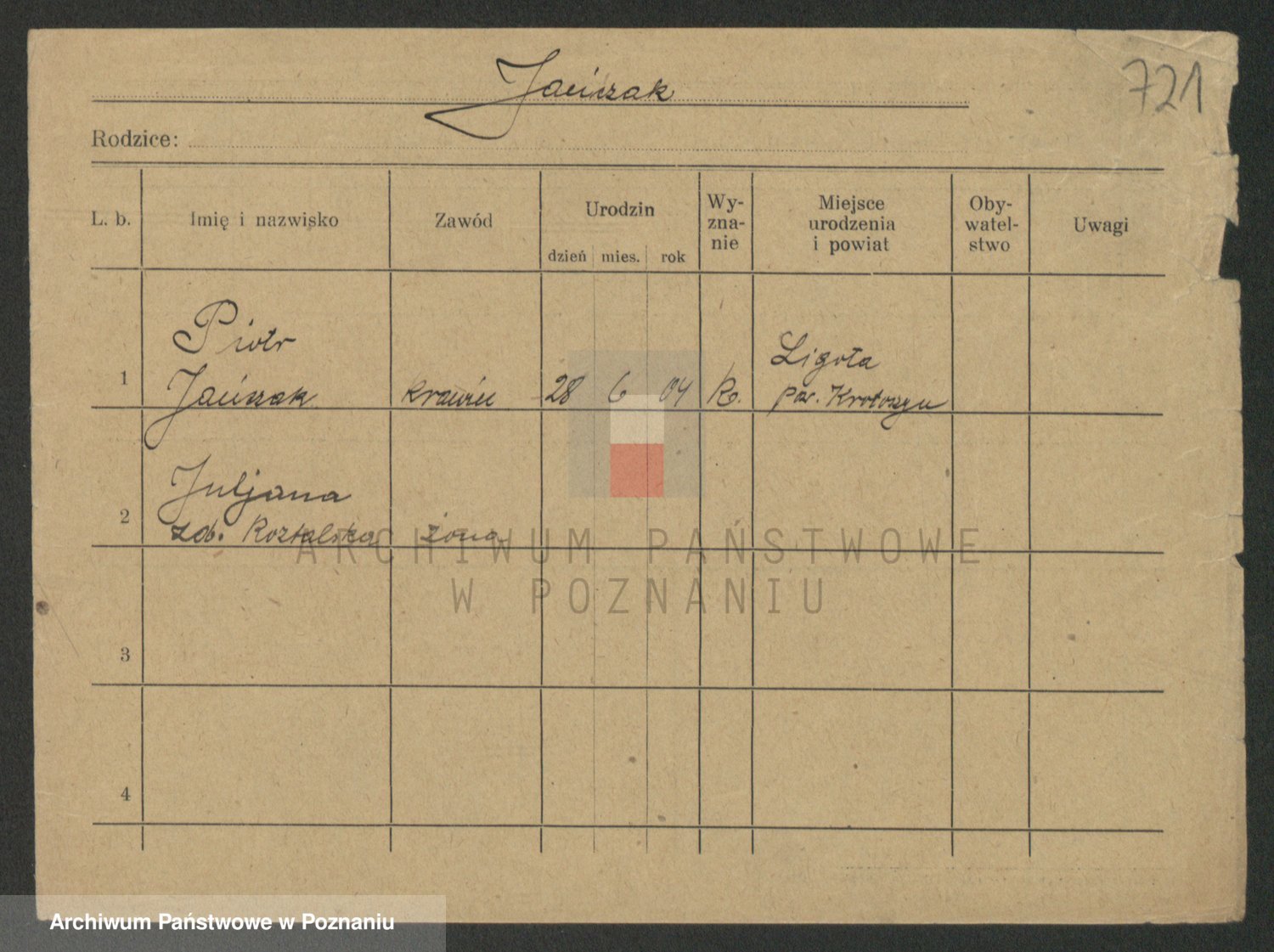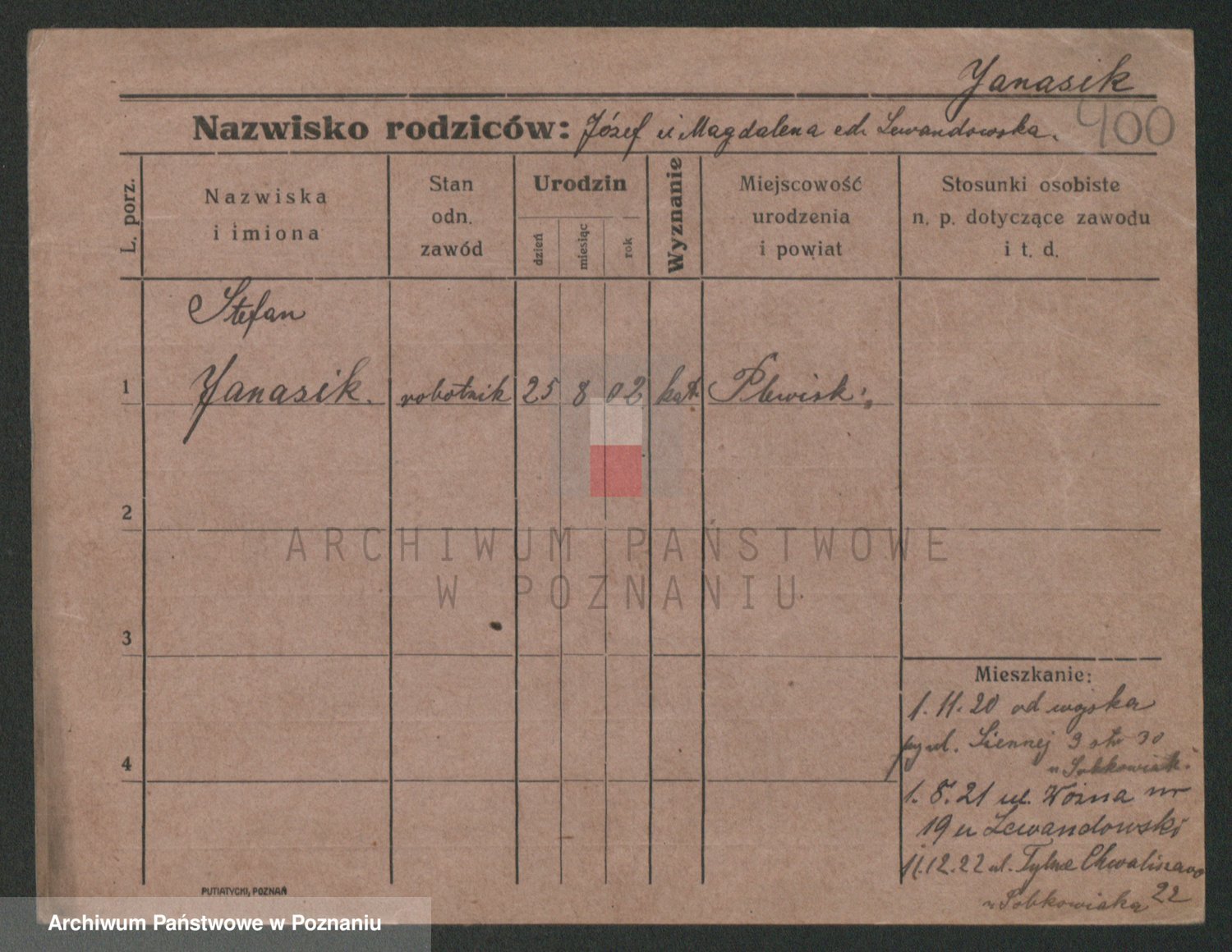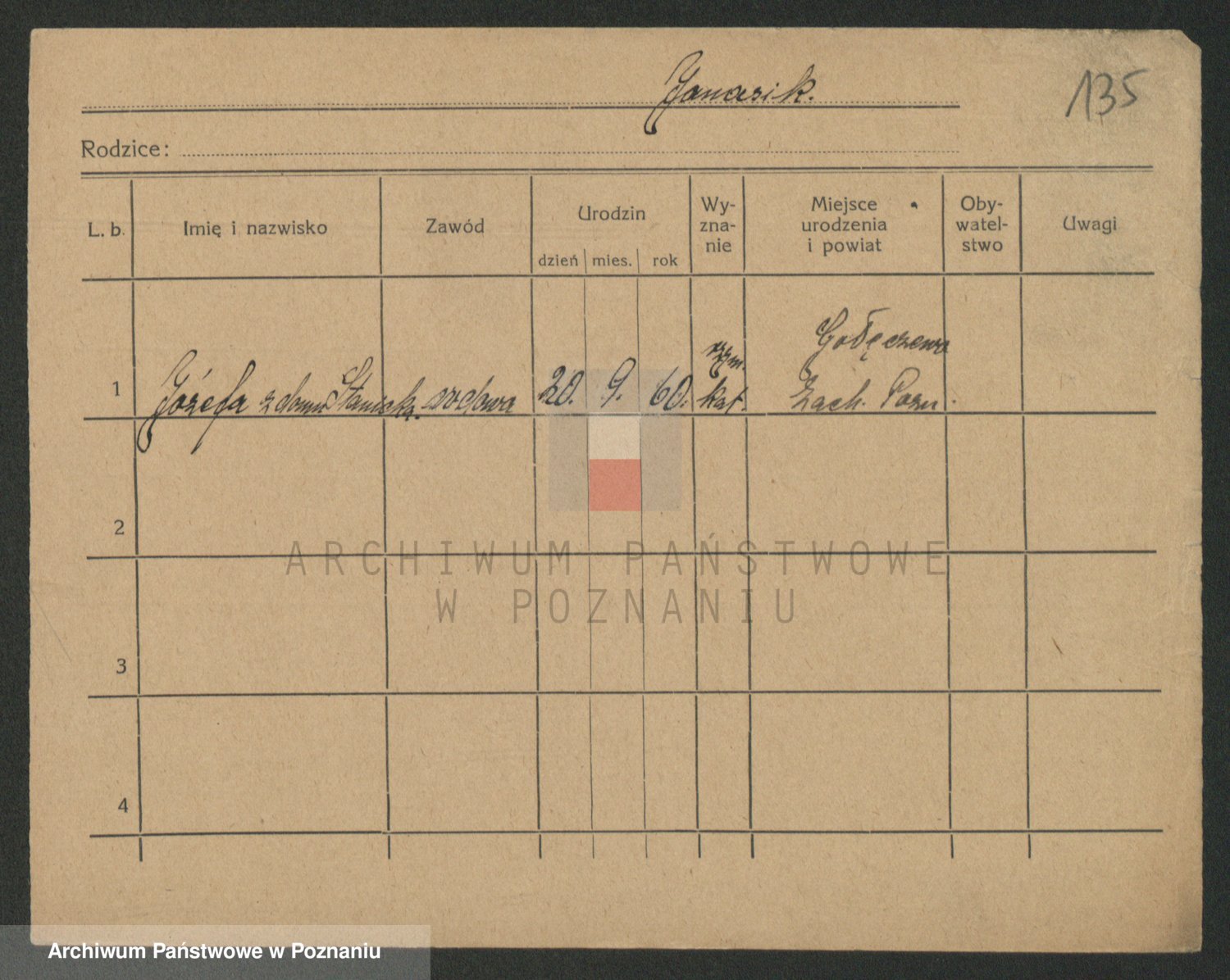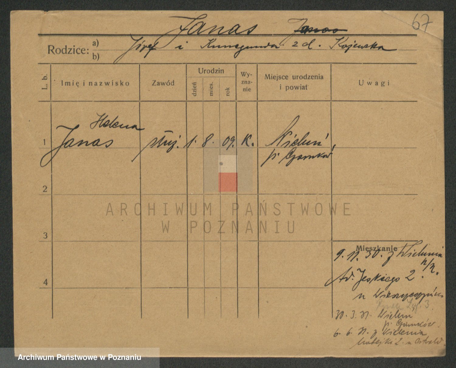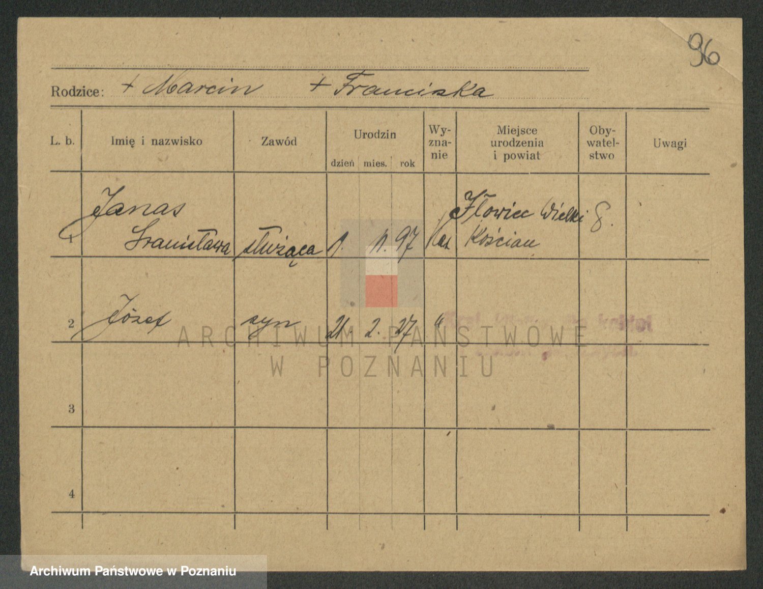 Podgląd karty osobowej dostępny jest po kliknięciu na nazwisko lub ikonkę karty. Można dokonywać powiększenia (ikony na górze) lub przechodzić między kolejnymi skanami (strzałki po bokach).