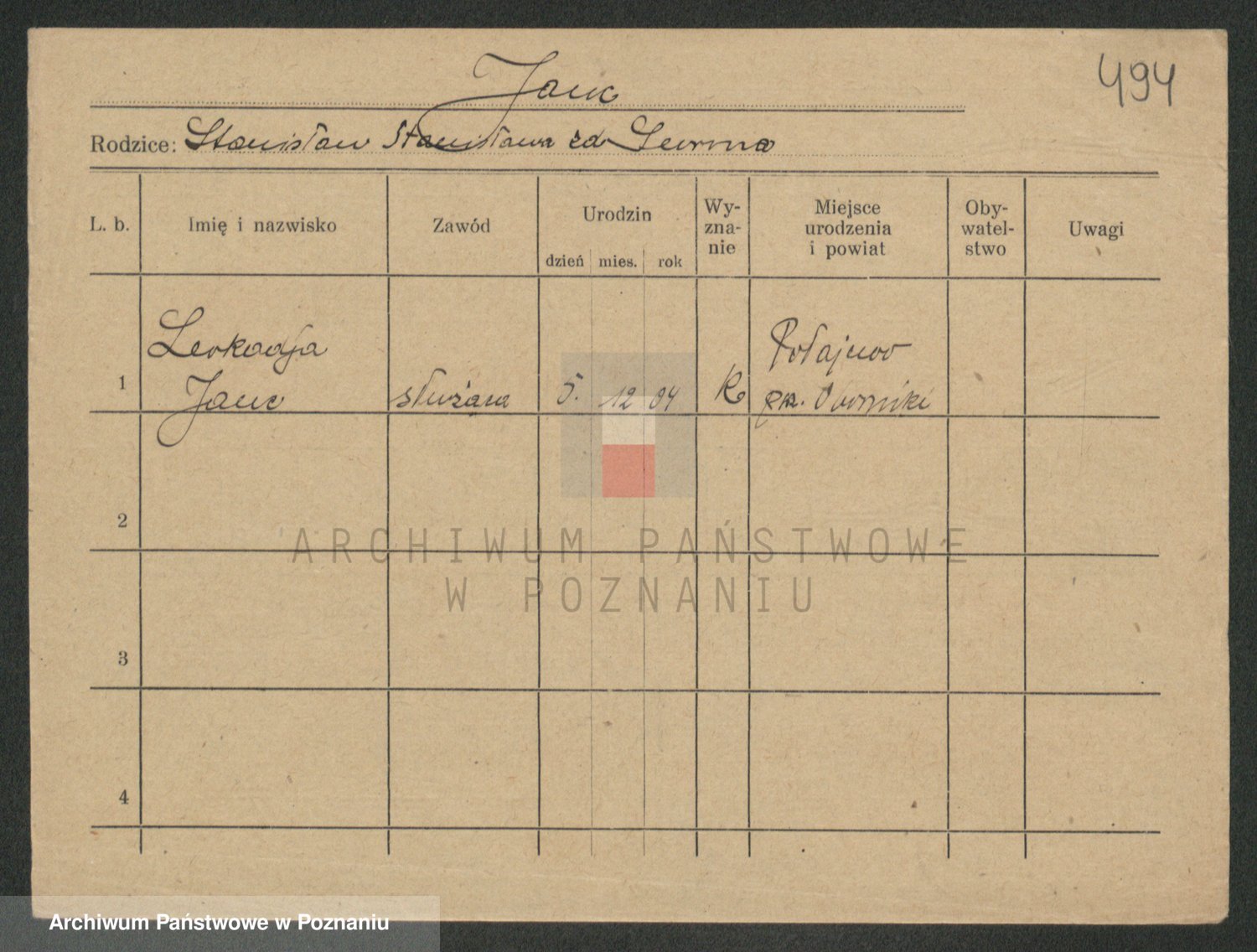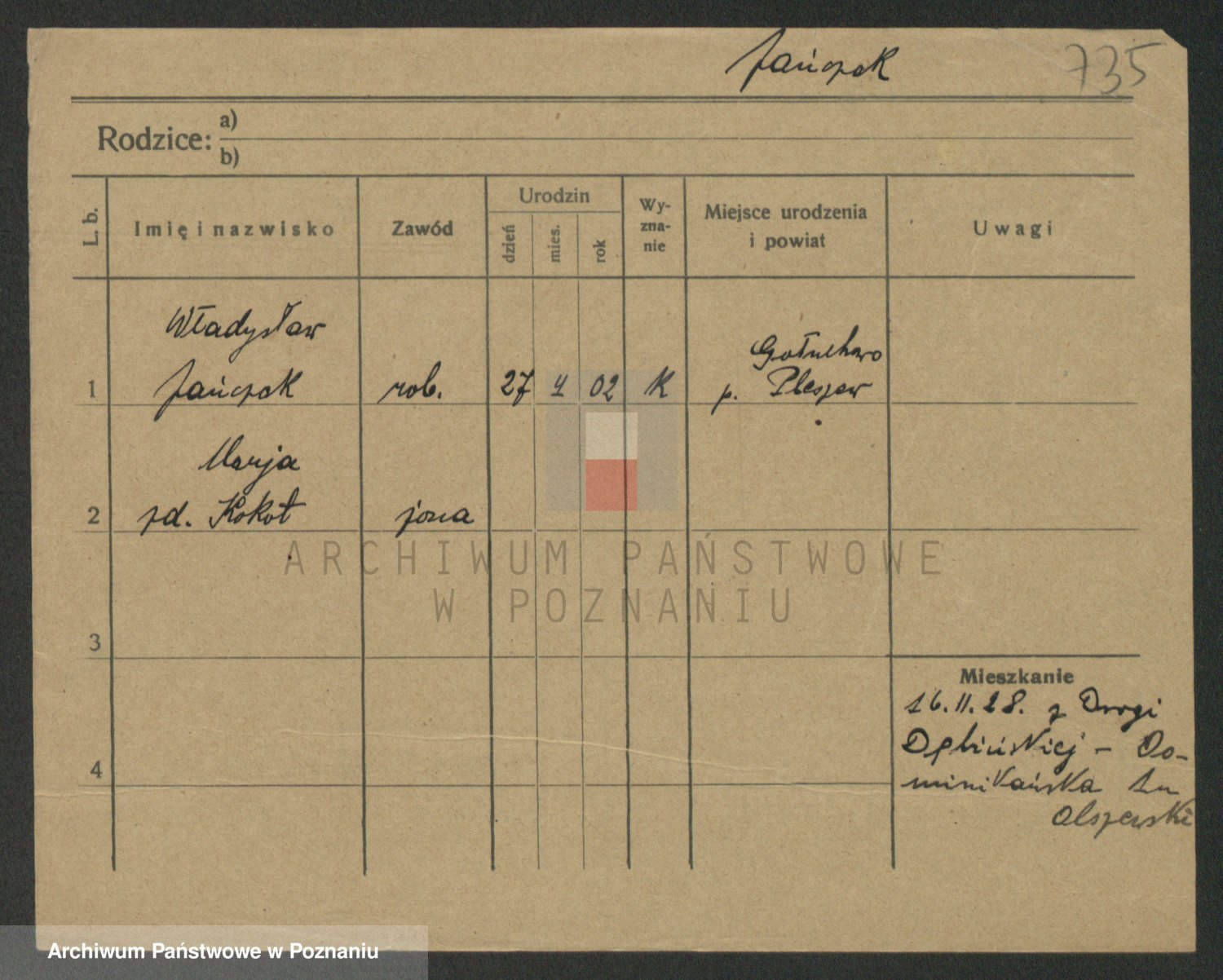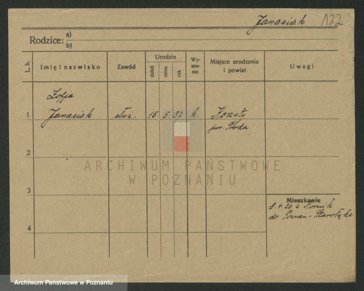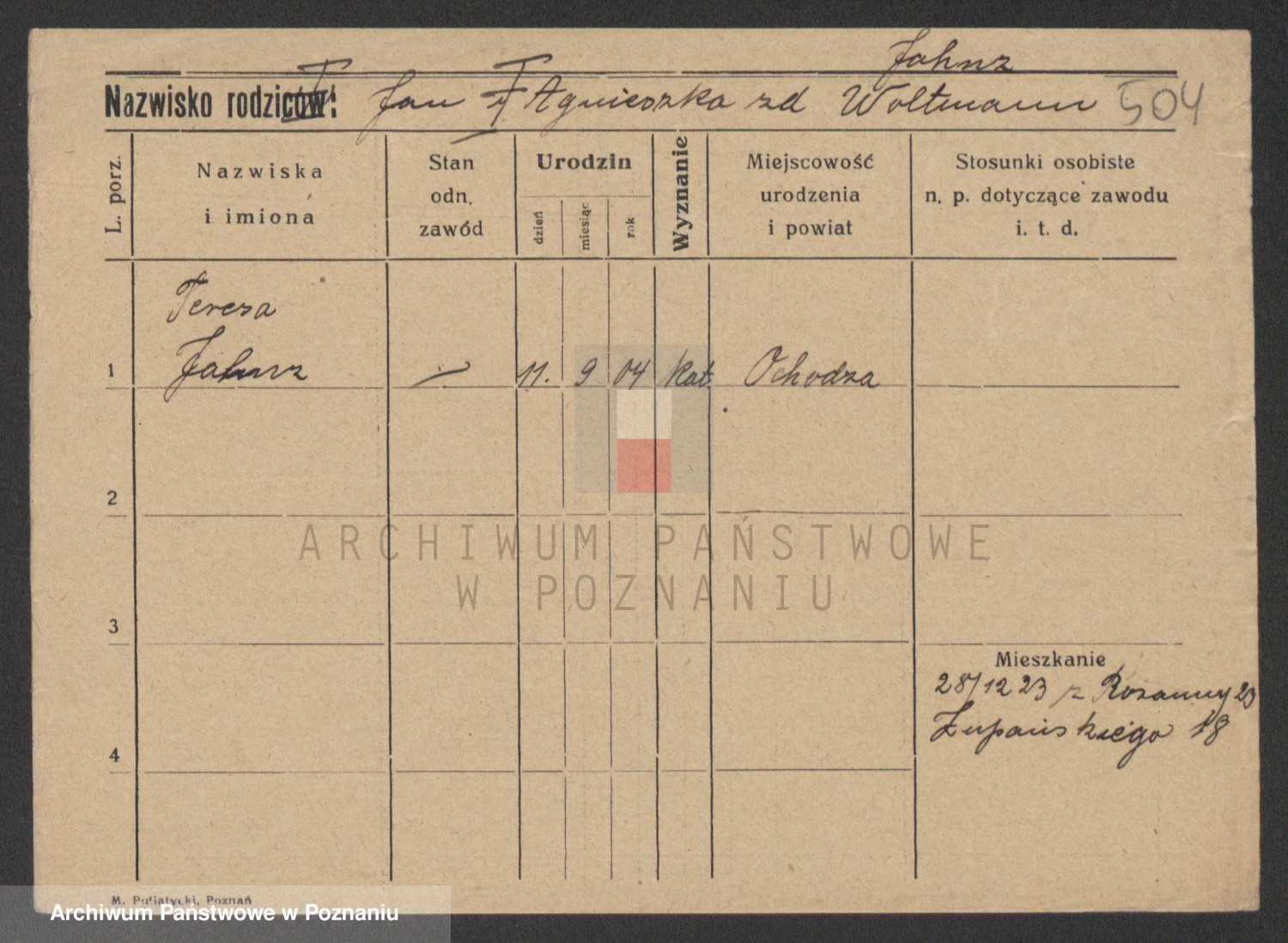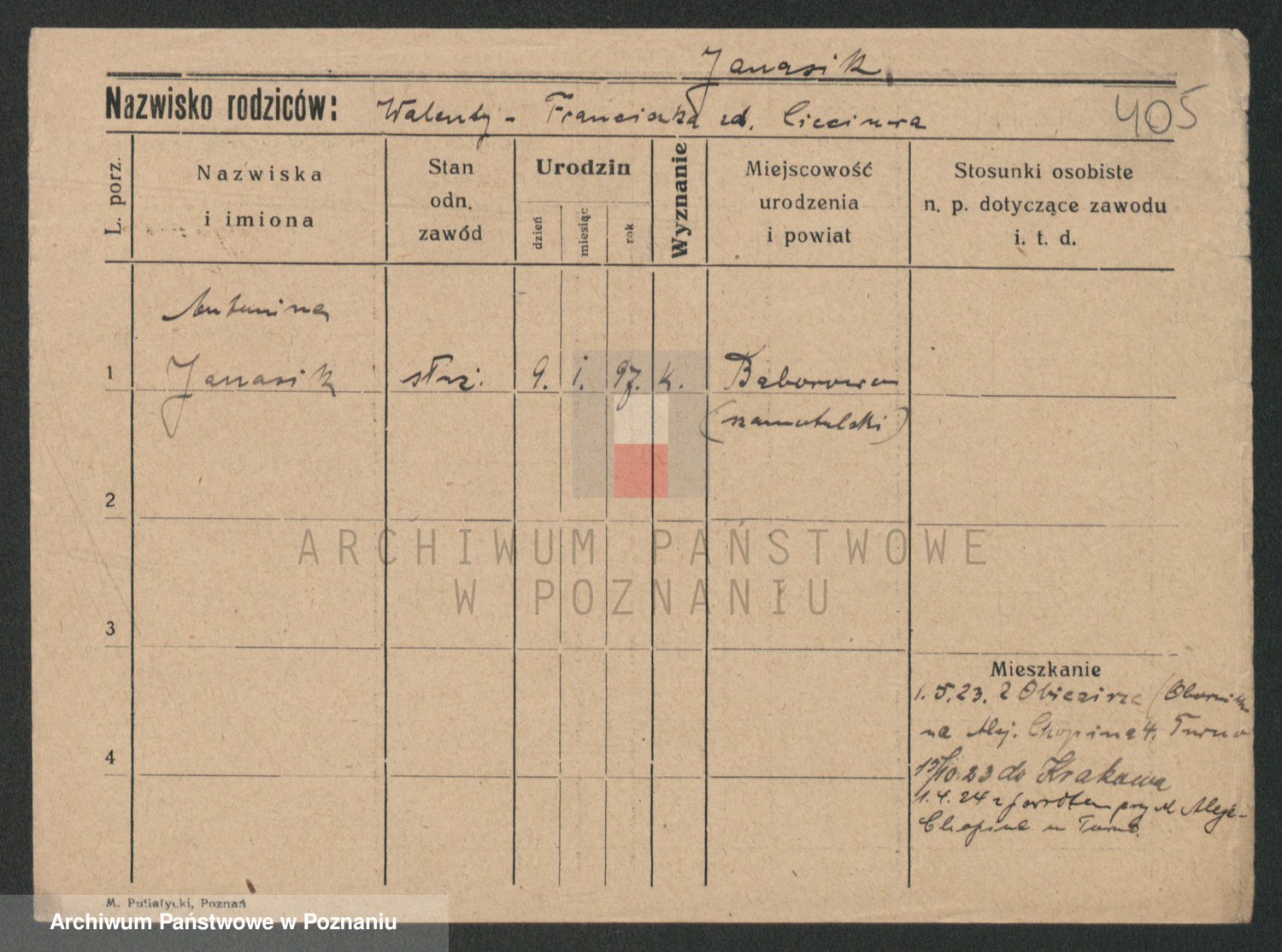 Podgląd karty osobowej dostępny jest po kliknięciu na nazwisko lub ikonkę karty. Można dokonywać powiększenia (ikony na górze) lub przechodzić między kolejnymi skanami (strzałki po bokach).