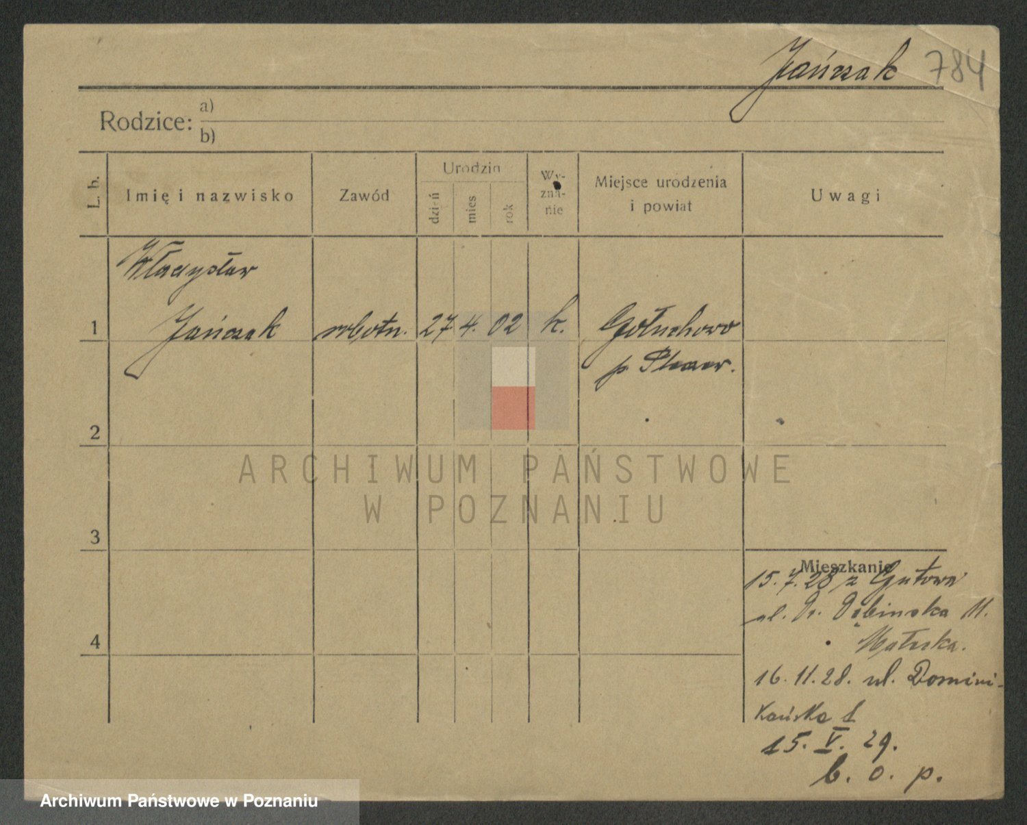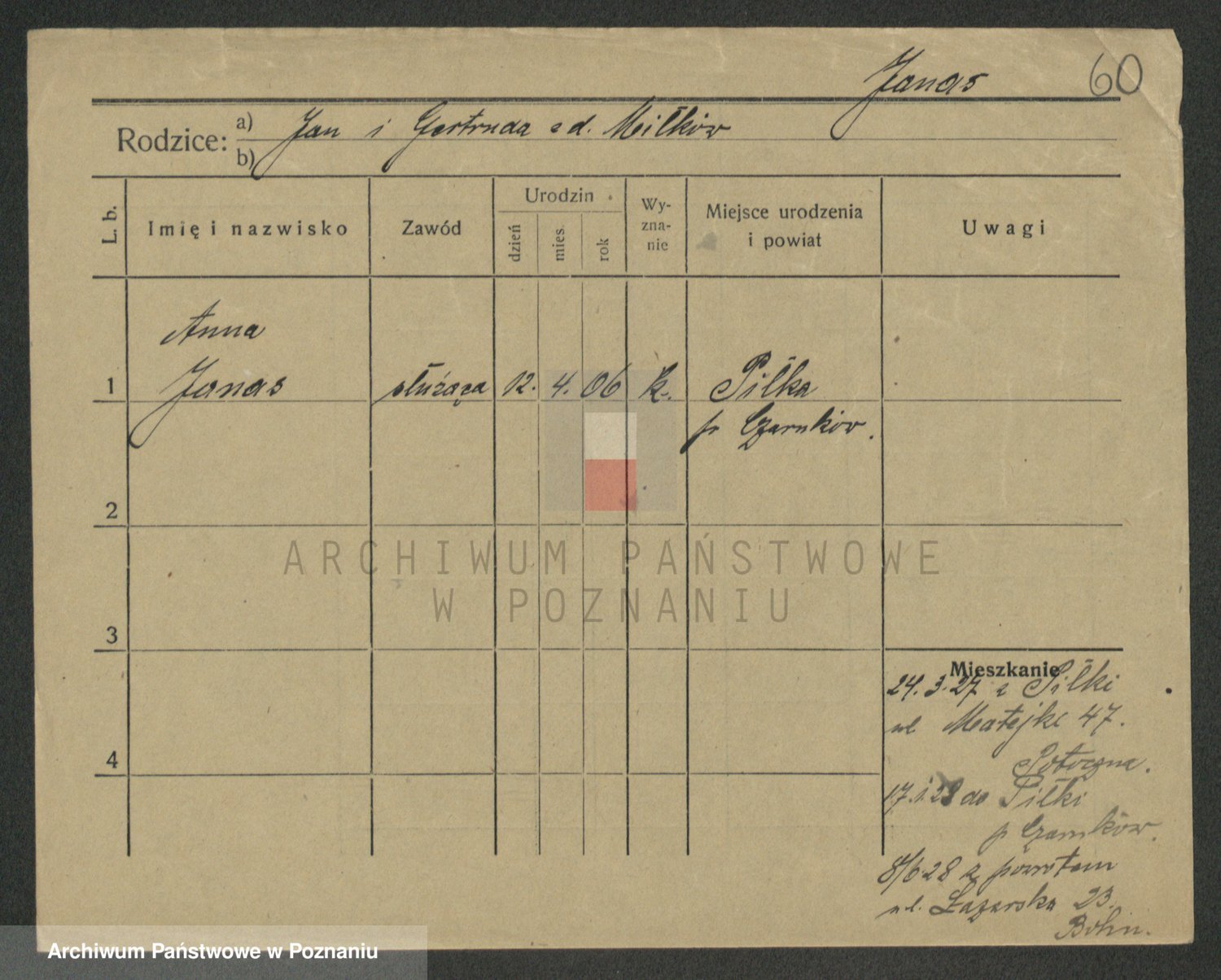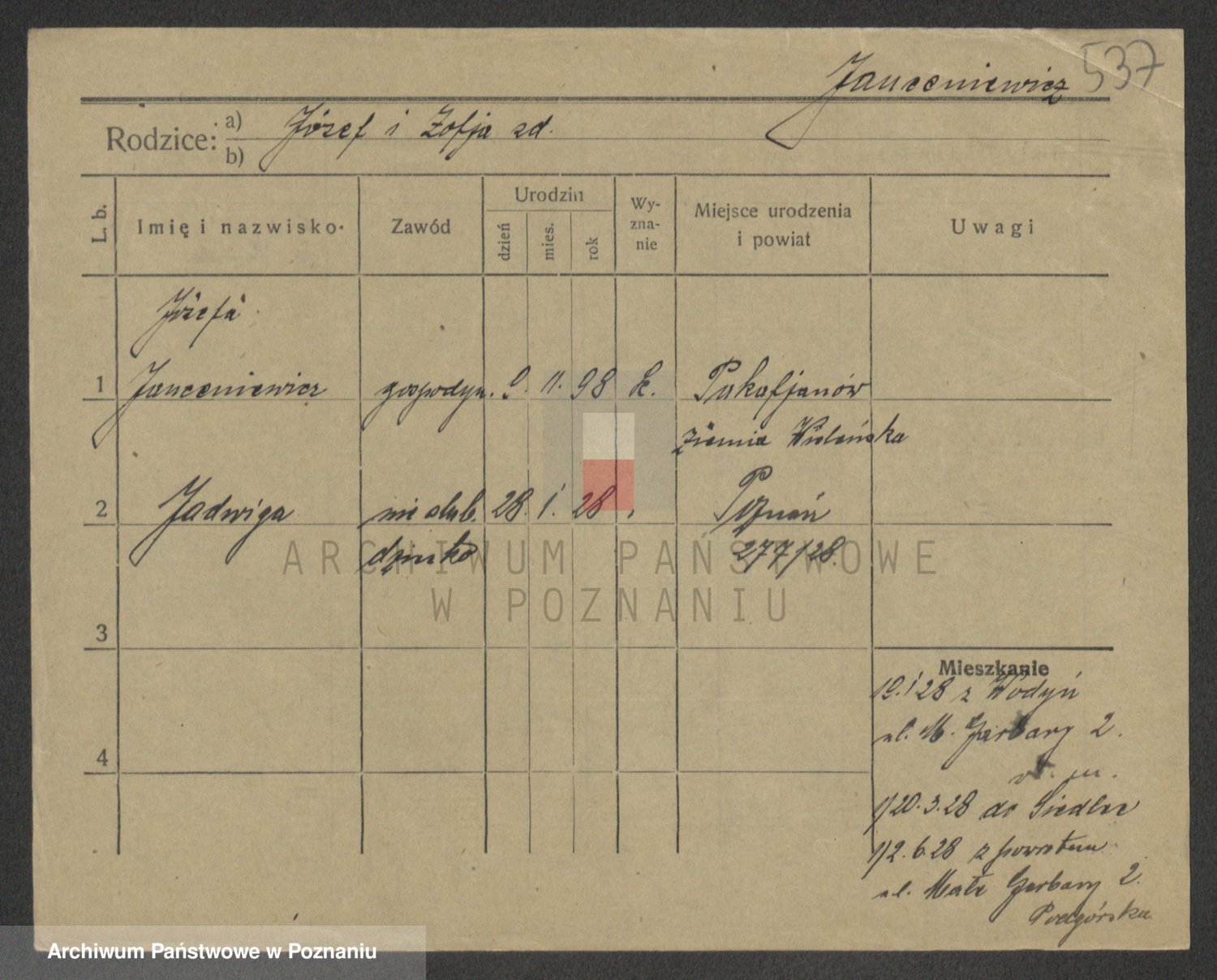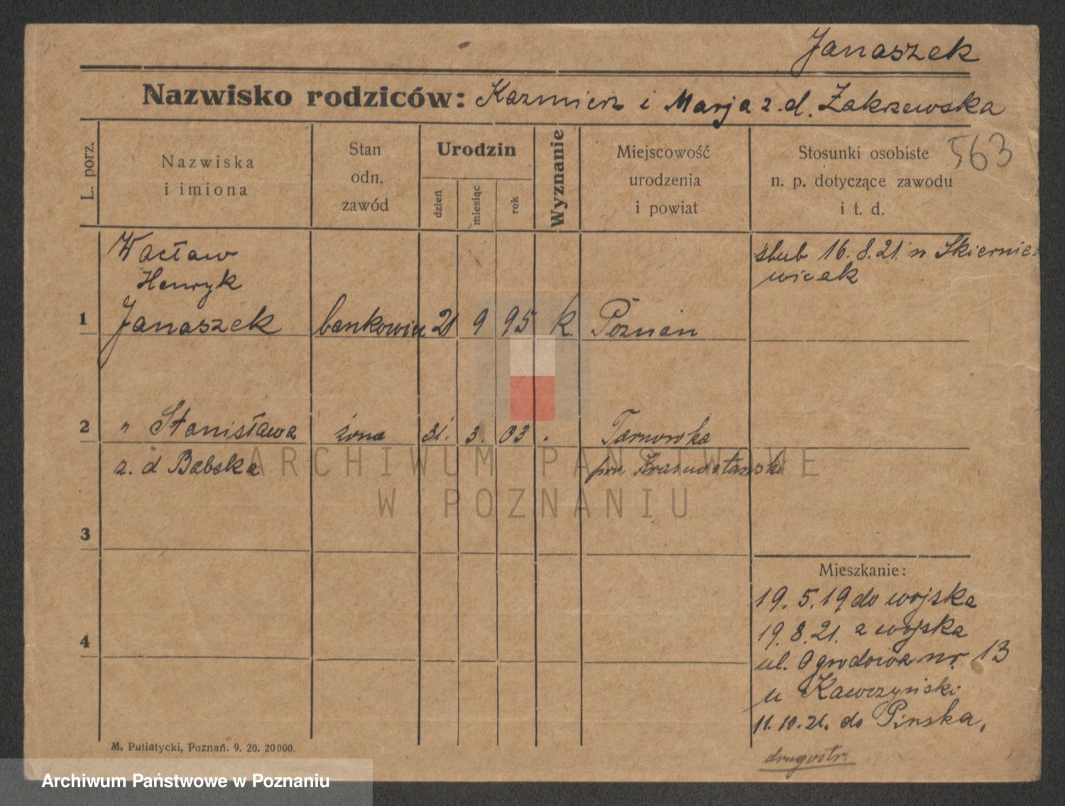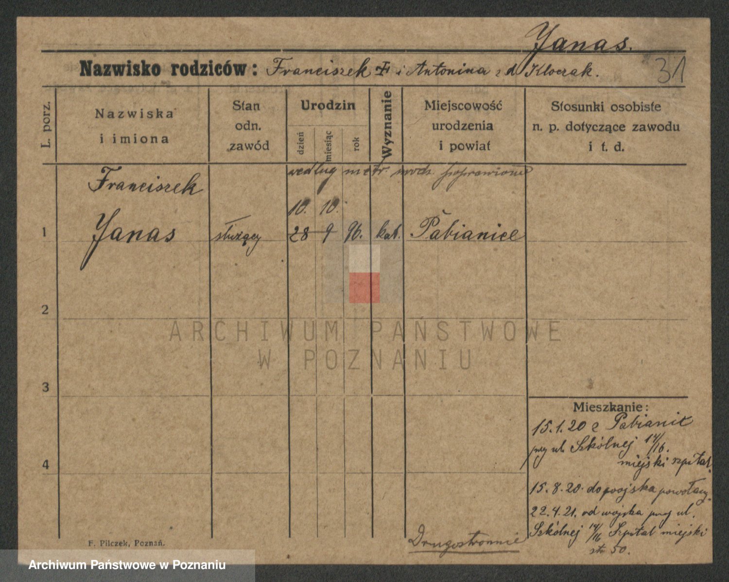 Podgląd karty osobowej dostępny jest po kliknięciu na nazwisko lub ikonkę karty. Można dokonywać powiększenia (ikony na górze) lub przechodzić między kolejnymi skanami (strzałki po bokach).