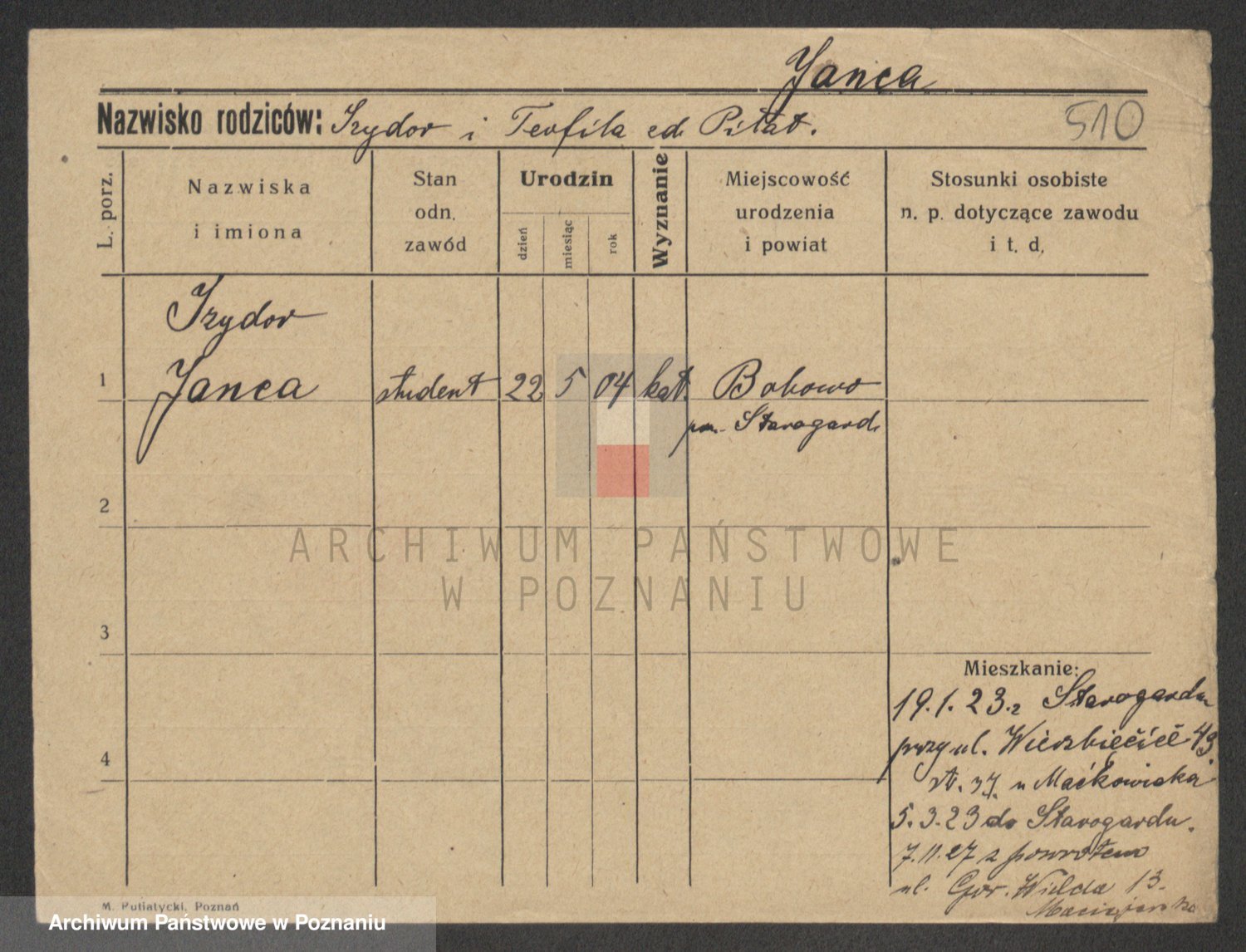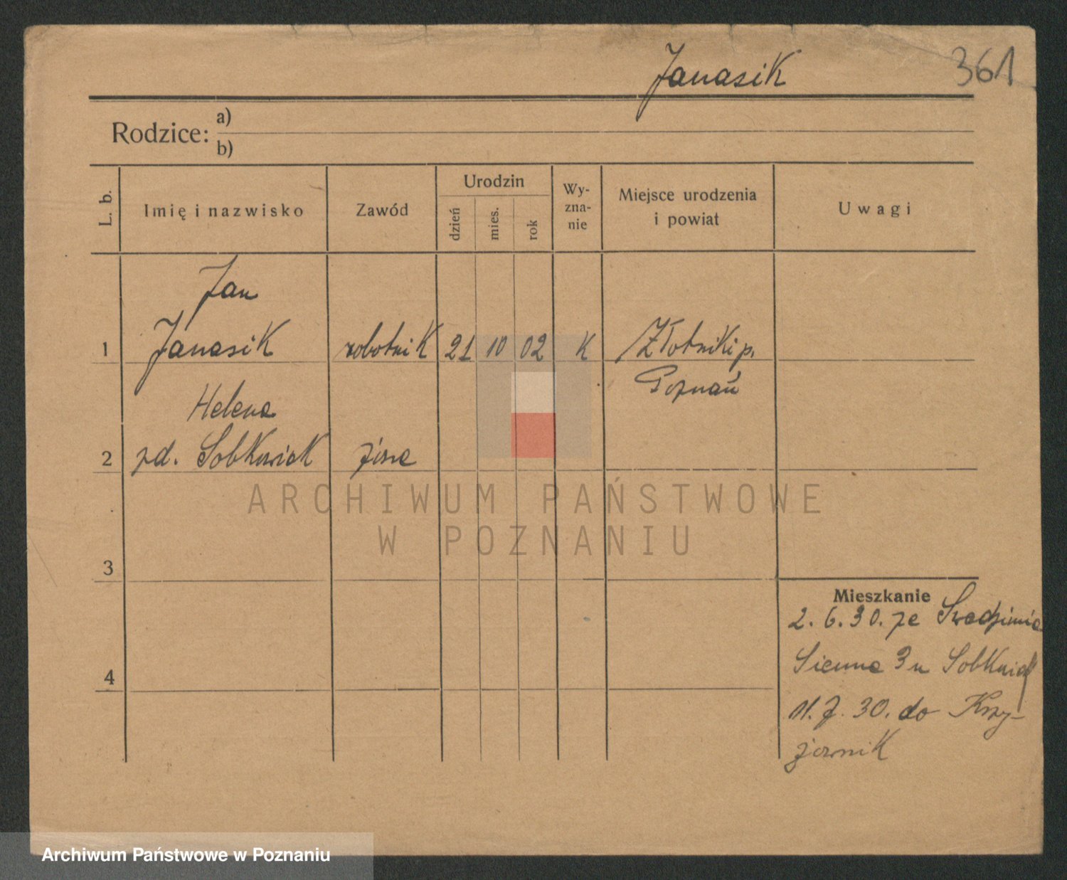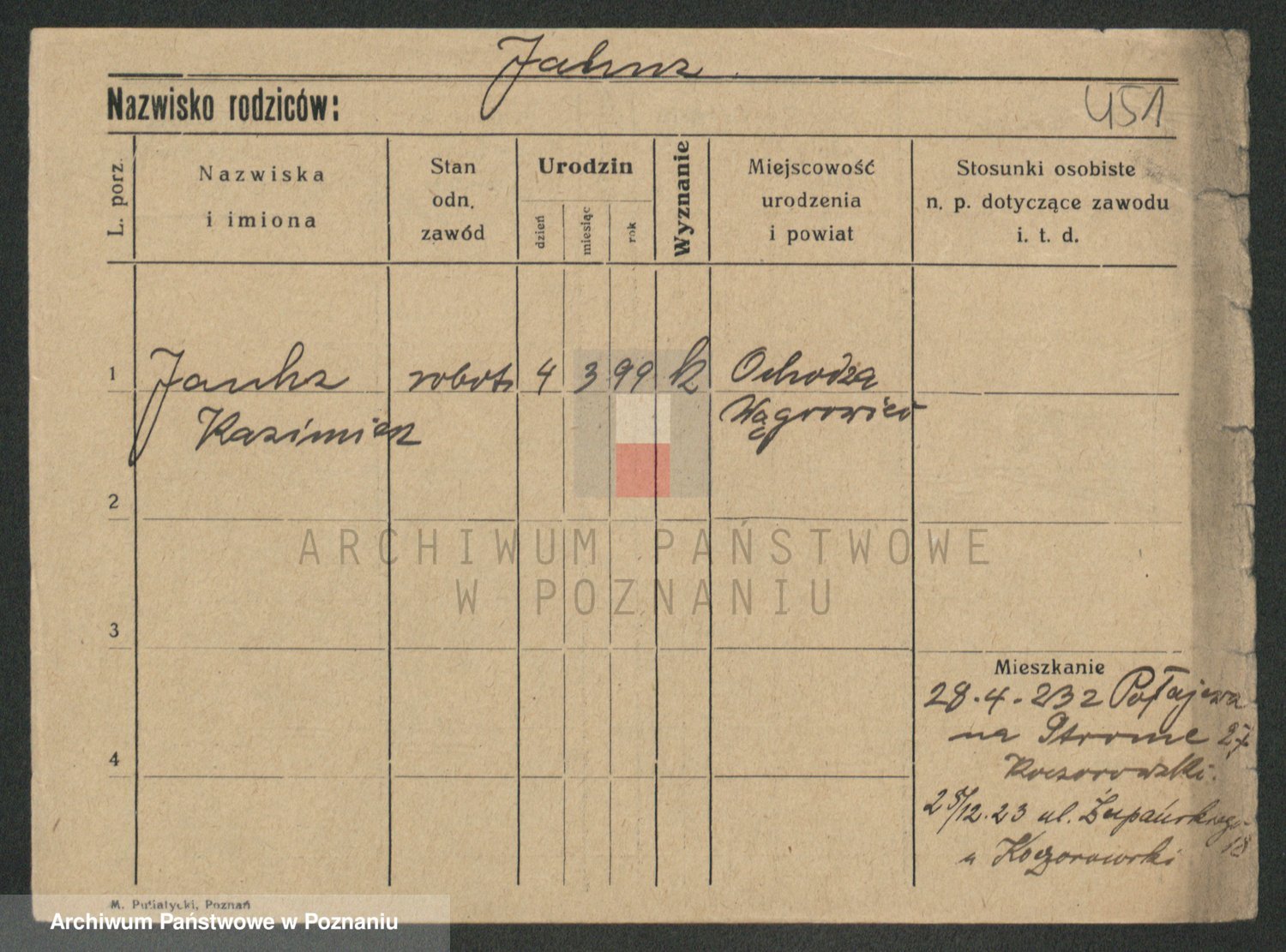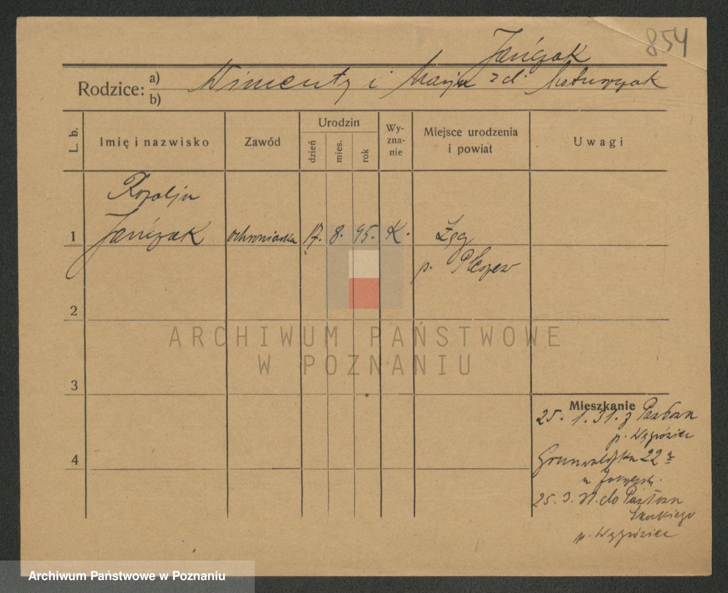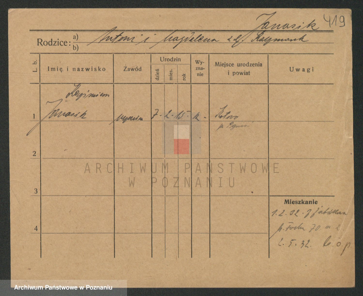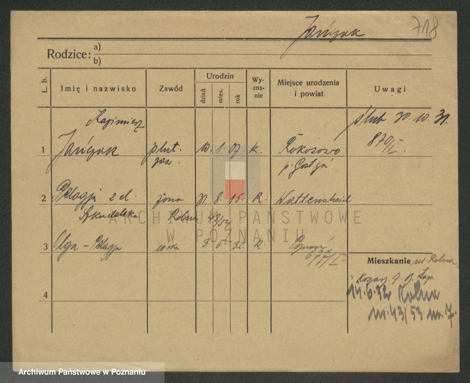 Podgląd karty osobowej dostępny jest po kliknięciu na nazwisko lub ikonkę karty. Można dokonywać powiększenia (ikony na górze) lub przechodzić między kolejnymi skanami (strzałki po bokach).