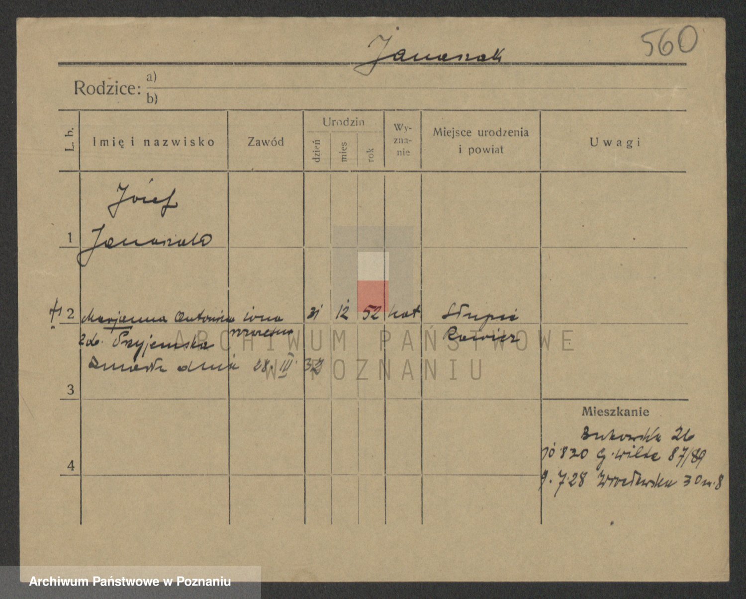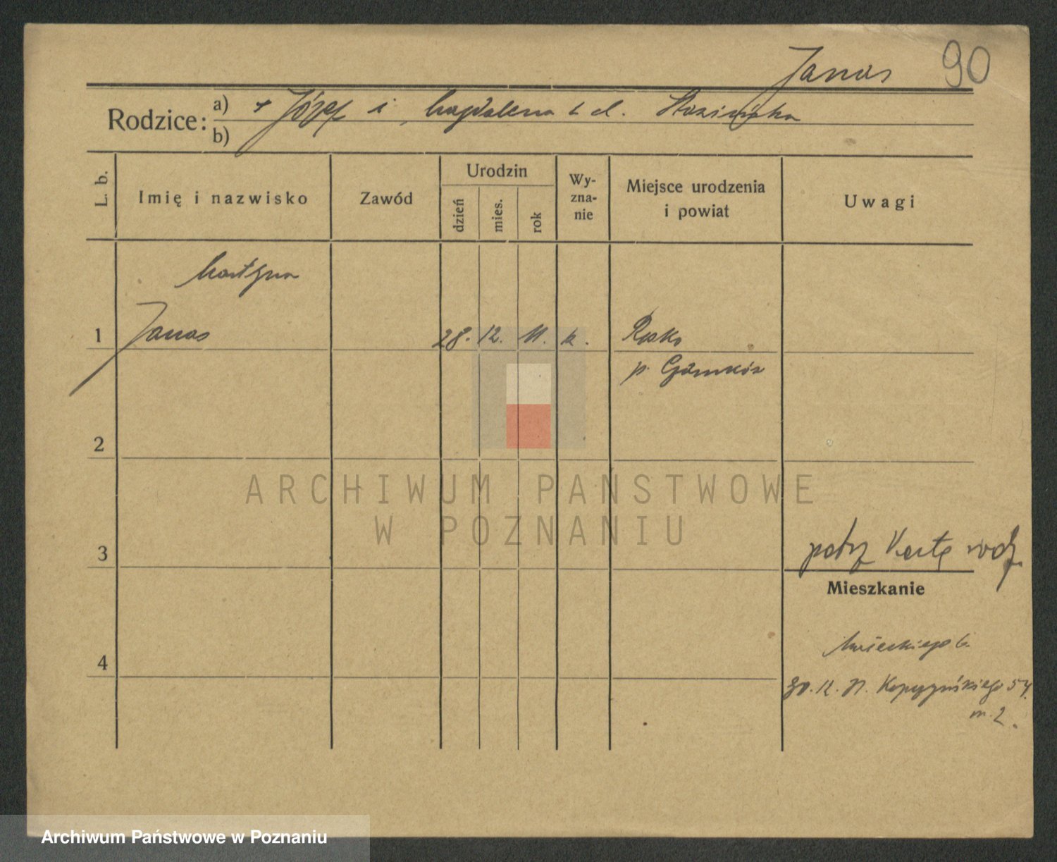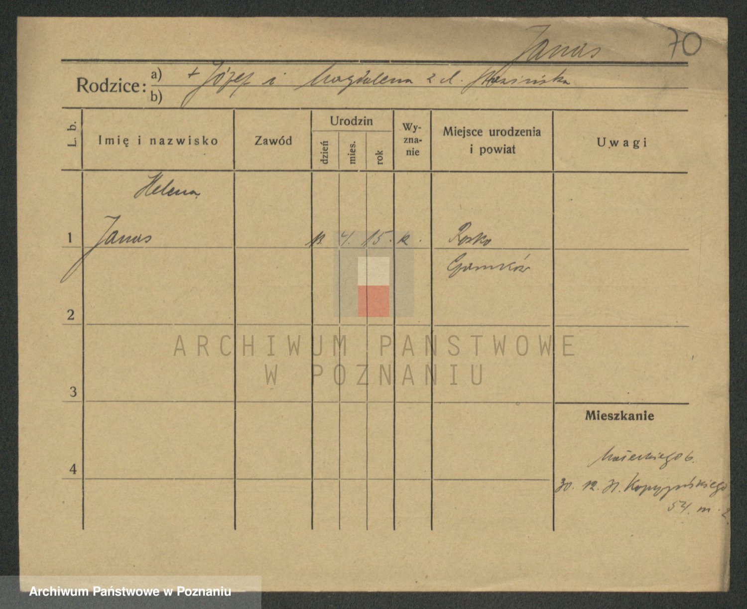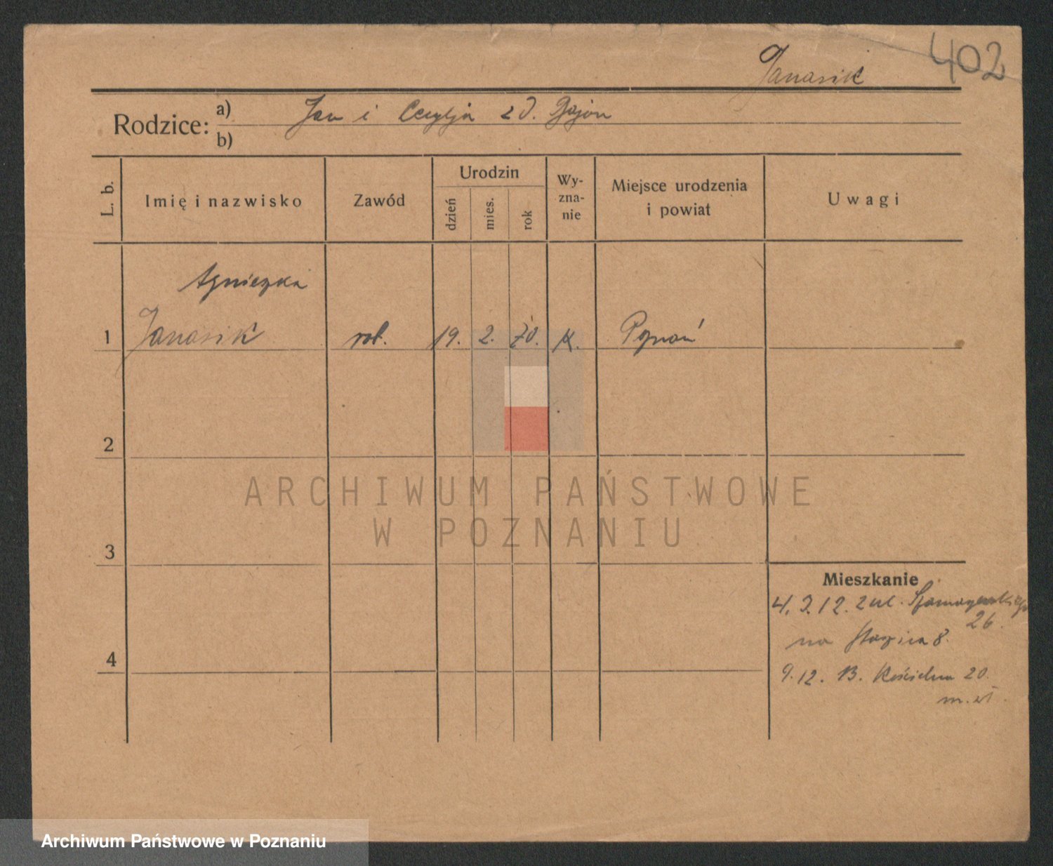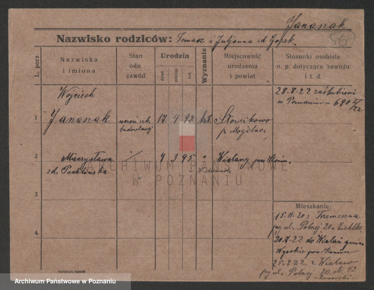 Podgląd karty osobowej dostępny jest po kliknięciu na nazwisko lub ikonkę karty. Można dokonywać powiększenia (ikony na górze) lub przechodzić między kolejnymi skanami (strzałki po bokach).