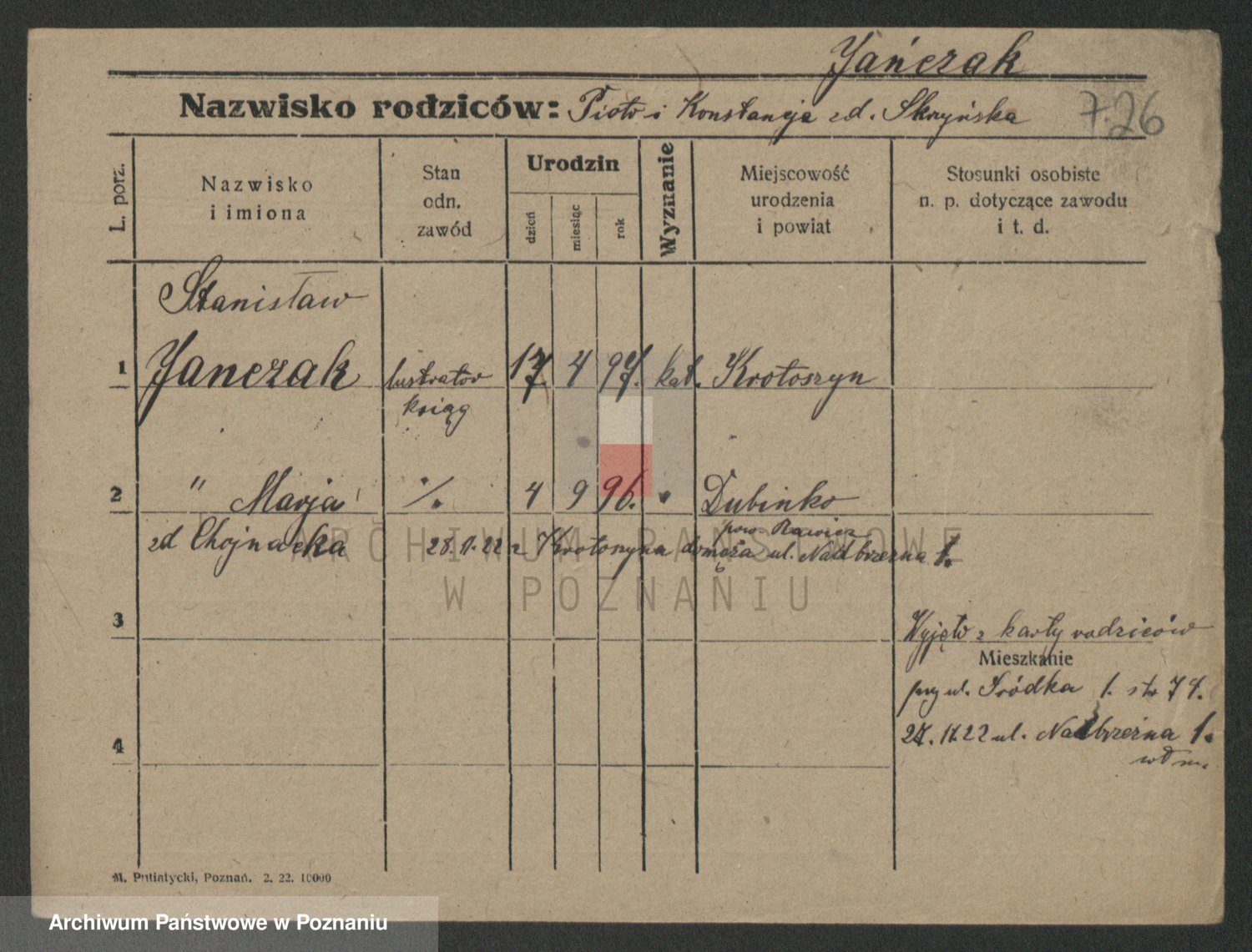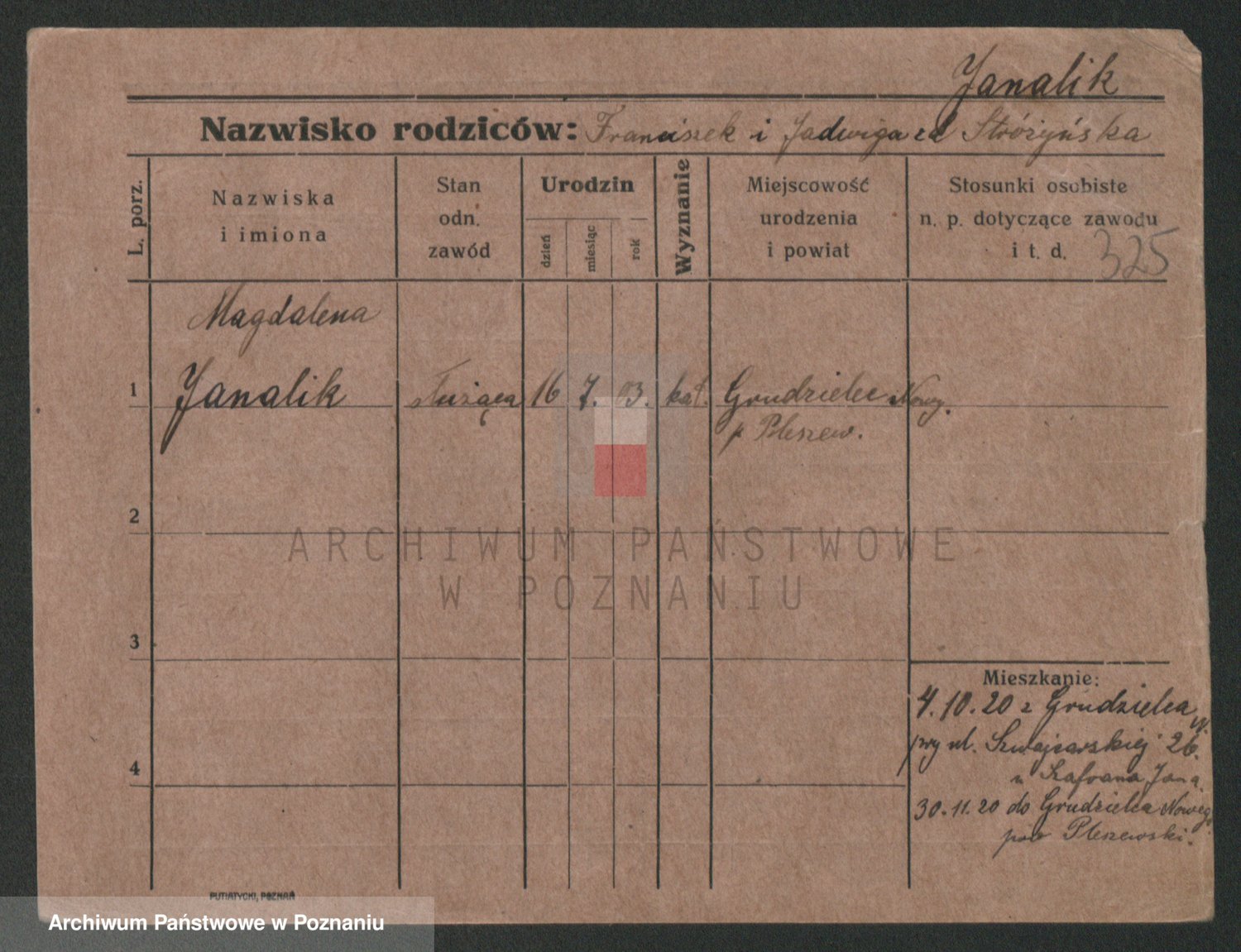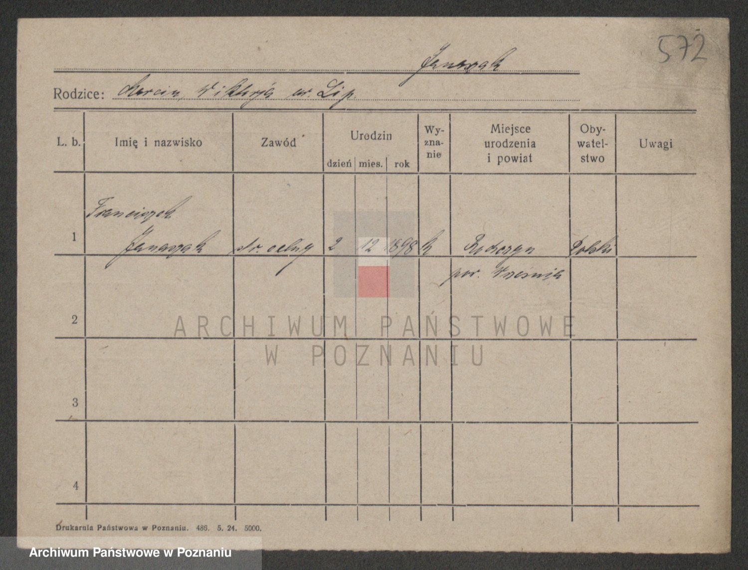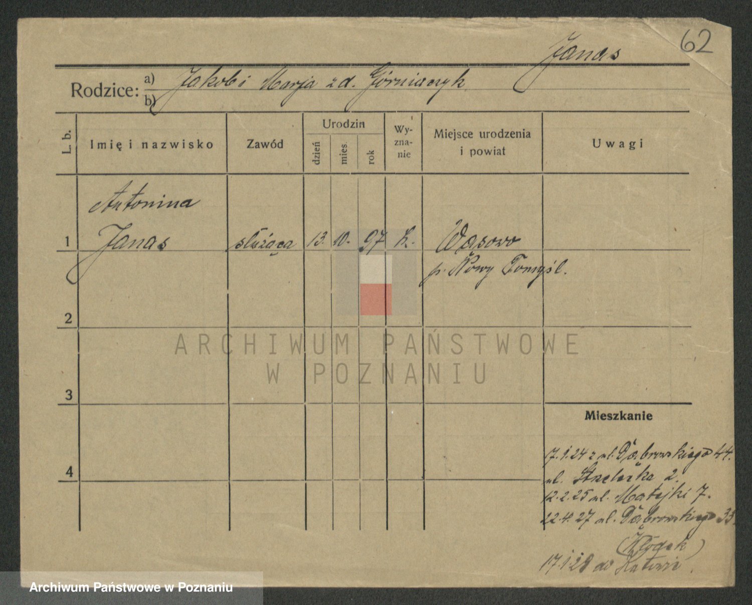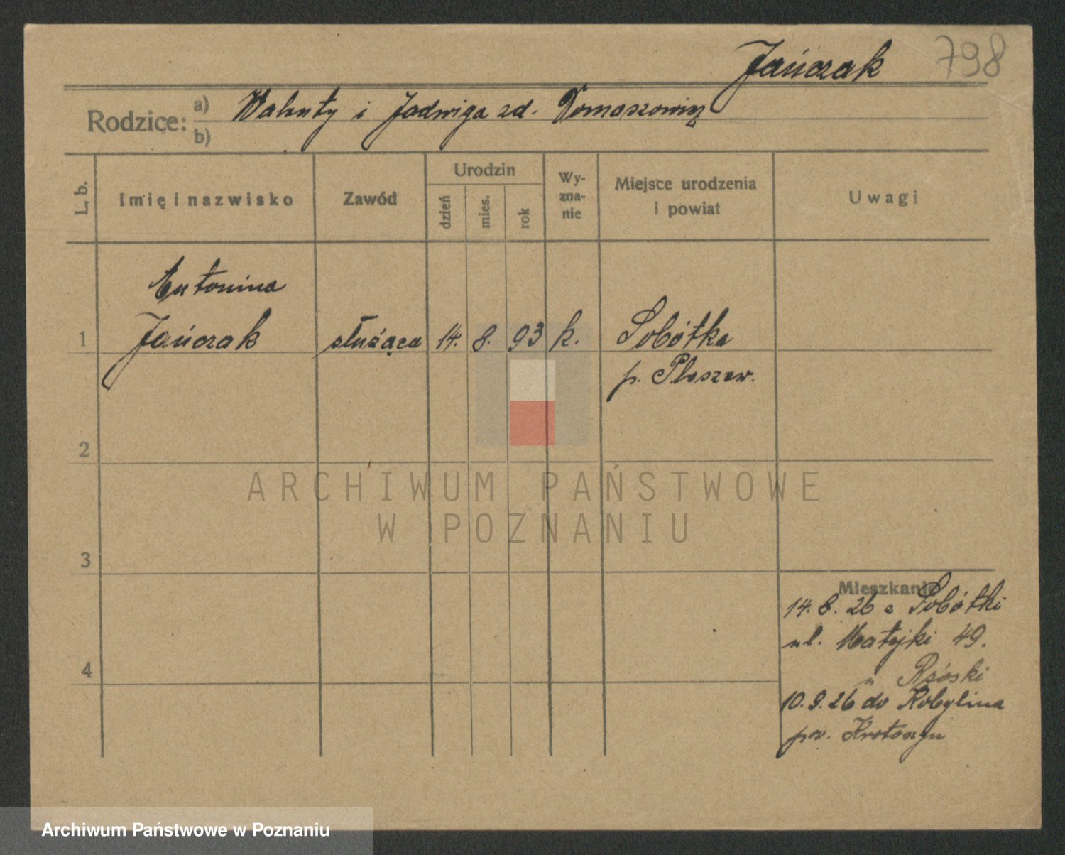 Podgląd karty osobowej dostępny jest po kliknięciu na nazwisko lub ikonkę karty. Można dokonywać powiększenia (ikony na górze) lub przechodzić między kolejnymi skanami (strzałki po bokach).