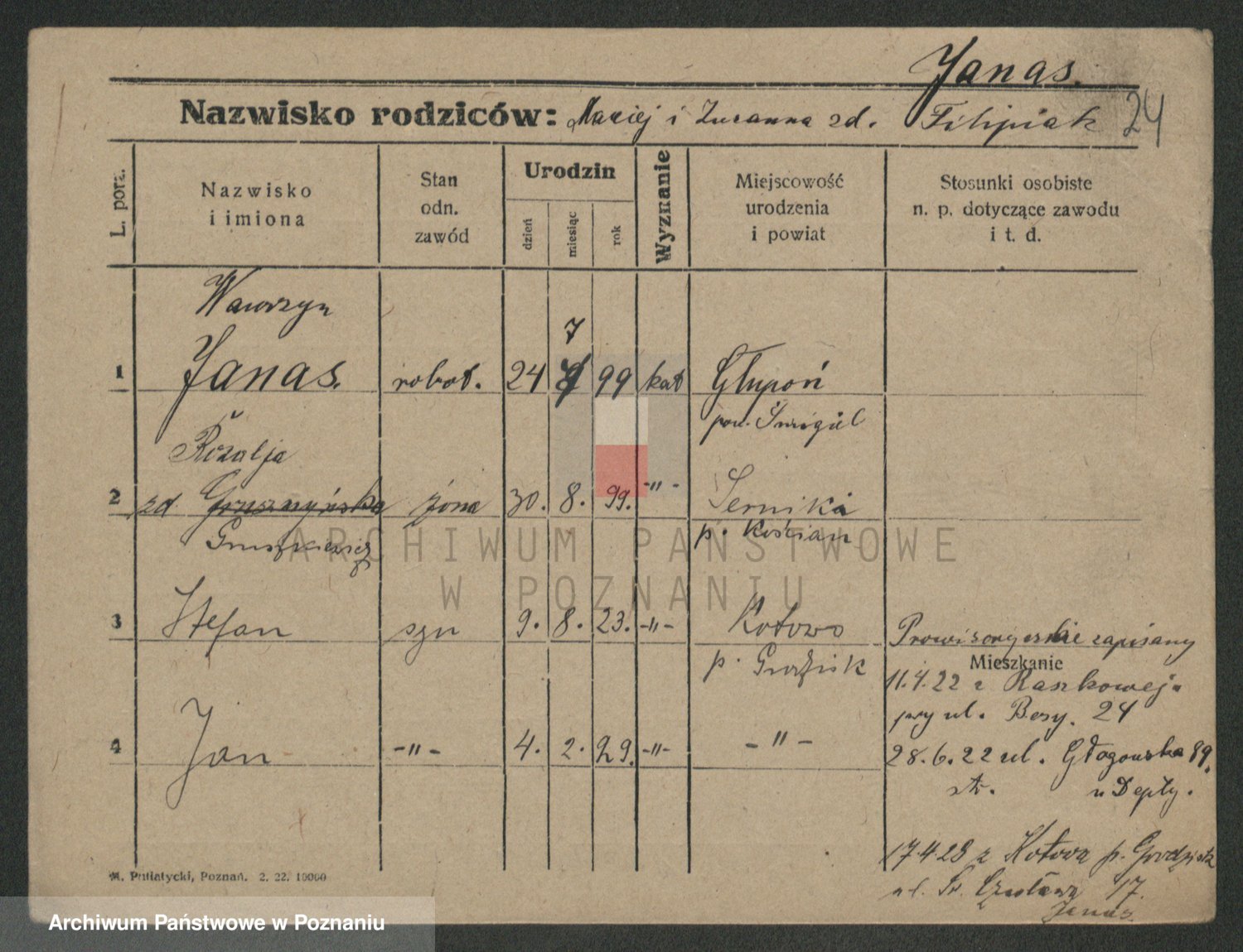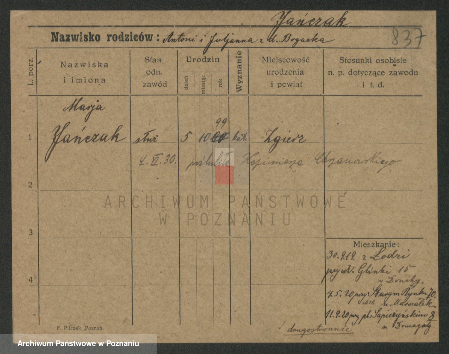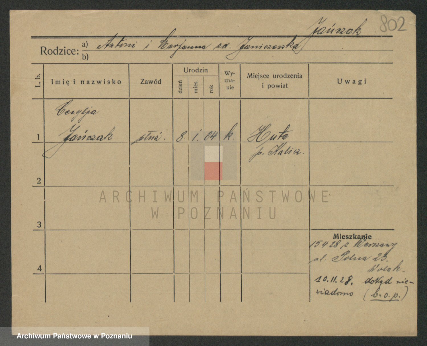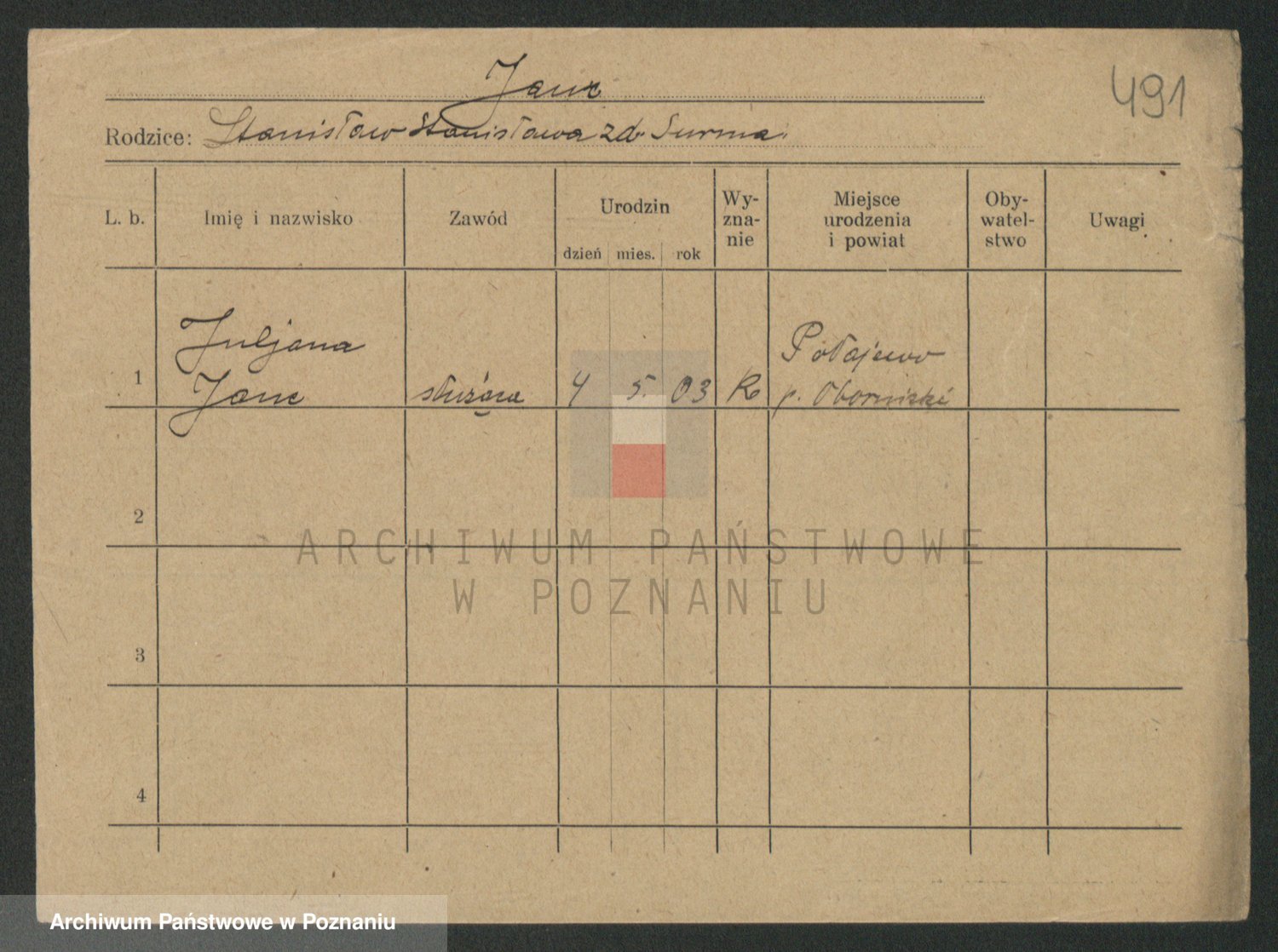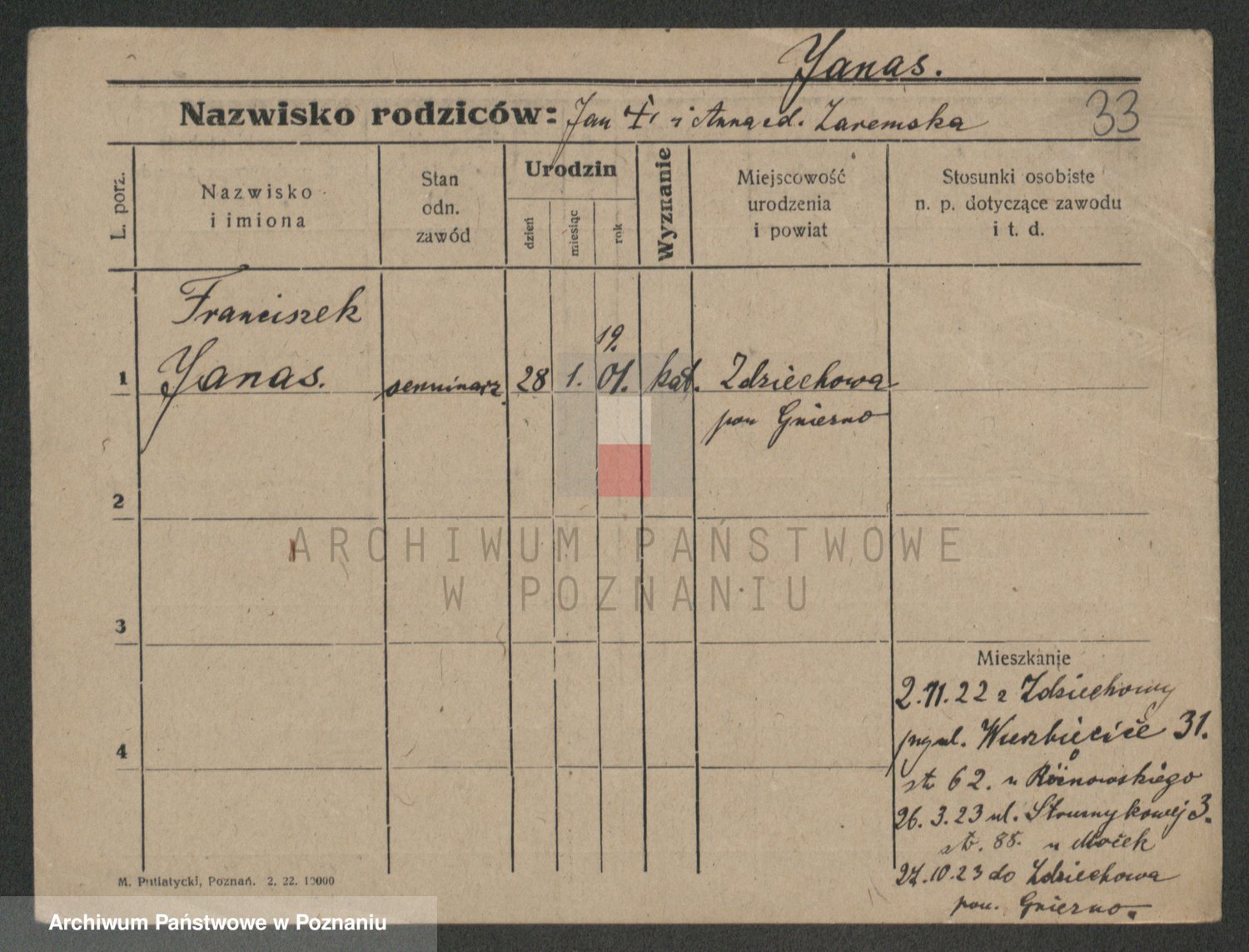 Podgląd karty osobowej dostępny jest po kliknięciu na nazwisko lub ikonkę karty. Można dokonywać powiększenia (ikony na górze) lub przechodzić między kolejnymi skanami (strzałki po bokach).