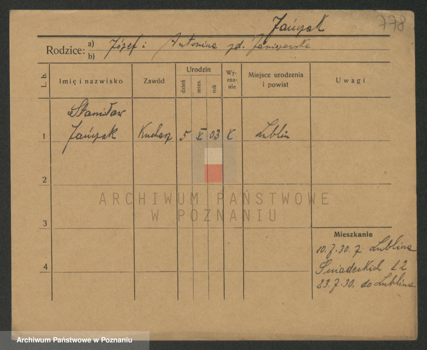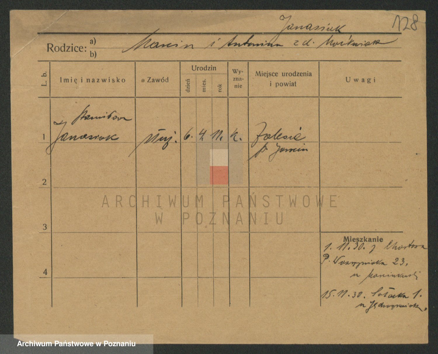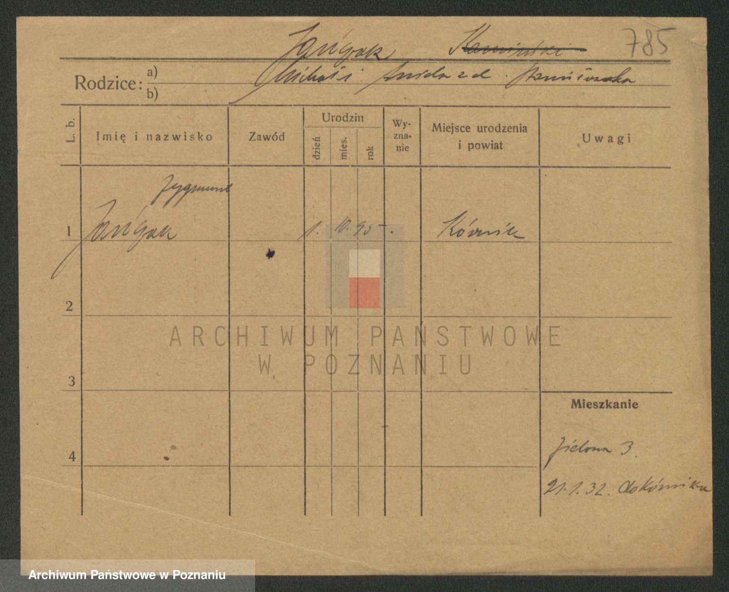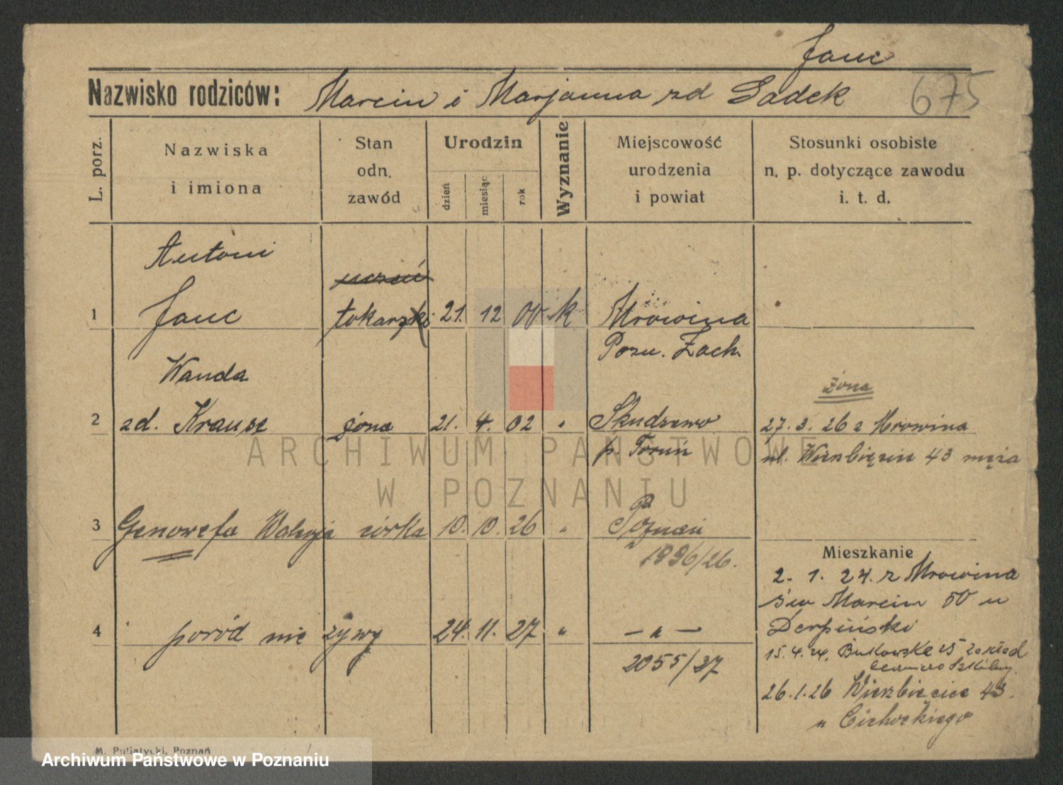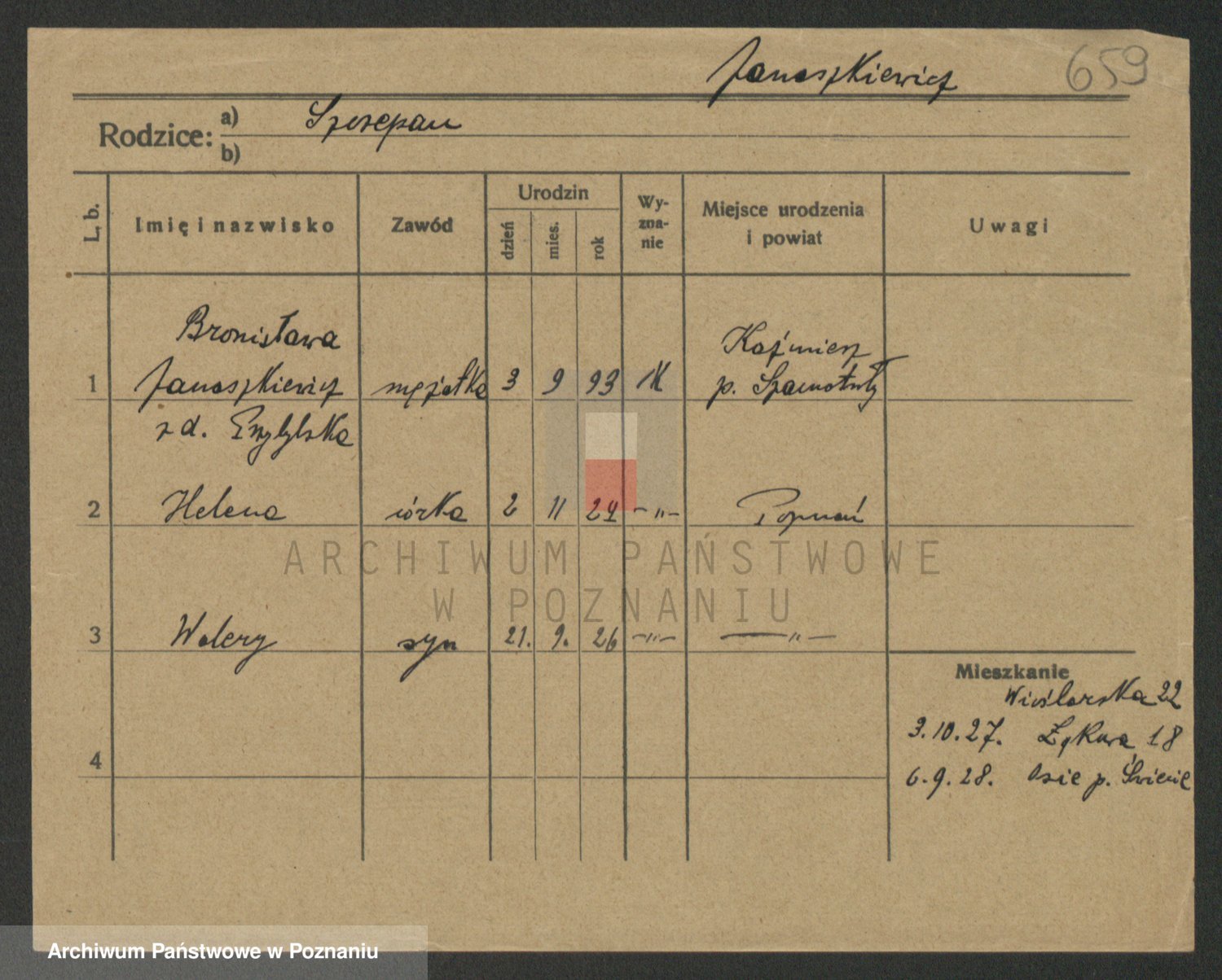 Podgląd karty osobowej dostępny jest po kliknięciu na nazwisko lub ikonkę karty. Można dokonywać powiększenia (ikony na górze) lub przechodzić między kolejnymi skanami (strzałki po bokach).