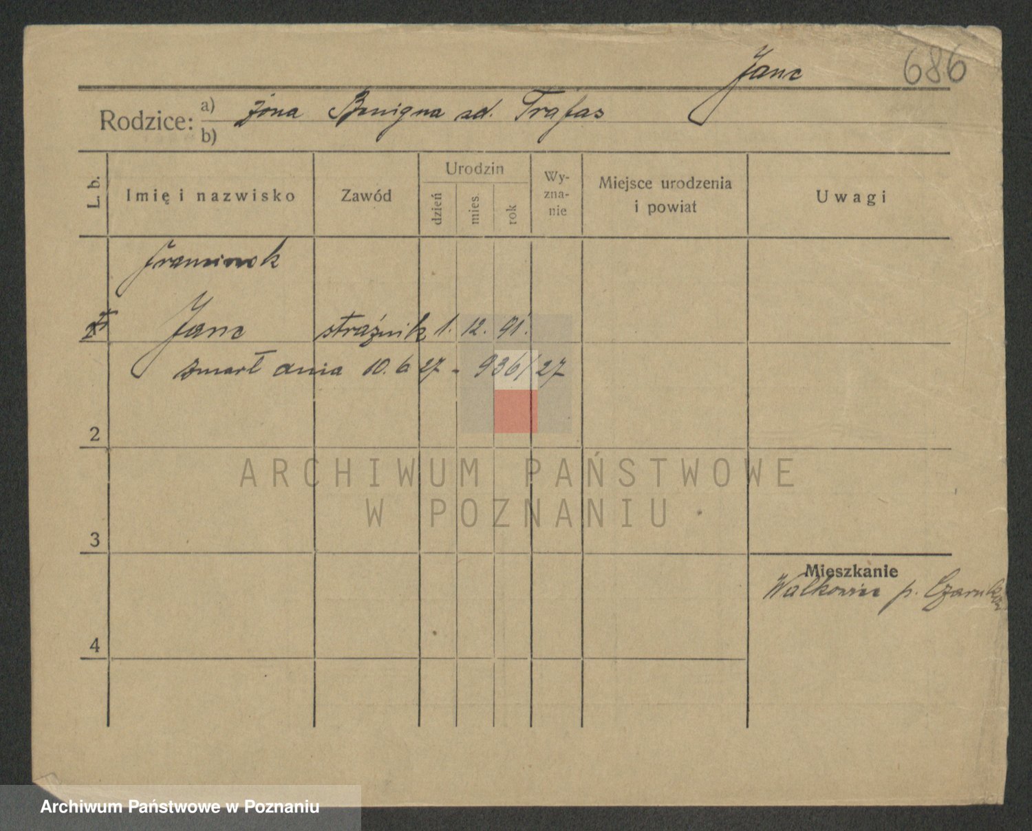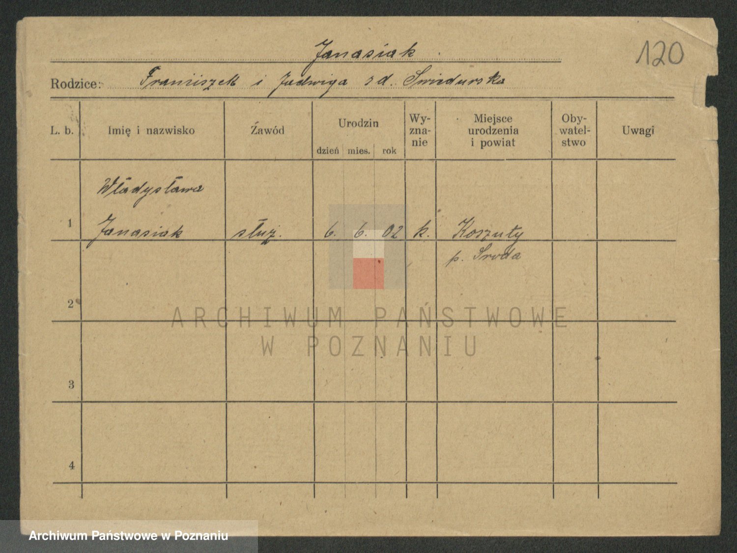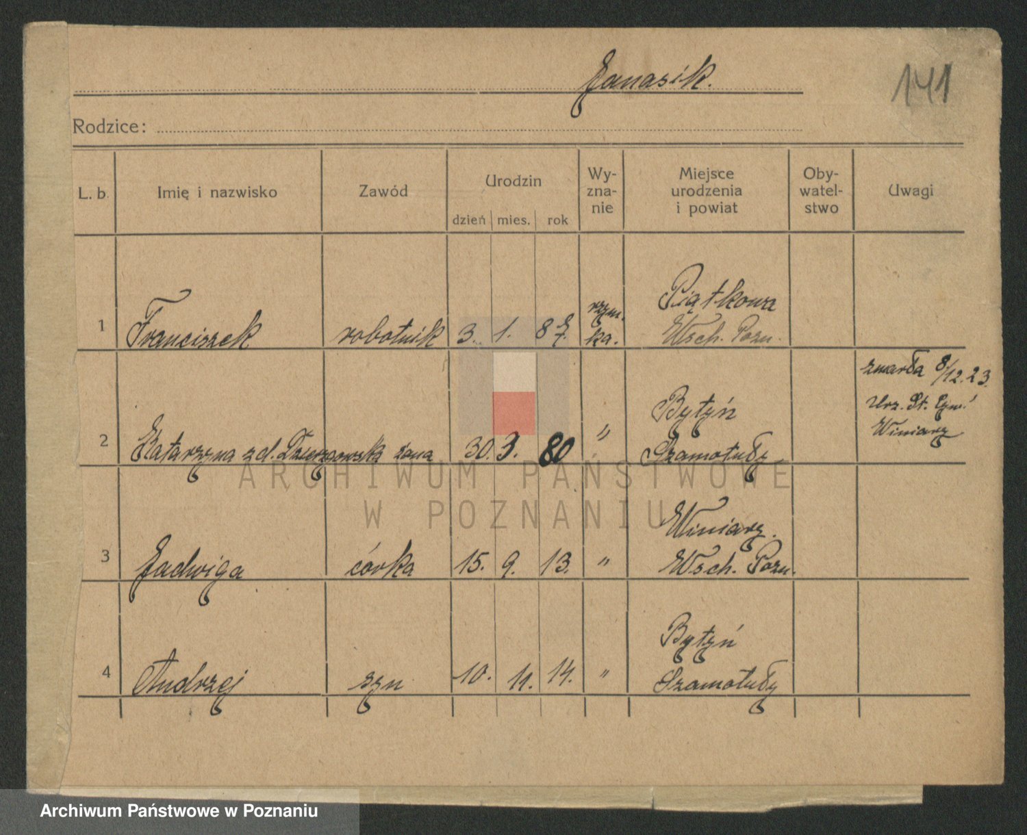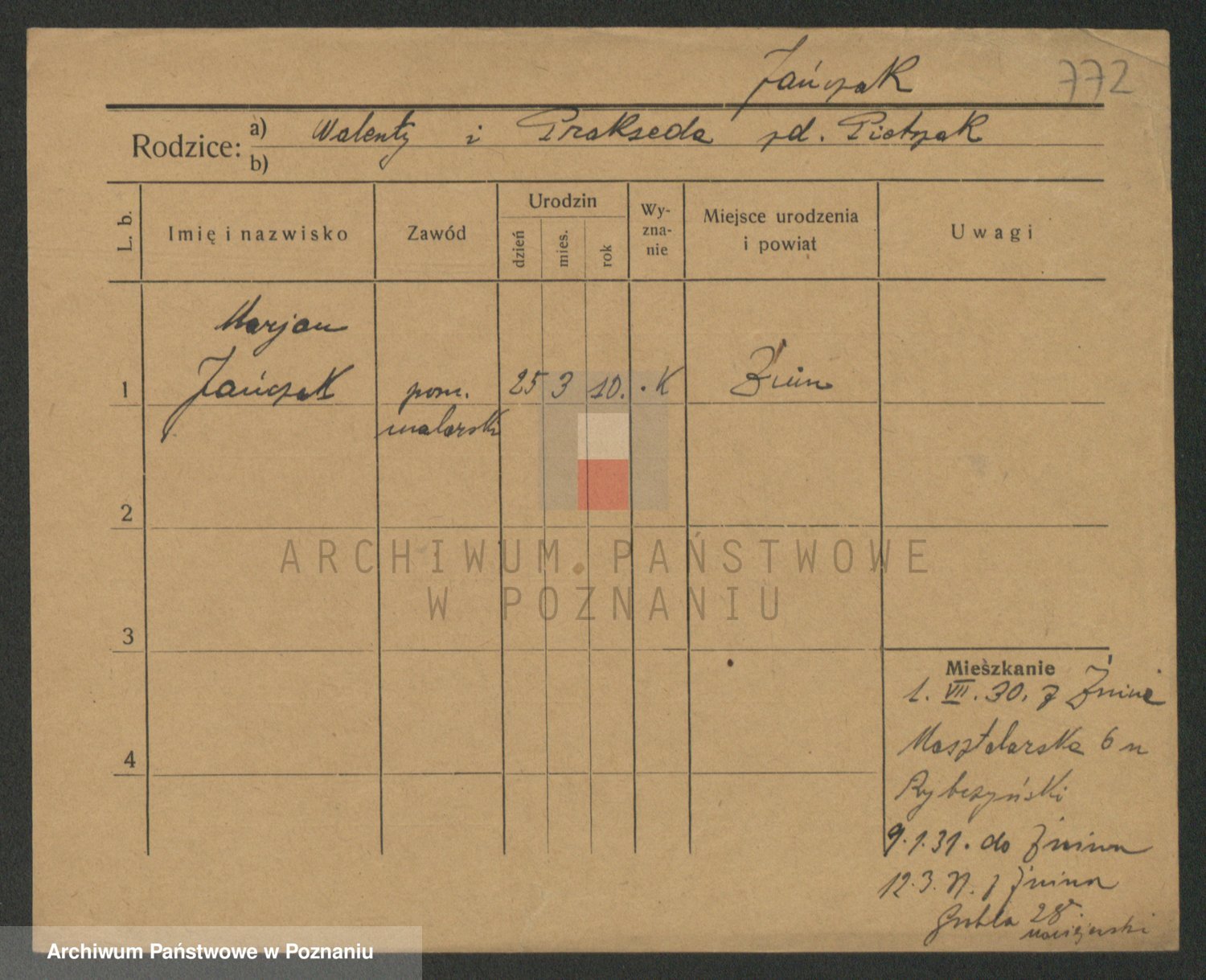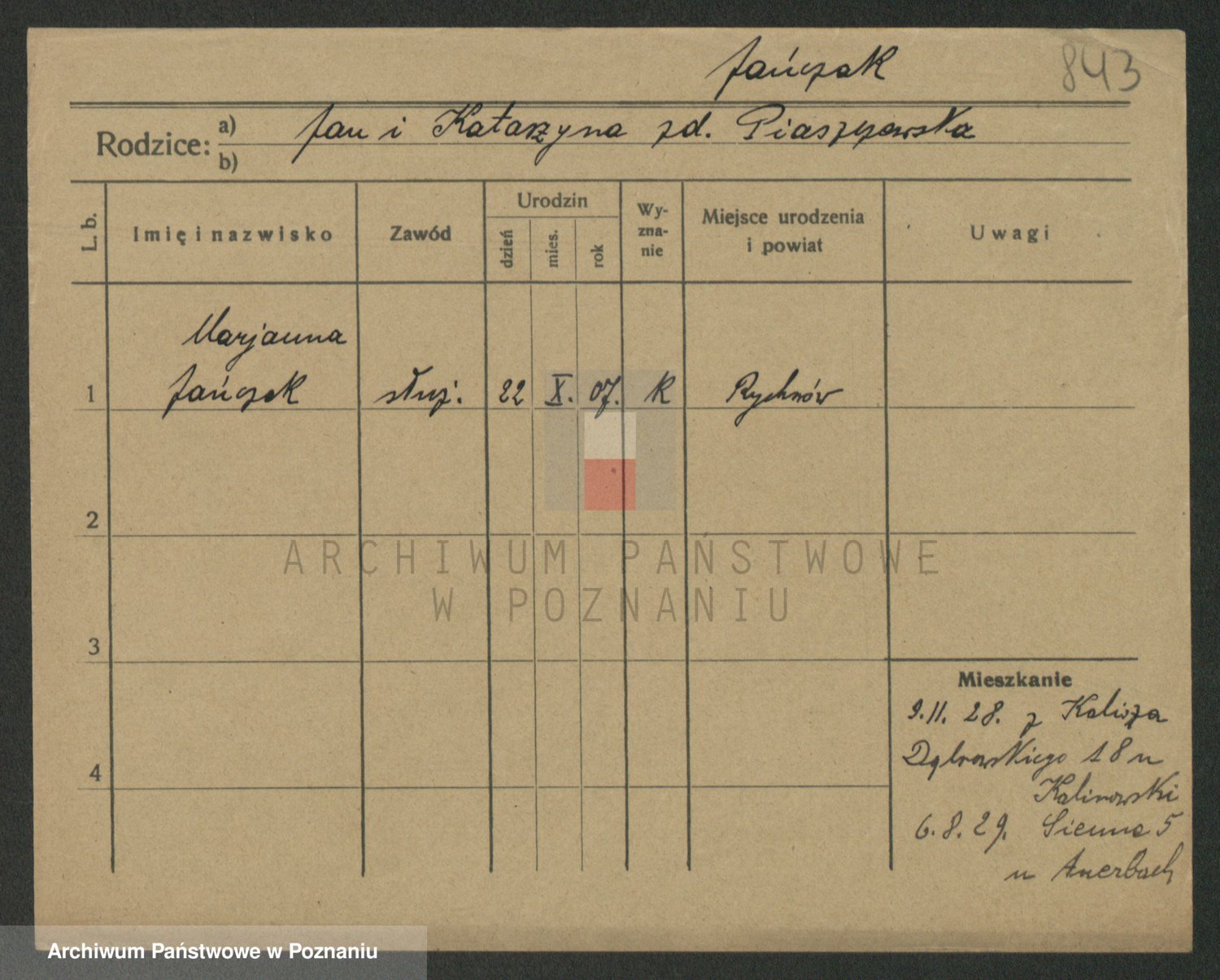 Podgląd karty osobowej dostępny jest po kliknięciu na nazwisko lub ikonkę karty. Można dokonywać powiększenia (ikony na górze) lub przechodzić między kolejnymi skanami (strzałki po bokach).