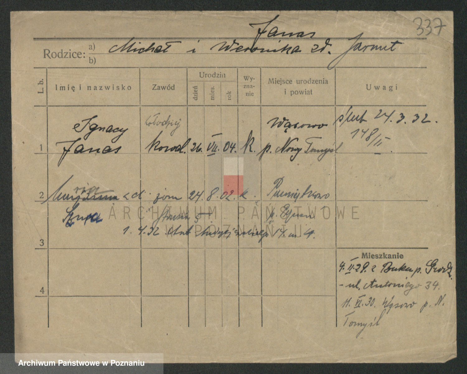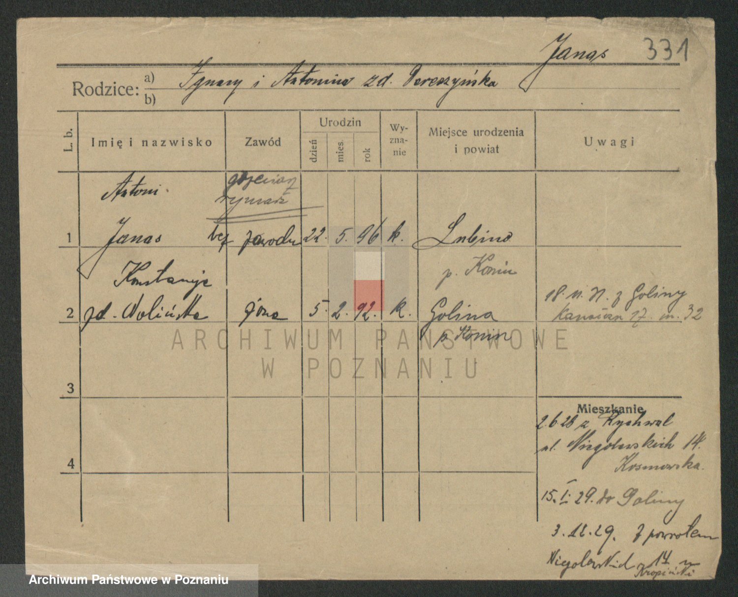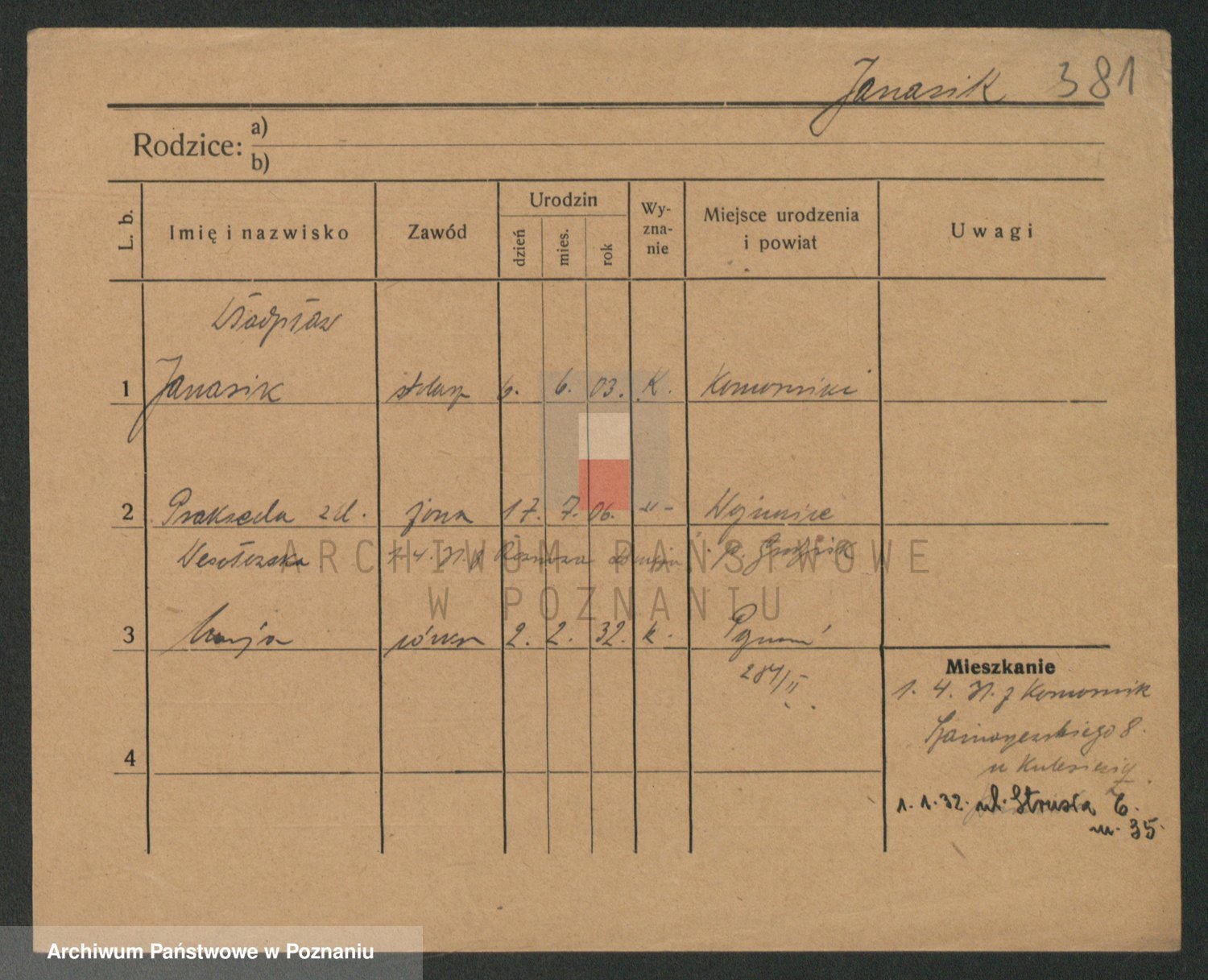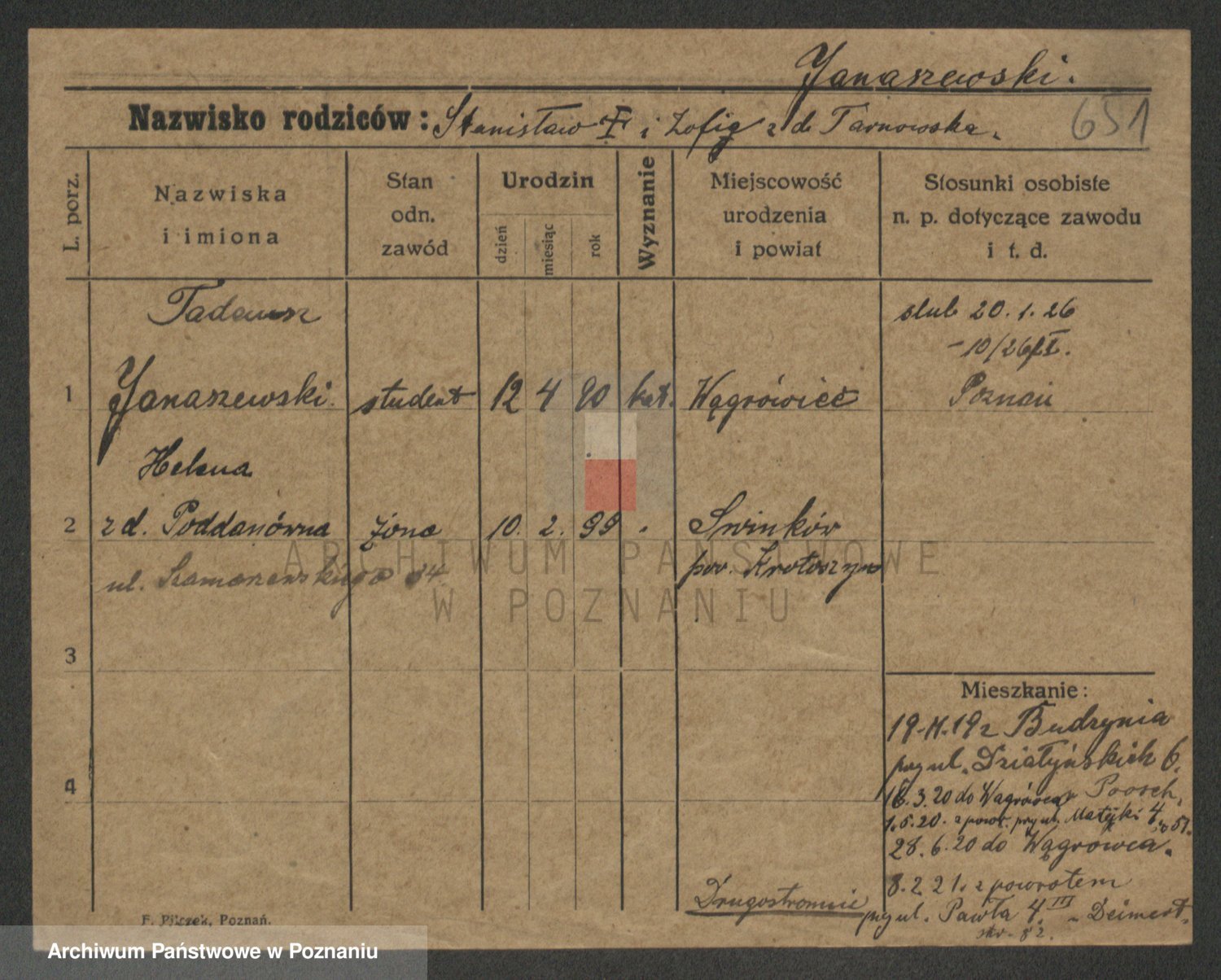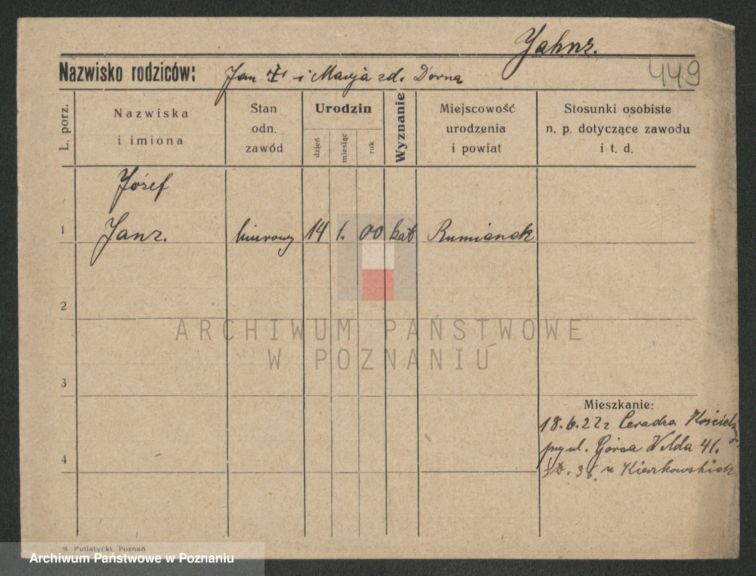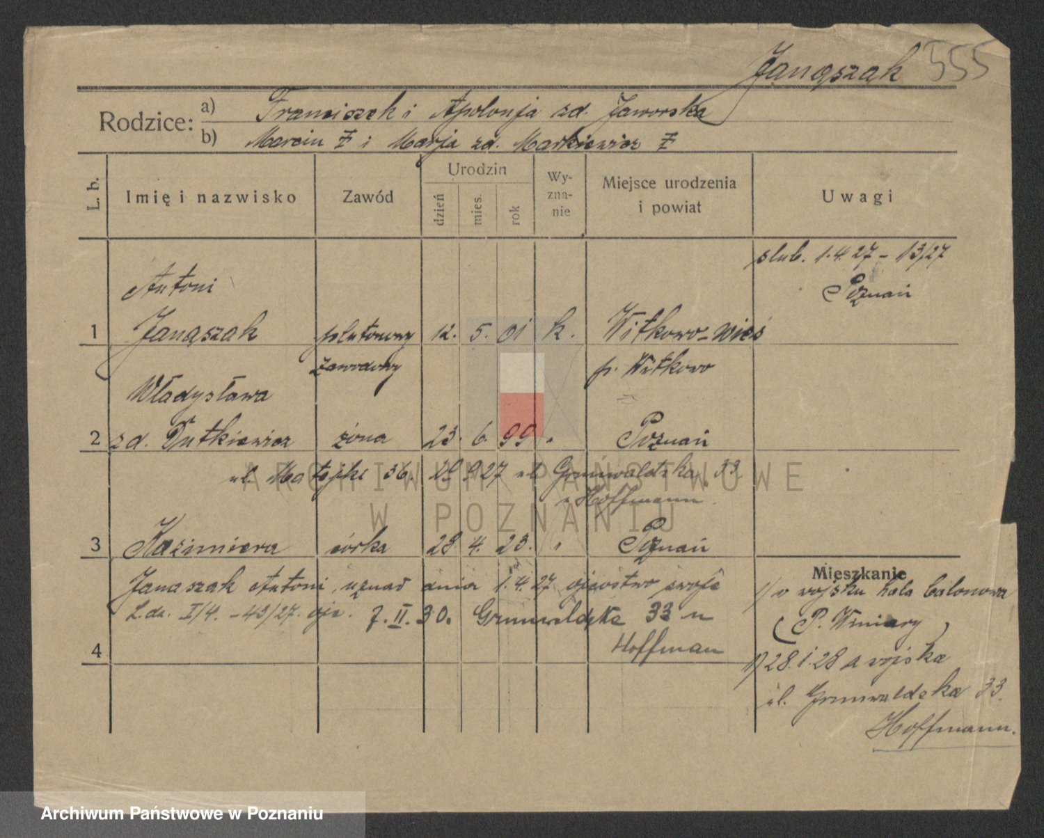 Podgląd karty osobowej dostępny jest po kliknięciu na nazwisko lub ikonkę karty. Można dokonywać powiększenia (ikony na górze) lub przechodzić między kolejnymi skanami (strzałki po bokach).