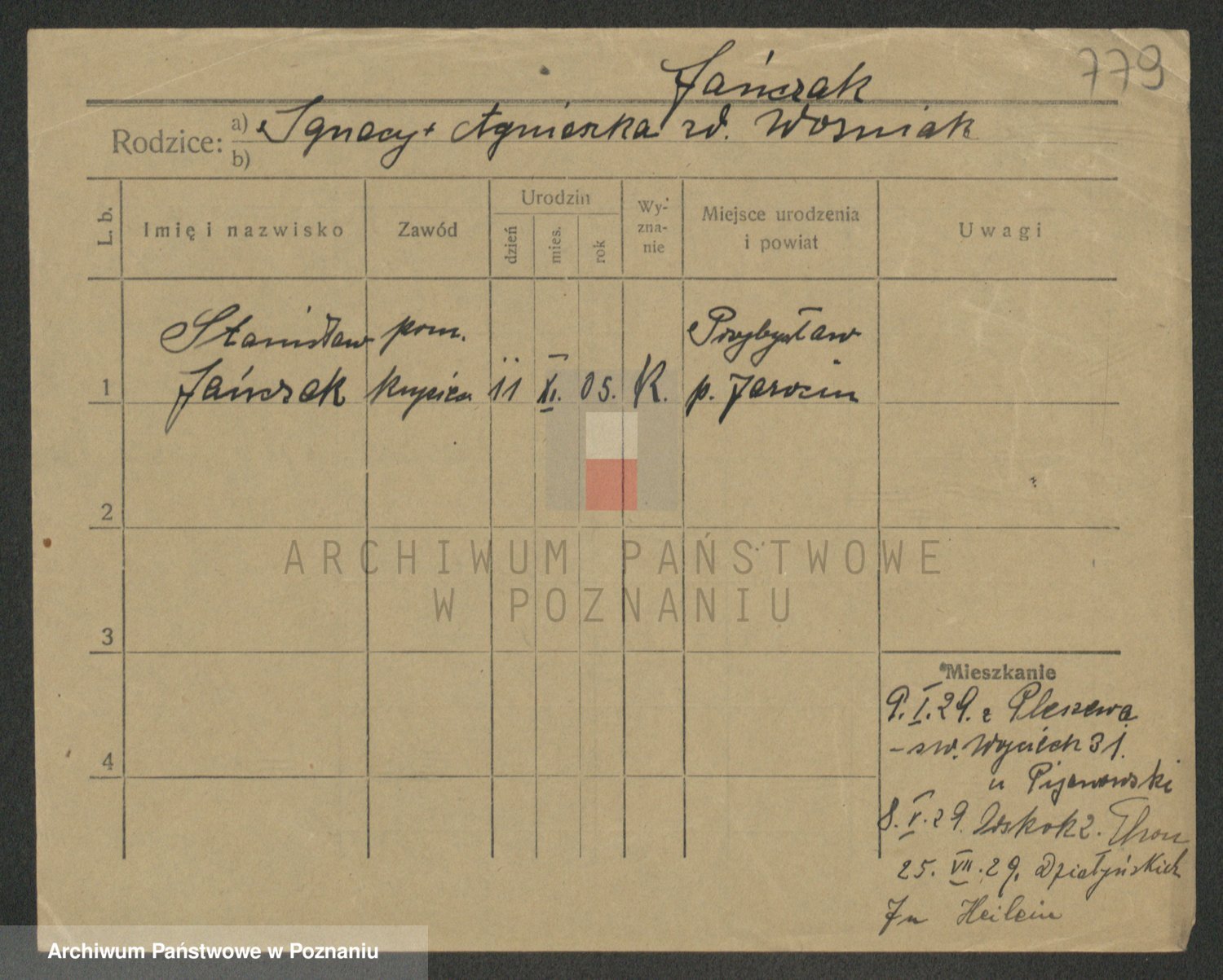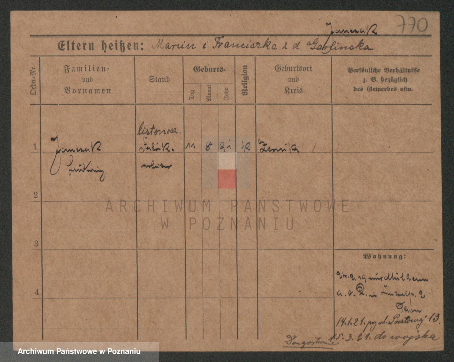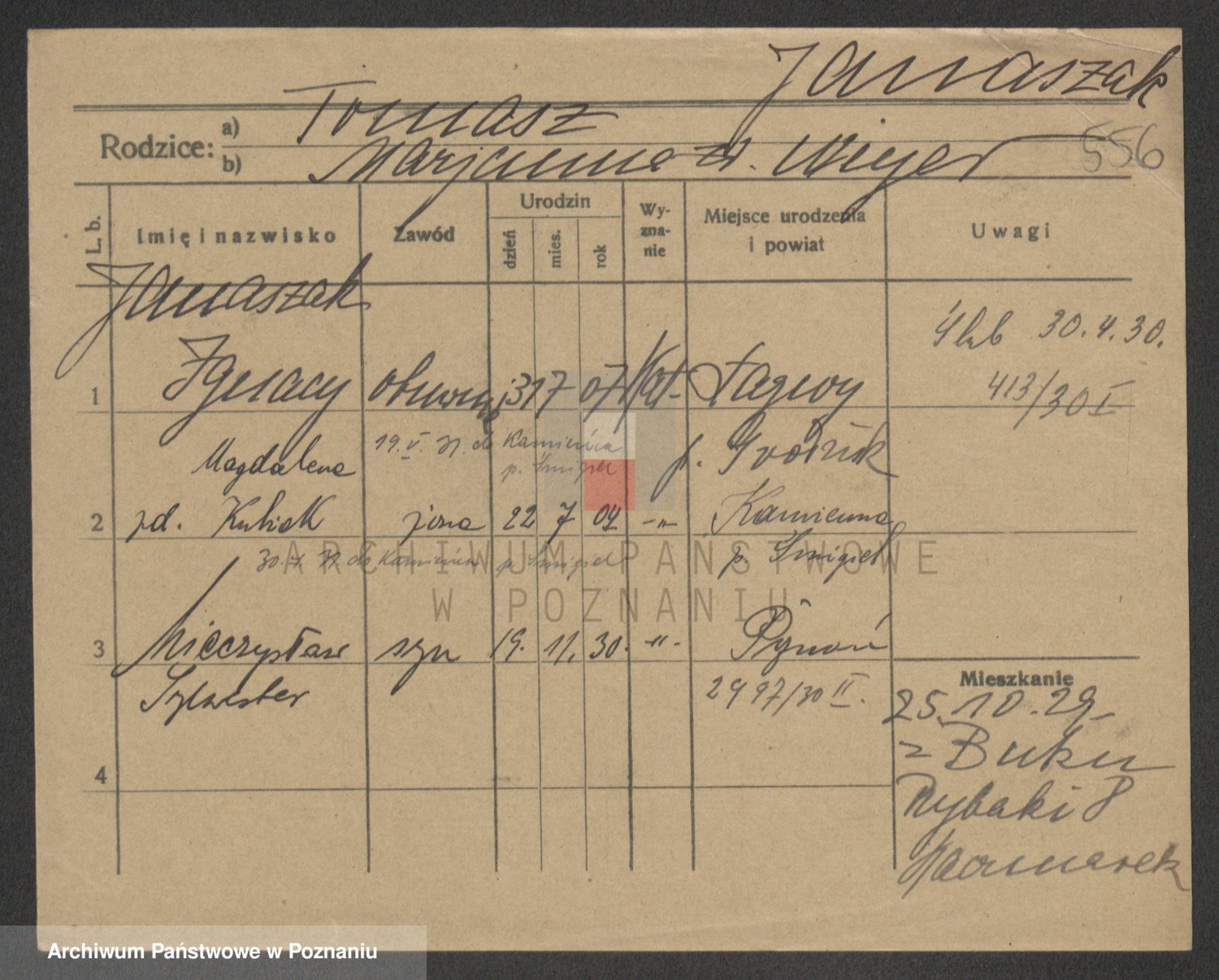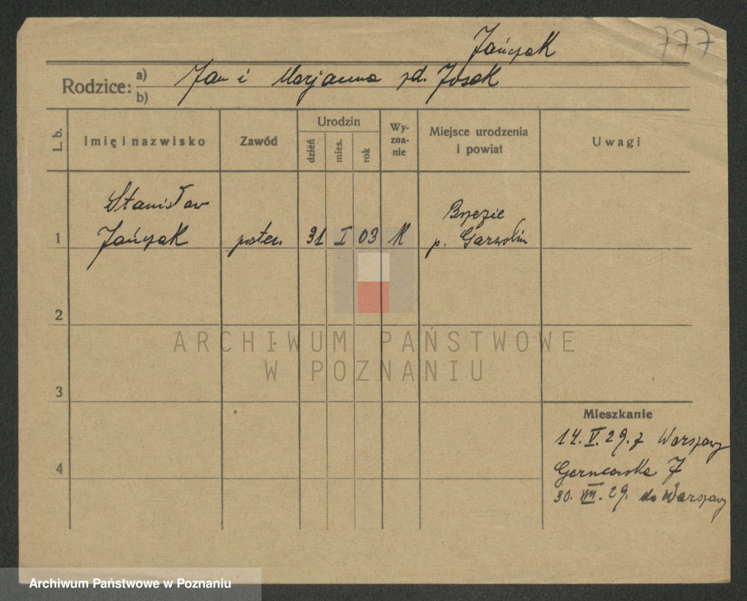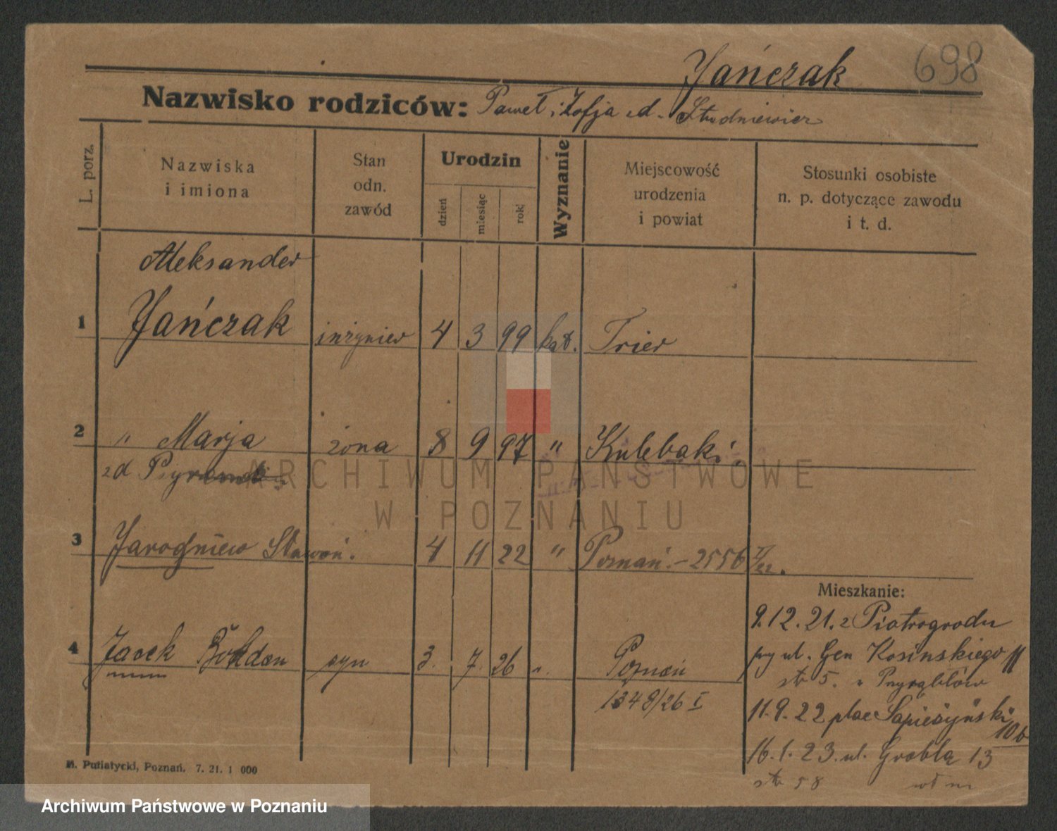 Podgląd karty osobowej dostępny jest po kliknięciu na nazwisko lub ikonkę karty. Można dokonywać powiększenia (ikony na górze) lub przechodzić między kolejnymi skanami (strzałki po bokach).
