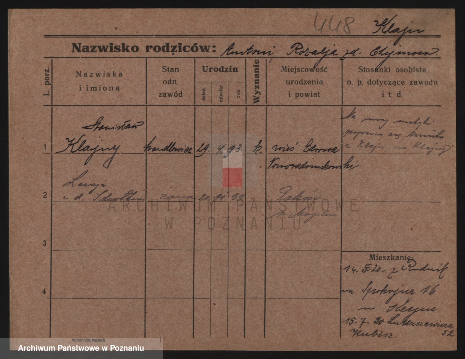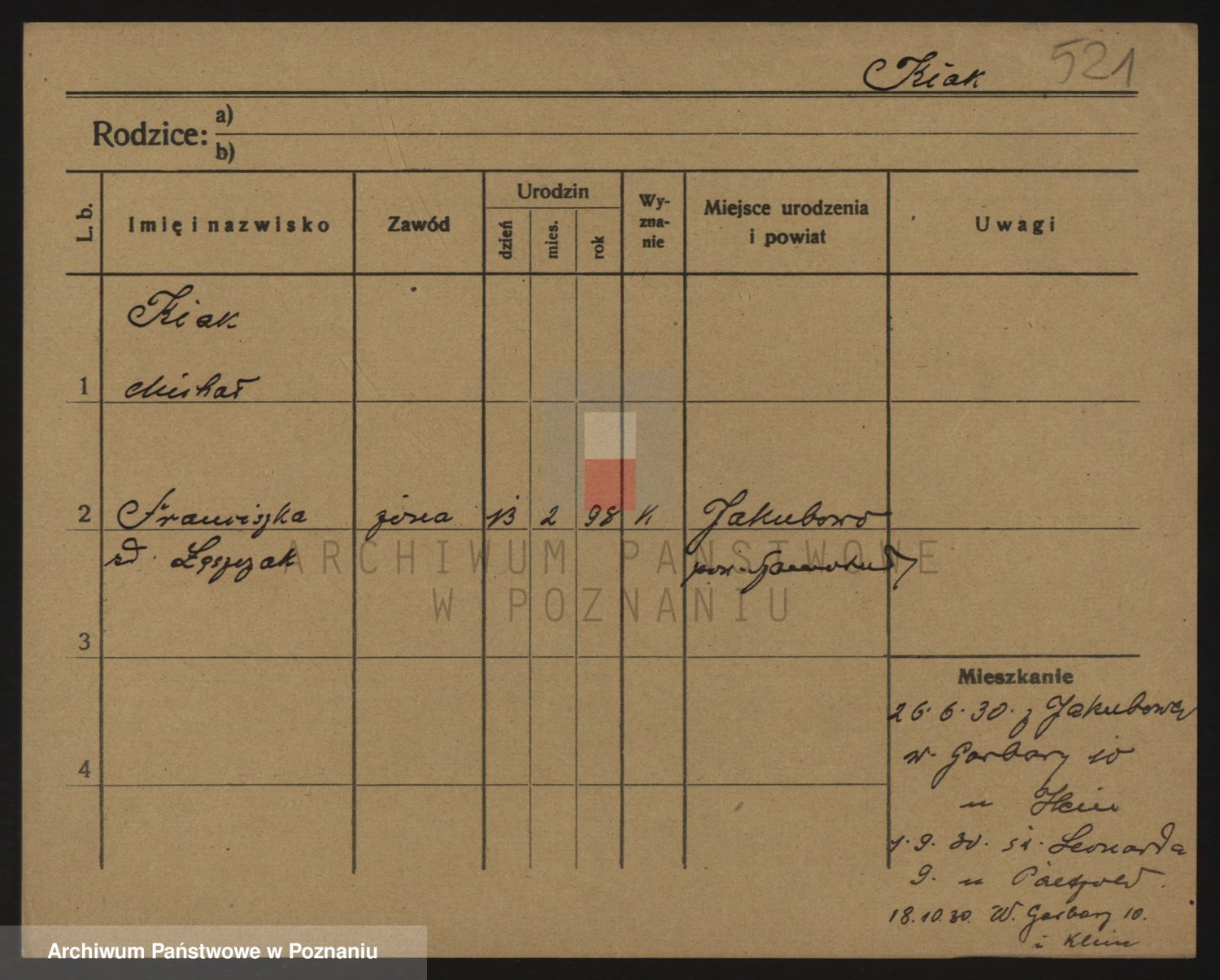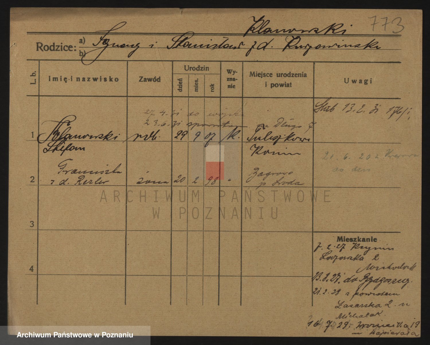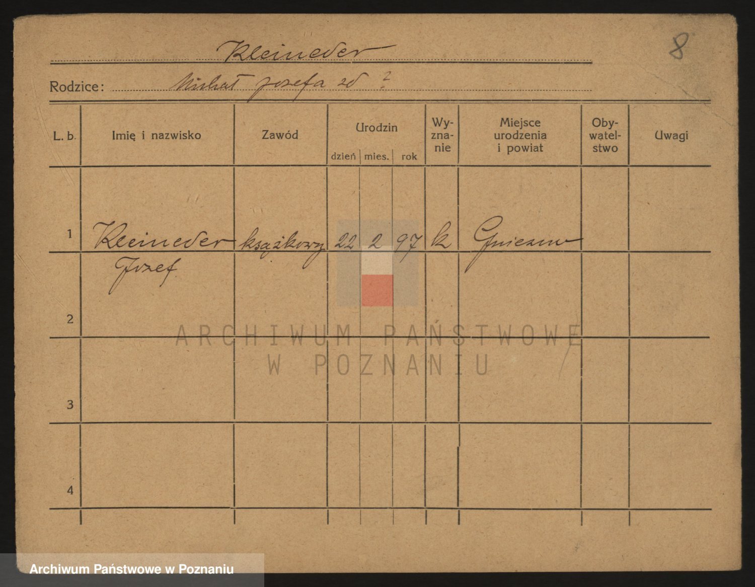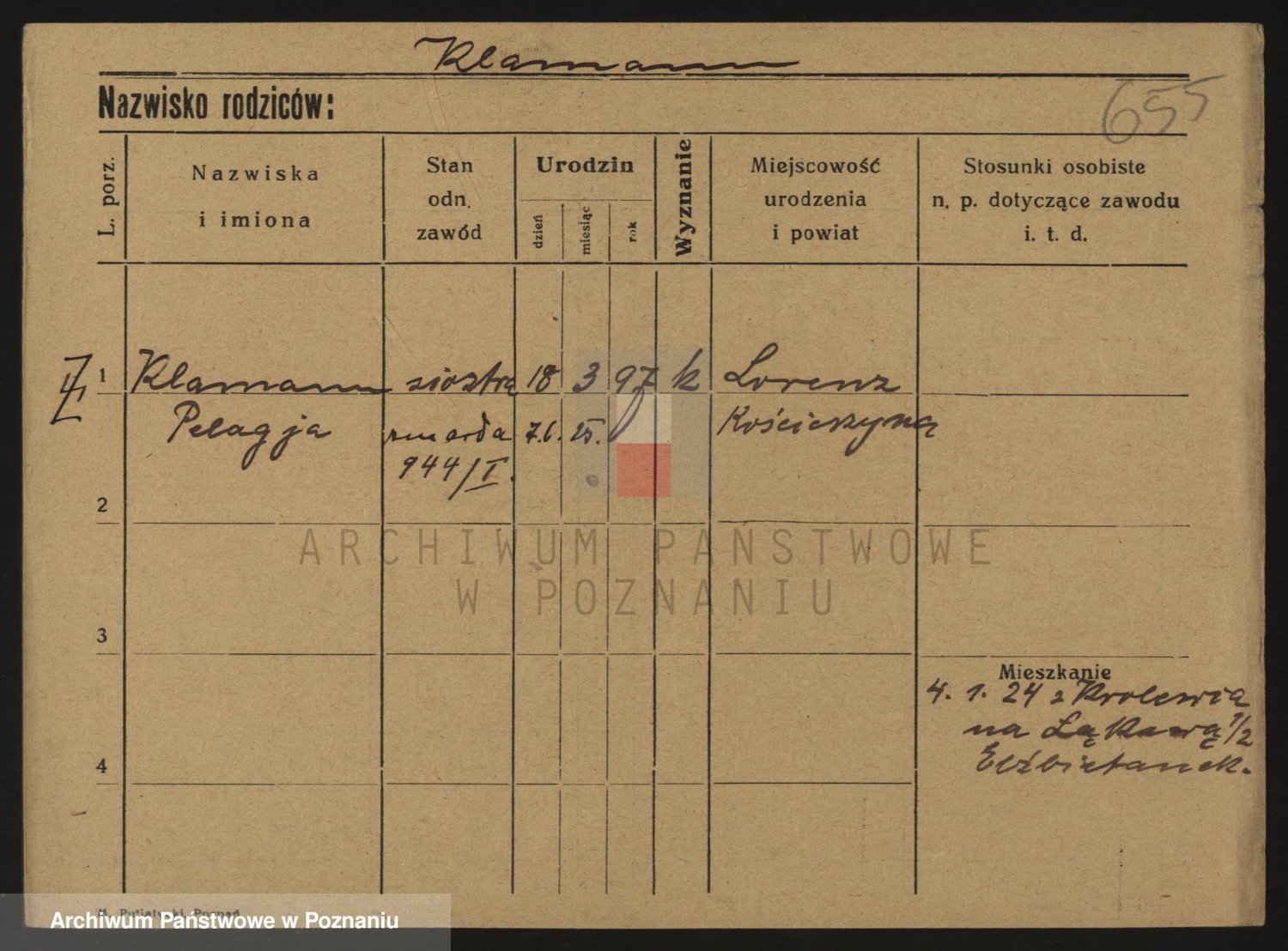Podgląd karty osobowej dostępny jest po kliknięciu na nazwisko lub ikonkę karty. Można dokonywać powiększenia (ikony na górze) lub przechodzić między kolejnymi skanami (strzałki po bokach).