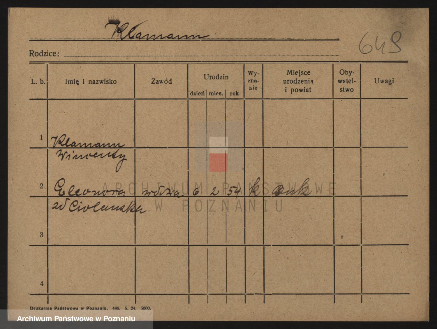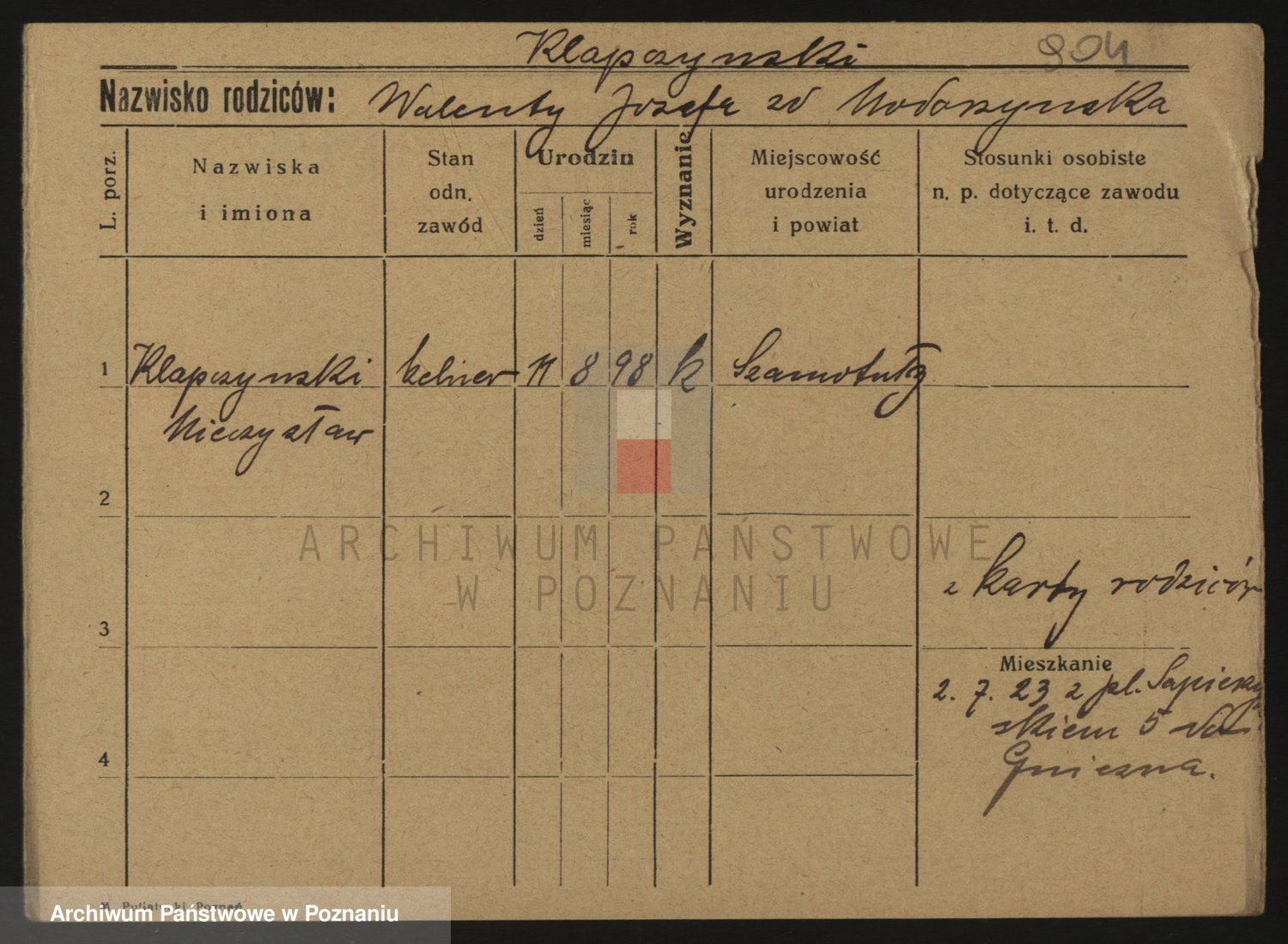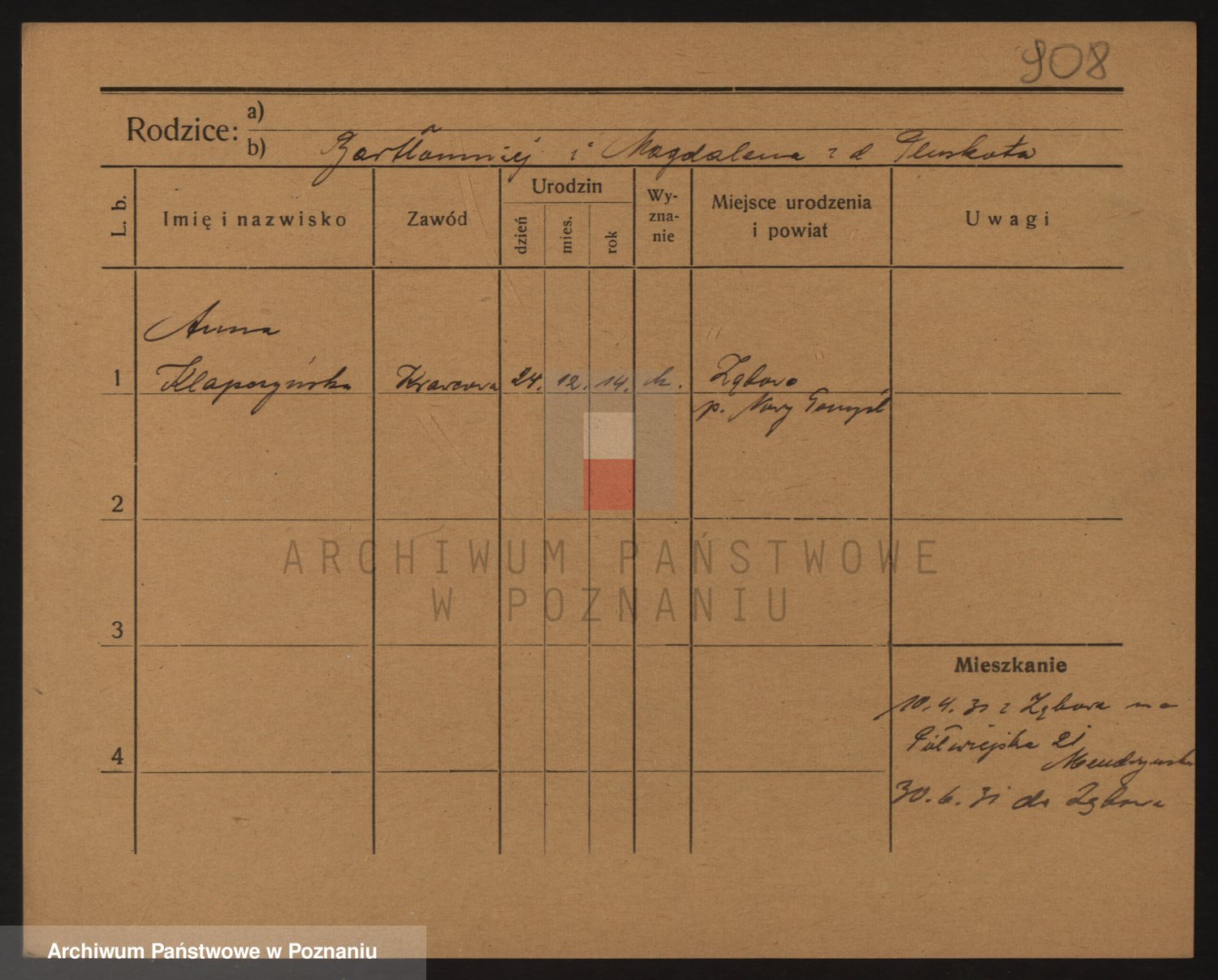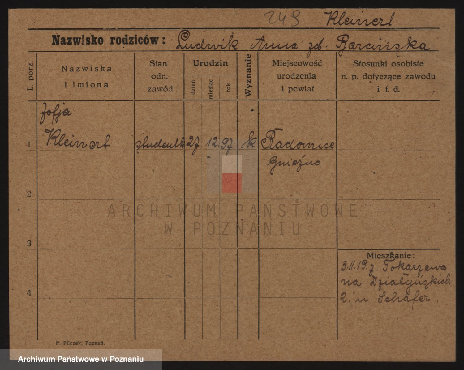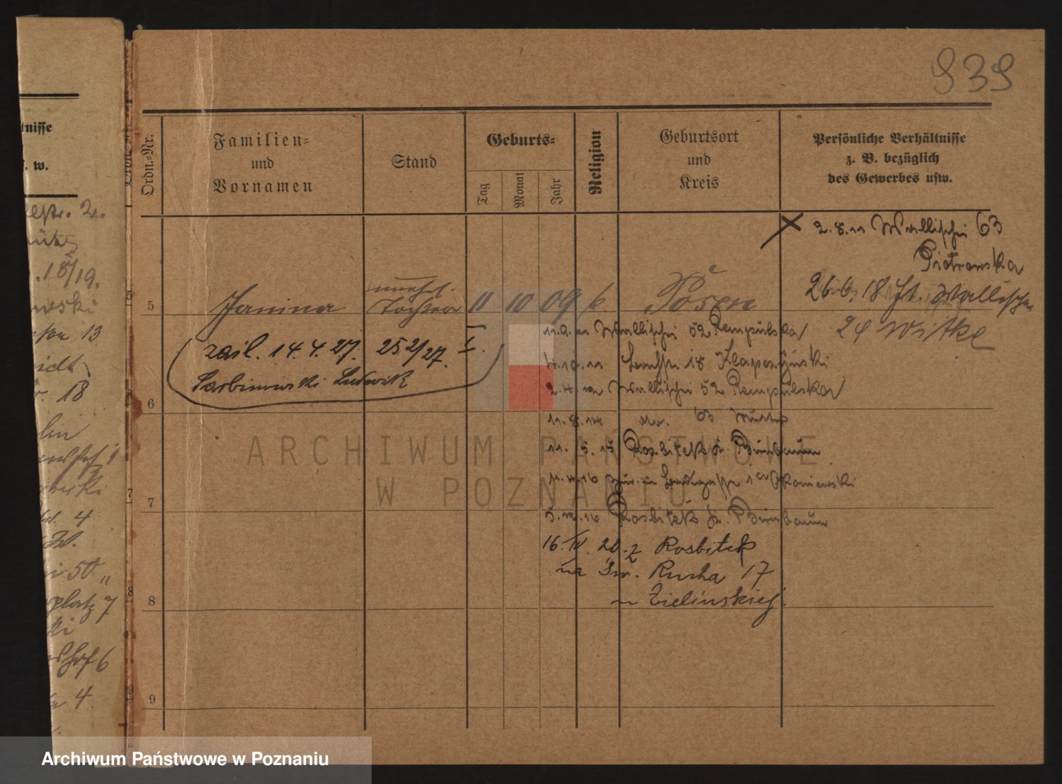 Podgląd karty osobowej dostępny jest po kliknięciu na nazwisko lub ikonkę karty. Można dokonywać powiększenia (ikony na górze) lub przechodzić między kolejnymi skanami (strzałki po bokach).