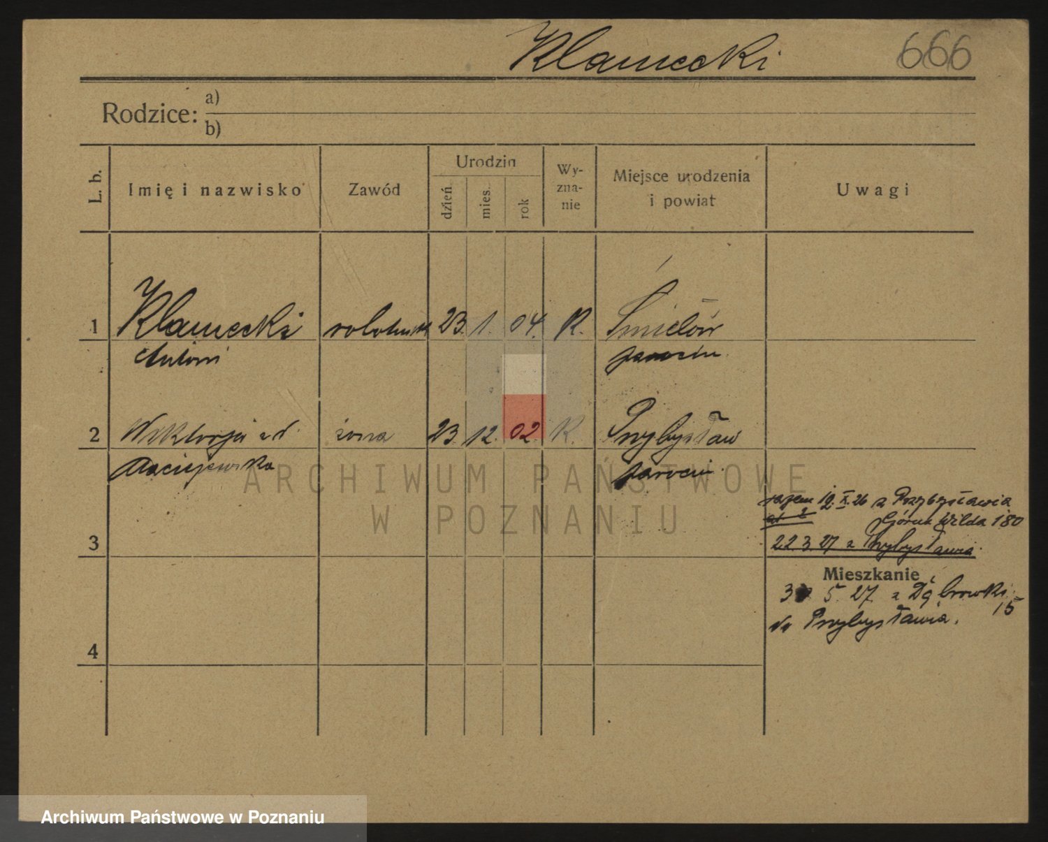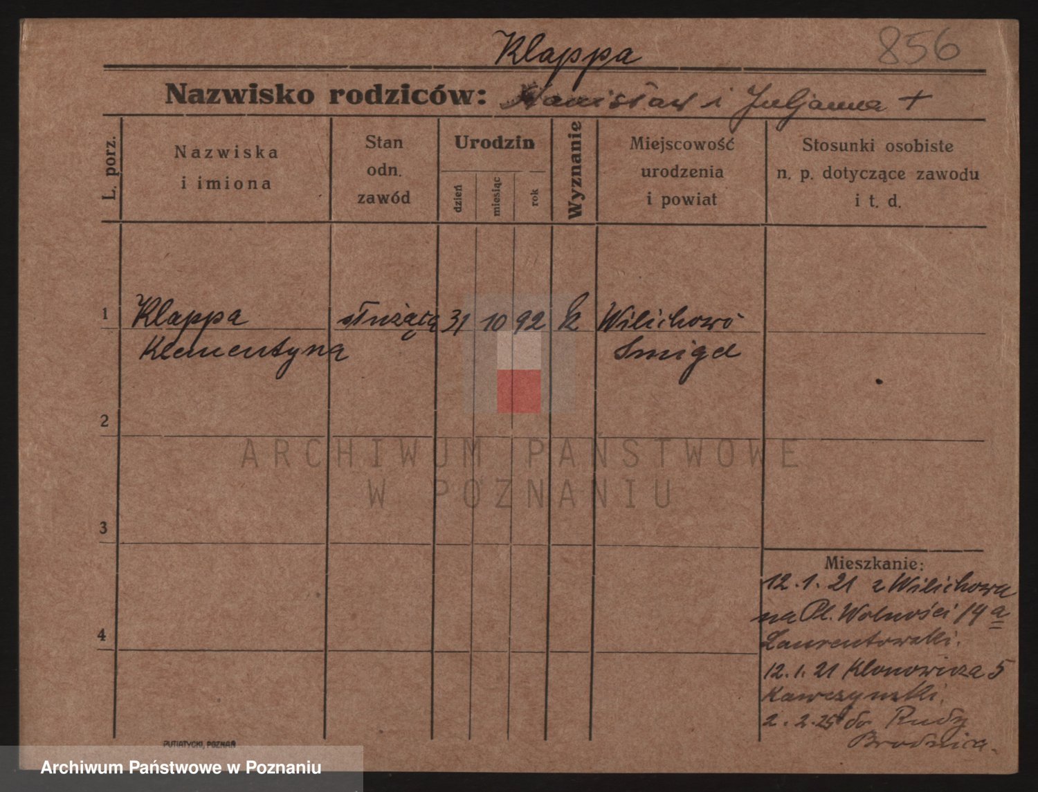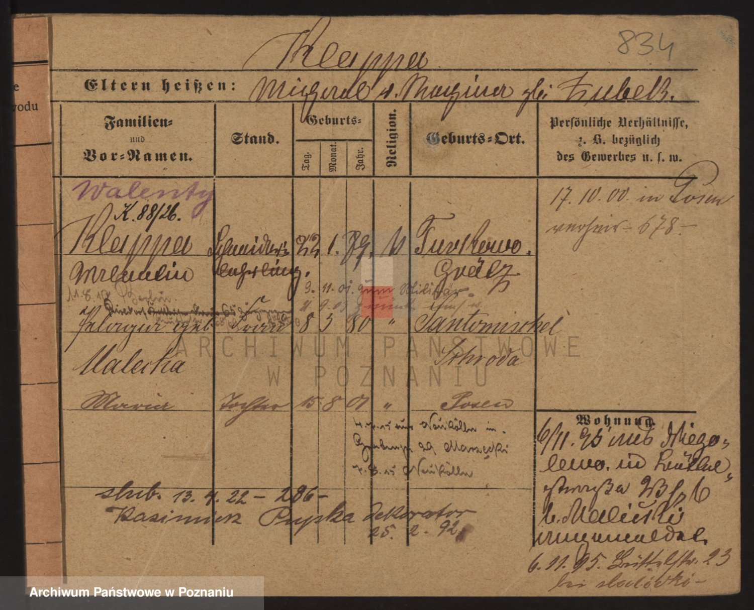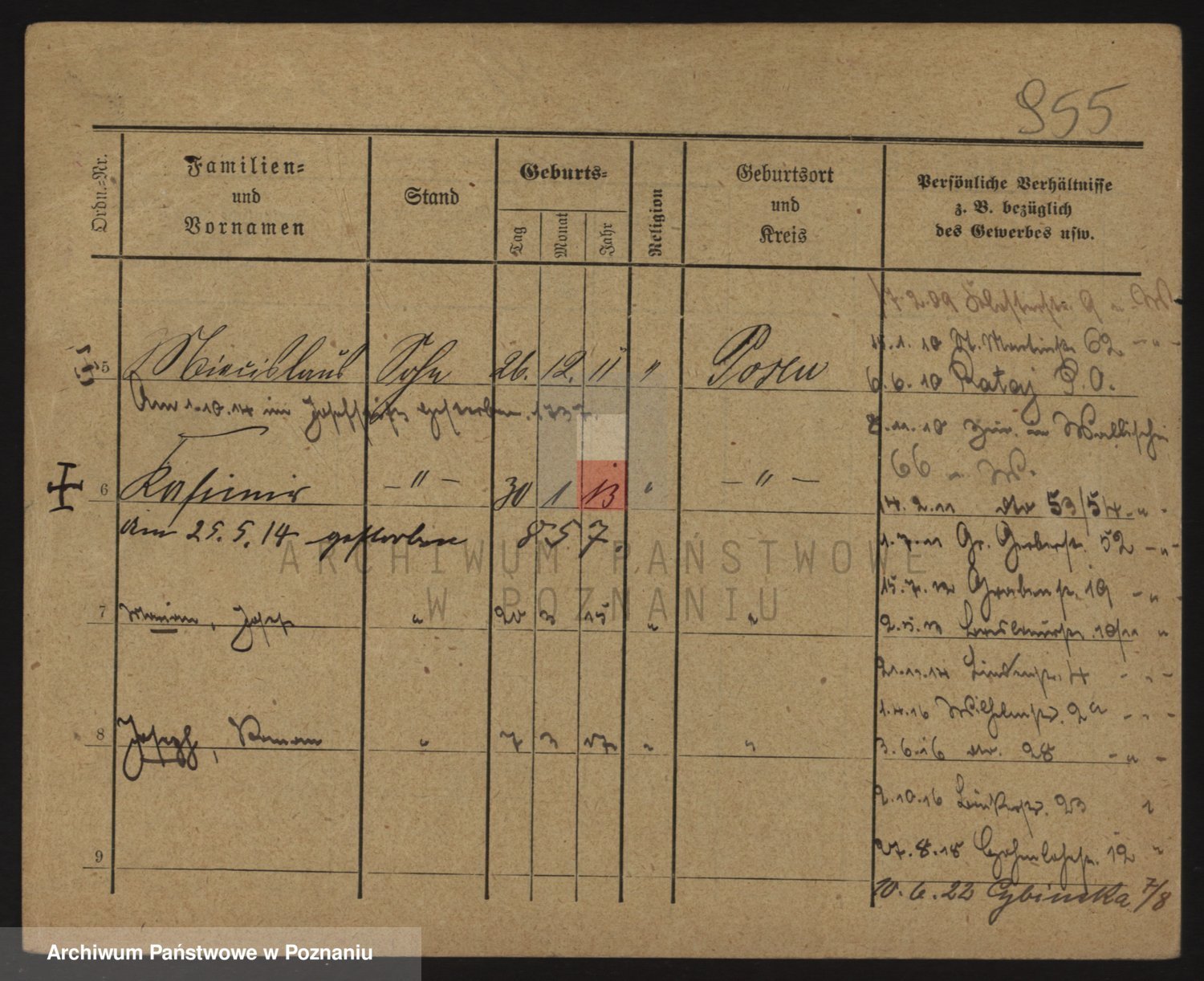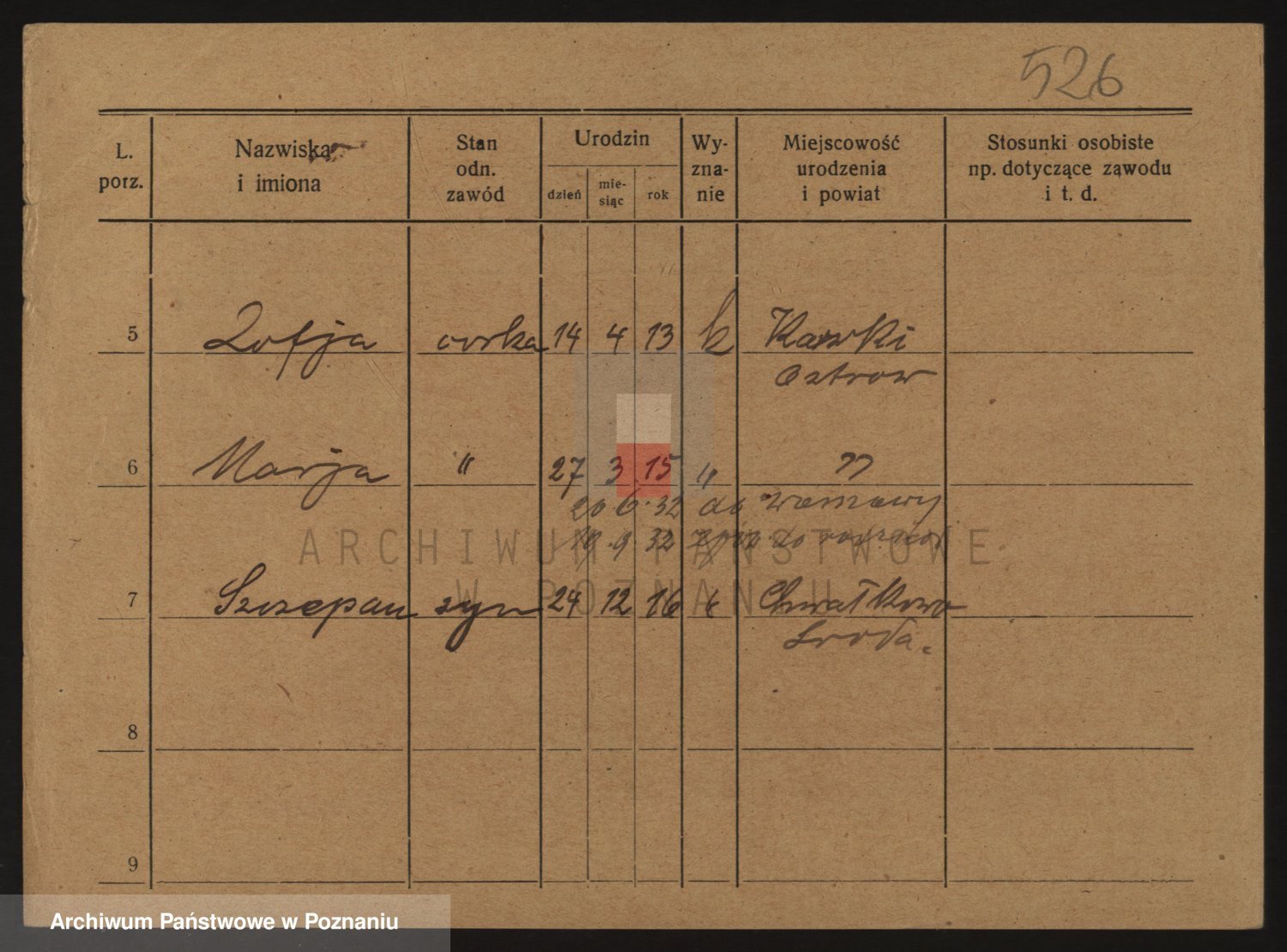 Podgląd karty osobowej dostępny jest po kliknięciu na nazwisko lub ikonkę karty. Można dokonywać powiększenia (ikony na górze) lub przechodzić między kolejnymi skanami (strzałki po bokach).