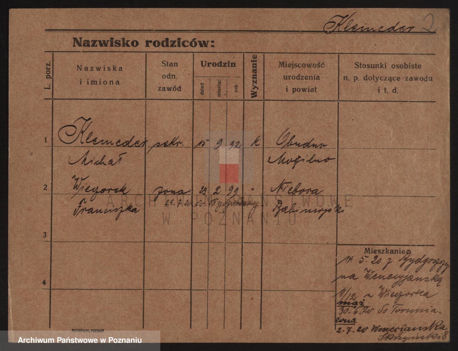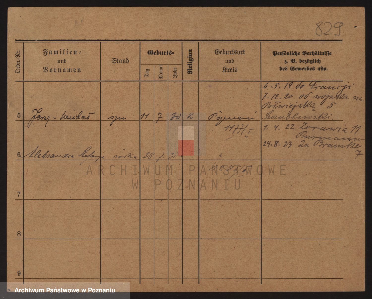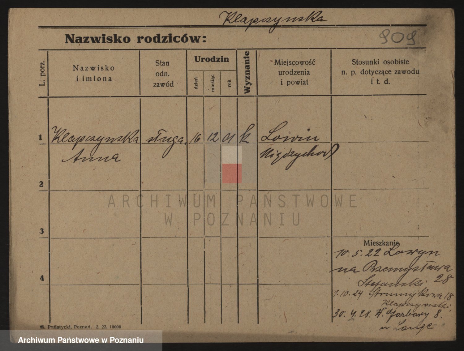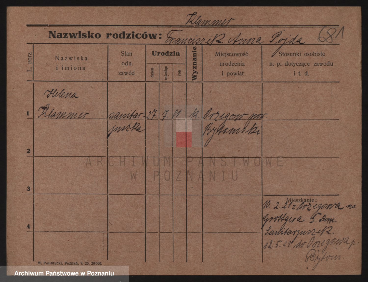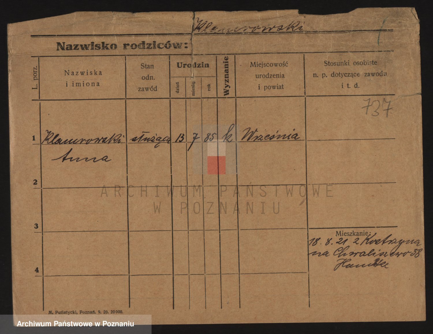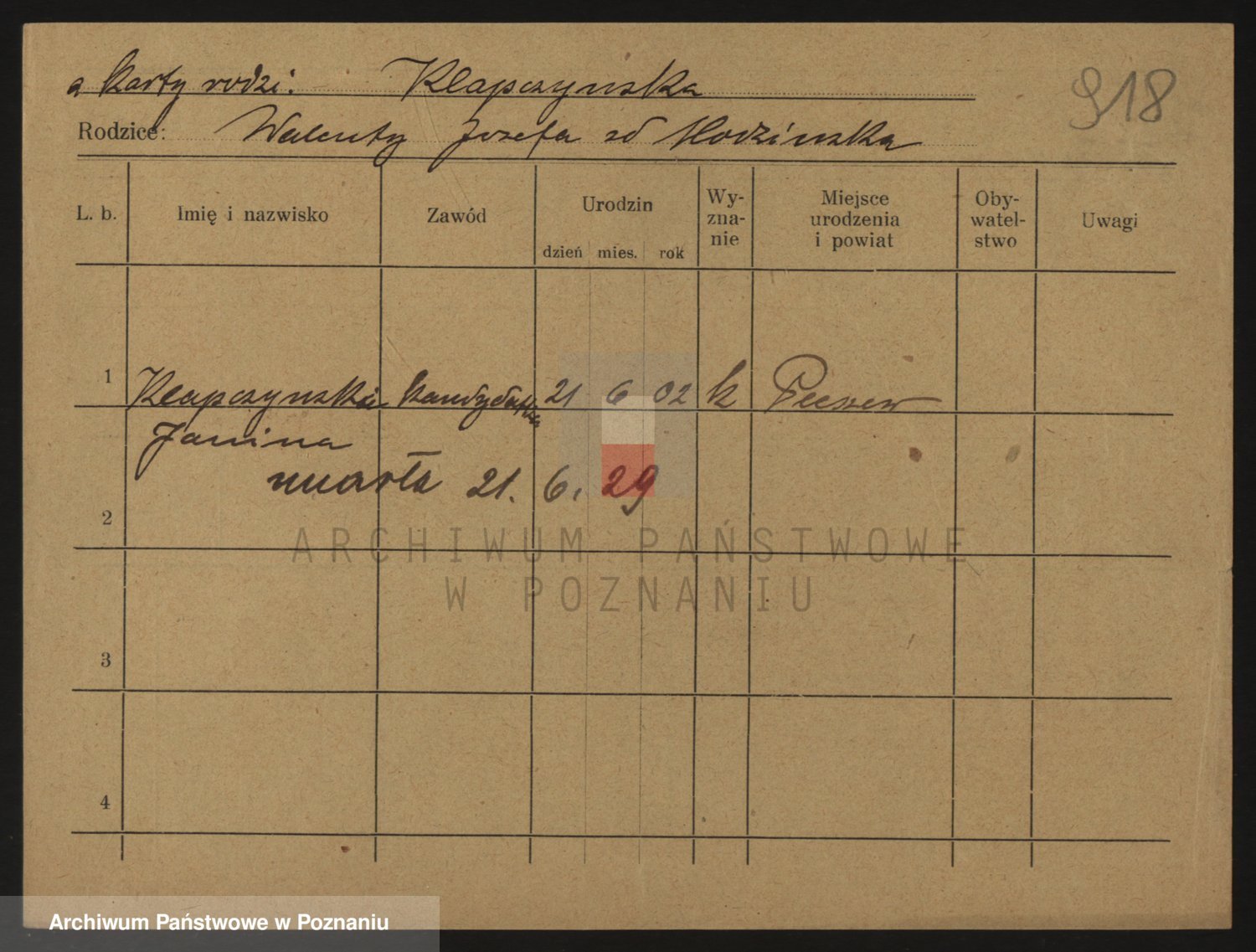 Podgląd karty osobowej dostępny jest po kliknięciu na nazwisko lub ikonkę karty. Można dokonywać powiększenia (ikony na górze) lub przechodzić między kolejnymi skanami (strzałki po bokach).