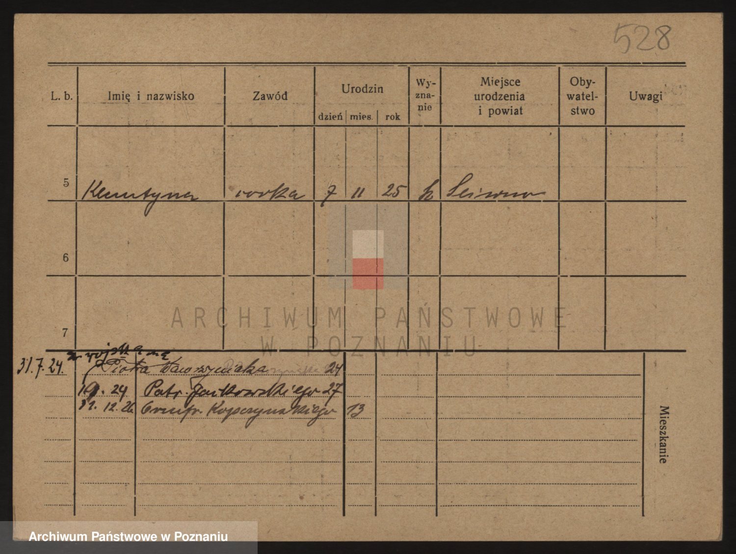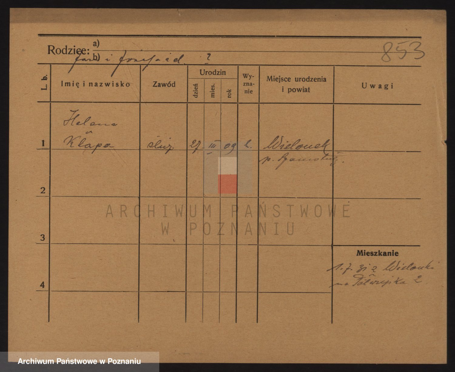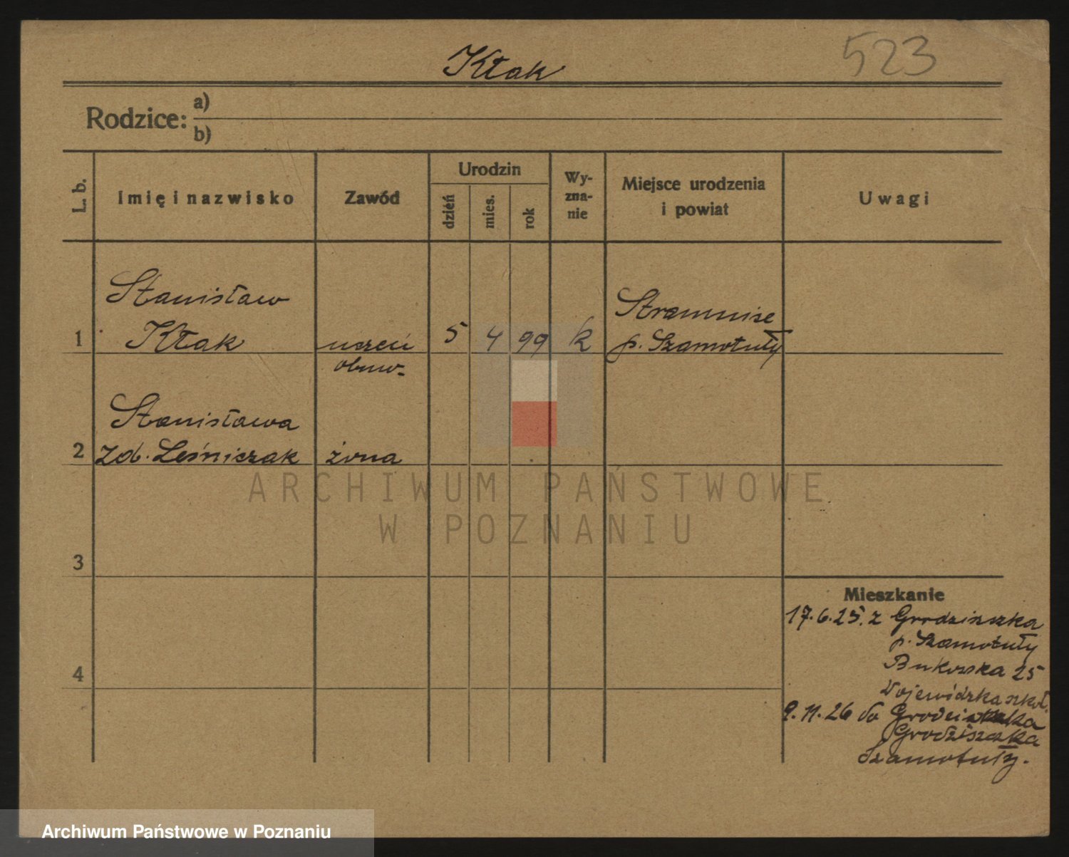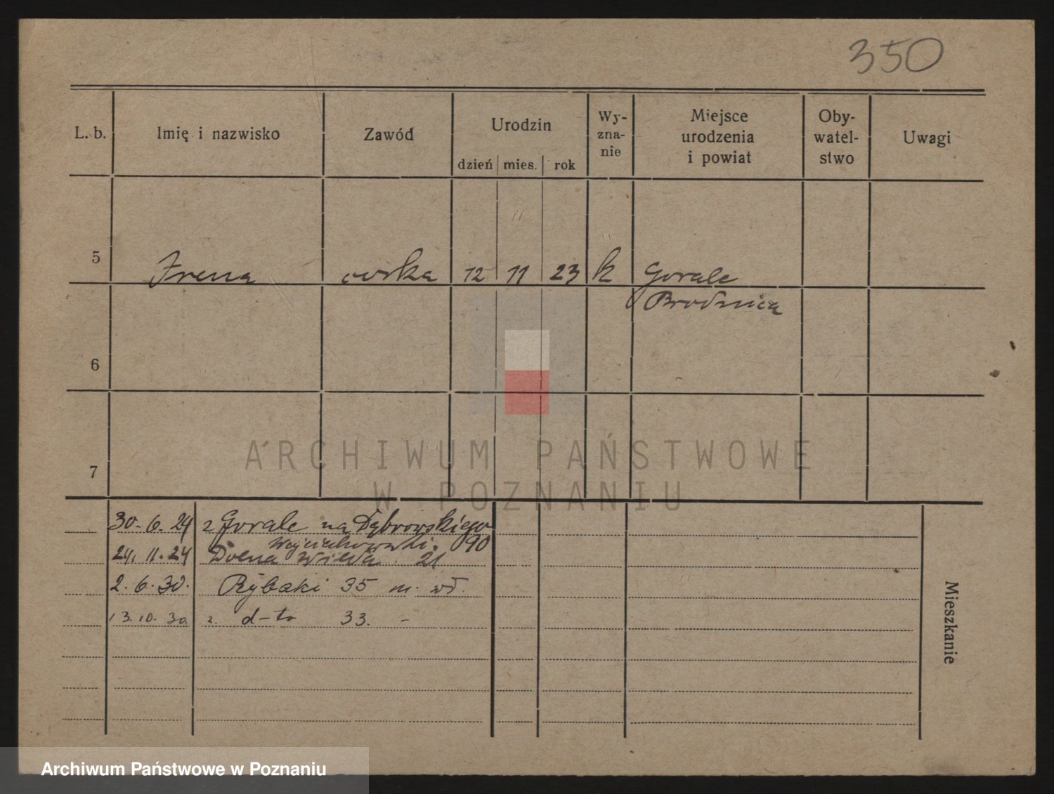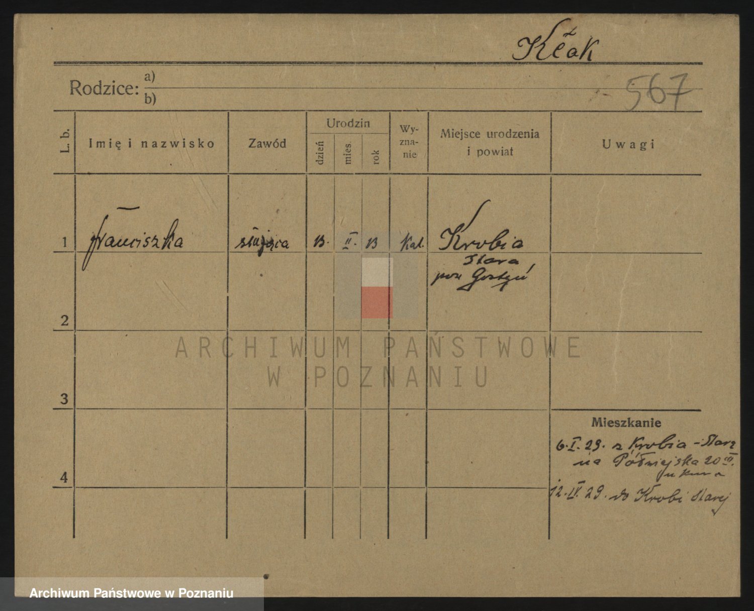 Podgląd karty osobowej dostępny jest po kliknięciu na nazwisko lub ikonkę karty. Można dokonywać powiększenia (ikony na górze) lub przechodzić między kolejnymi skanami (strzałki po bokach).