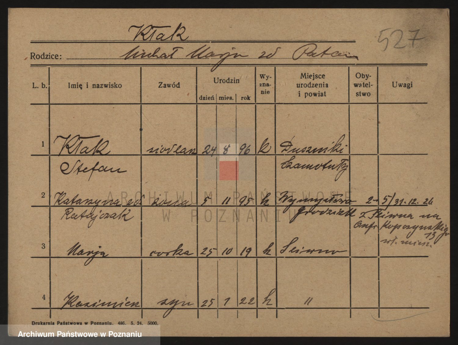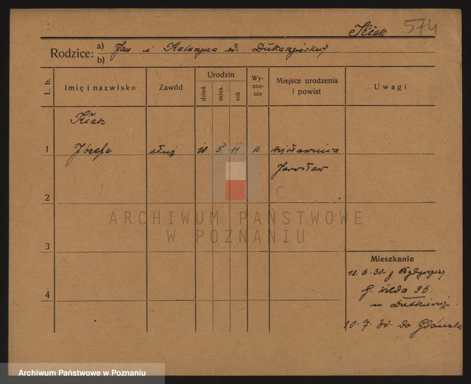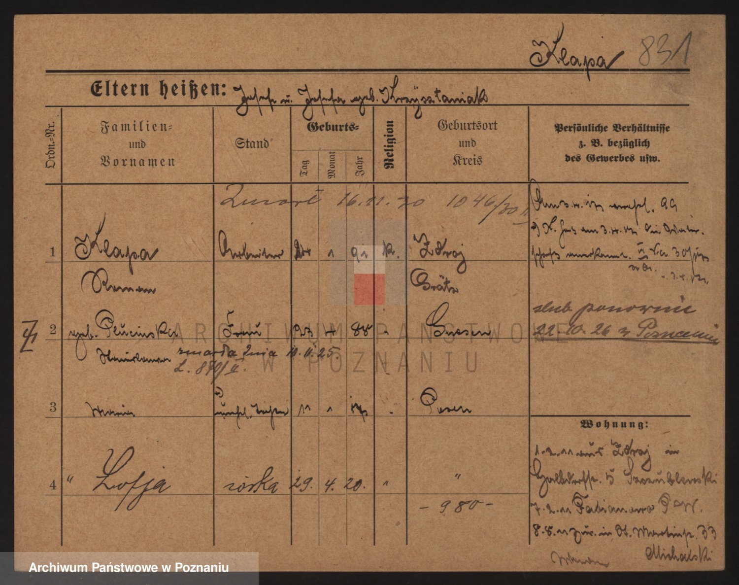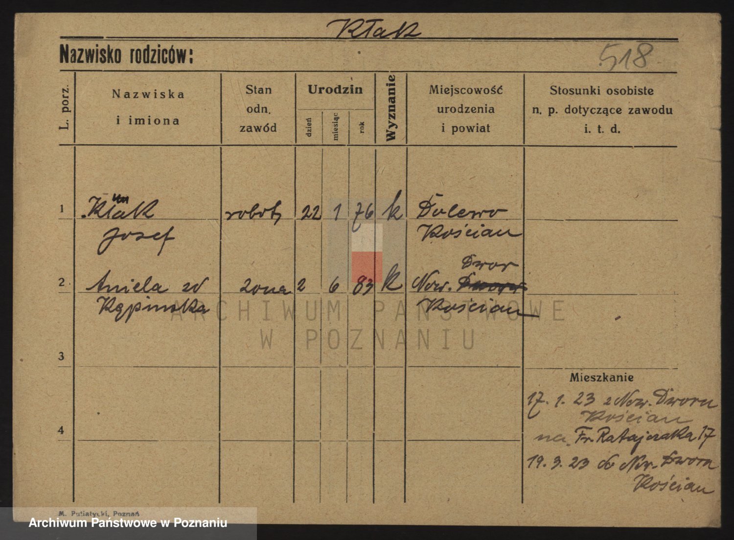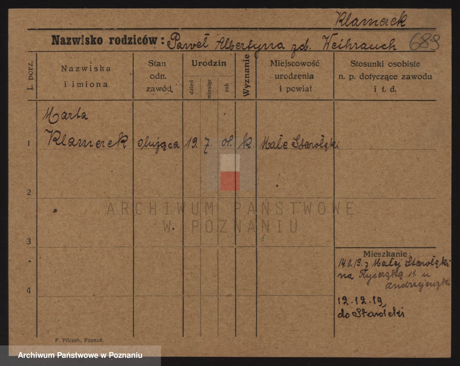 Podgląd karty osobowej dostępny jest po kliknięciu na nazwisko lub ikonkę karty. Można dokonywać powiększenia (ikony na górze) lub przechodzić między kolejnymi skanami (strzałki po bokach).