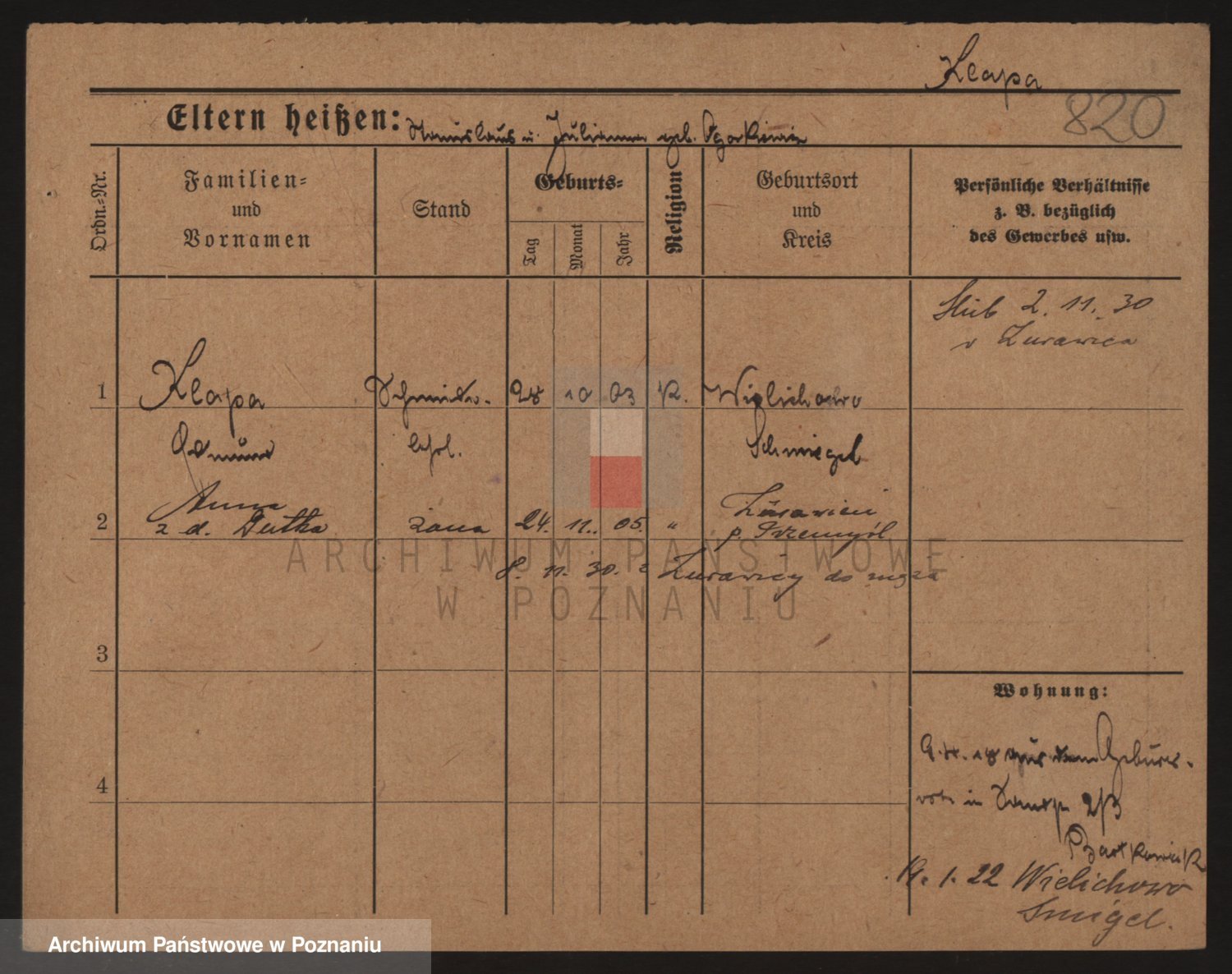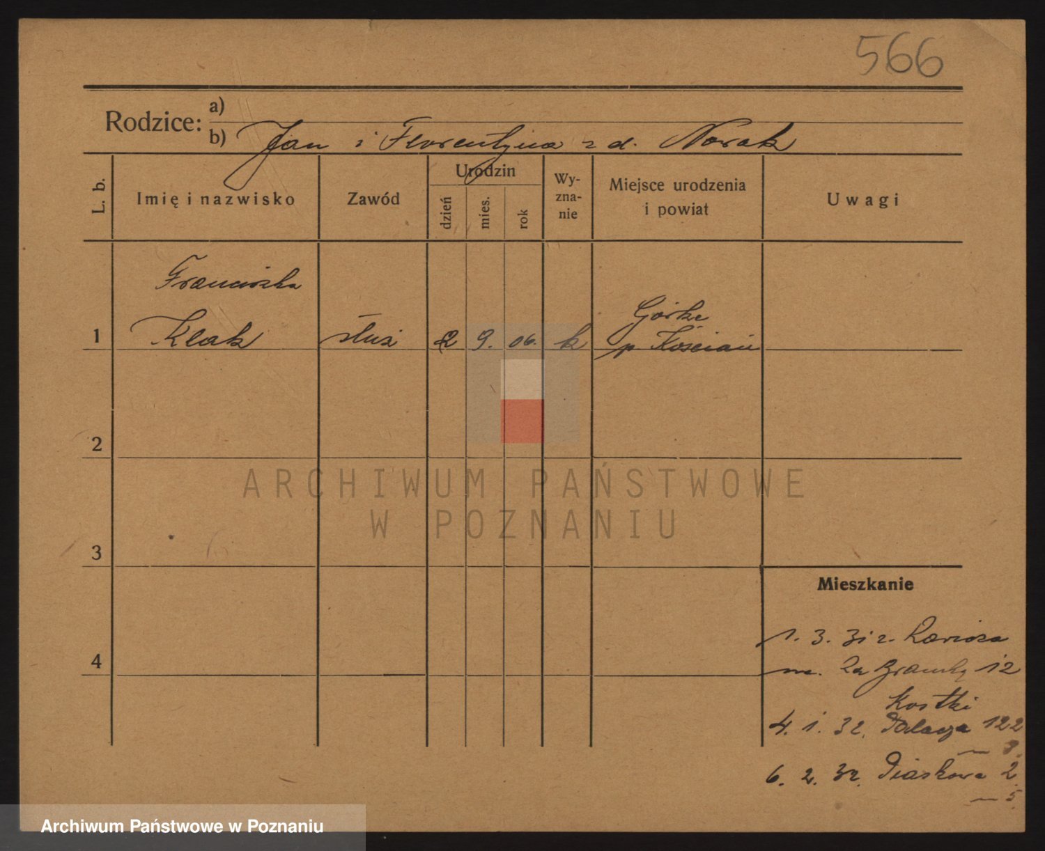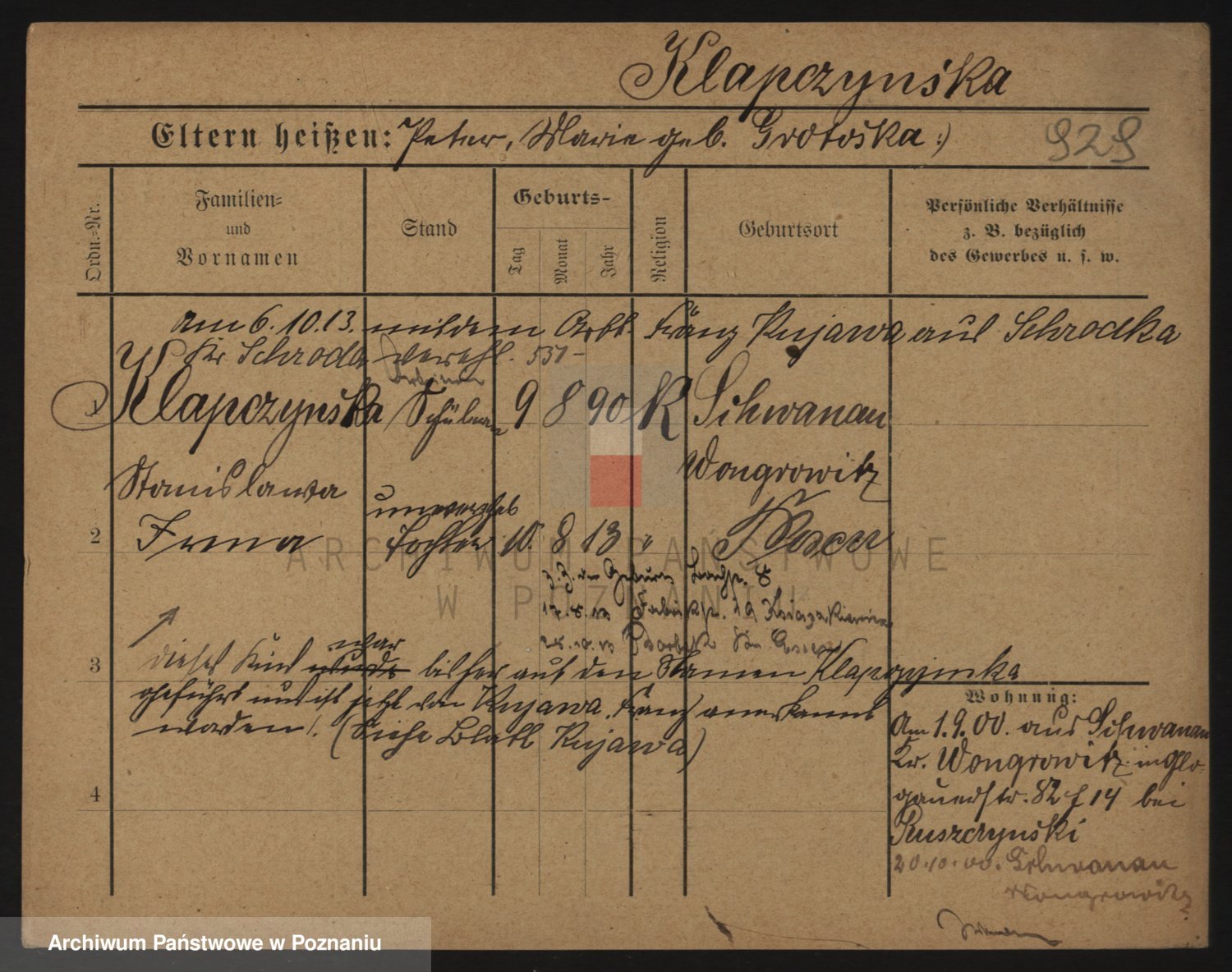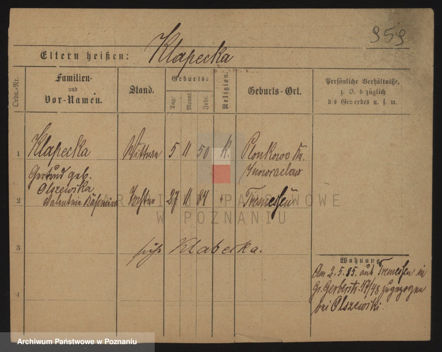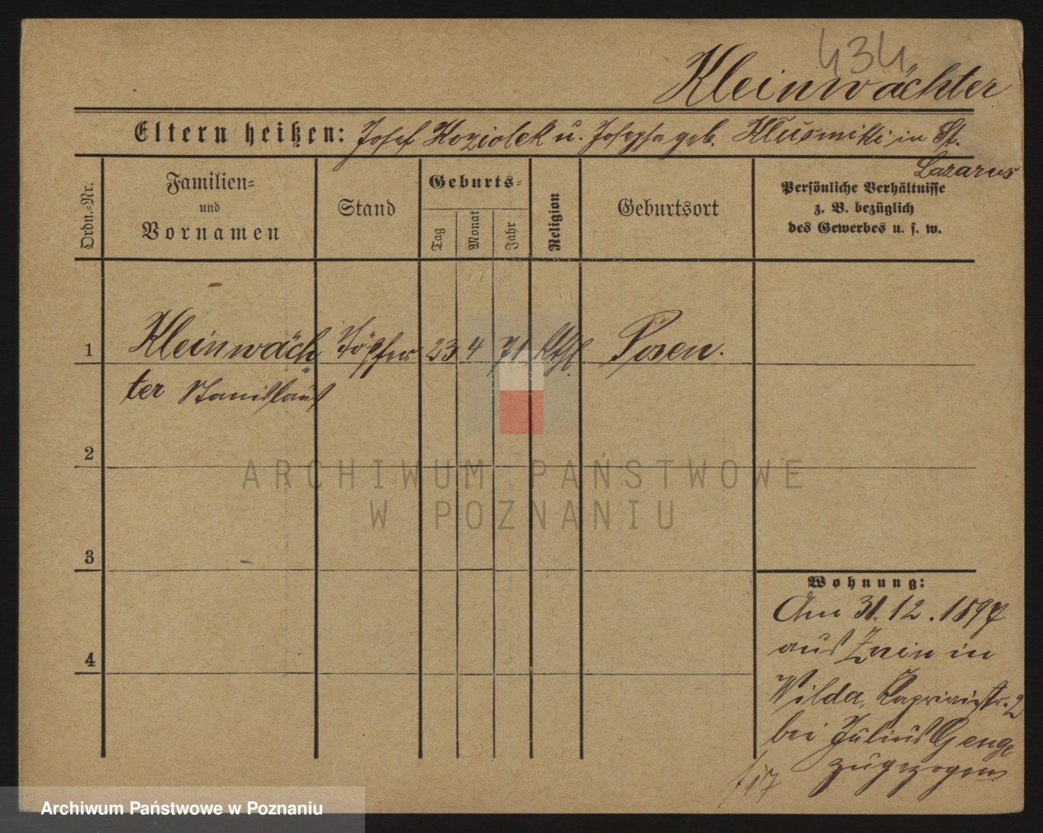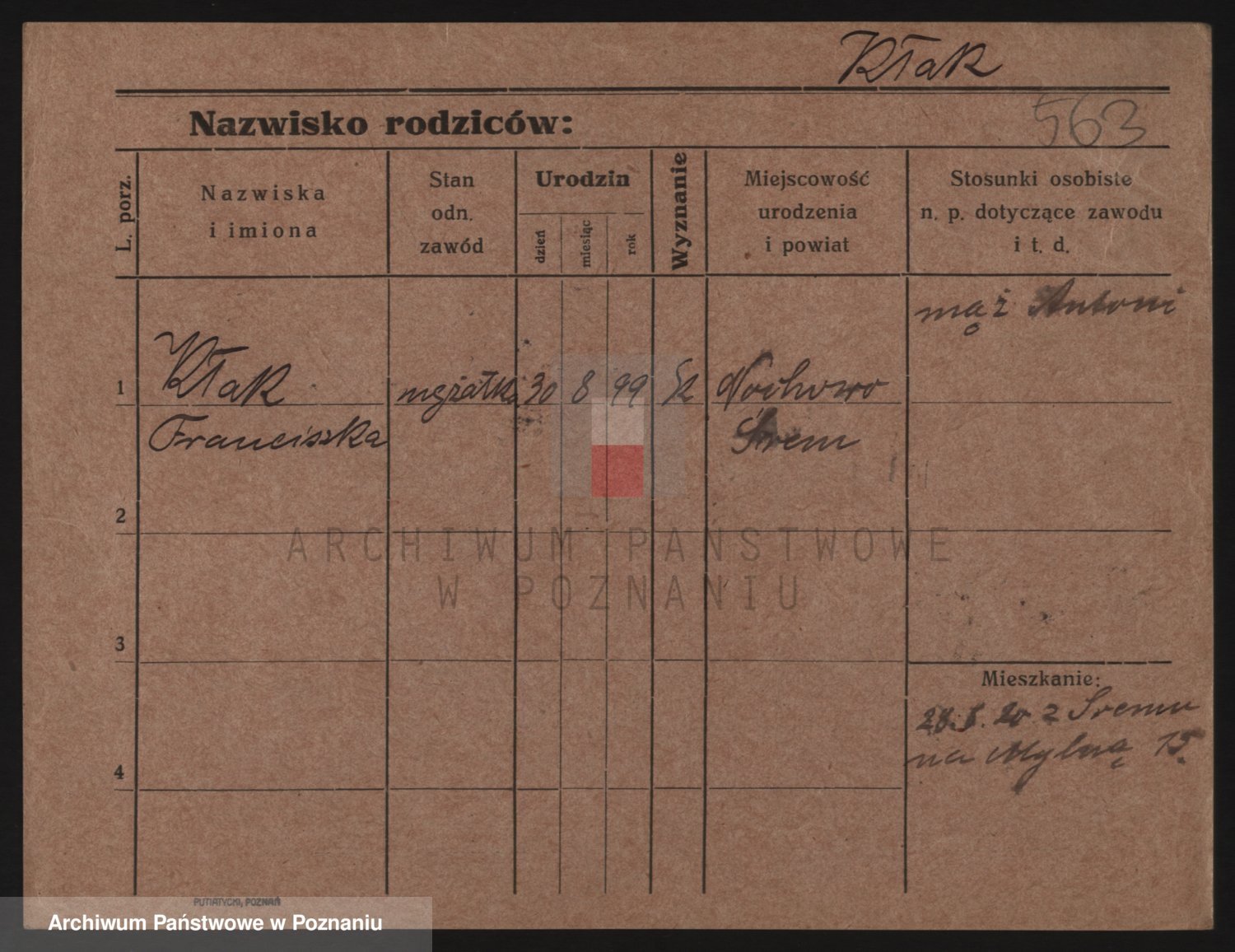Podgląd karty osobowej dostępny jest po kliknięciu na nazwisko lub ikonkę karty. Można dokonywać powiększenia (ikony na górze) lub przechodzić między kolejnymi skanami (strzałki po bokach).