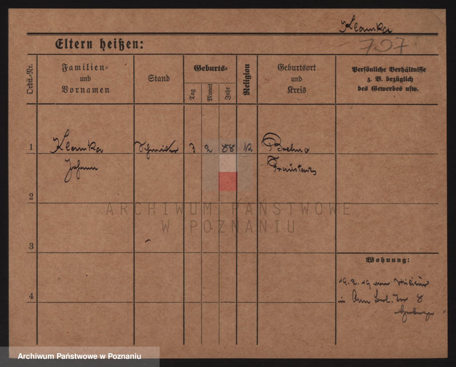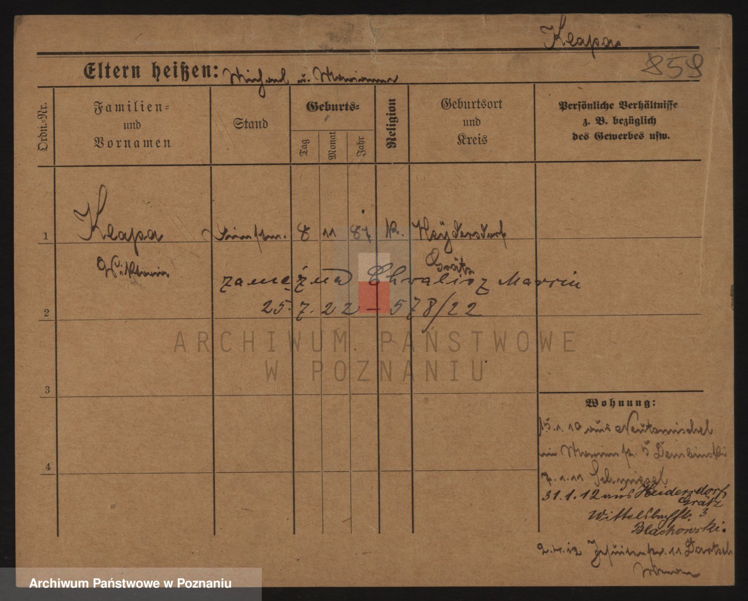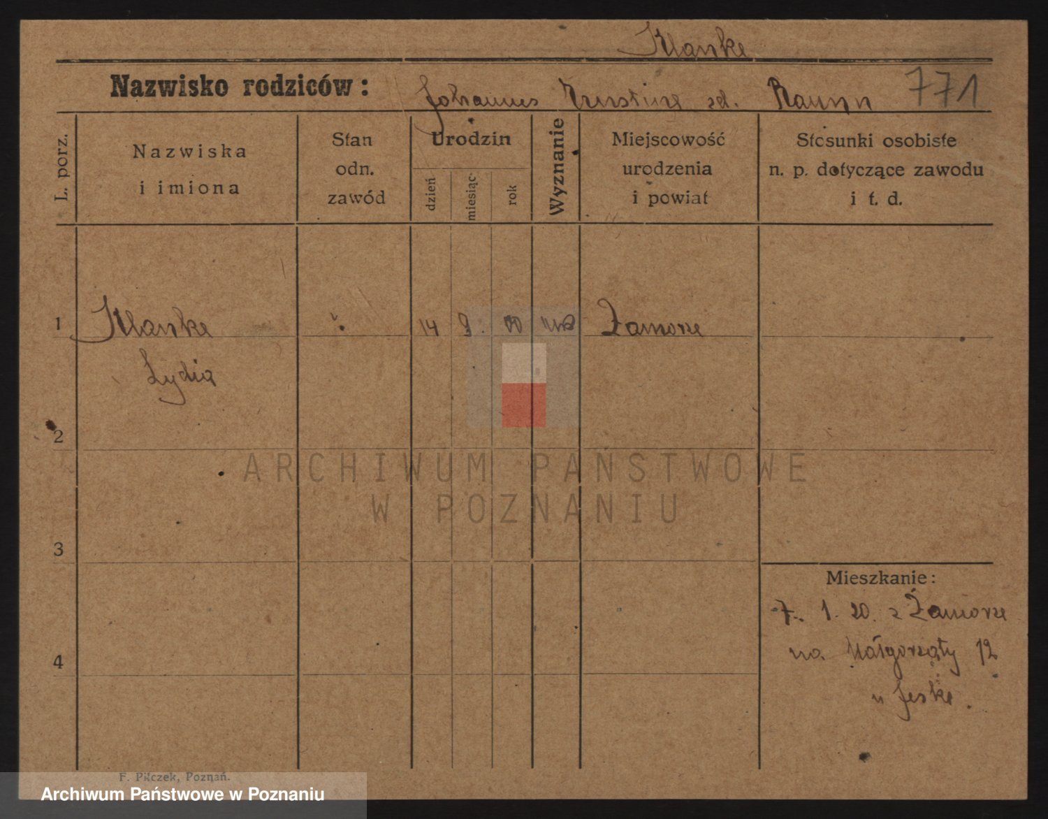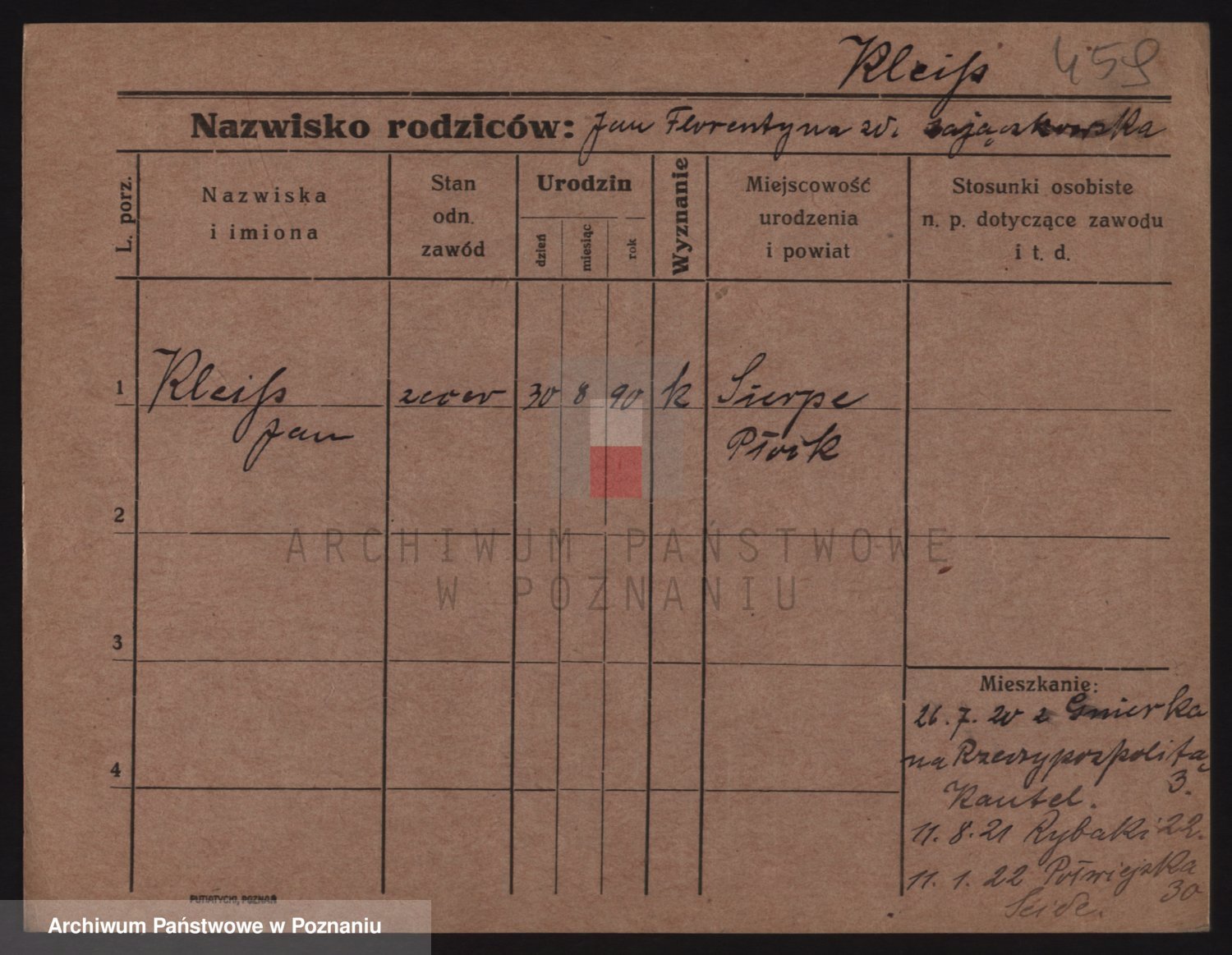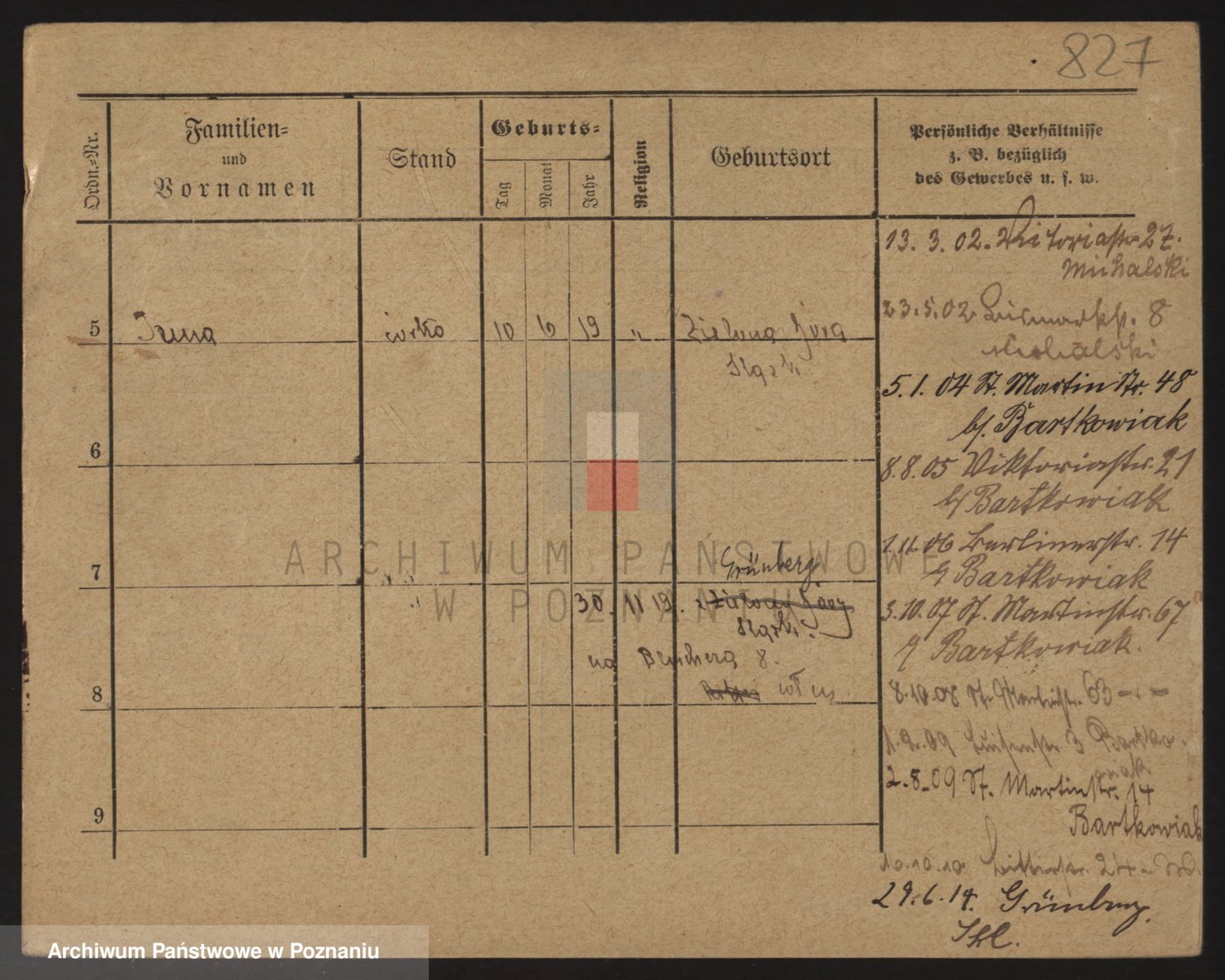 Podgląd karty osobowej dostępny jest po kliknięciu na nazwisko lub ikonkę karty. Można dokonywać powiększenia (ikony na górze) lub przechodzić między kolejnymi skanami (strzałki po bokach).