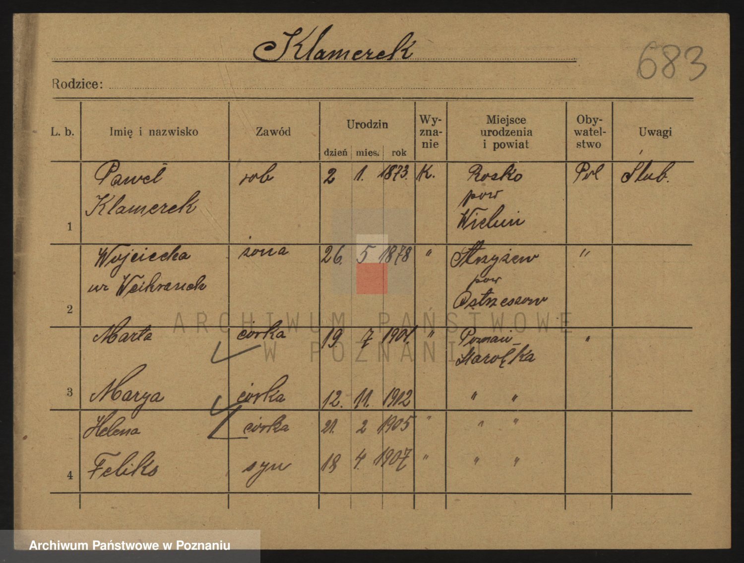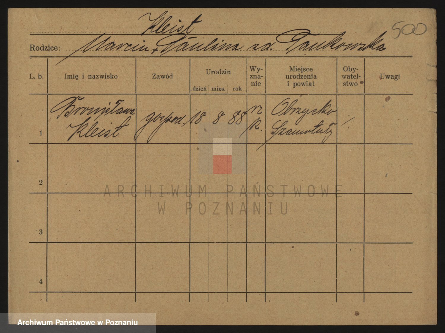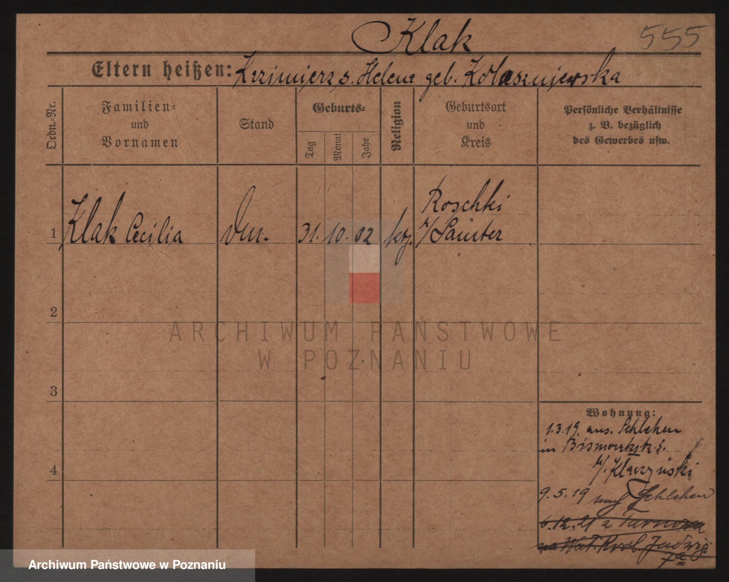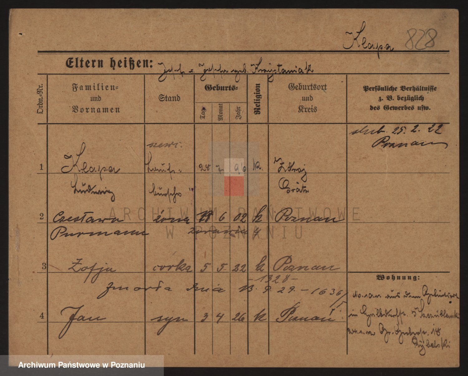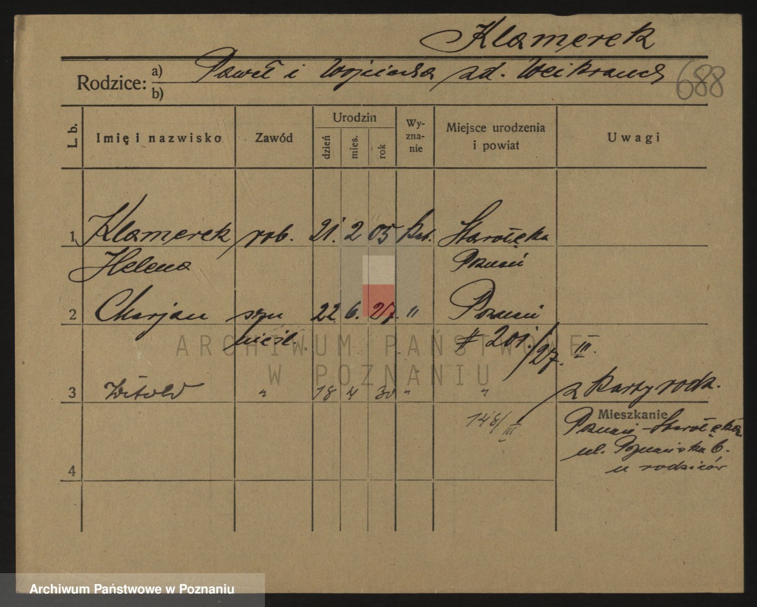 Podgląd karty osobowej dostępny jest po kliknięciu na nazwisko lub ikonkę karty. Można dokonywać powiększenia (ikony na górze) lub przechodzić między kolejnymi skanami (strzałki po bokach).