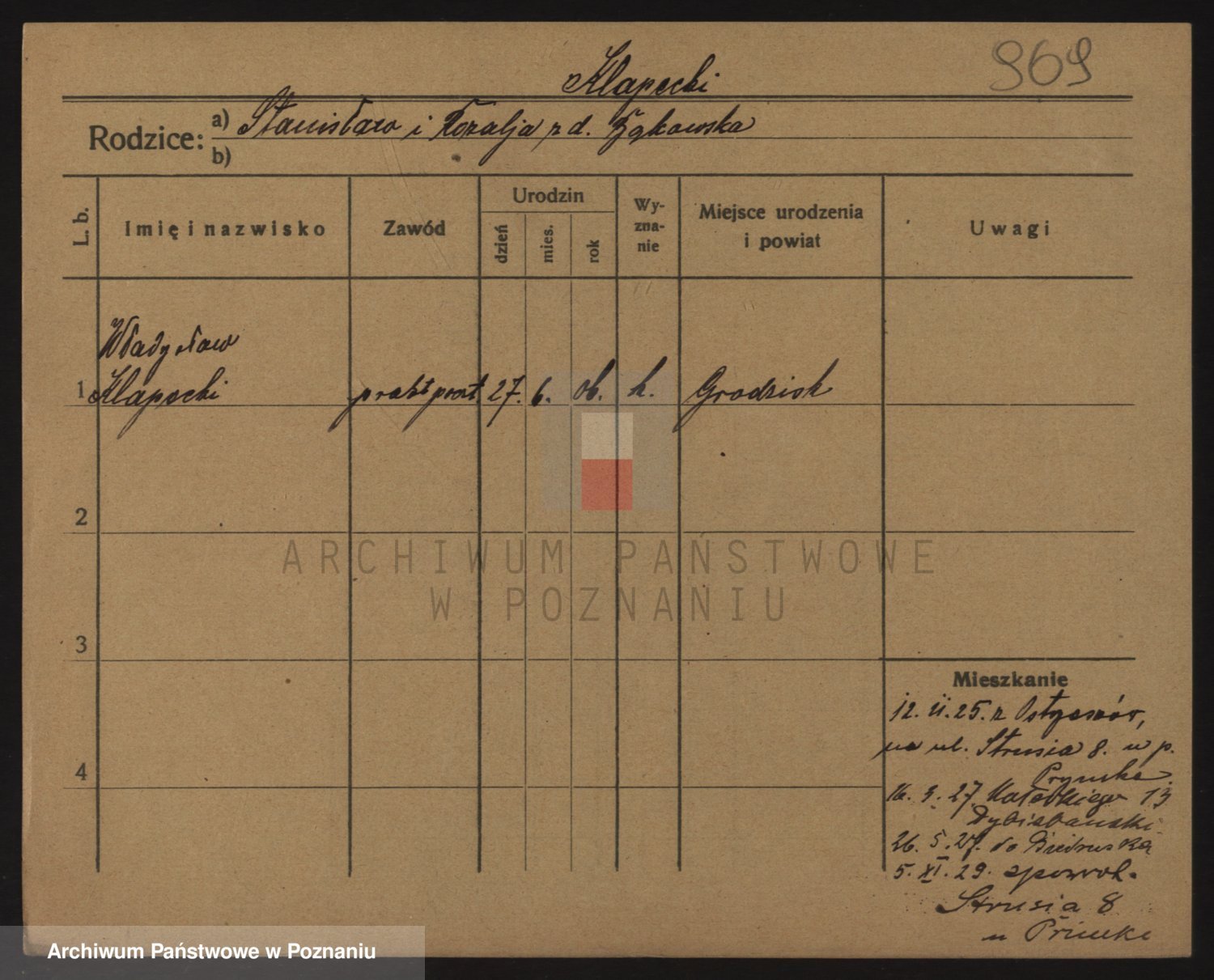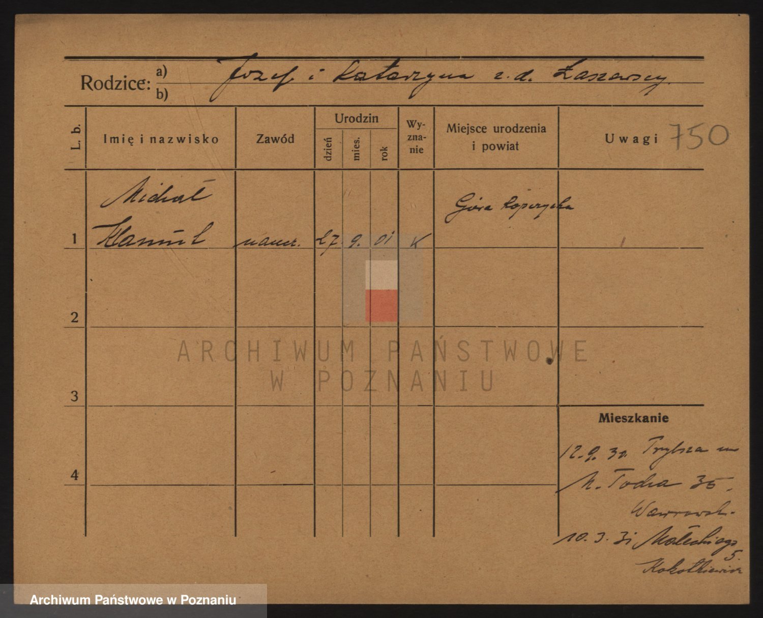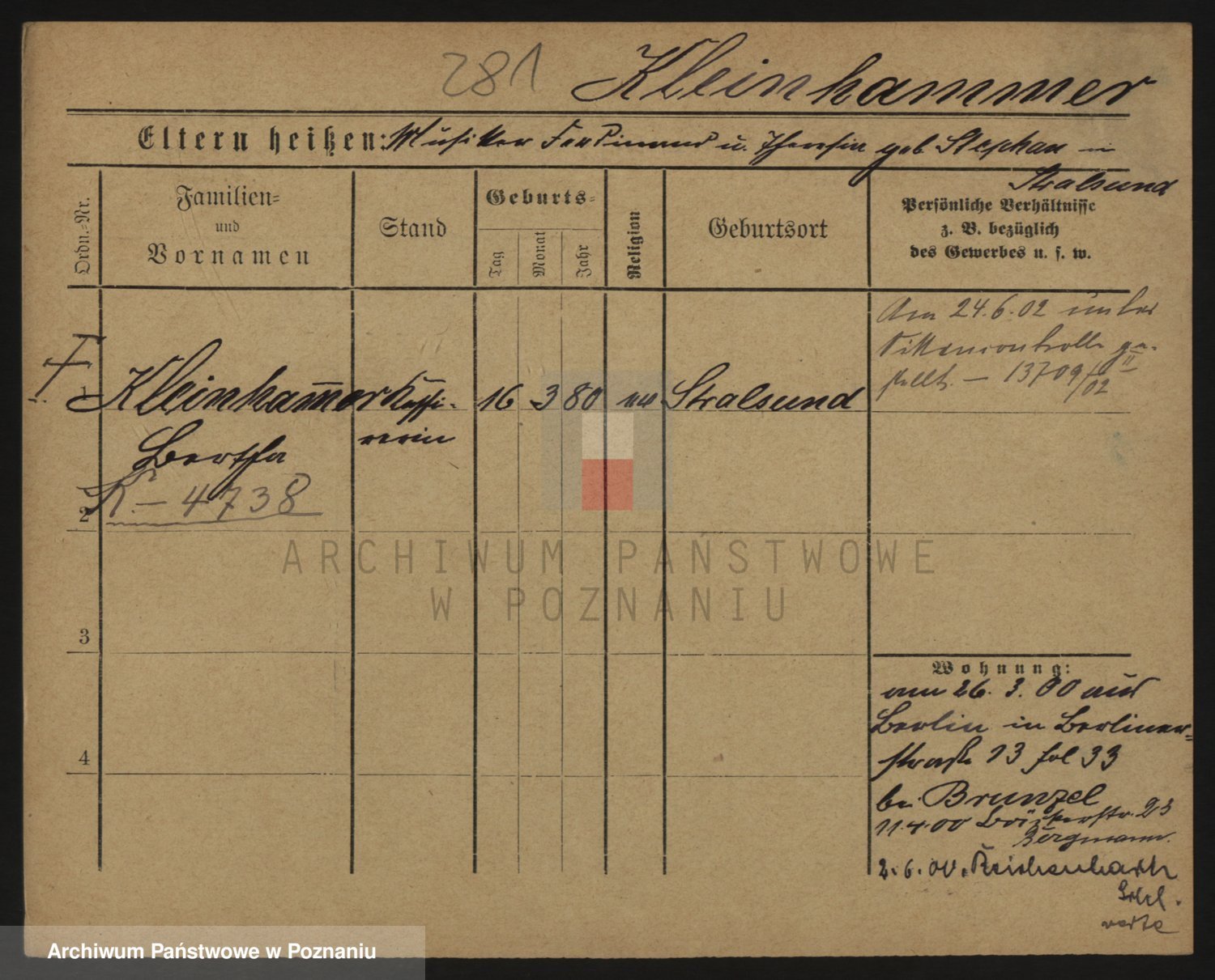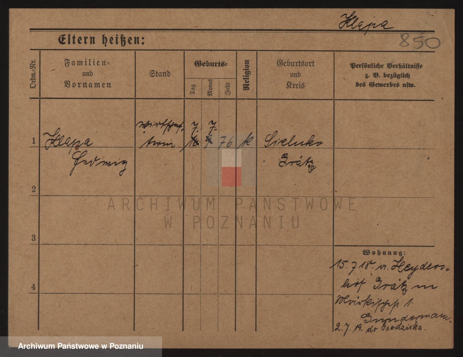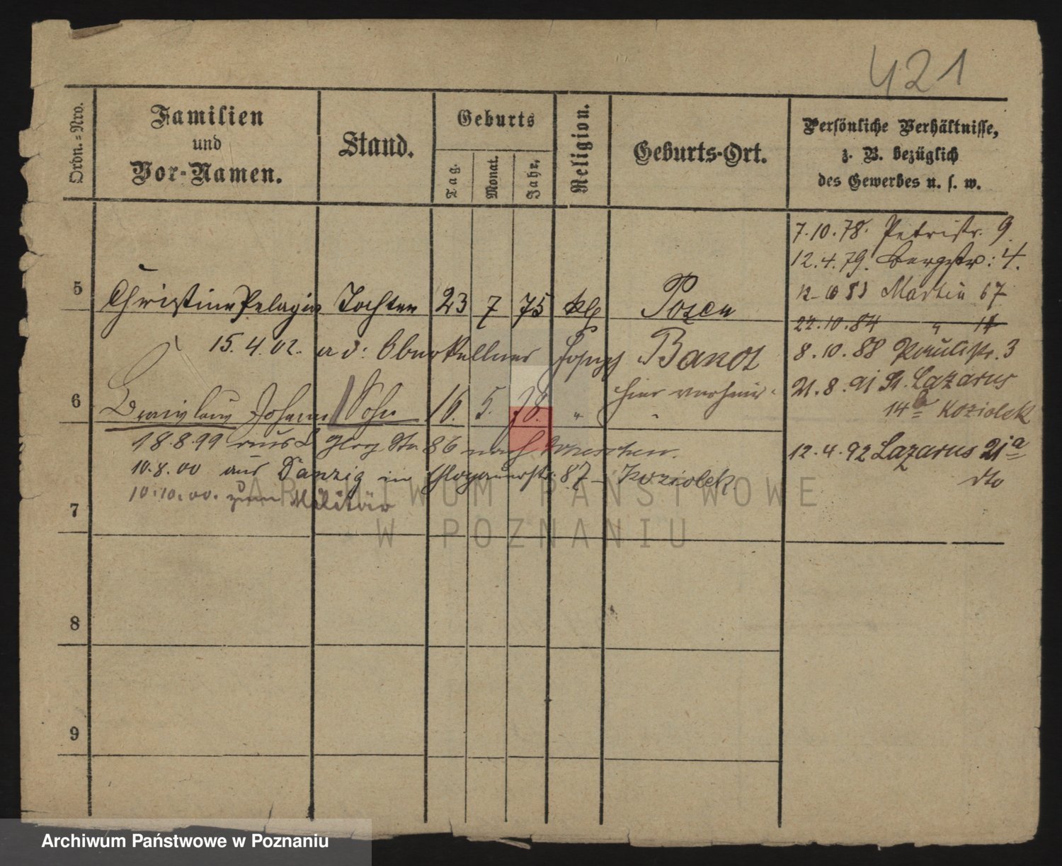 Podgląd karty osobowej dostępny jest po kliknięciu na nazwisko lub ikonkę karty. Można dokonywać powiększenia (ikony na górze) lub przechodzić między kolejnymi skanami (strzałki po bokach).