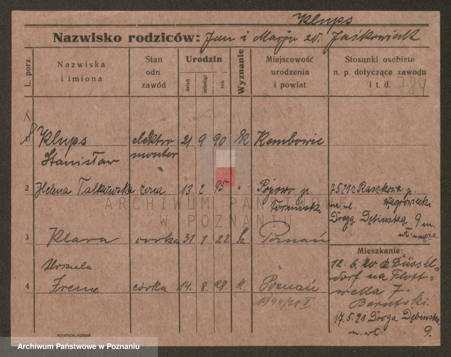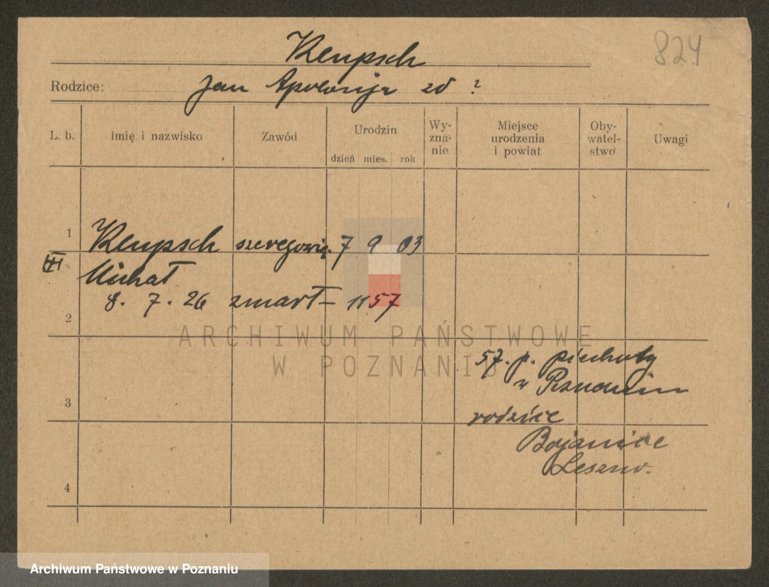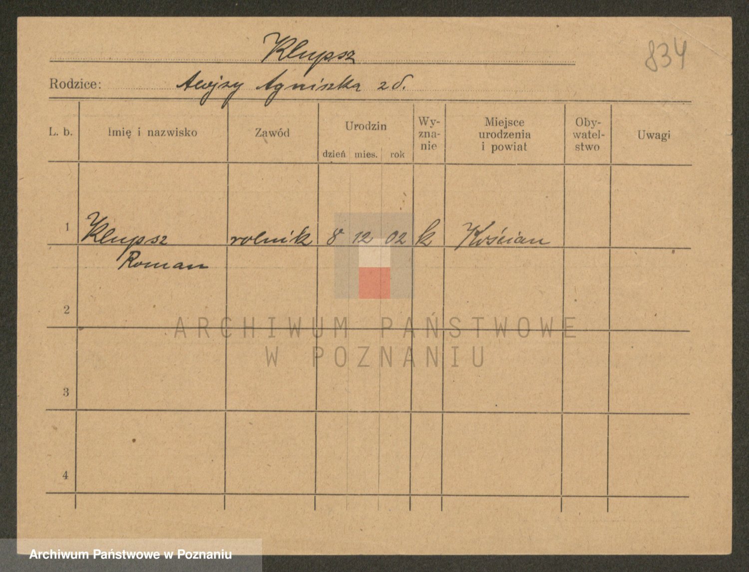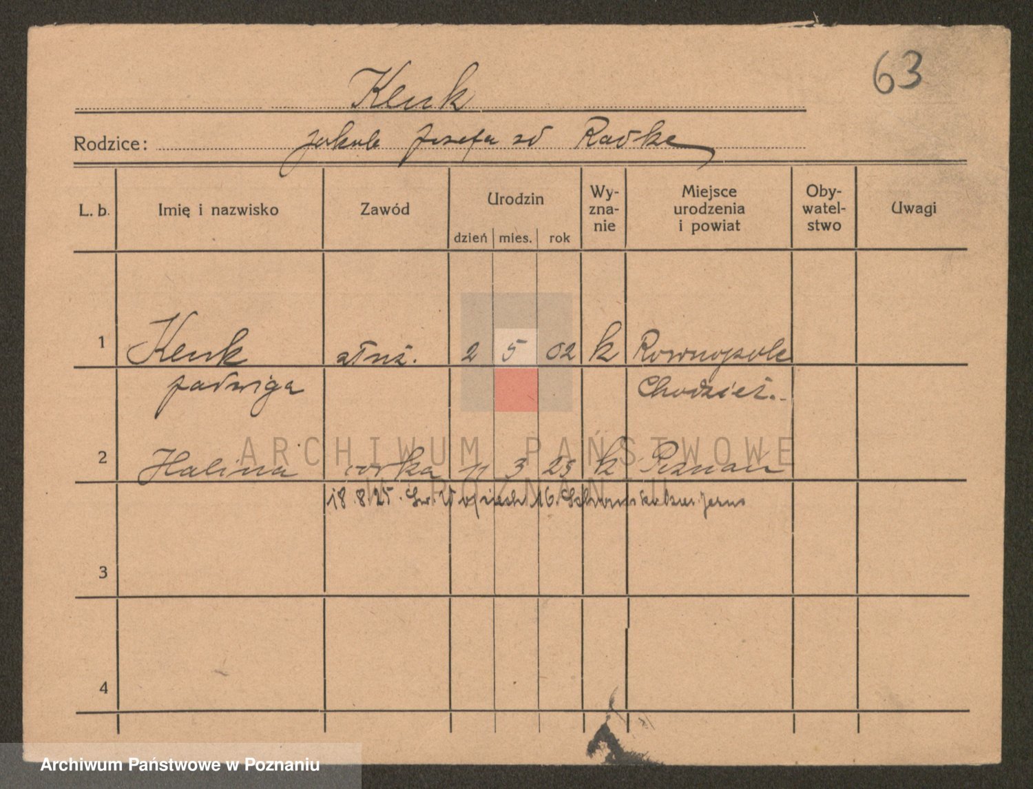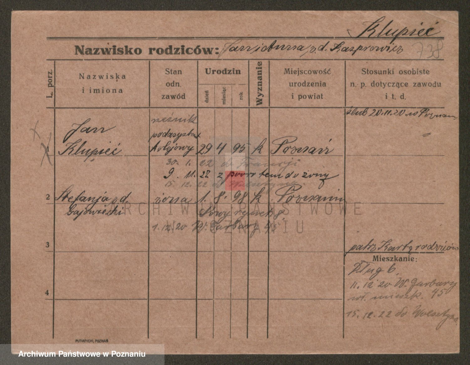 Podgląd karty osobowej dostępny jest po kliknięciu na nazwisko lub ikonkę karty. Można dokonywać powiększenia (ikony na górze) lub przechodzić między kolejnymi skanami (strzałki po bokach).