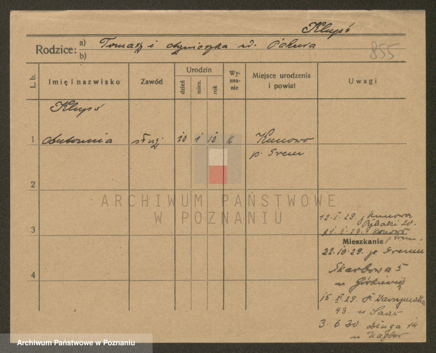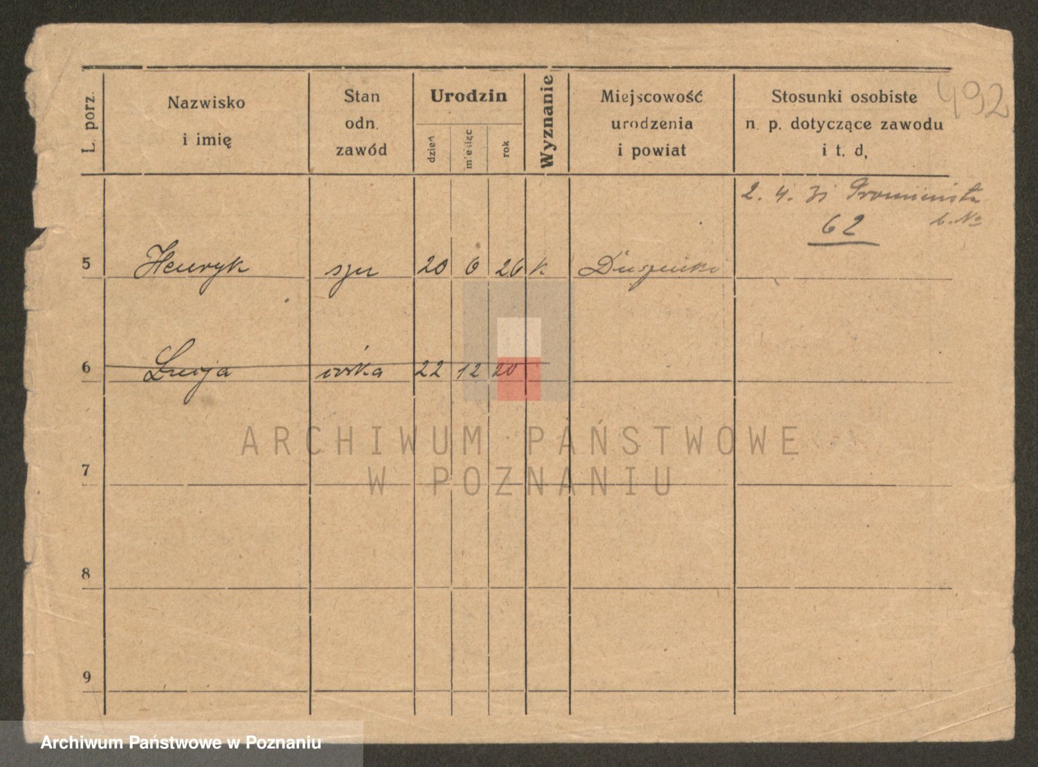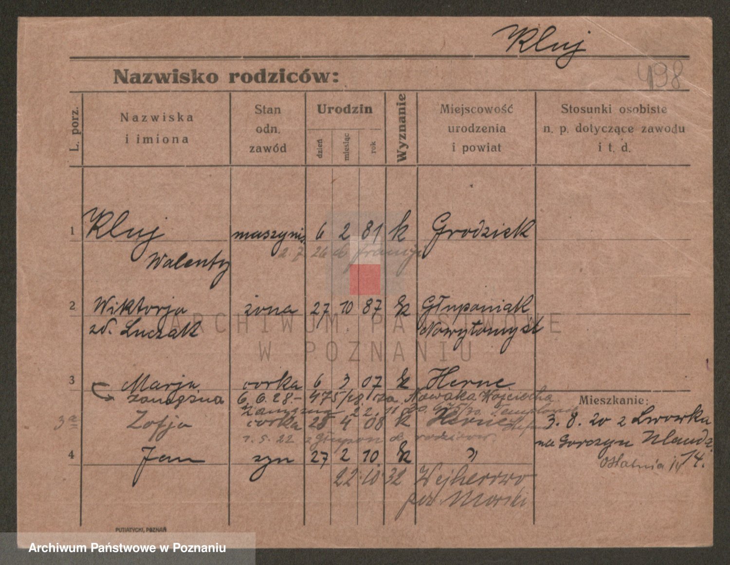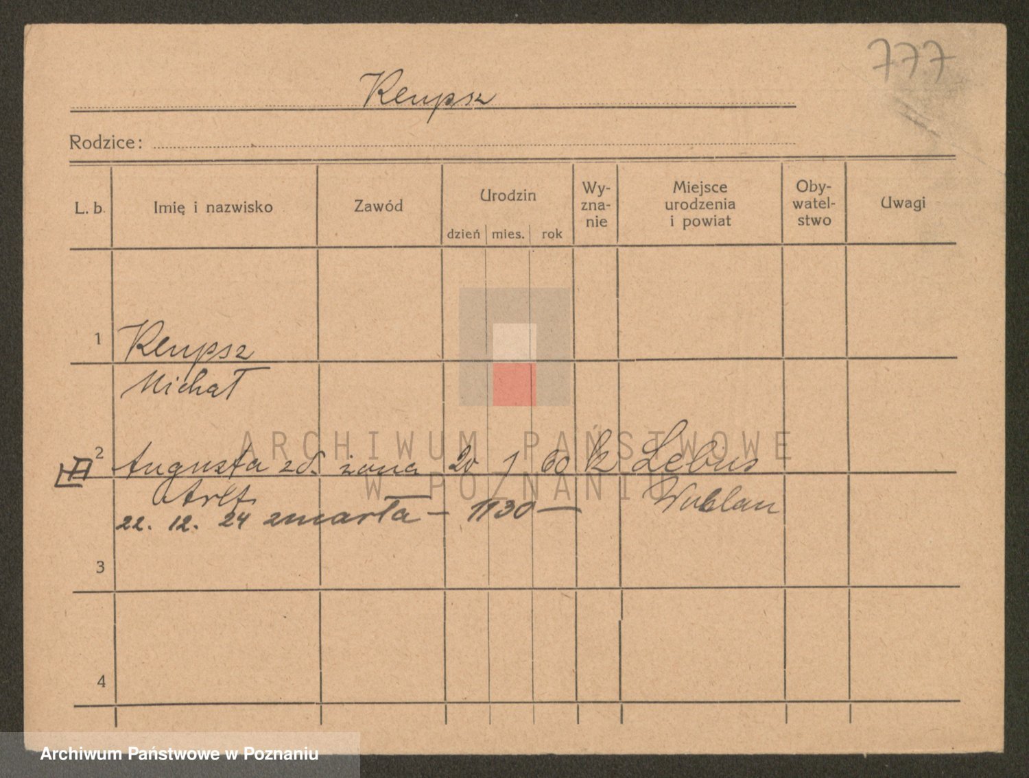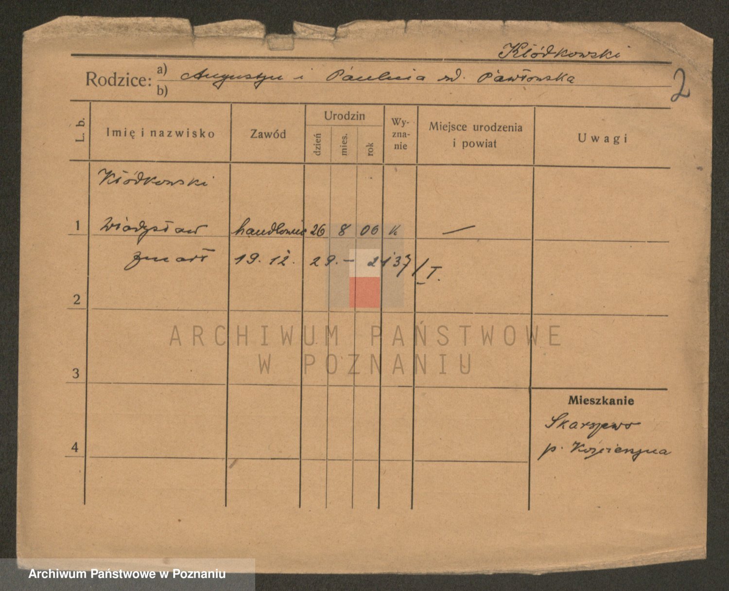 Podgląd karty osobowej dostępny jest po kliknięciu na nazwisko lub ikonkę karty. Można dokonywać powiększenia (ikony na górze) lub przechodzić między kolejnymi skanami (strzałki po bokach).
