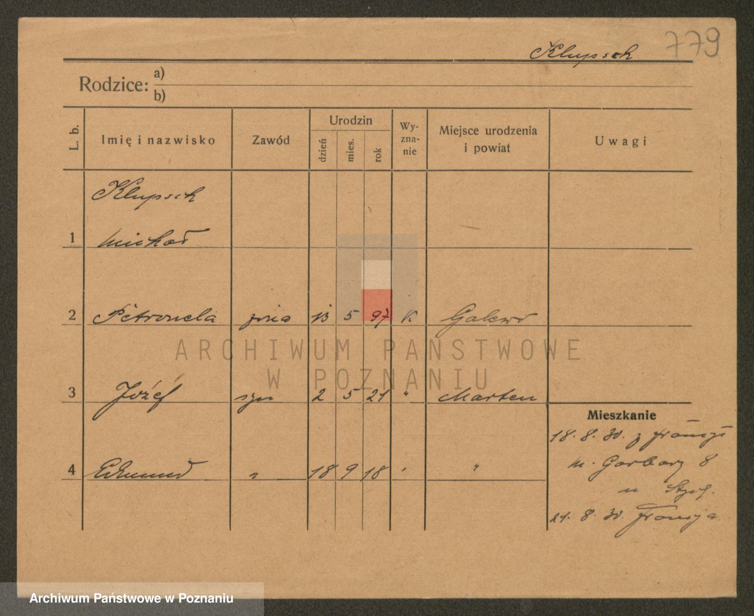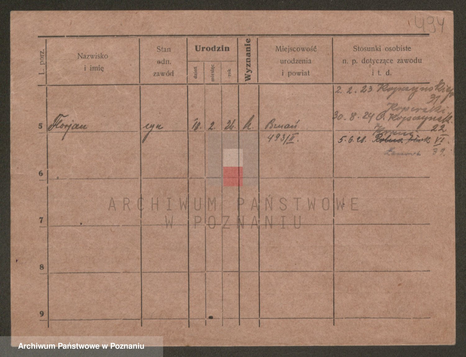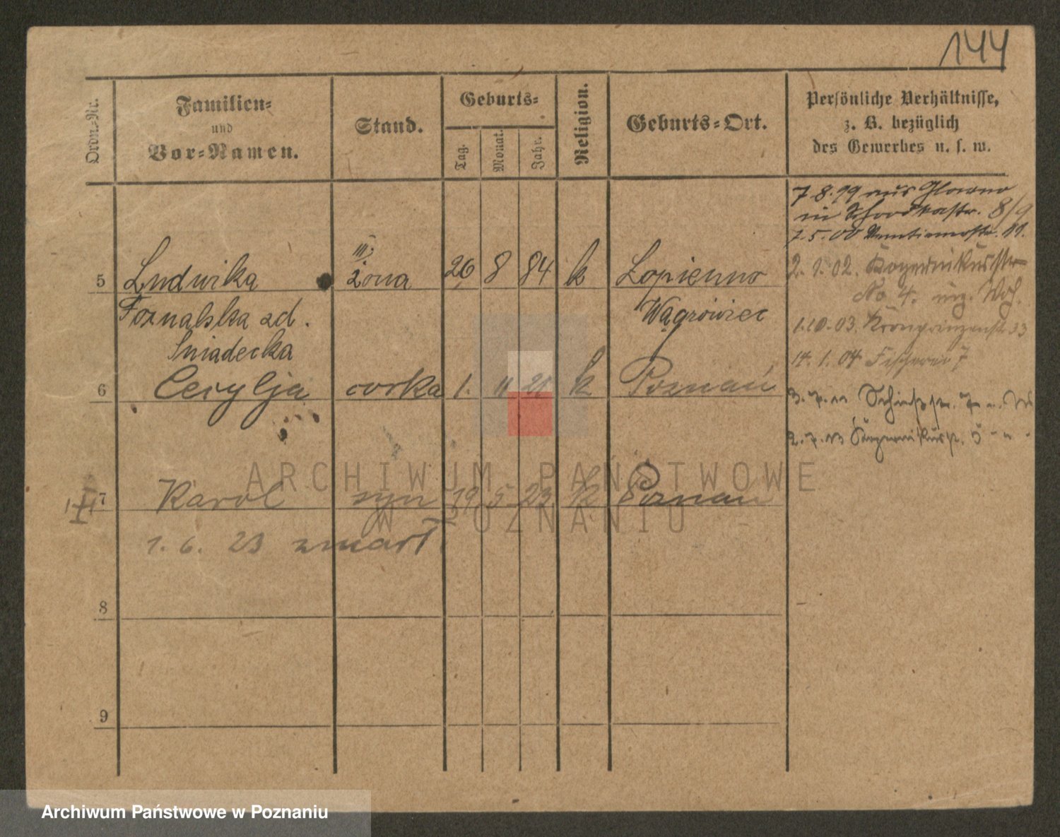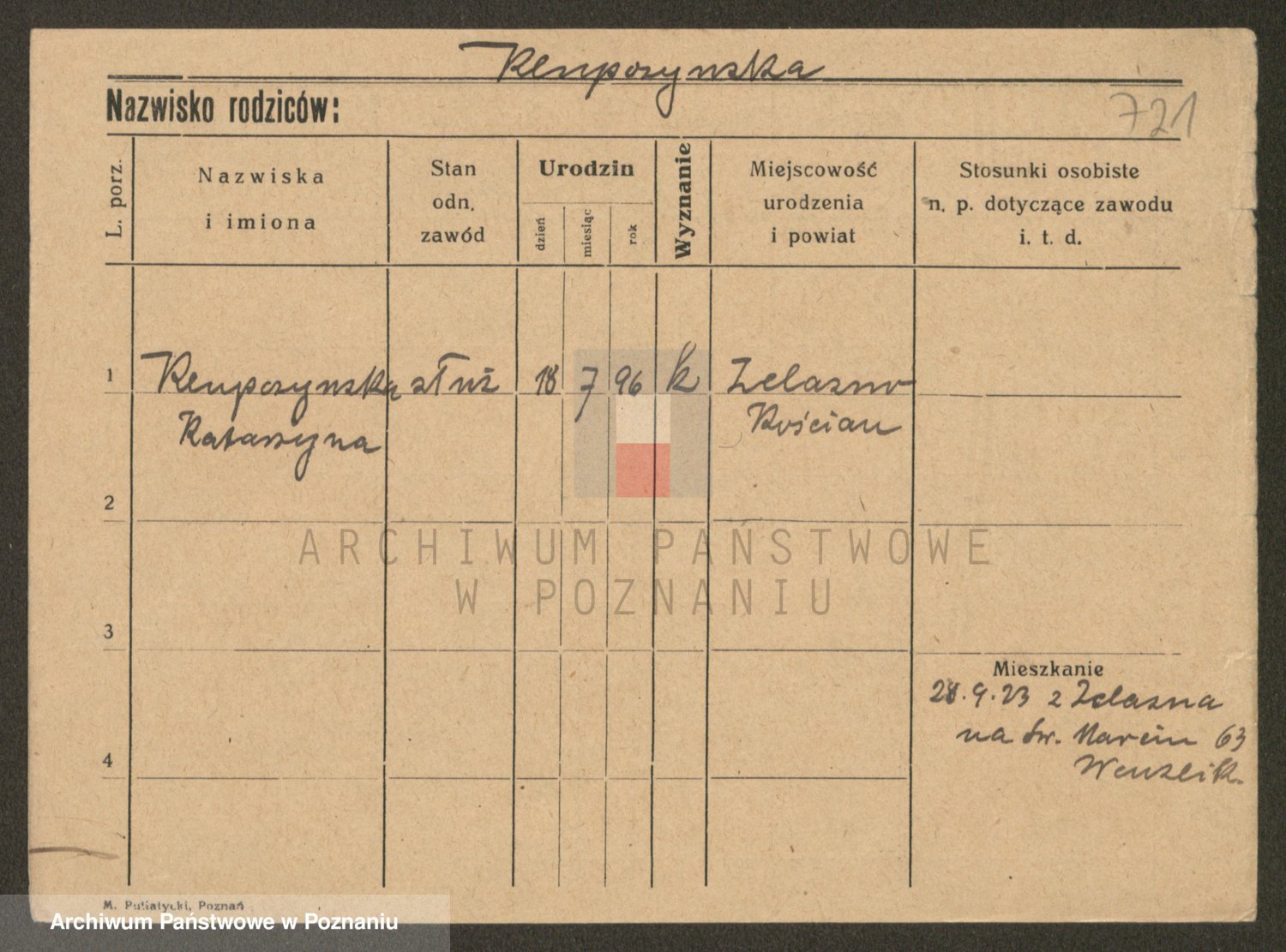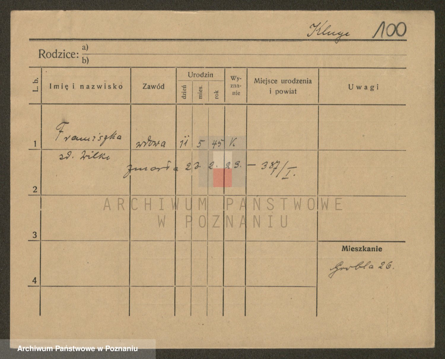 Podgląd karty osobowej dostępny jest po kliknięciu na nazwisko lub ikonkę karty. Można dokonywać powiększenia (ikony na górze) lub przechodzić między kolejnymi skanami (strzałki po bokach).