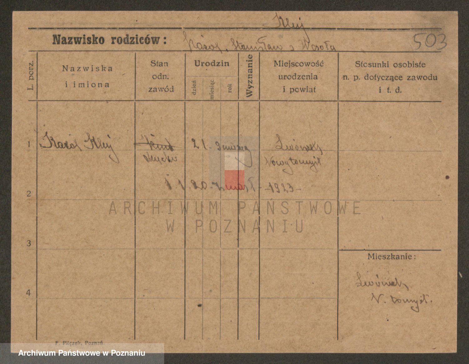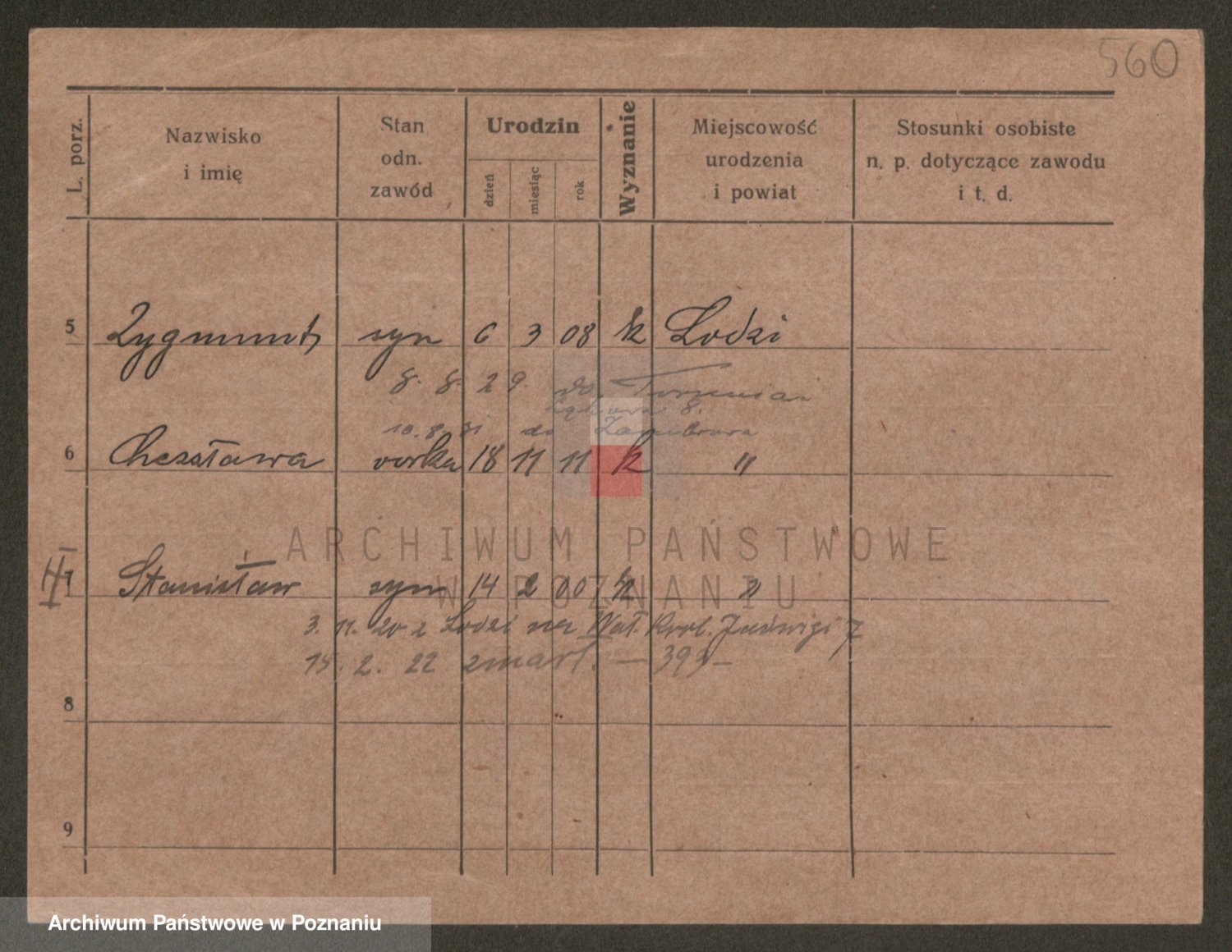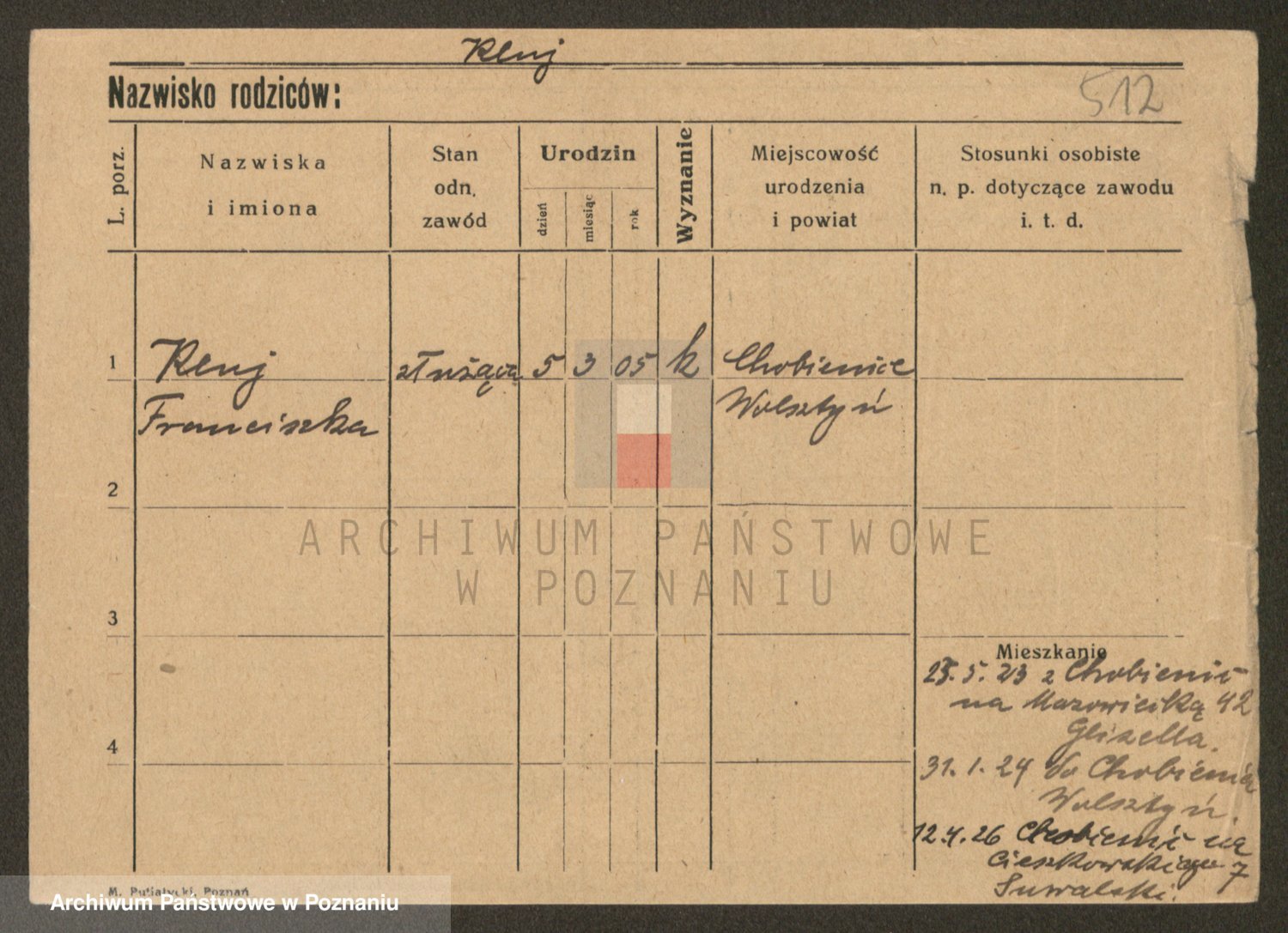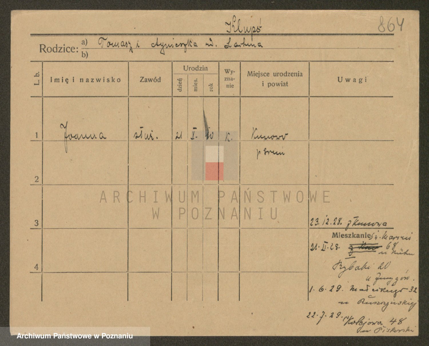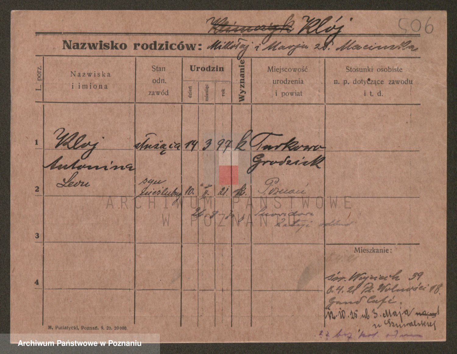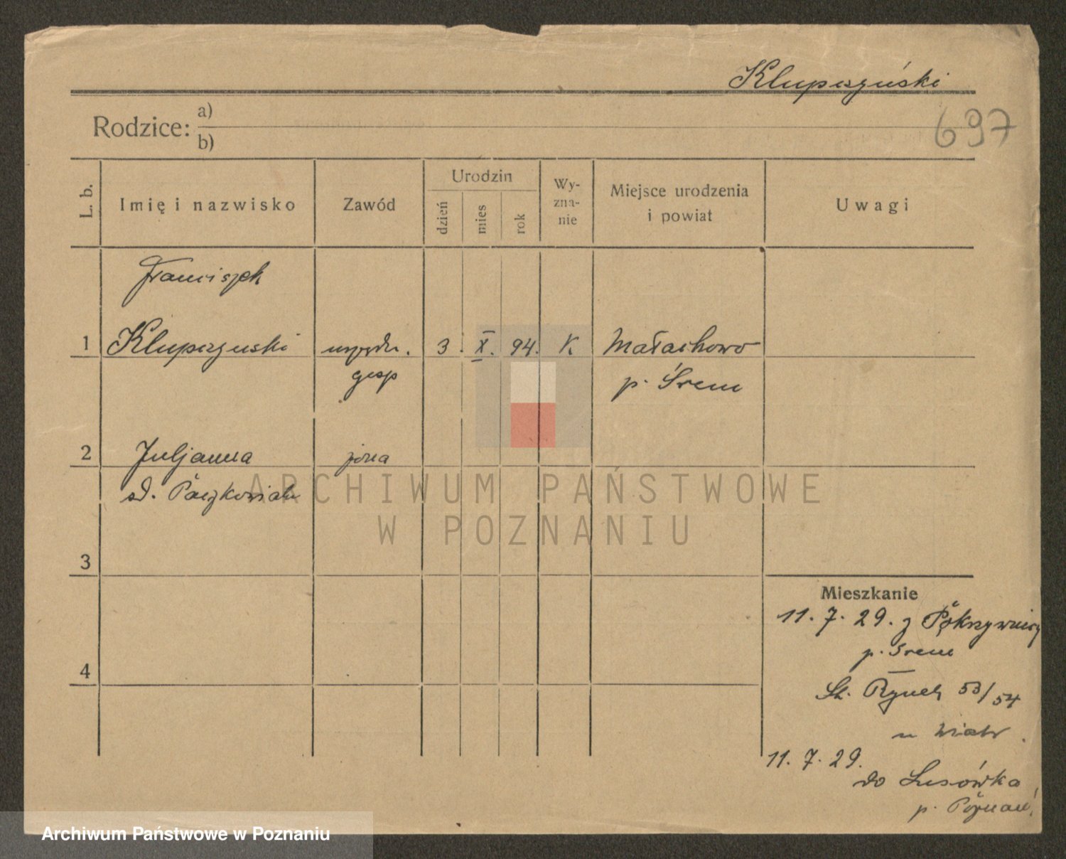 Podgląd karty osobowej dostępny jest po kliknięciu na nazwisko lub ikonkę karty. Można dokonywać powiększenia (ikony na górze) lub przechodzić między kolejnymi skanami (strzałki po bokach).