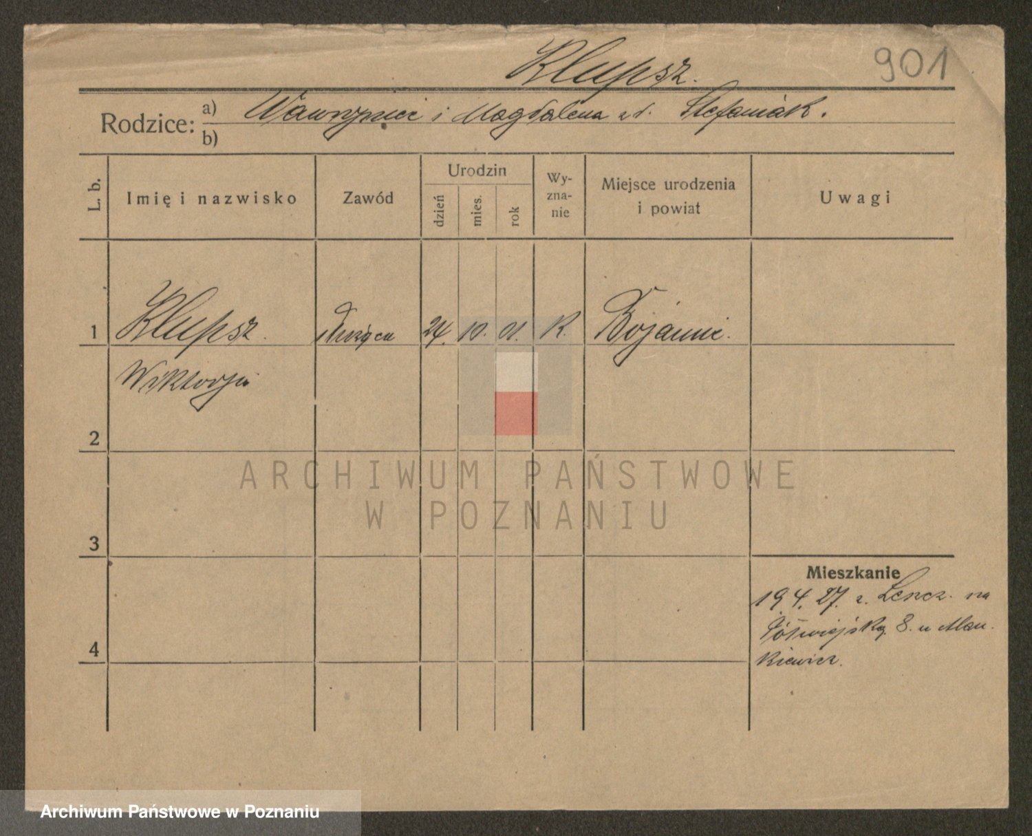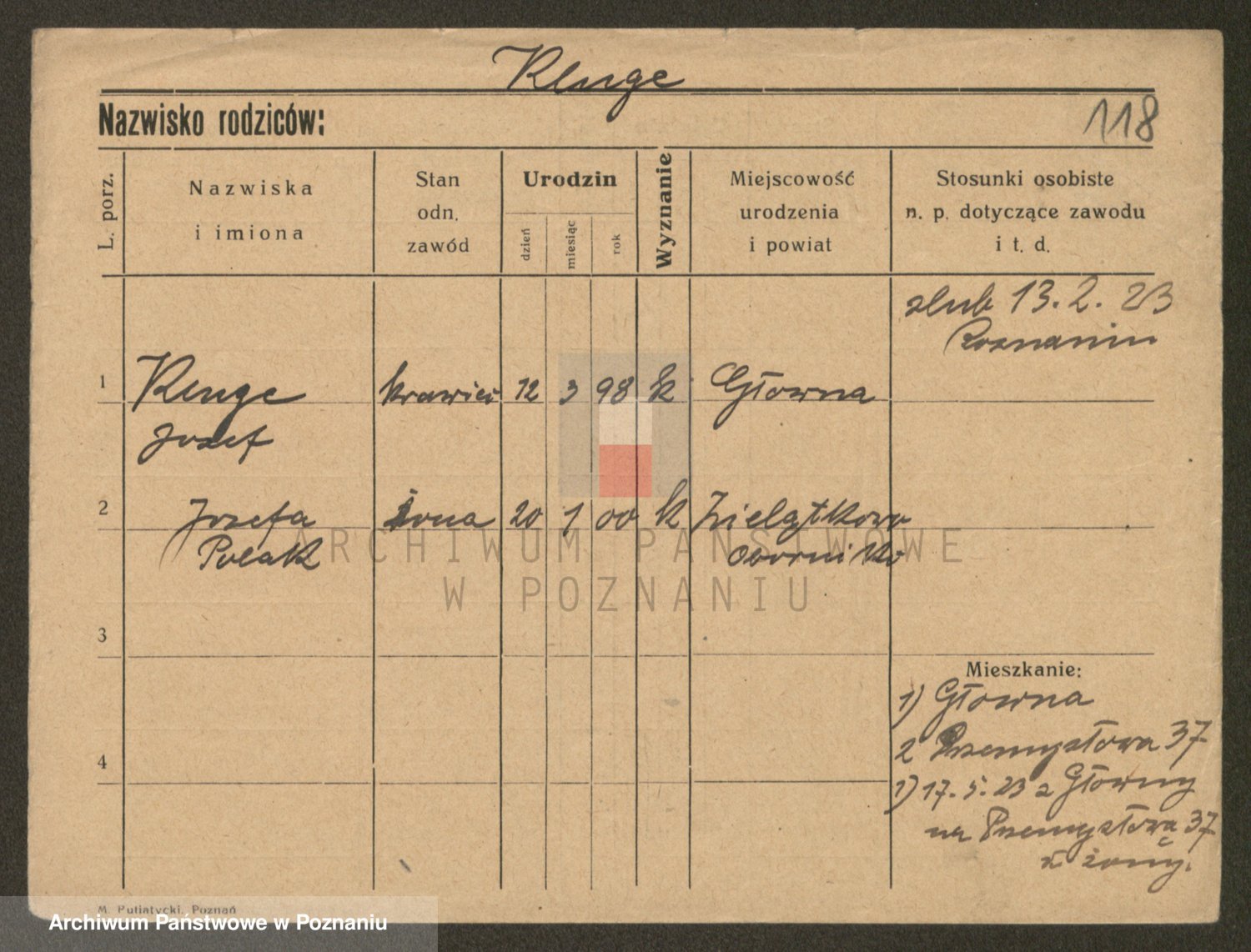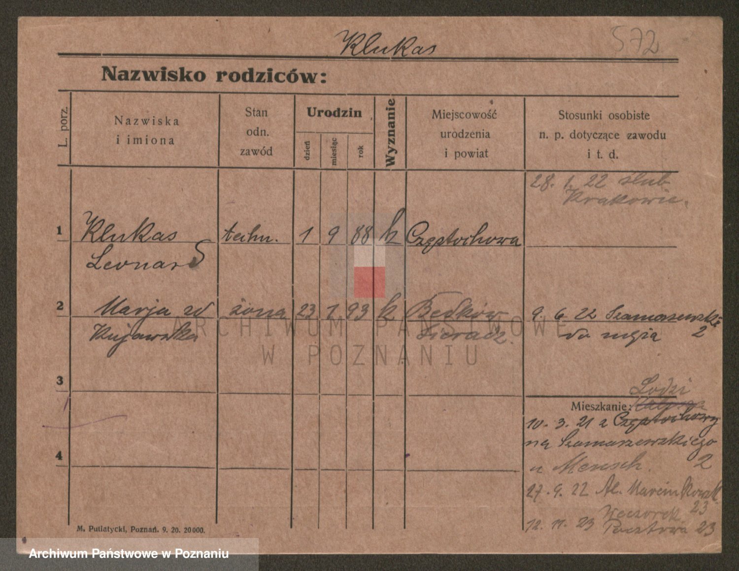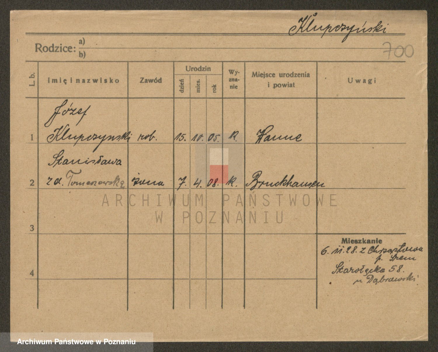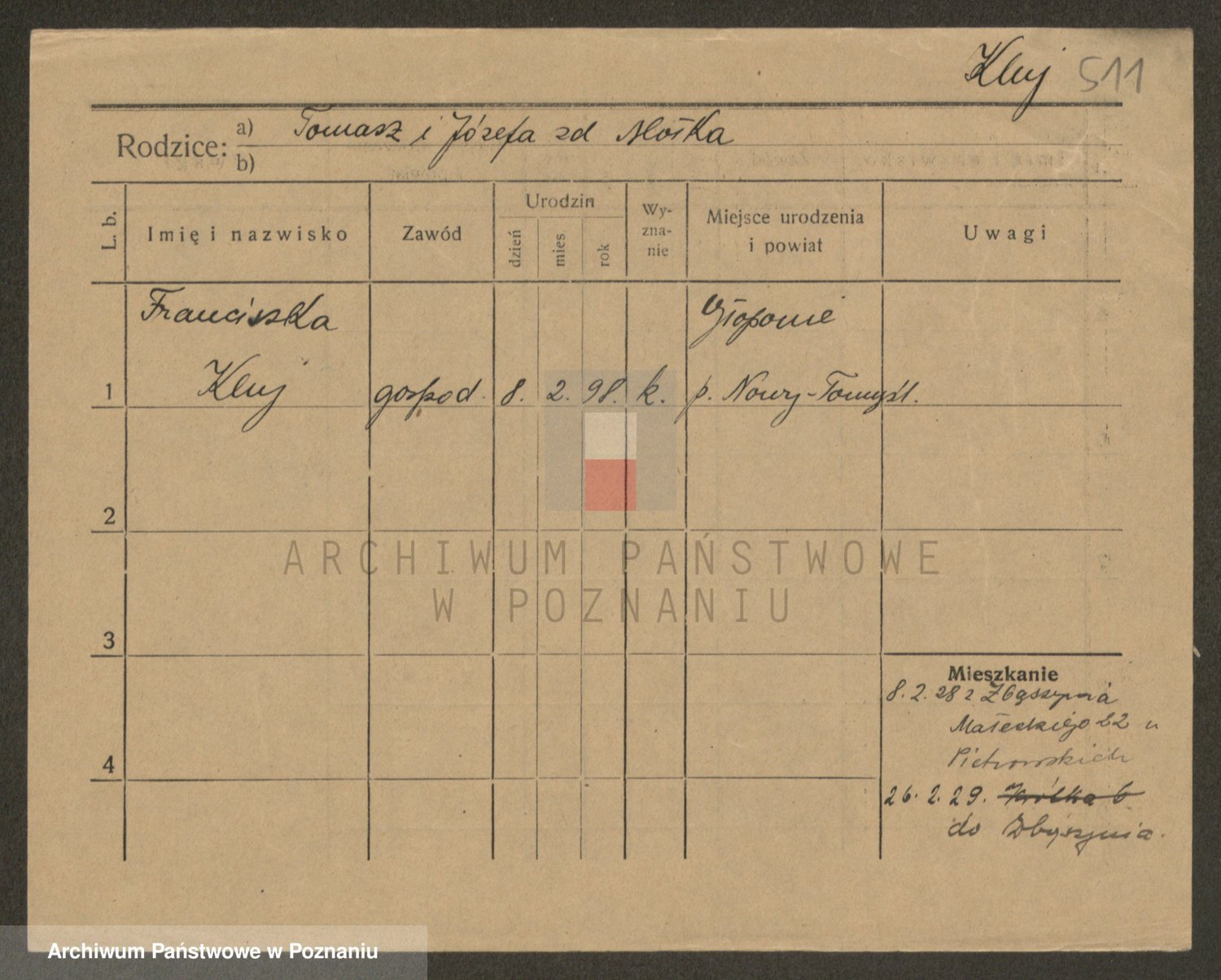 Podgląd karty osobowej dostępny jest po kliknięciu na nazwisko lub ikonkę karty. Można dokonywać powiększenia (ikony na górze) lub przechodzić między kolejnymi skanami (strzałki po bokach).