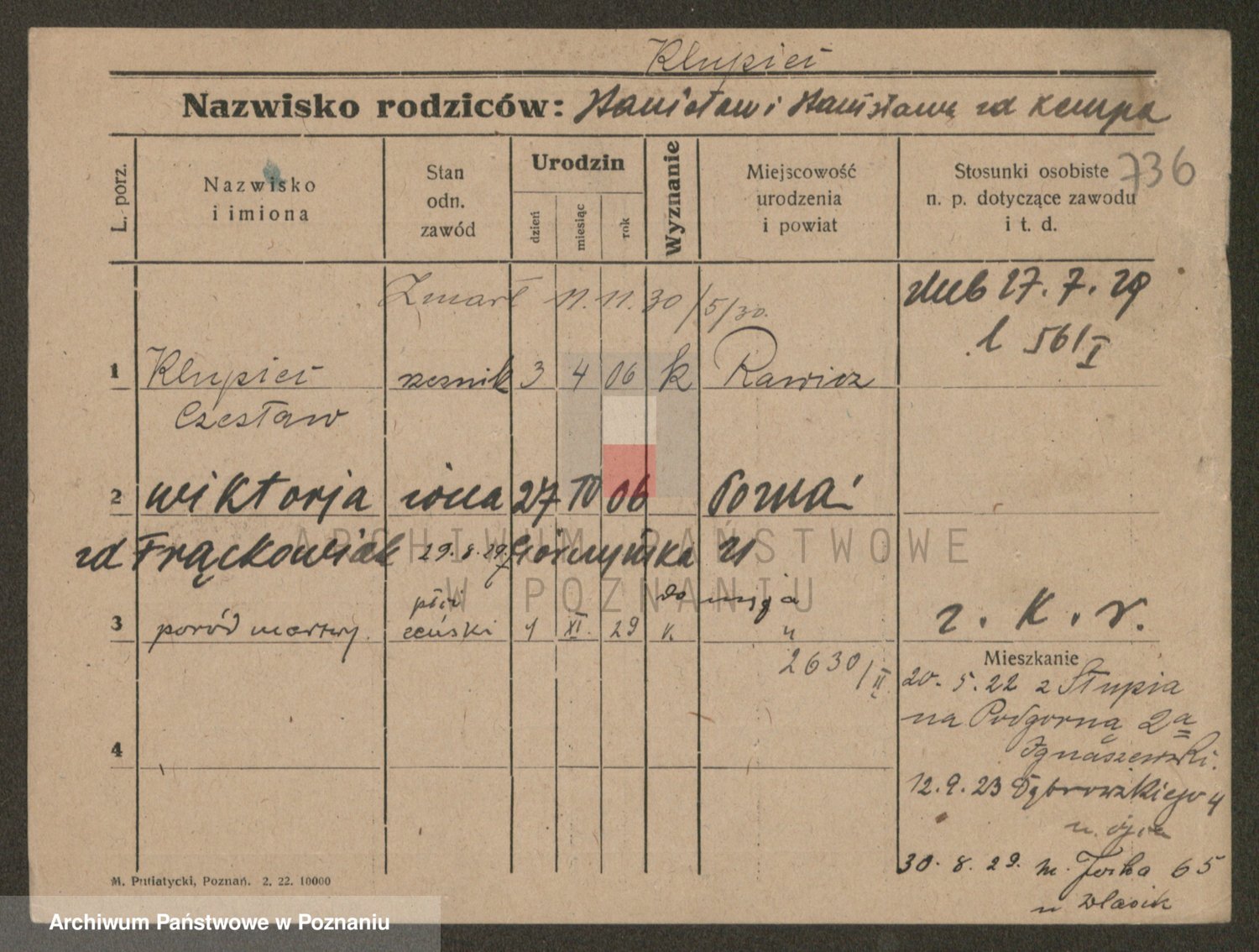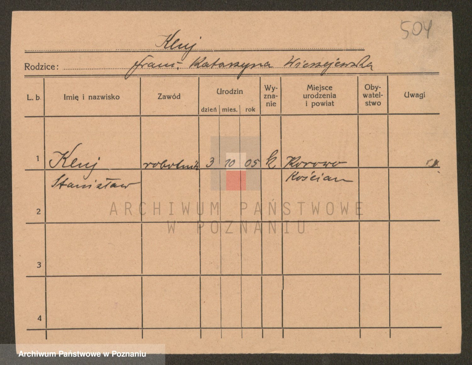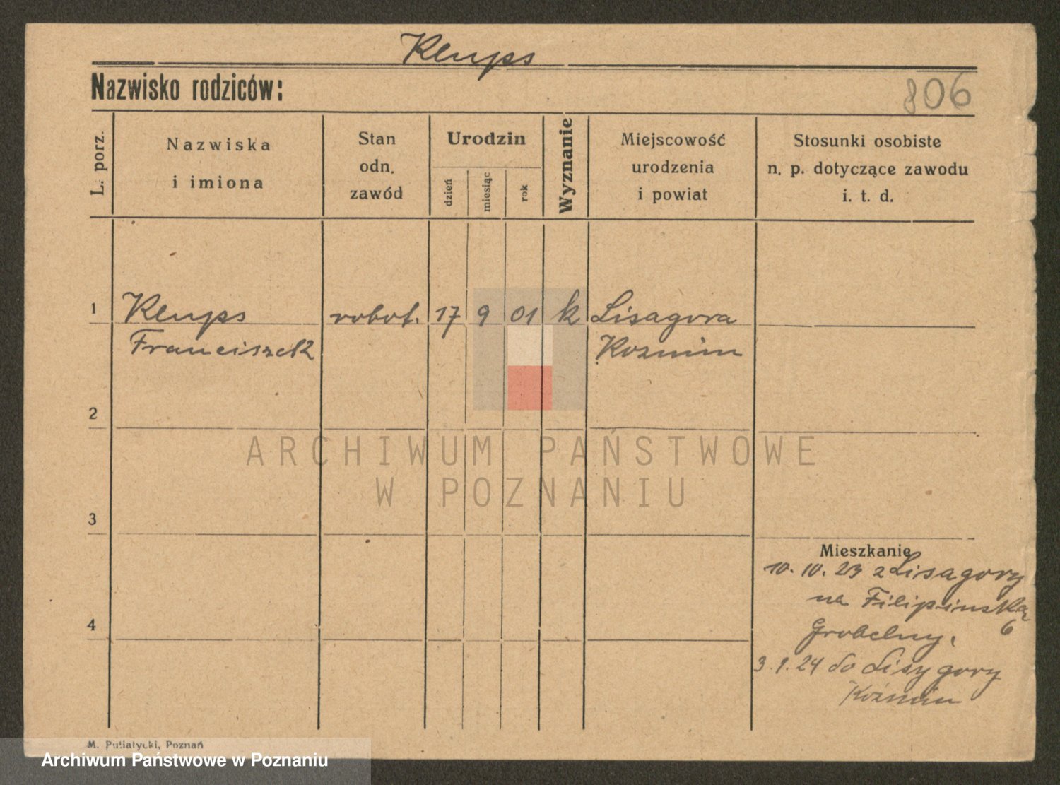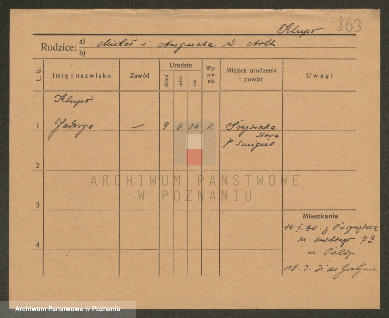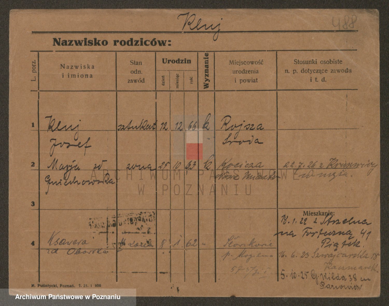 Podgląd karty osobowej dostępny jest po kliknięciu na nazwisko lub ikonkę karty. Można dokonywać powiększenia (ikony na górze) lub przechodzić między kolejnymi skanami (strzałki po bokach).