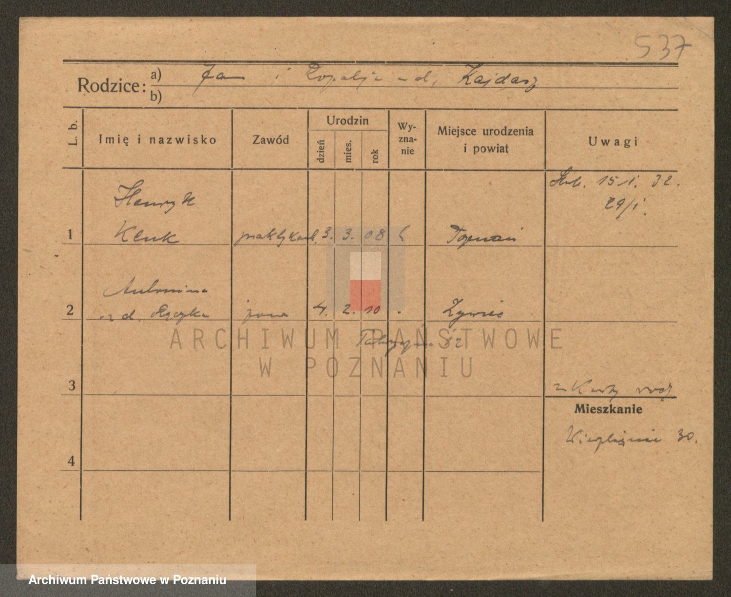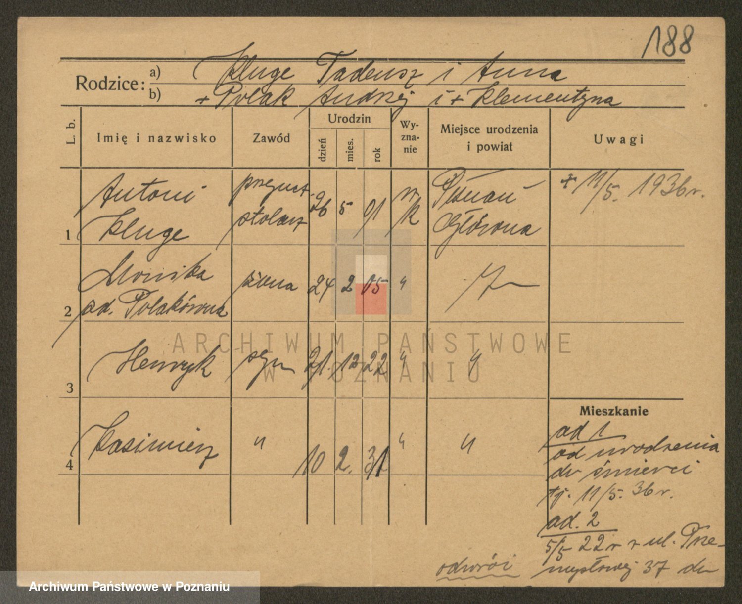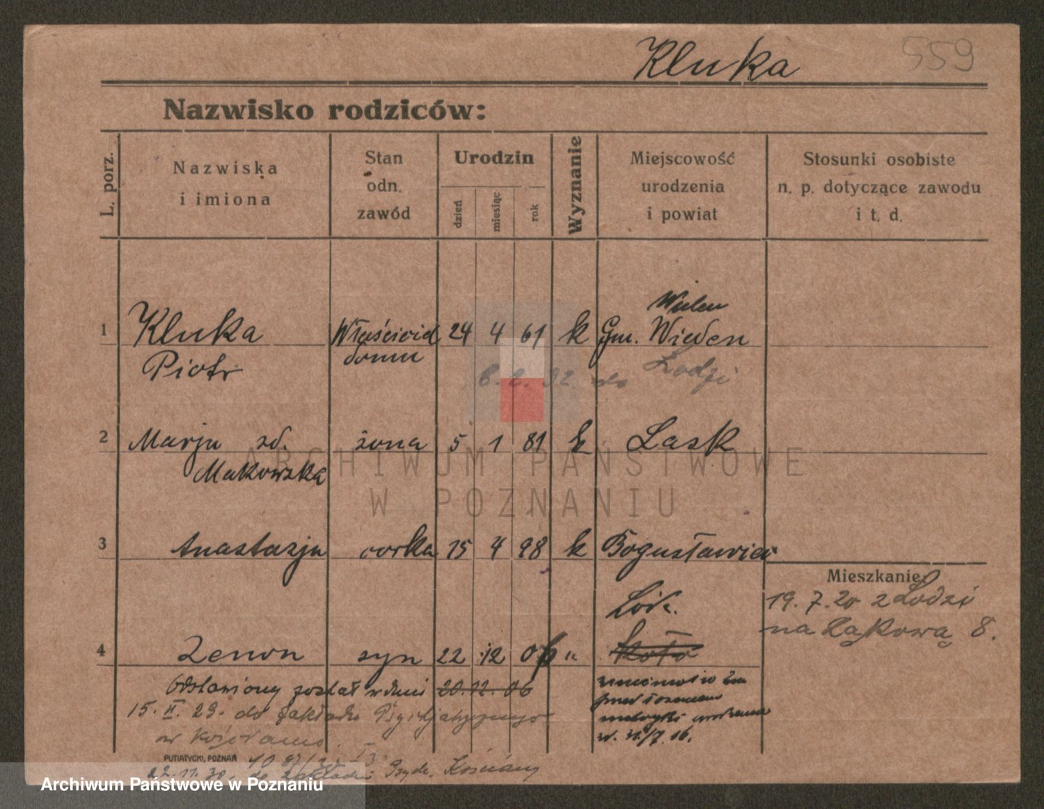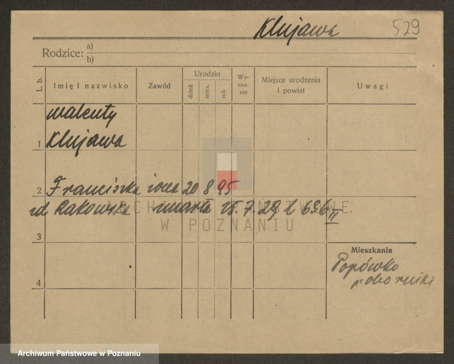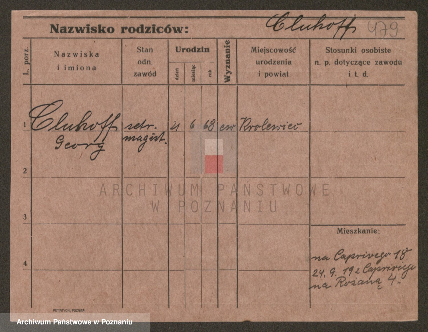 Podgląd karty osobowej dostępny jest po kliknięciu na nazwisko lub ikonkę karty. Można dokonywać powiększenia (ikony na górze) lub przechodzić między kolejnymi skanami (strzałki po bokach).