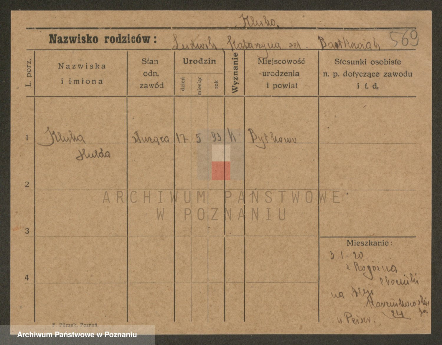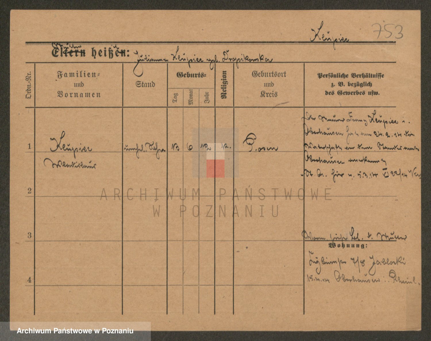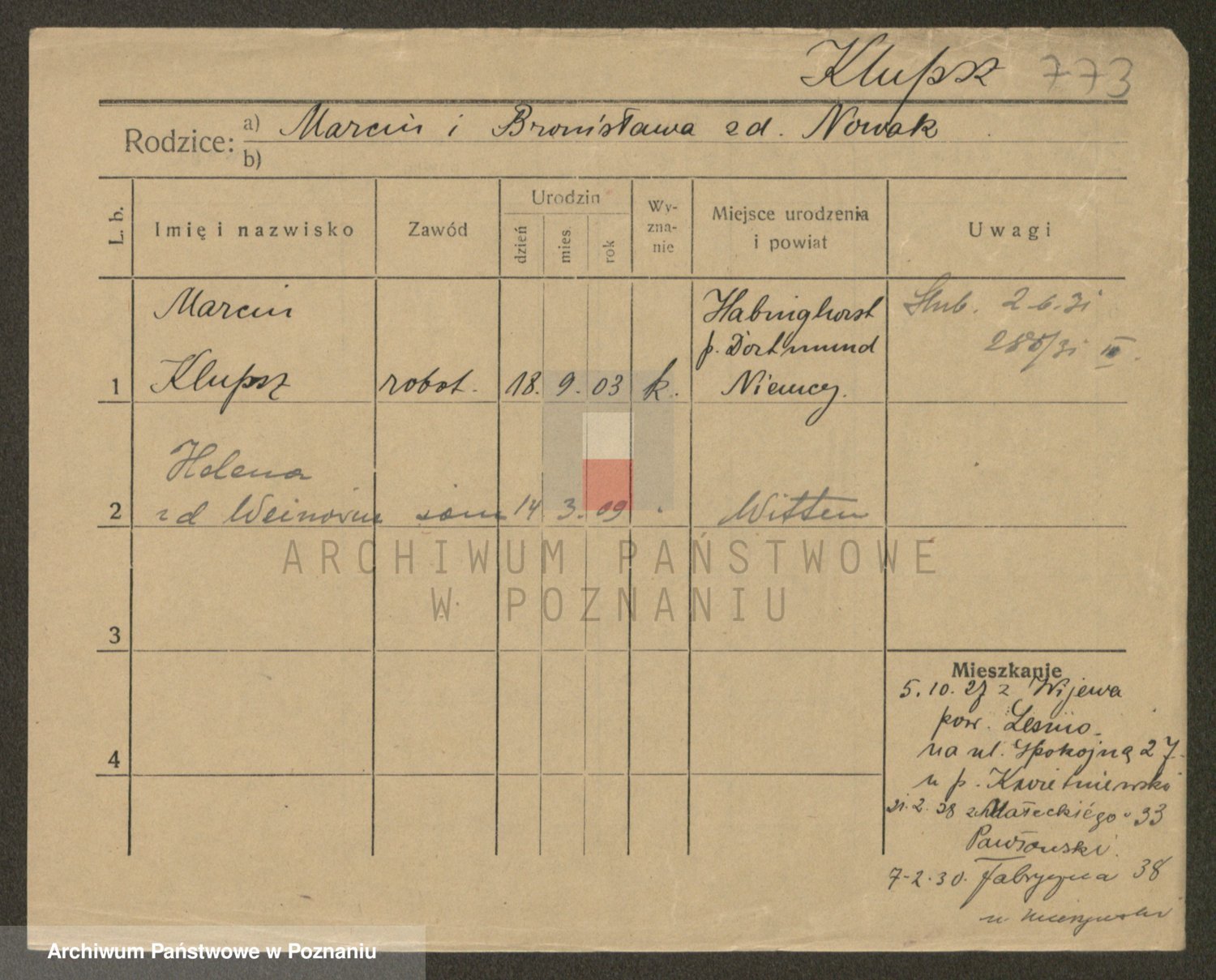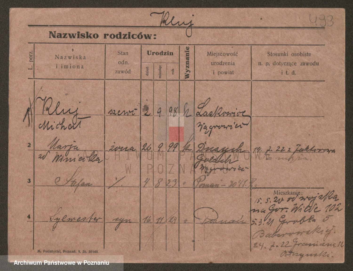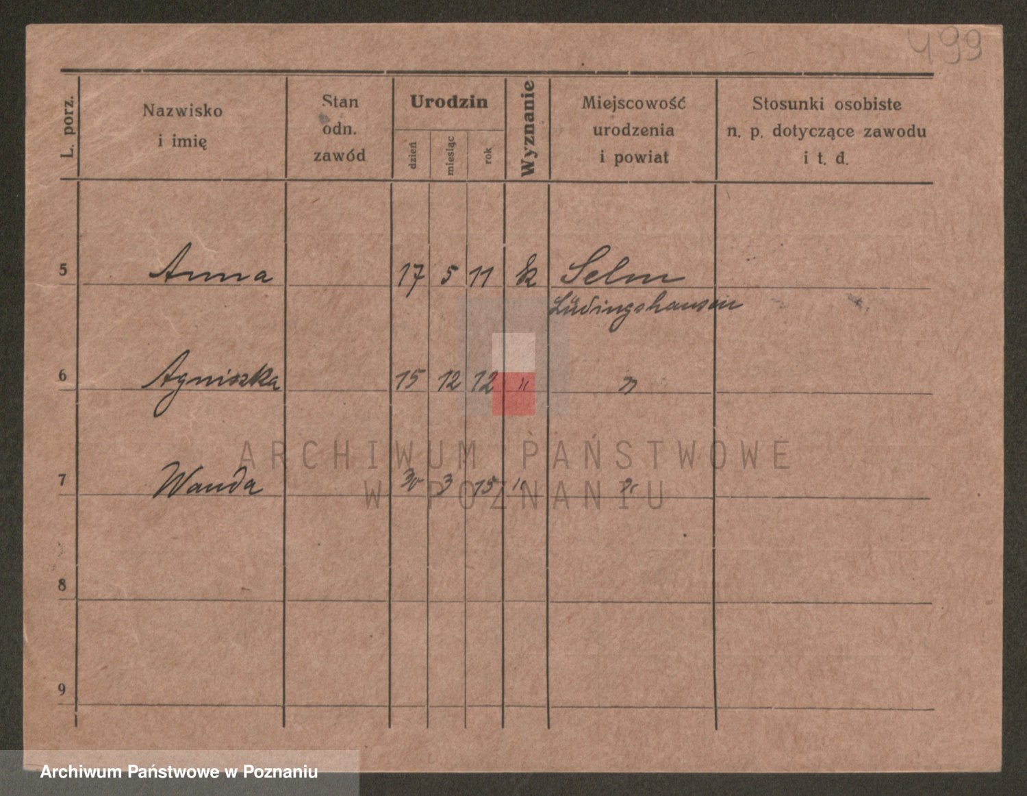 Podgląd karty osobowej dostępny jest po kliknięciu na nazwisko lub ikonkę karty. Można dokonywać powiększenia (ikony na górze) lub przechodzić między kolejnymi skanami (strzałki po bokach).