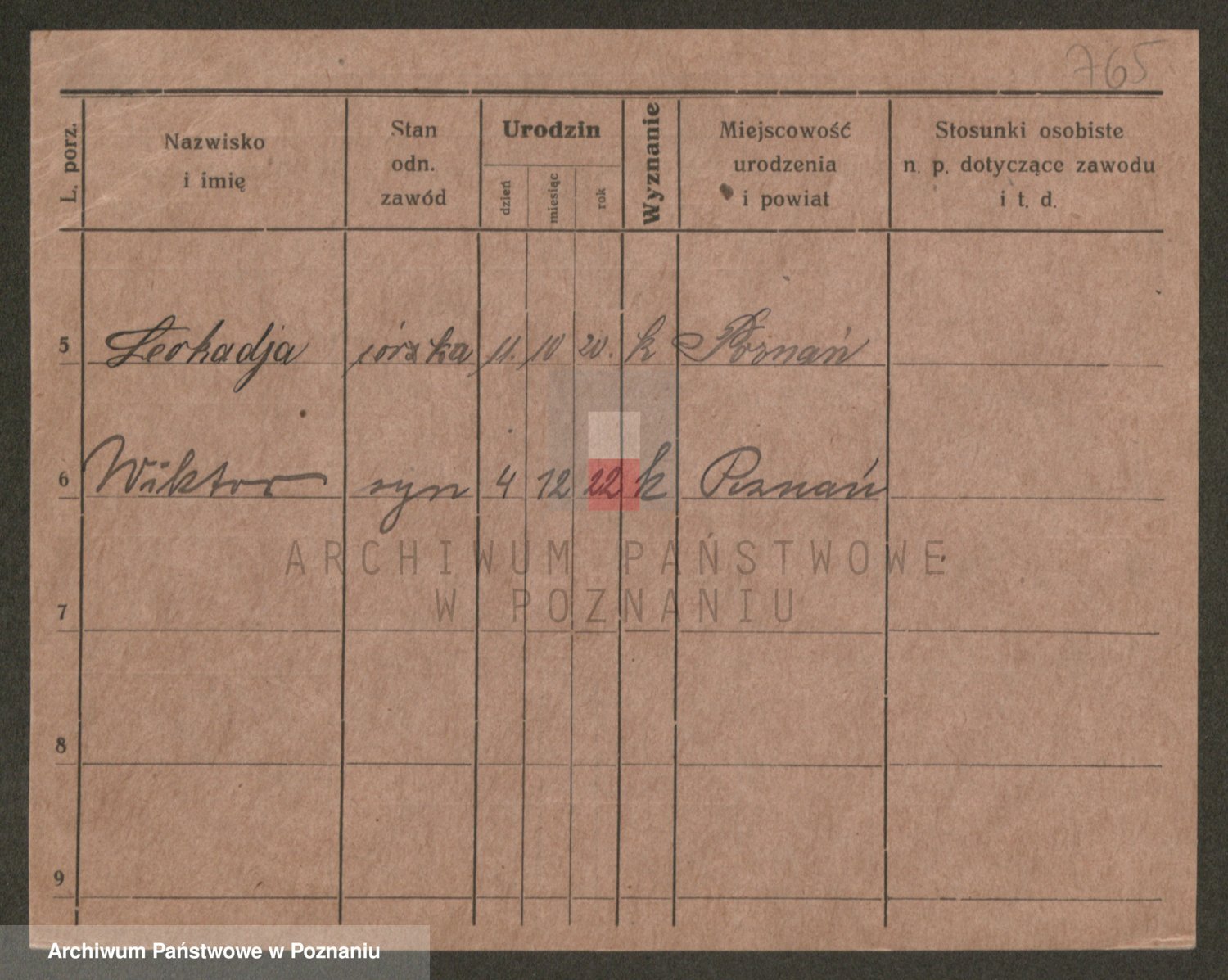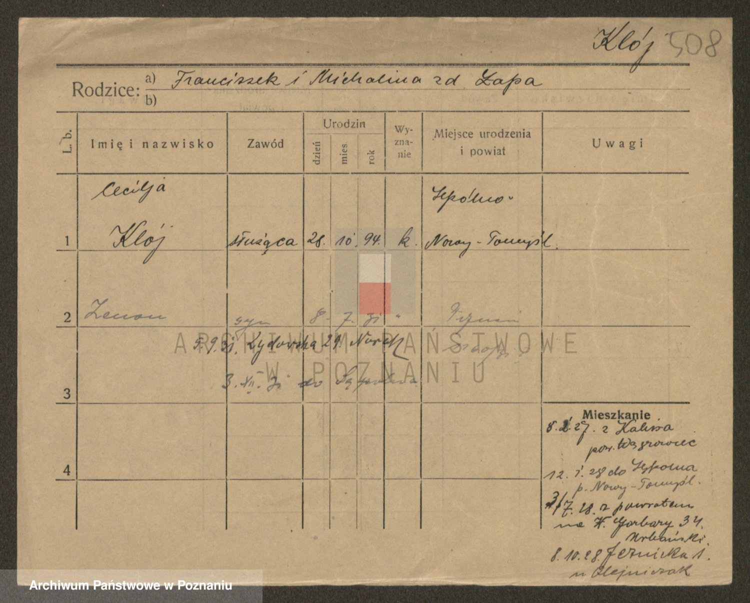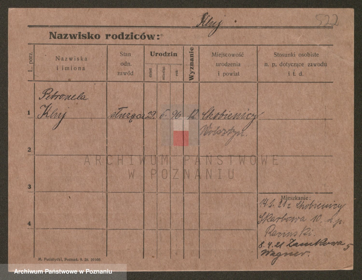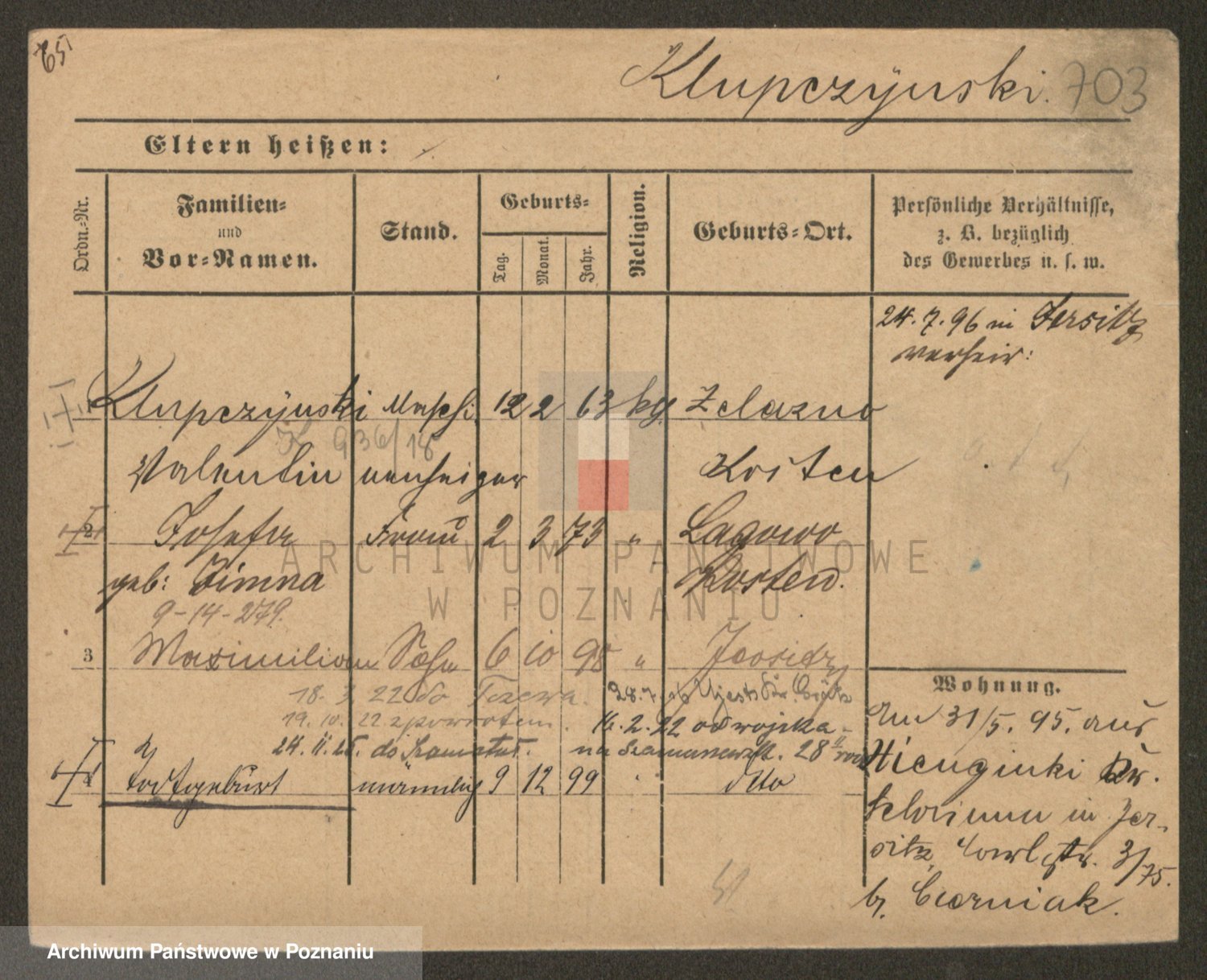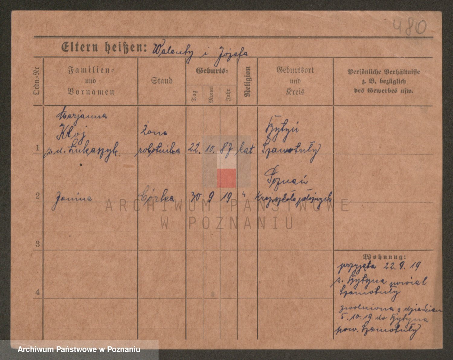 Podgląd karty osobowej dostępny jest po kliknięciu na nazwisko lub ikonkę karty. Można dokonywać powiększenia (ikony na górze) lub przechodzić między kolejnymi skanami (strzałki po bokach).