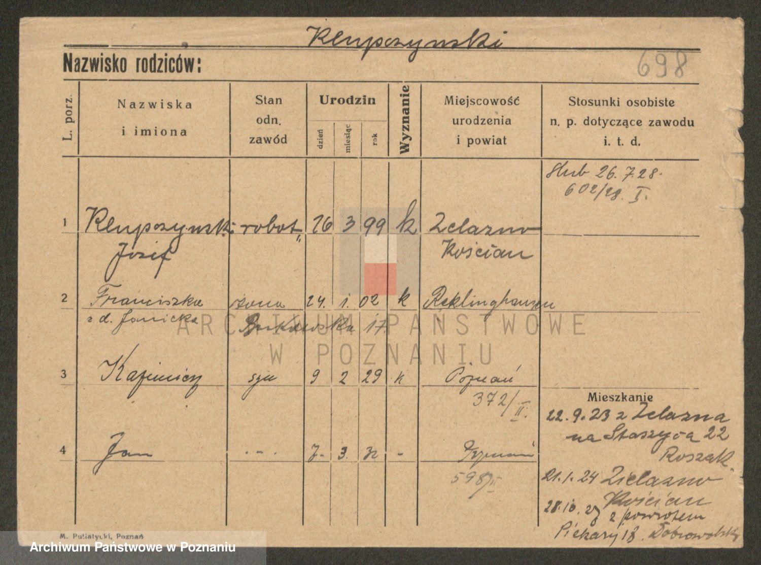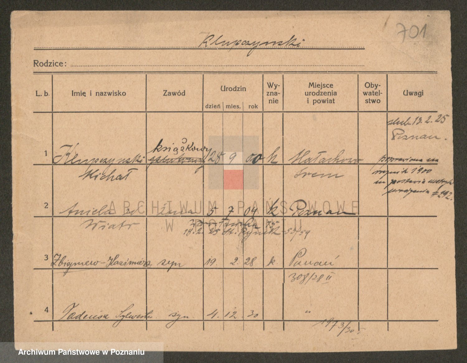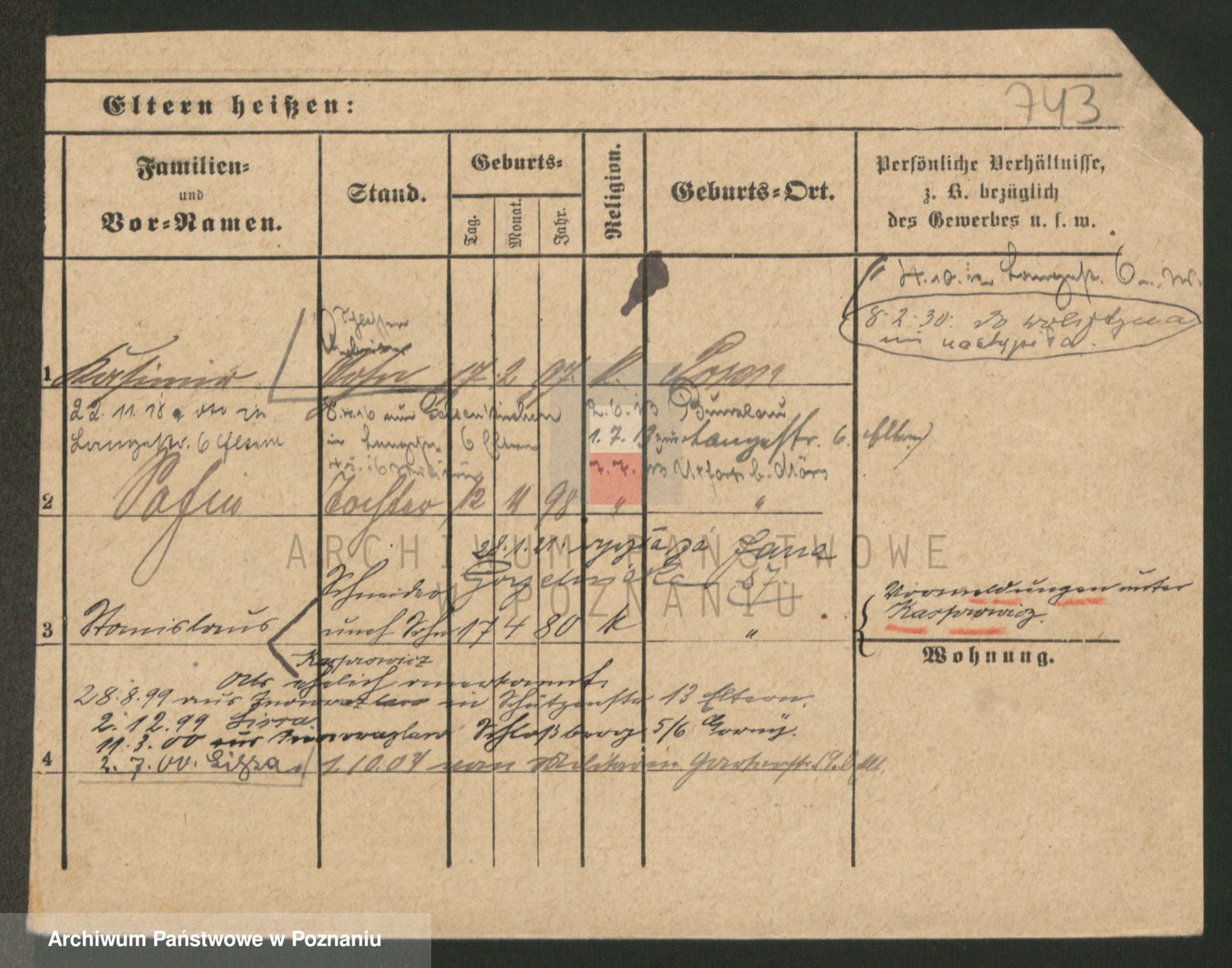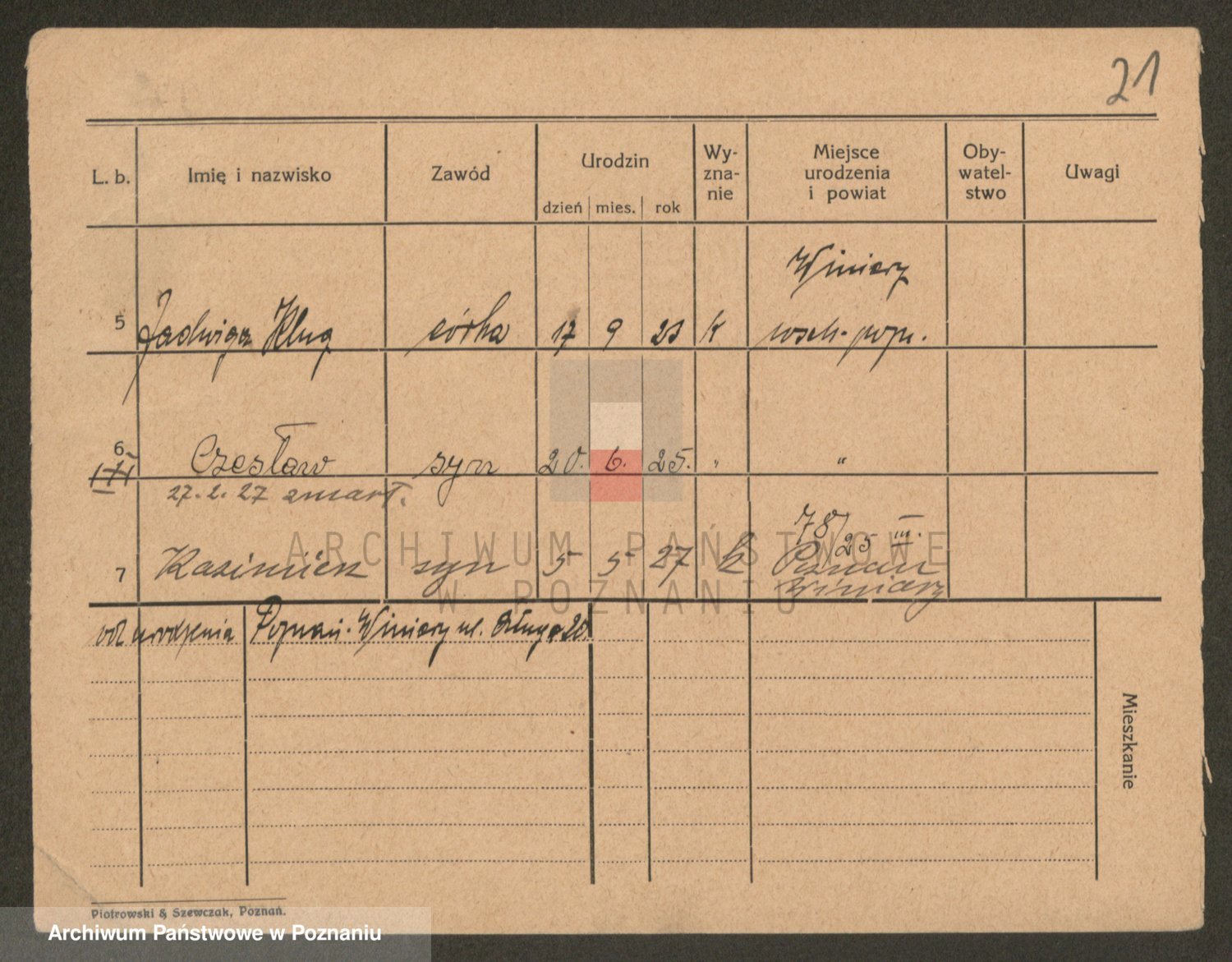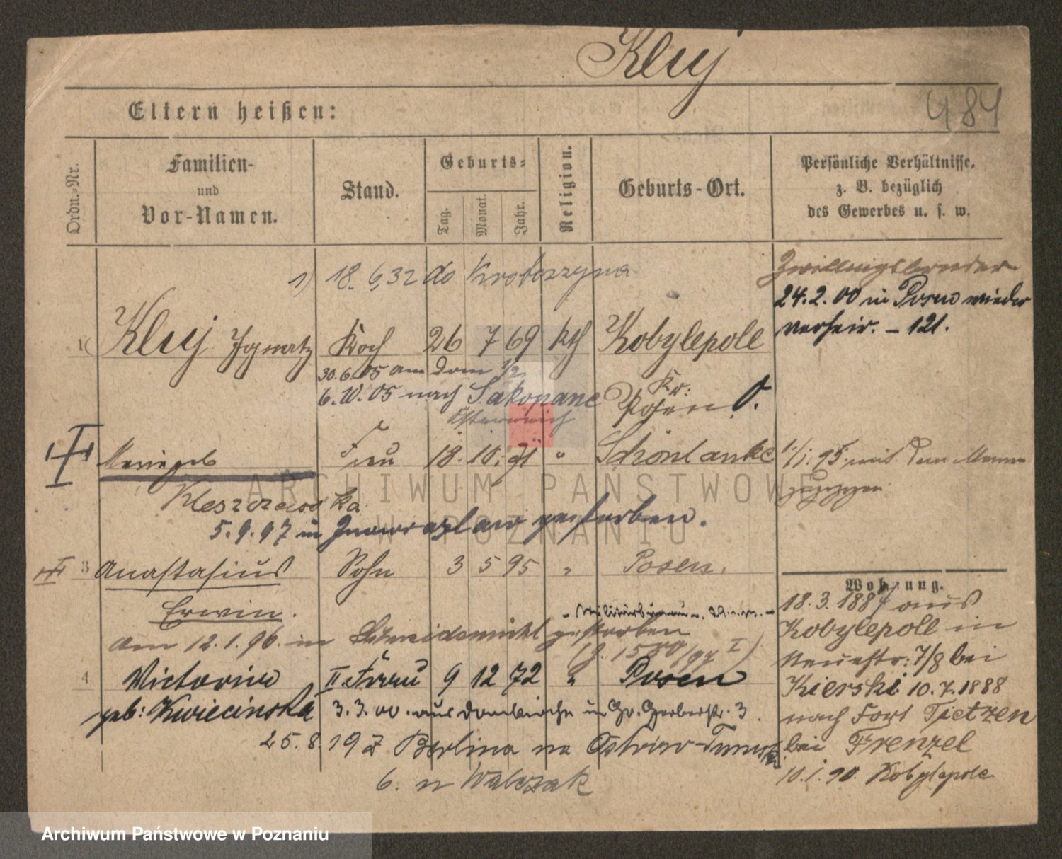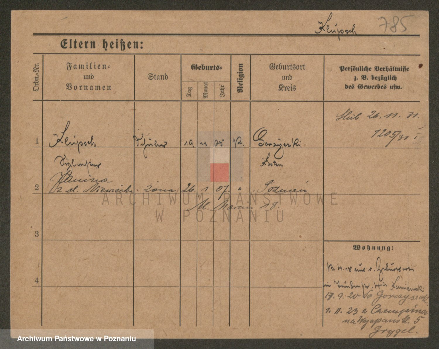 Podgląd karty osobowej dostępny jest po kliknięciu na nazwisko lub ikonkę karty. Można dokonywać powiększenia (ikony na górze) lub przechodzić między kolejnymi skanami (strzałki po bokach).